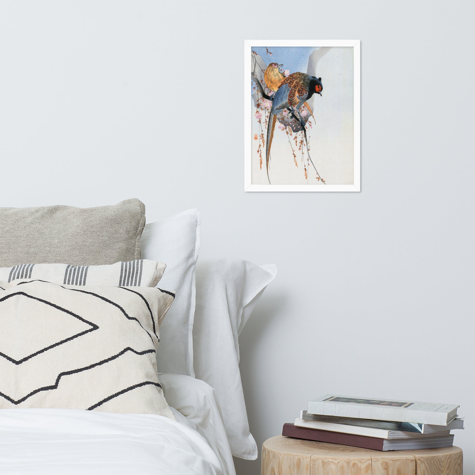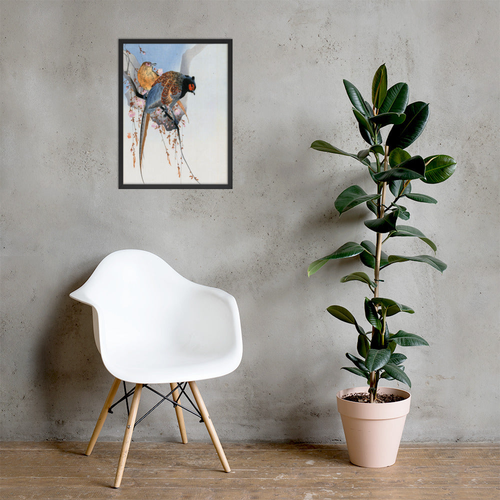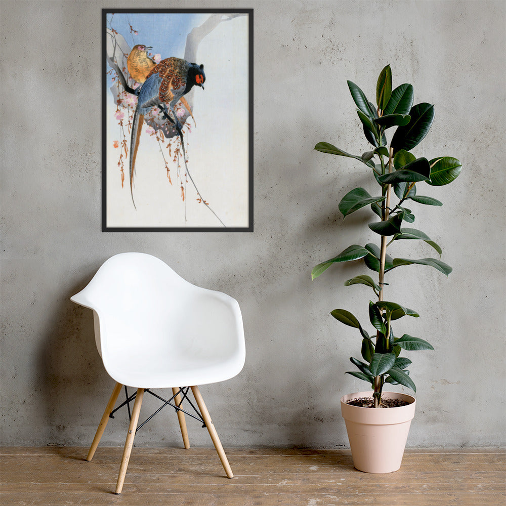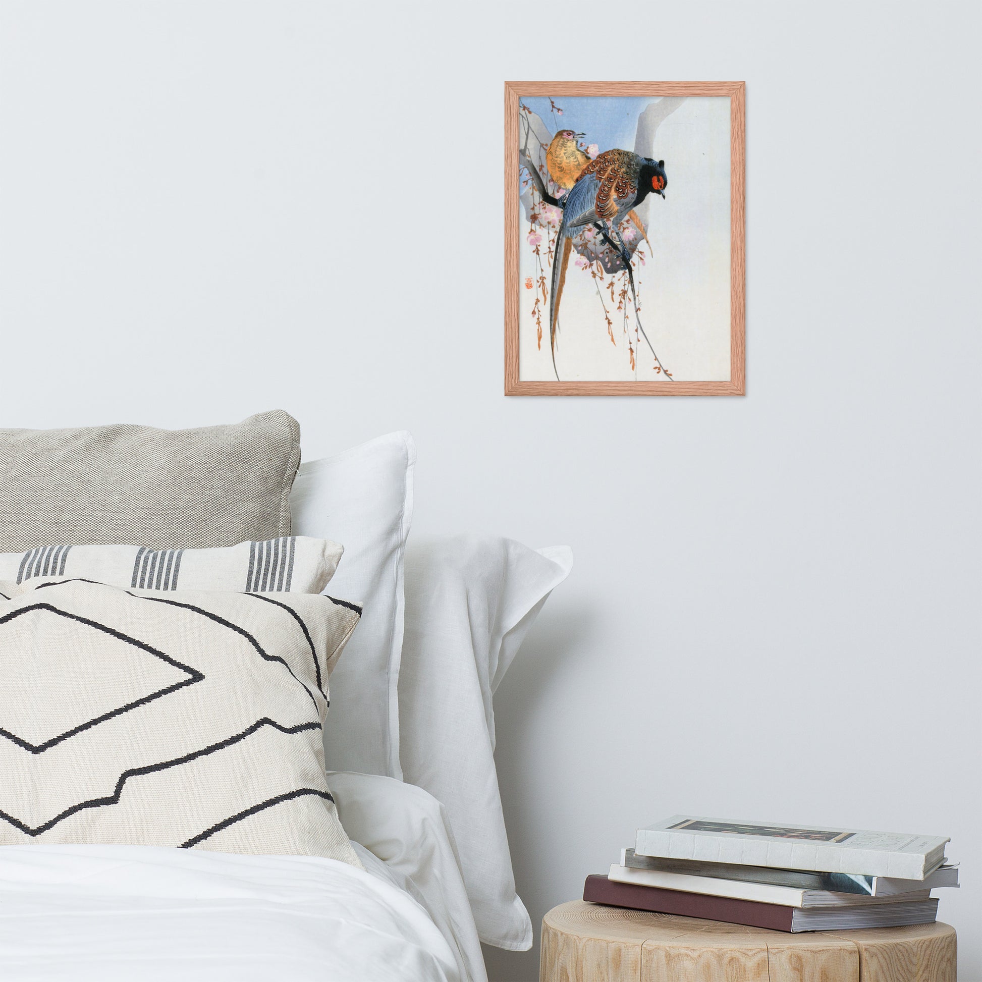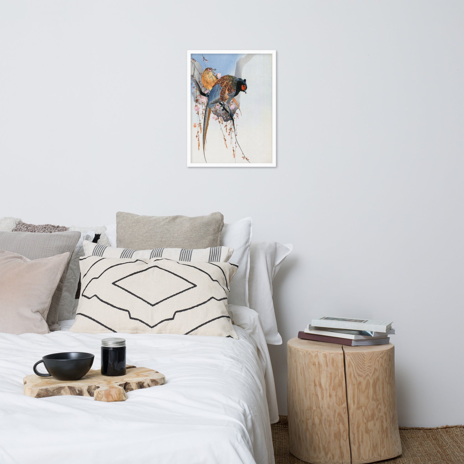 Invite tranquility and timeless beauty into your space with Pheasant Couple and Plum Blossom by Ohara Koson, a serene composition from the tradition of Japanese Woodblock Prints (Ukiyo-e). This framed artwork captures two pheasants perched gracefully on a blossoming branch—one adorned in vivid blue and russet plumage with striking red facial markings, the other in warm earth tones that echo the softness of early spring.