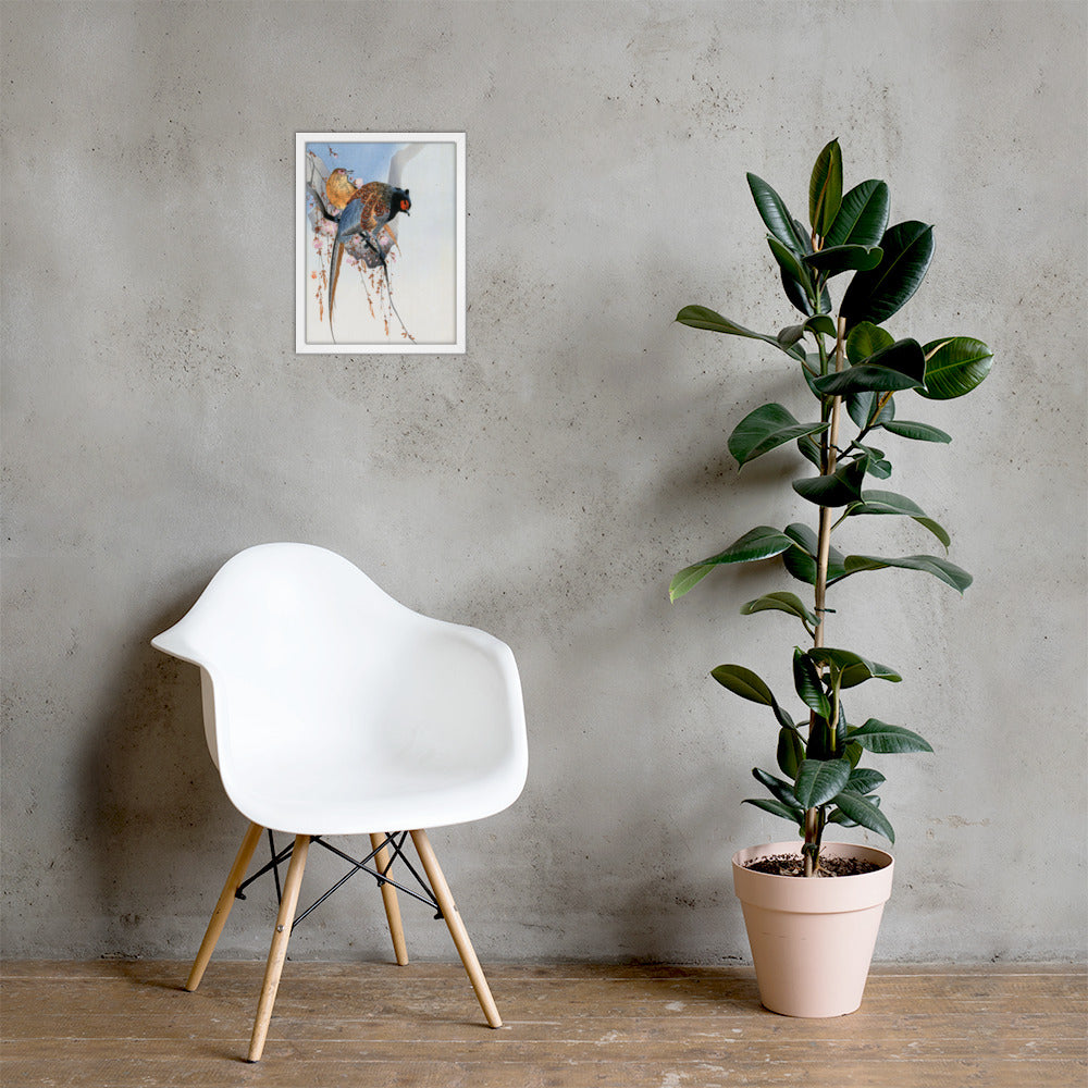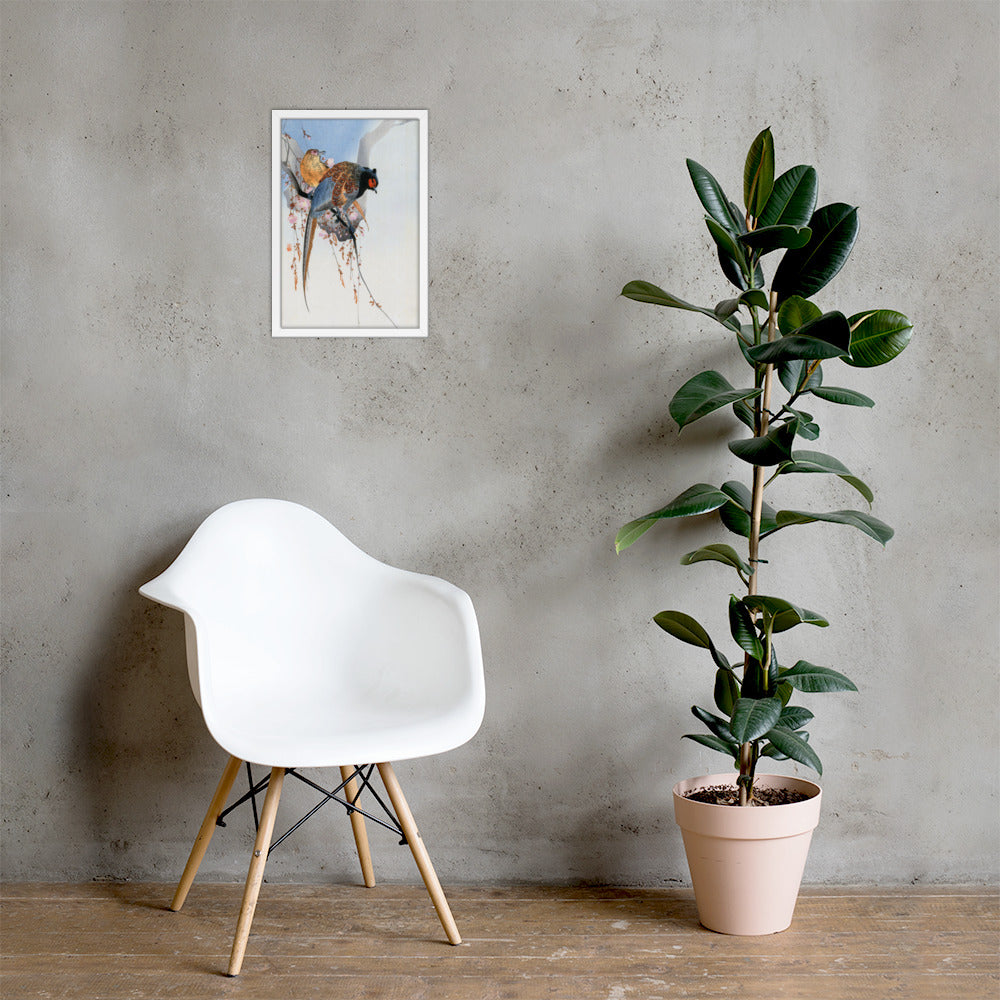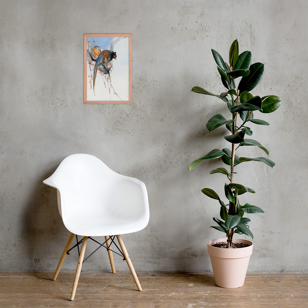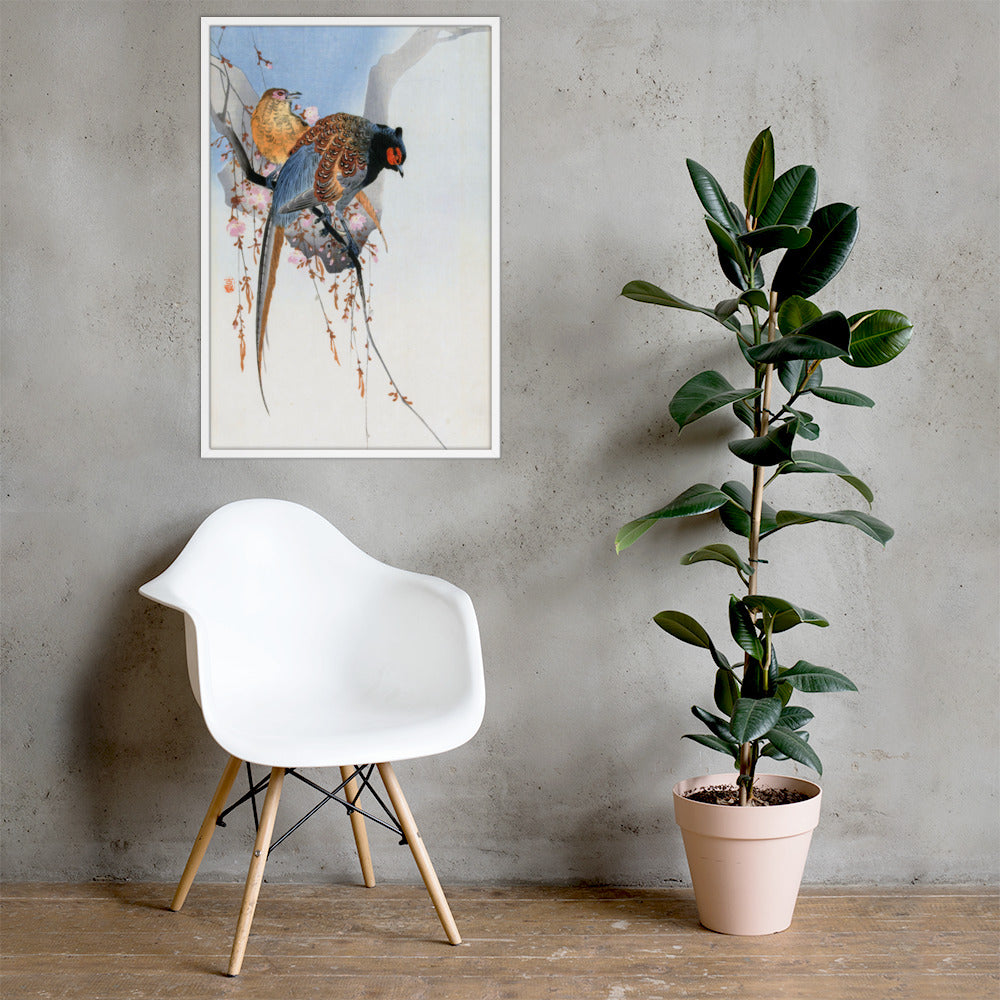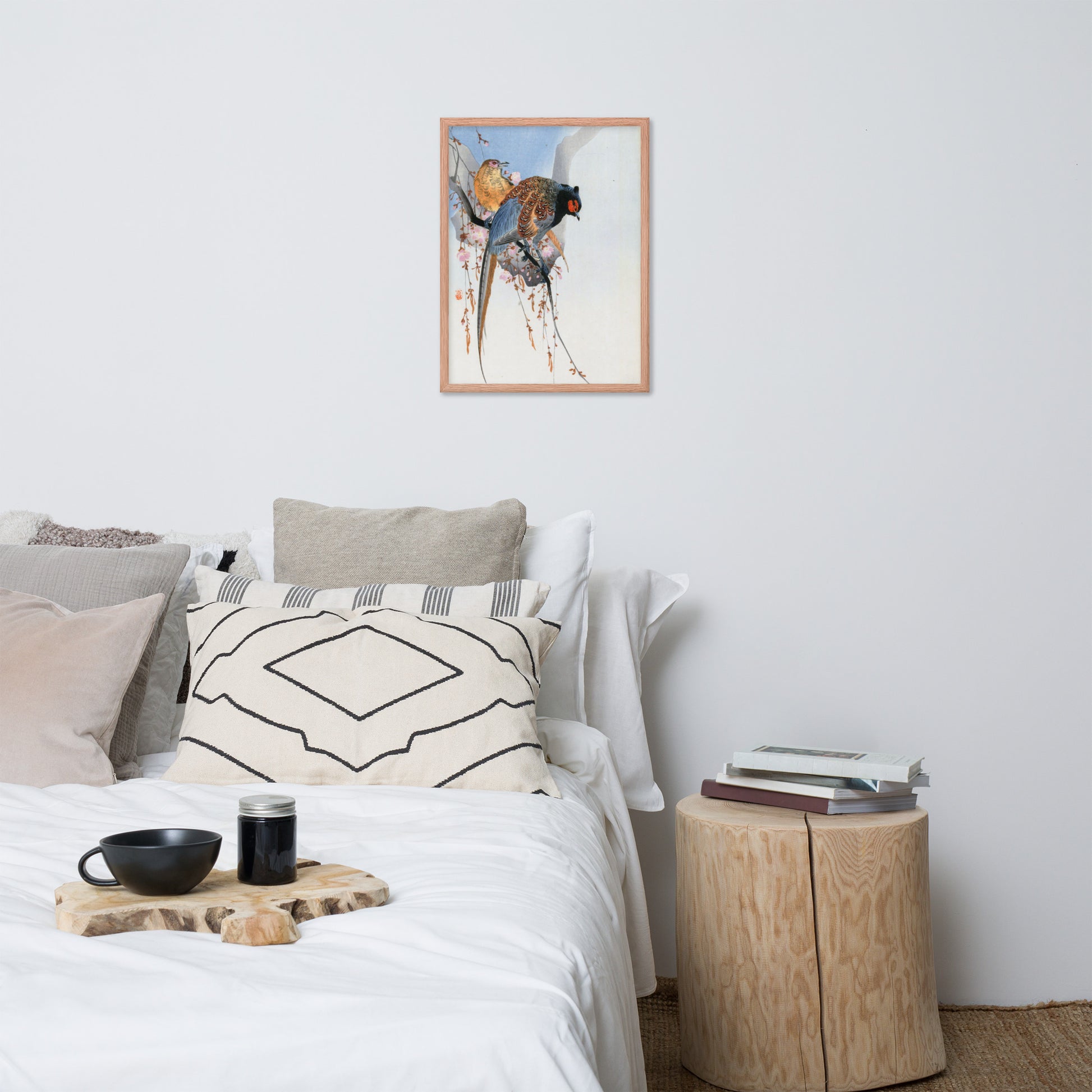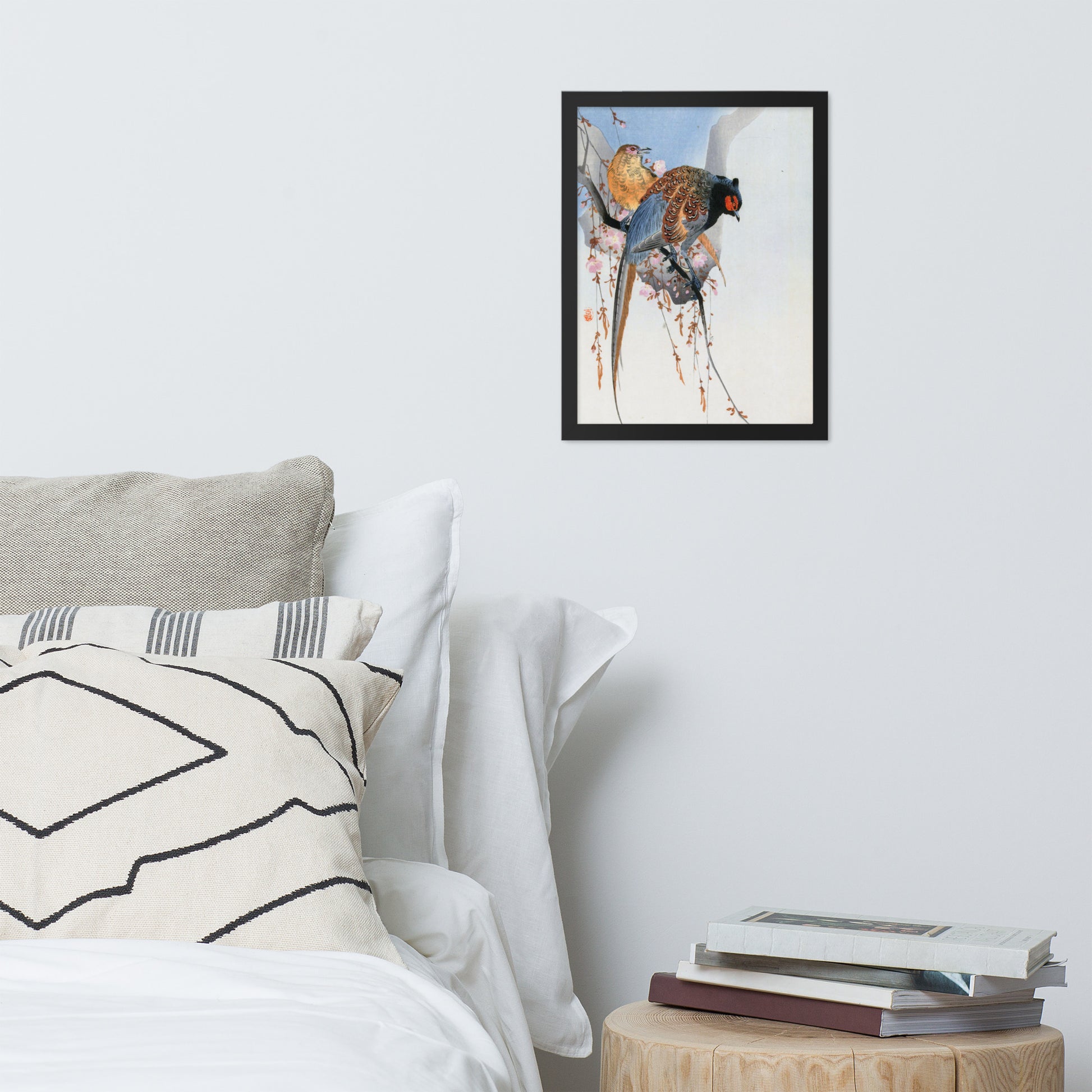 Invite tranquility and timeless beauty into your space with Pheasant Couple and Plum Blossom by Ohara Koson, a serene composition from the tradition of Japanese Woodblock Prints (Ukiyo-e). This framed artwork captures two pheasants perched gracefully on a blossoming branch—one adorned in vivid blue and russet plumage with striking red facial markings, the other in warm earth tones that echo the softness of early spring.