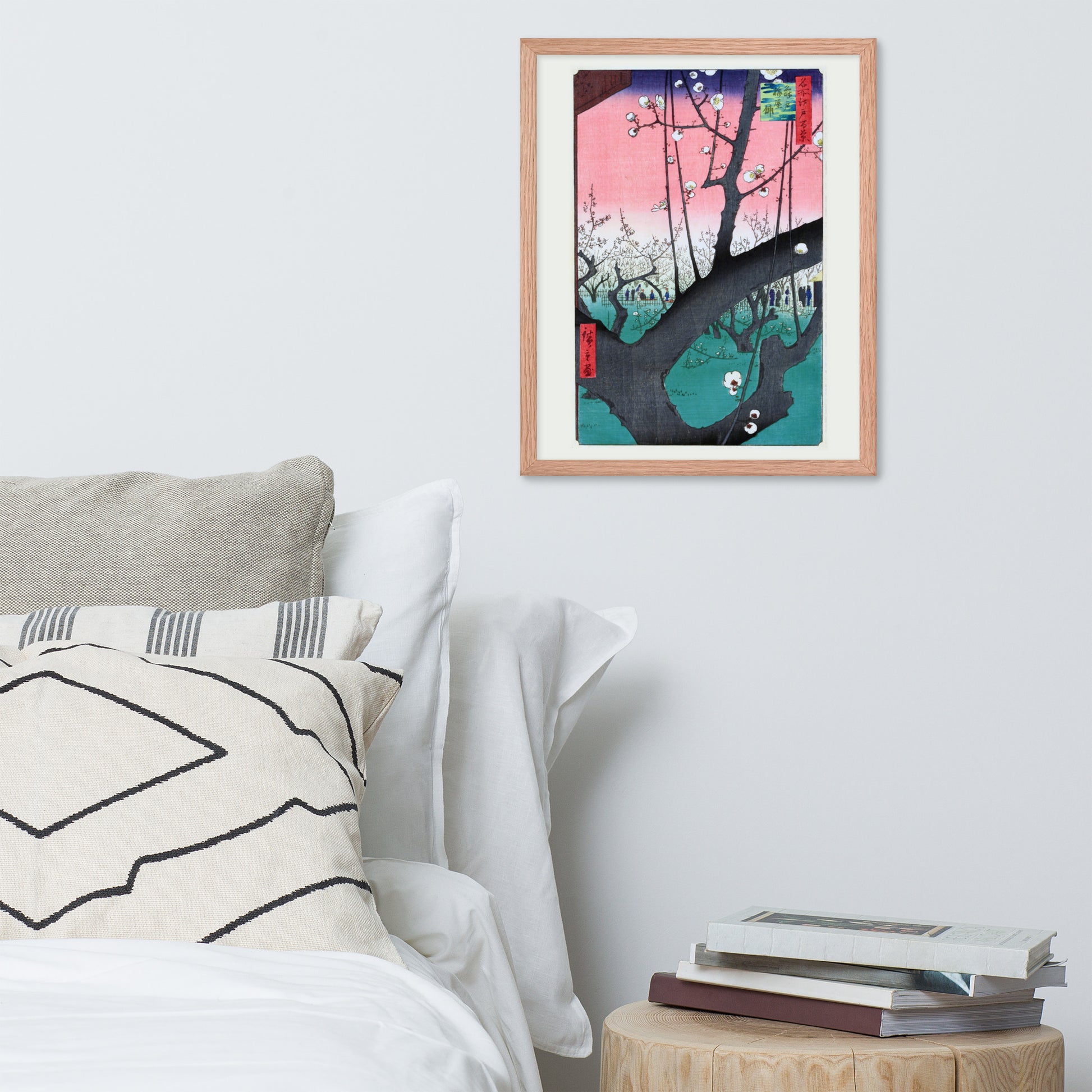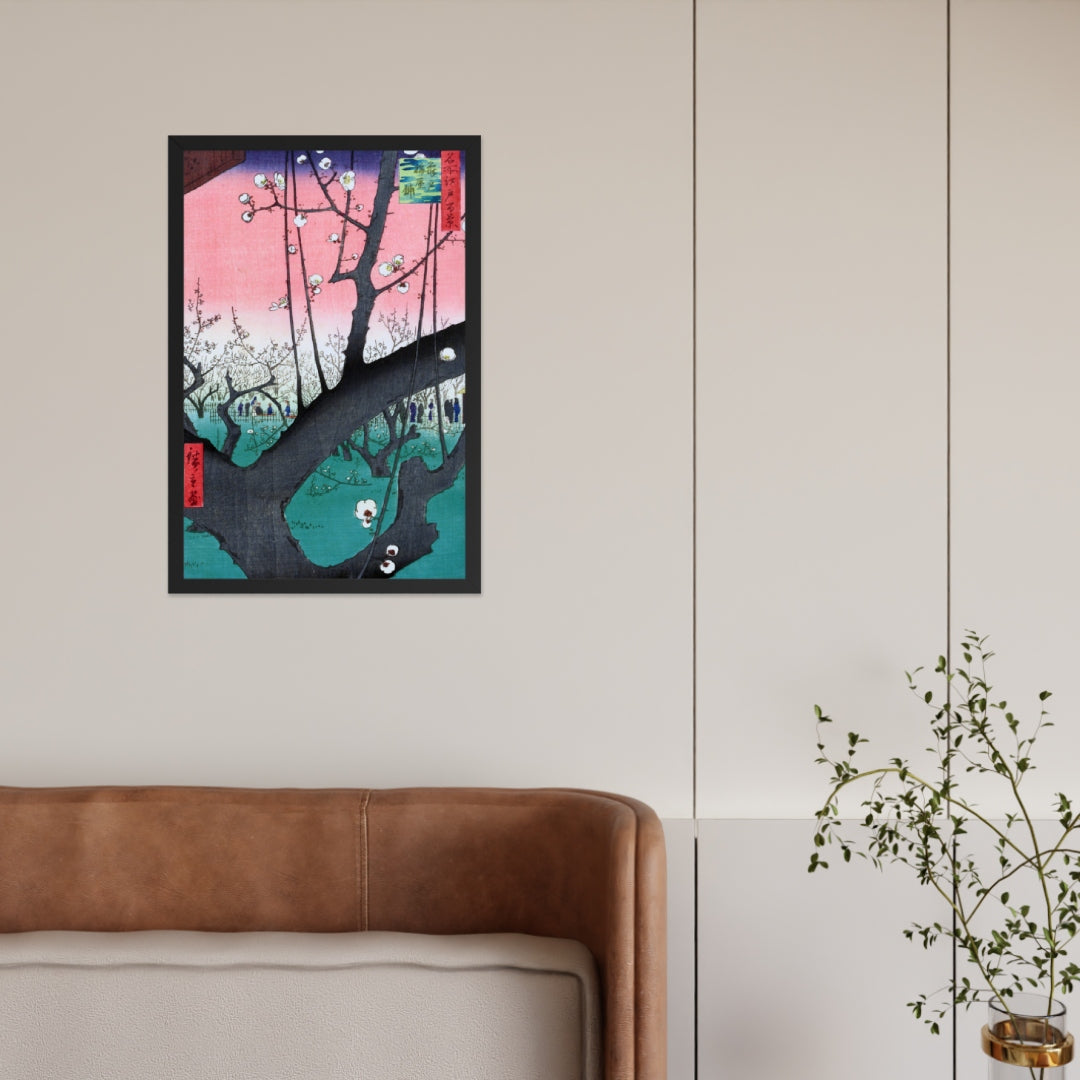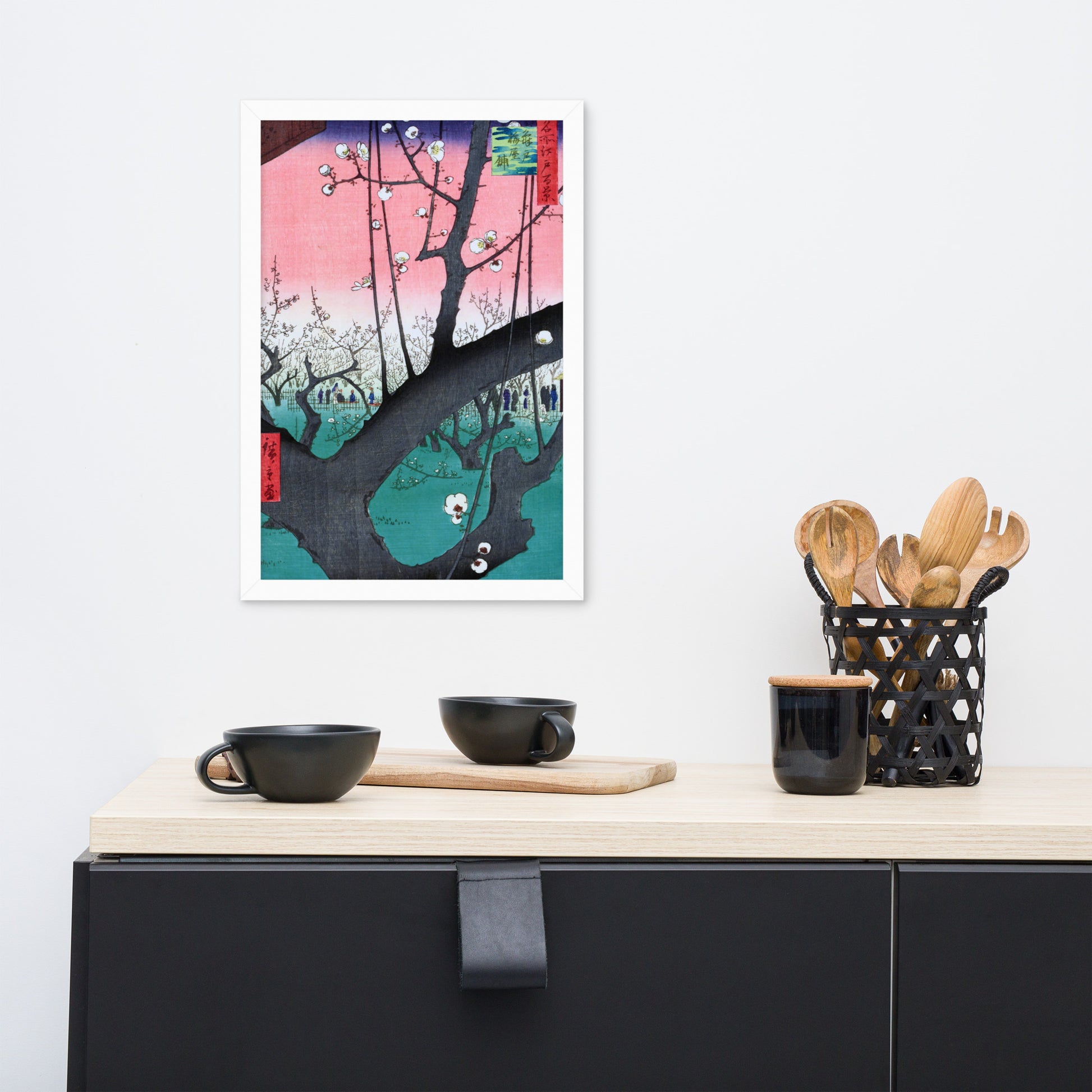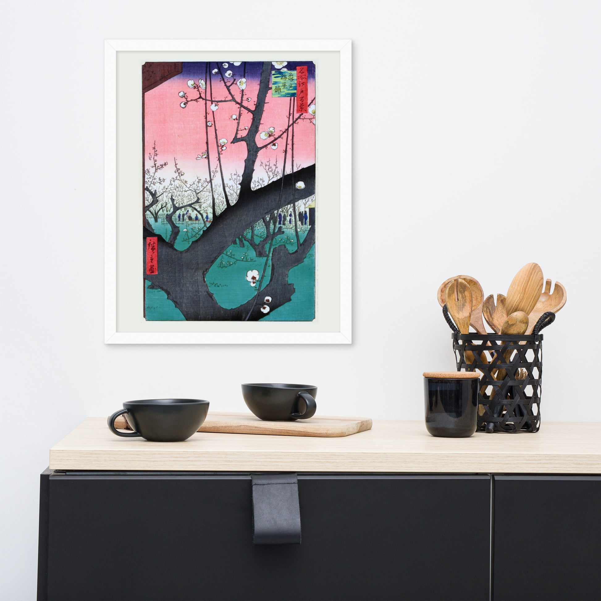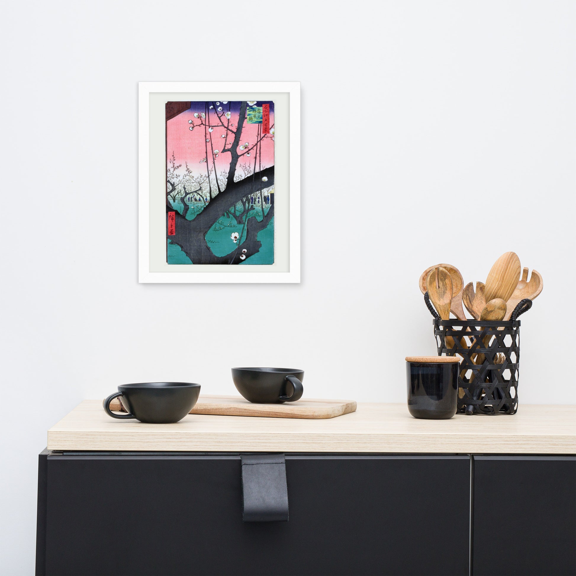Step into the poetic serenity of Edo-period Japan with Plum Park at Kameido by Utagawa Hiroshige—an iconic piece from the celebrated tradition of Japanese Woodblock Prints (Ukiyo-e). This framed wall art captures the quiet elegance of blooming plum trees, their white blossoms scattered across gnarled branches under a twilight sky that fades from deep indigo to soft pink and green. Hiroshige’s masterful composition draws the eye through a sweeping diagonal branch, inviting viewers into a tranquil garden scene where distant figures stroll among the trees.