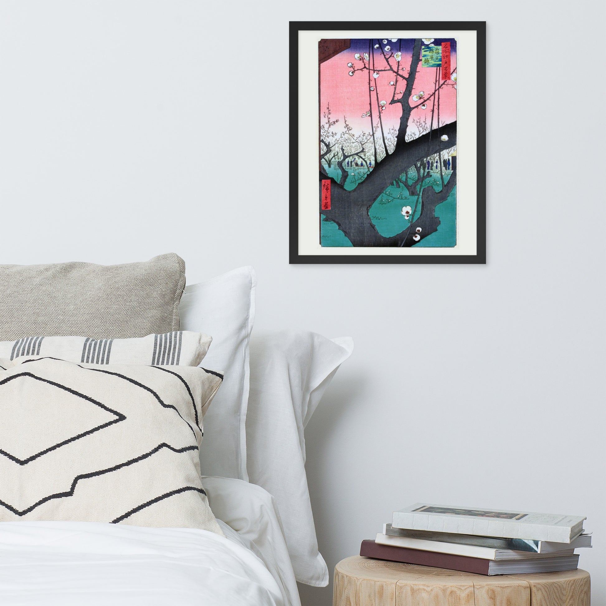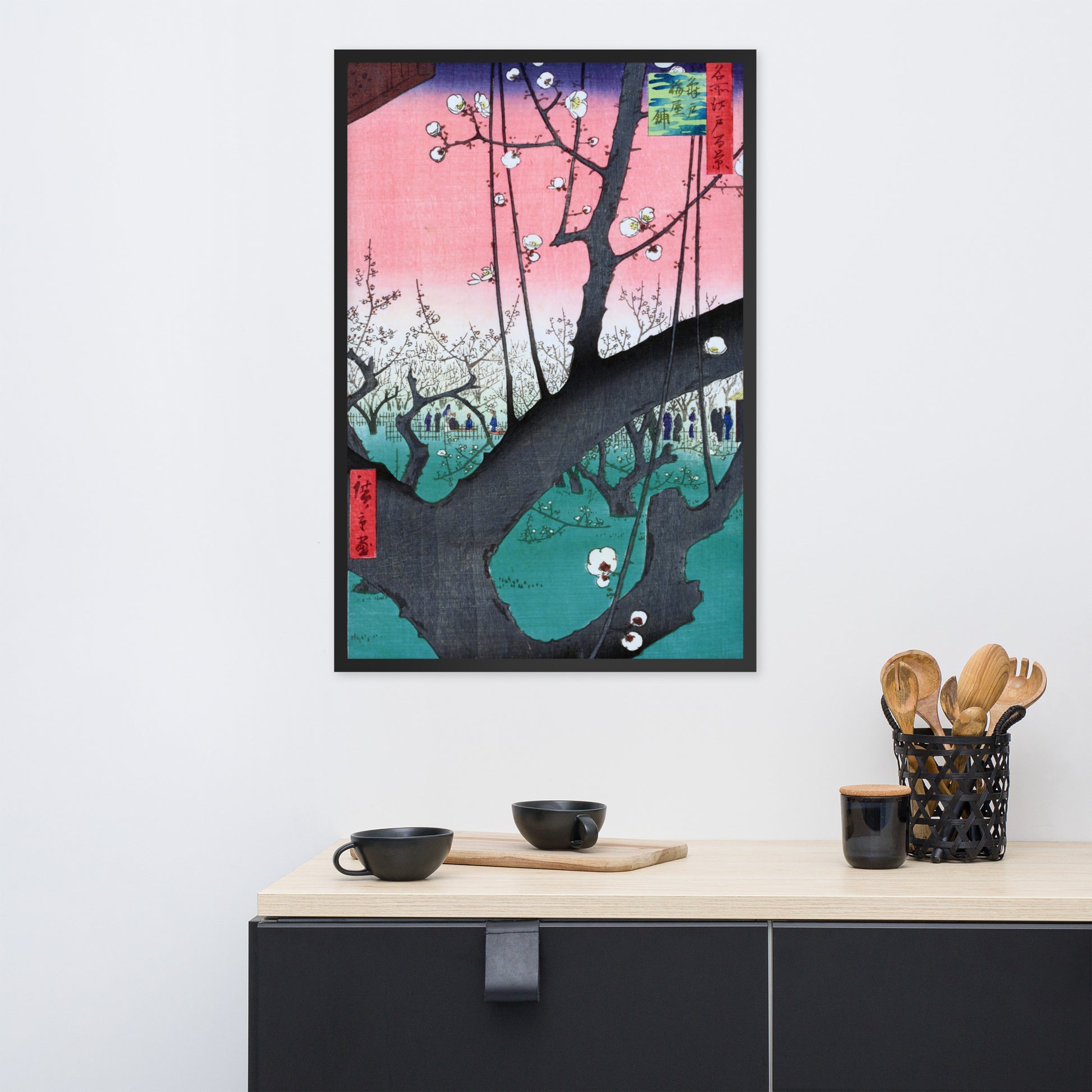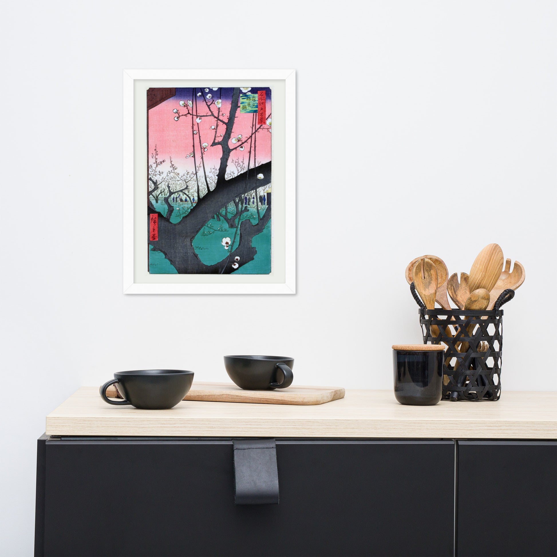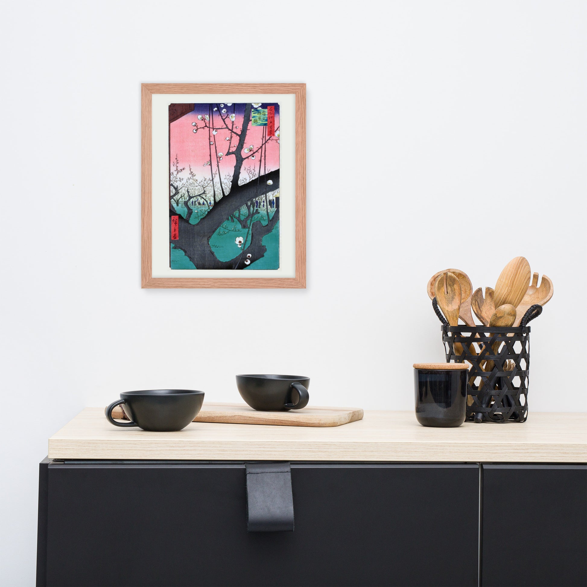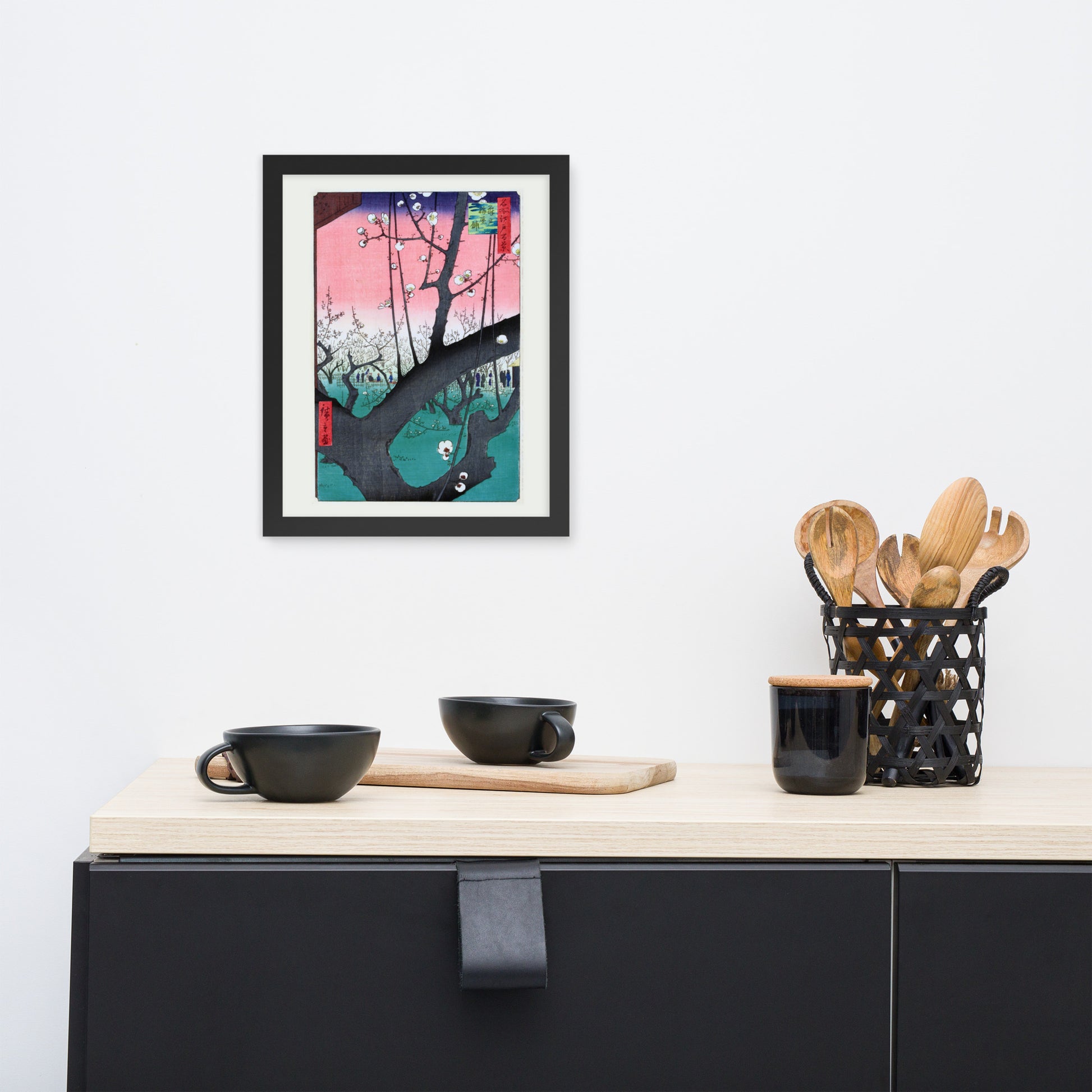 Step into the poetic serenity of Edo-period Japan with Plum Park at Kameido by Utagawa Hiroshige—an iconic piece from the celebrated tradition of Japanese Woodblock Prints (Ukiyo-e). This framed wall art captures the quiet elegance of blooming plum trees, their white blossoms scattered across gnarled branches under a twilight sky that fades from deep indigo to soft pink and green. Hiroshige’s masterful composition draws the eye through a sweeping diagonal branch, inviting viewers into a tranquil garden scene where distant figures stroll among the trees.