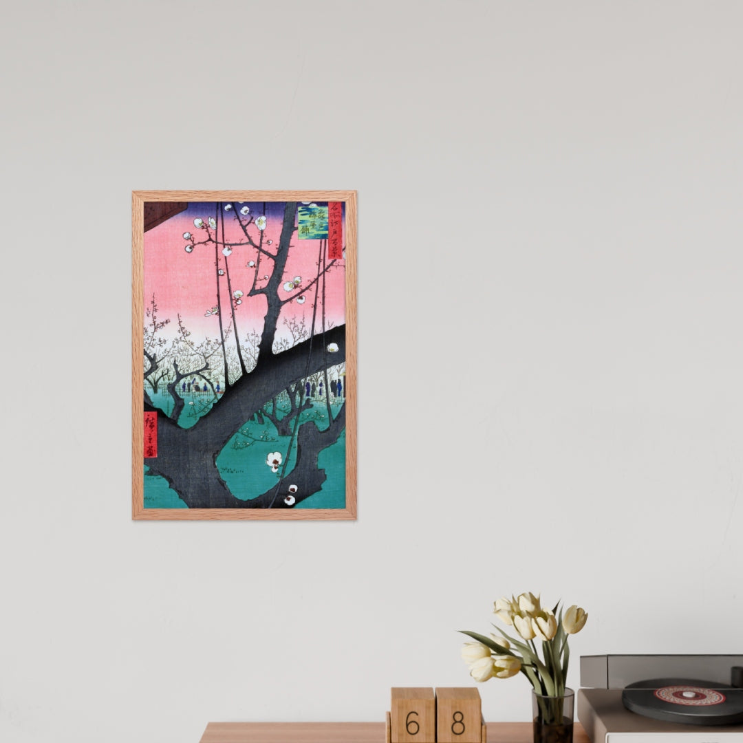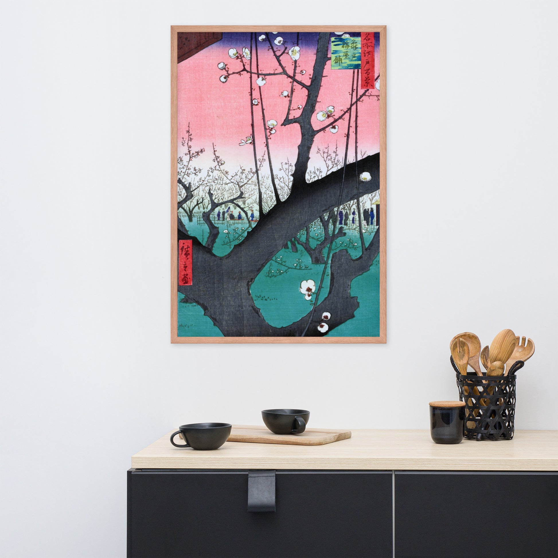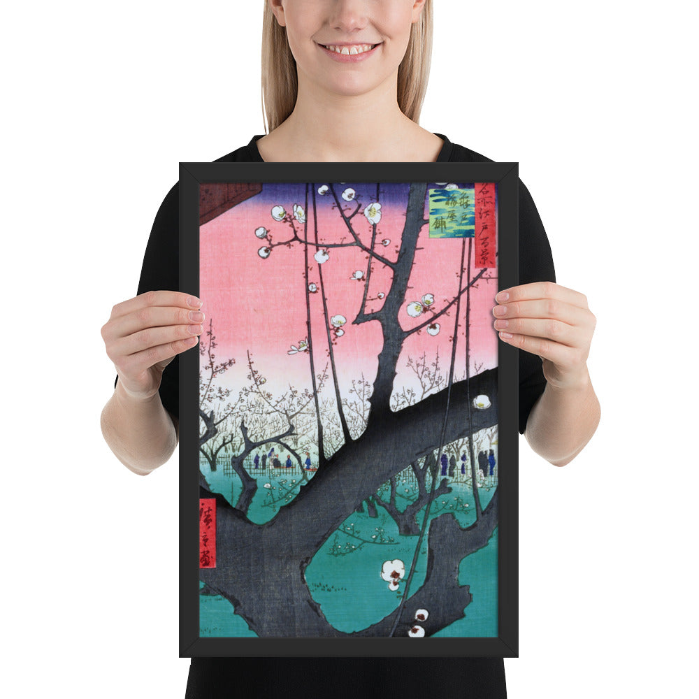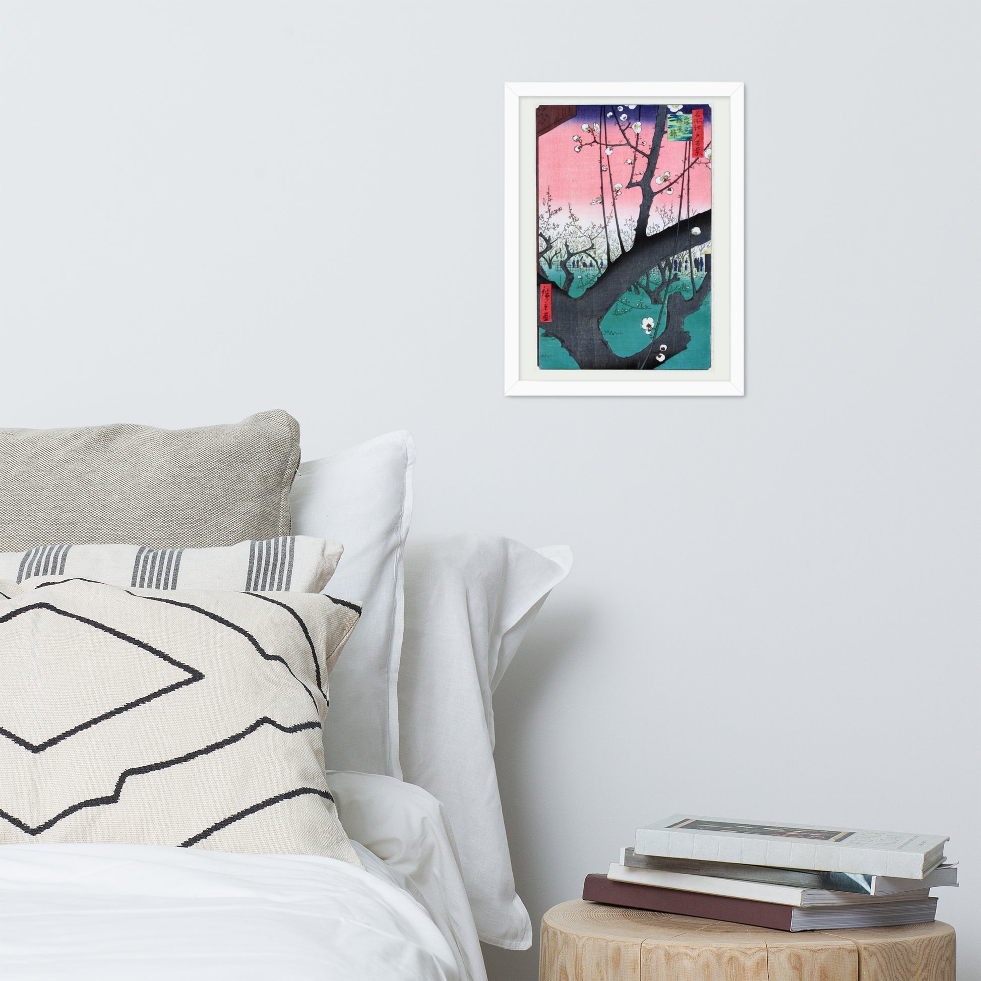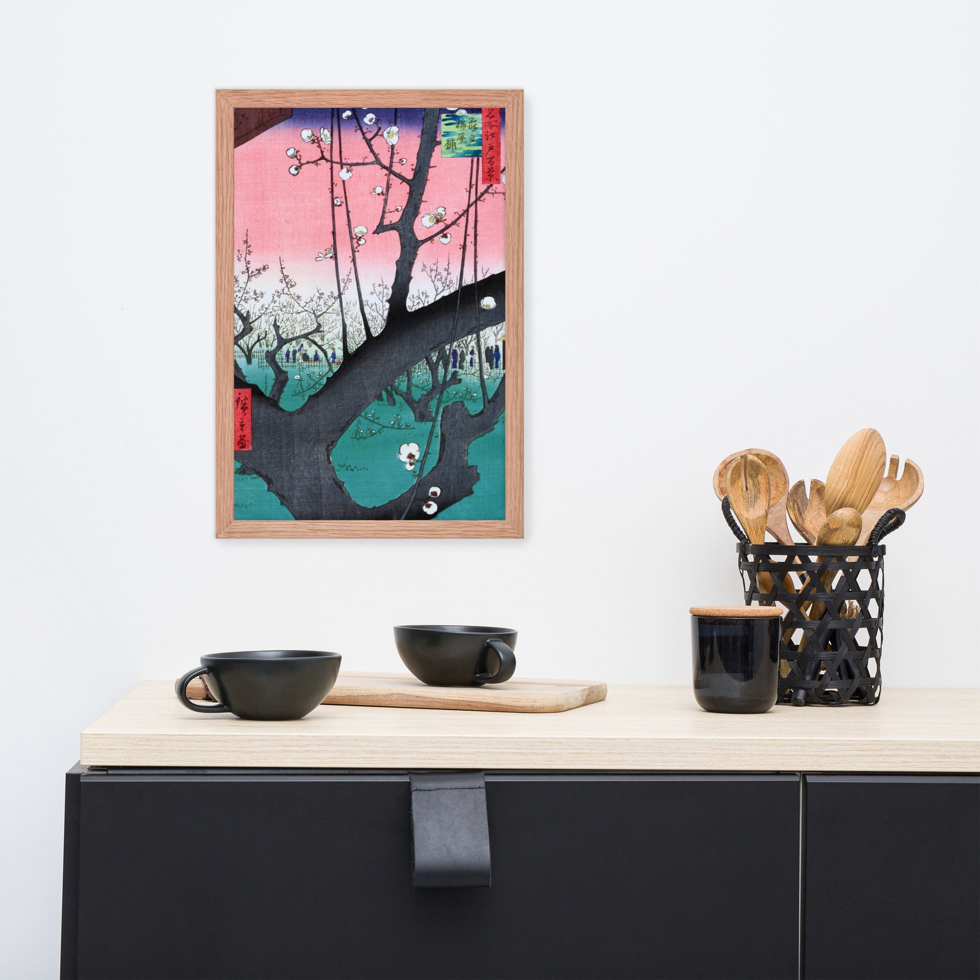 Step into the poetic serenity of Edo-period Japan with Plum Park at Kameido by Utagawa Hiroshige—an iconic piece from the celebrated tradition of Japanese Woodblock Prints (Ukiyo-e). This framed wall art captures the quiet elegance of blooming plum trees, their white blossoms scattered across gnarled branches under a twilight sky that fades from deep indigo to soft pink and green. Hiroshige’s masterful composition draws the eye through a sweeping diagonal branch, inviting viewers into a tranquil garden scene where distant figures stroll among the trees.