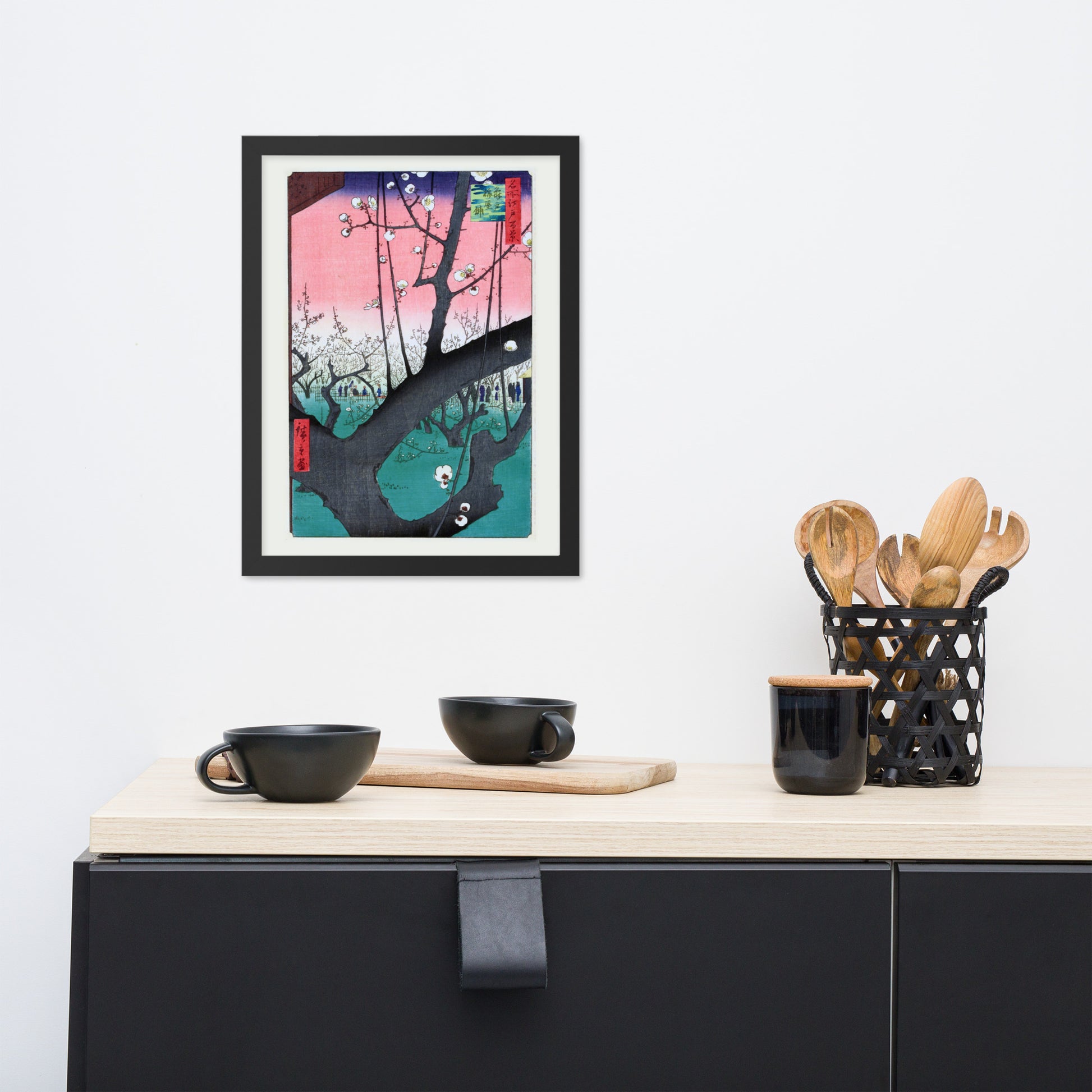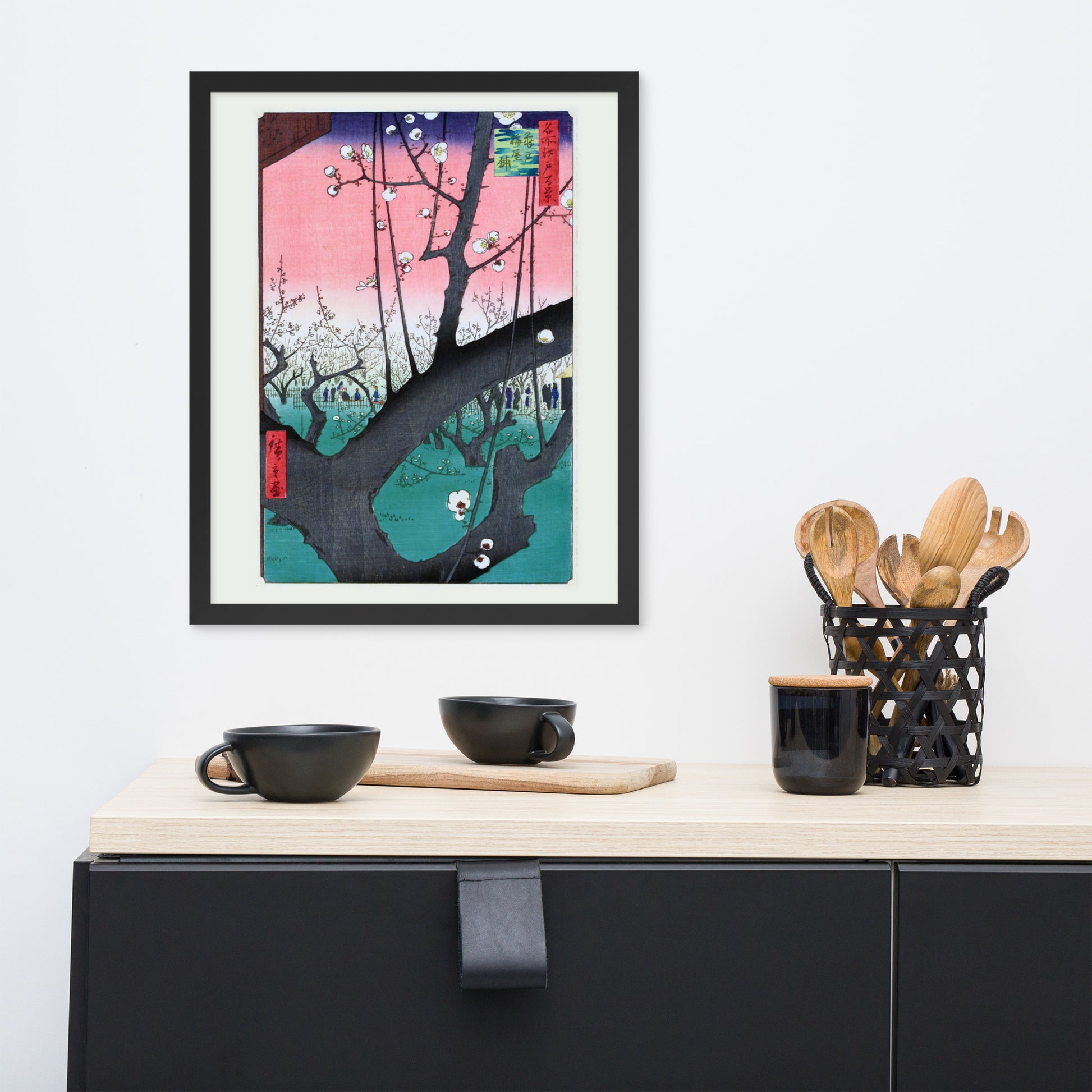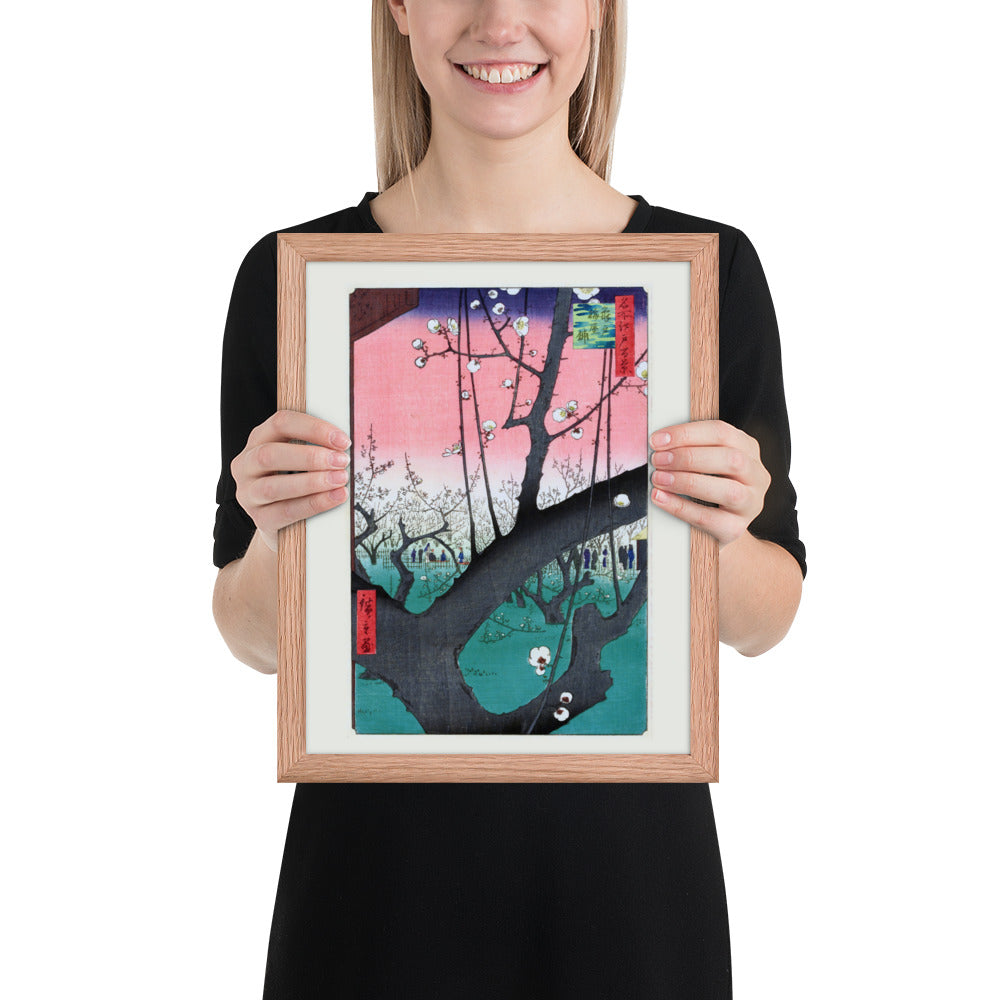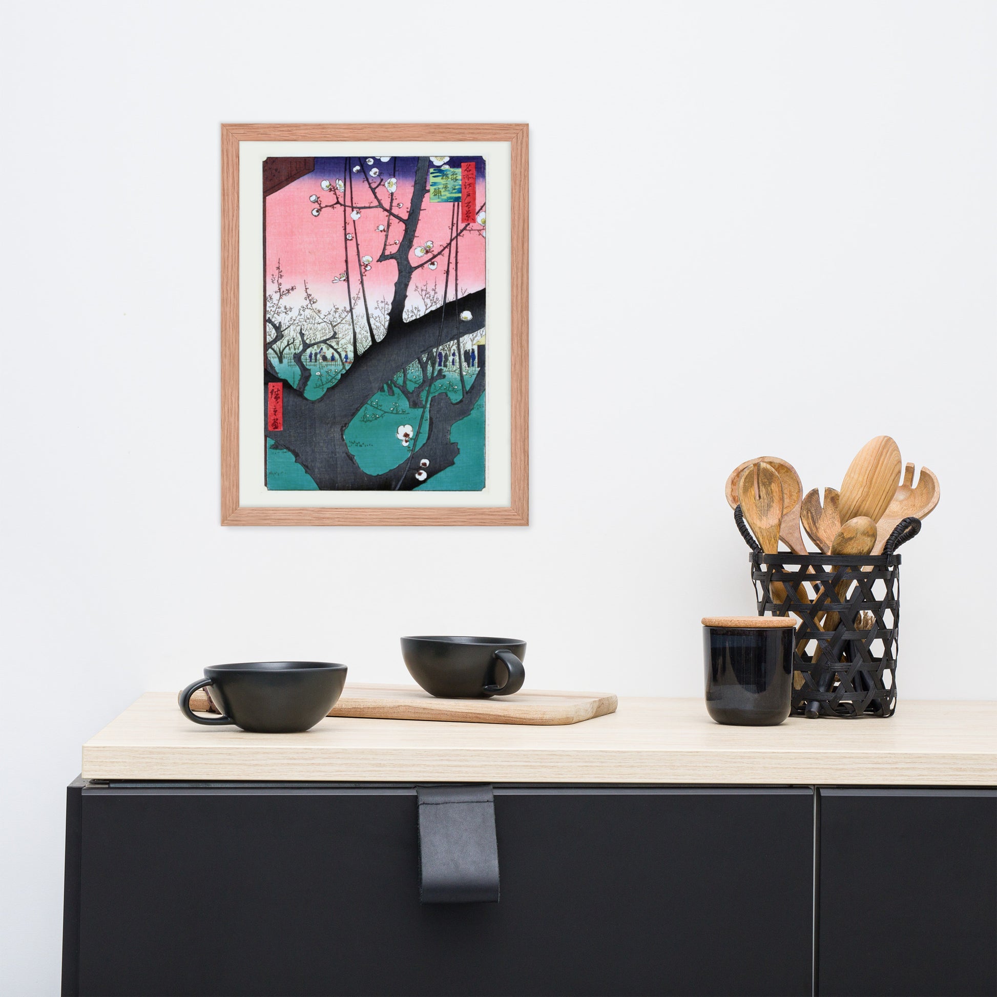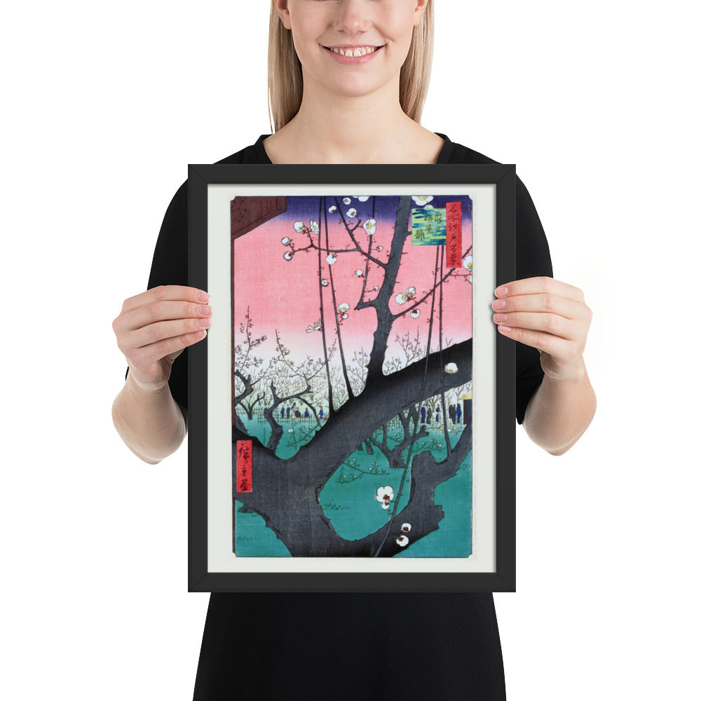 Step into the poetic serenity of Edo-period Japan with Plum Park at Kameido by Utagawa Hiroshige—an iconic piece from the celebrated tradition of Japanese Woodblock Prints (Ukiyo-e). This framed wall art captures the quiet elegance of blooming plum trees, their white blossoms scattered across gnarled branches under a twilight sky that fades from deep indigo to soft pink and green. Hiroshige’s masterful composition draws the eye through a sweeping diagonal branch, inviting viewers into a tranquil garden scene where distant figures stroll among the trees.
