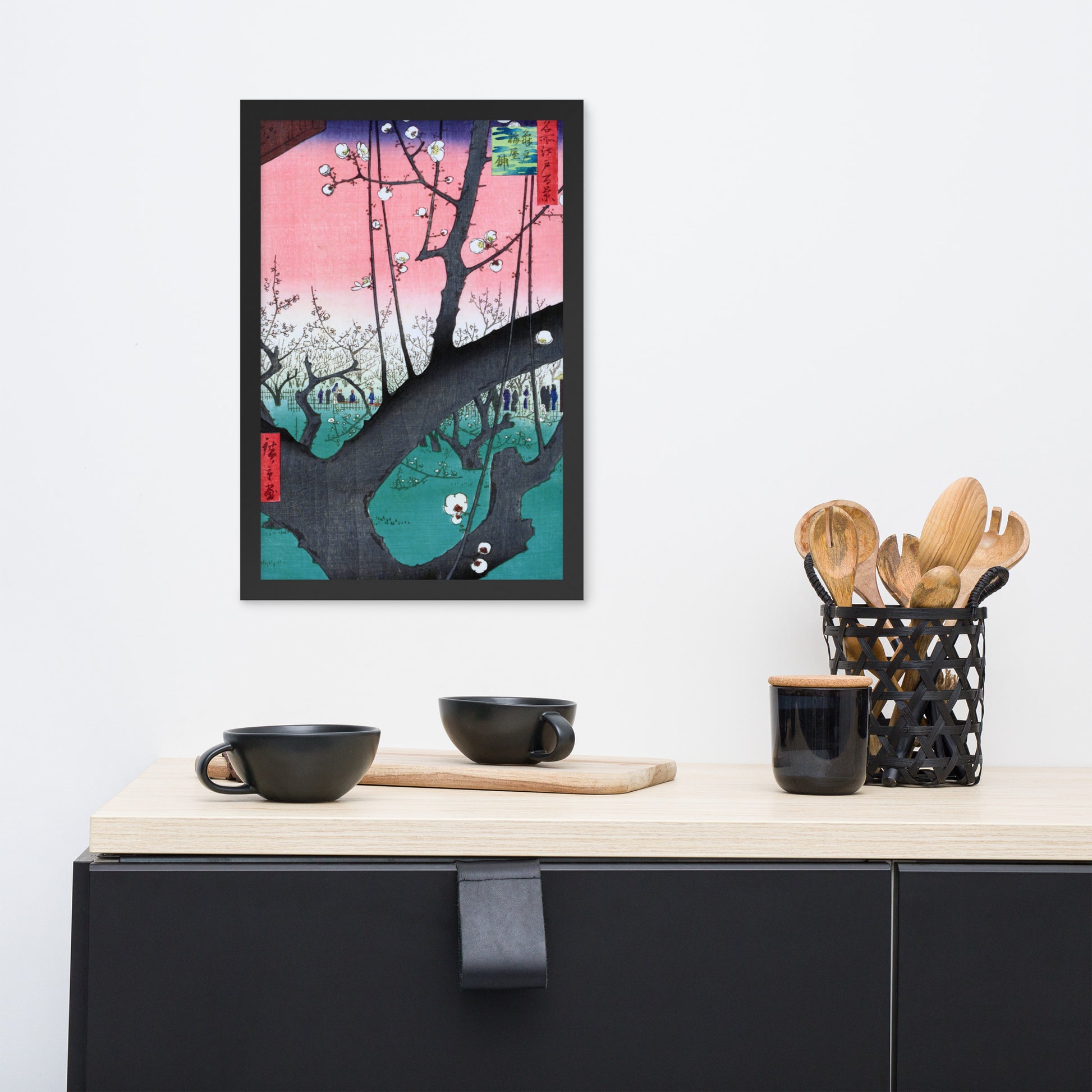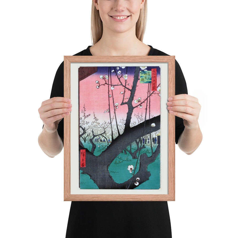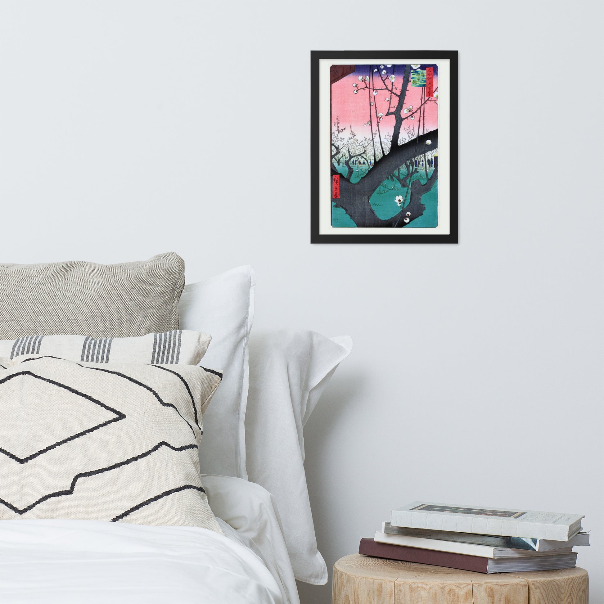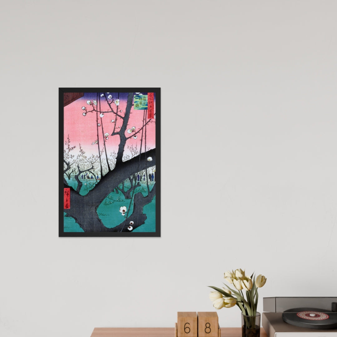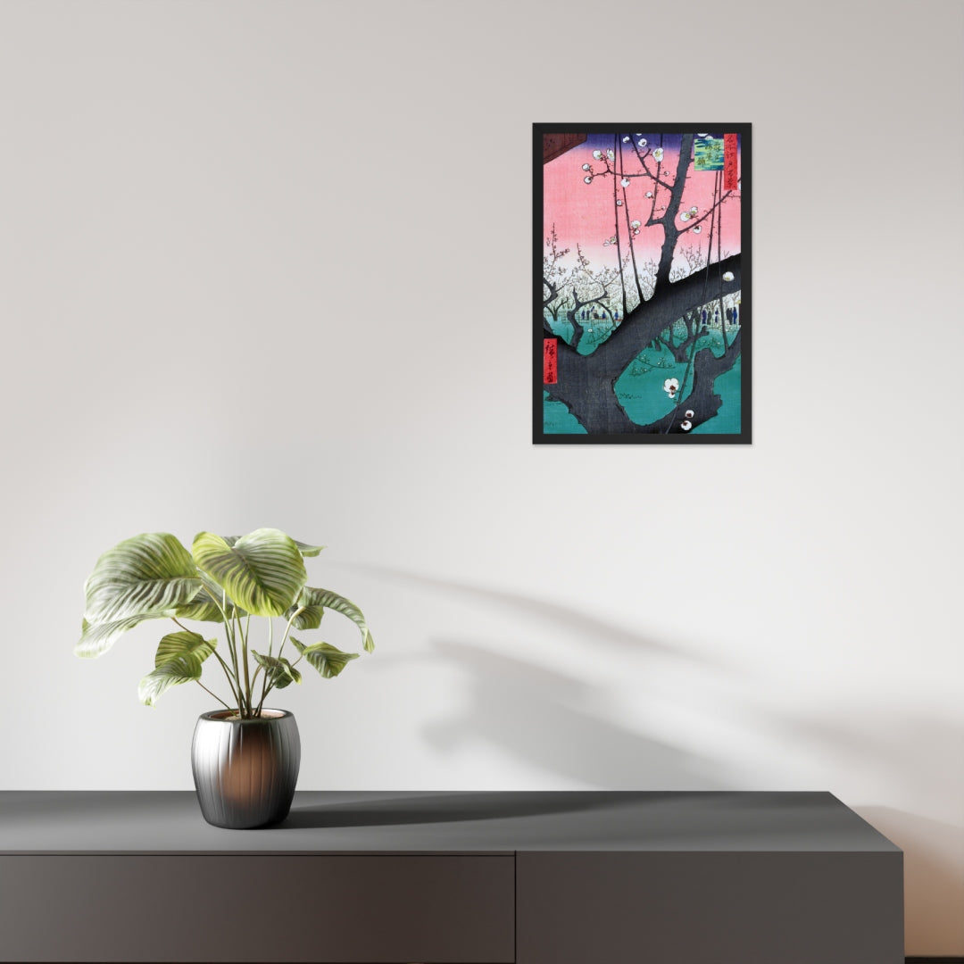Step into the poetic serenity of Edo-period Japan with Plum Park at Kameido by Utagawa Hiroshige—an iconic piece from the celebrated tradition of Japanese Woodblock Prints (Ukiyo-e). This framed wall art captures the quiet elegance of blooming plum trees, their white blossoms scattered across gnarled branches under a twilight sky that fades from deep indigo to soft pink and green. Hiroshige’s masterful composition draws the eye through a sweeping diagonal branch, inviting viewers into a tranquil garden scene where distant figures stroll among the trees.