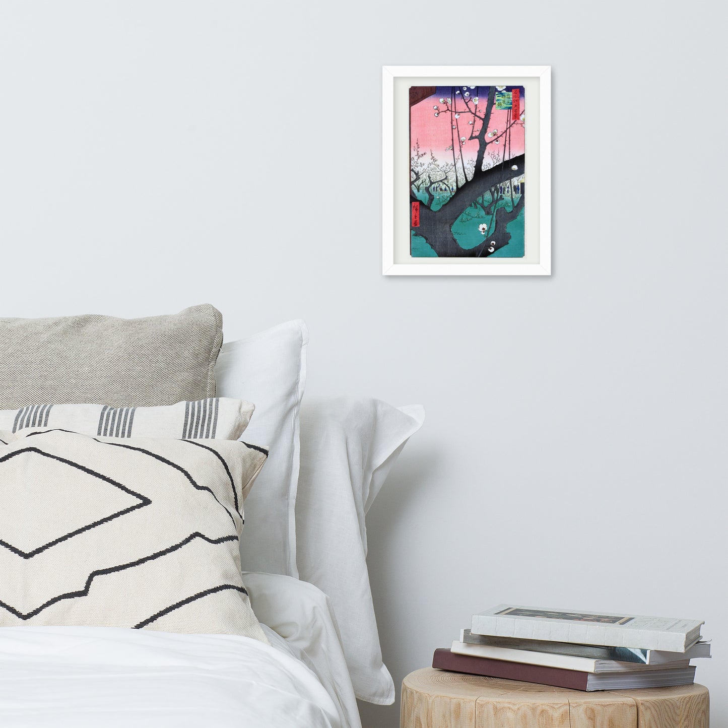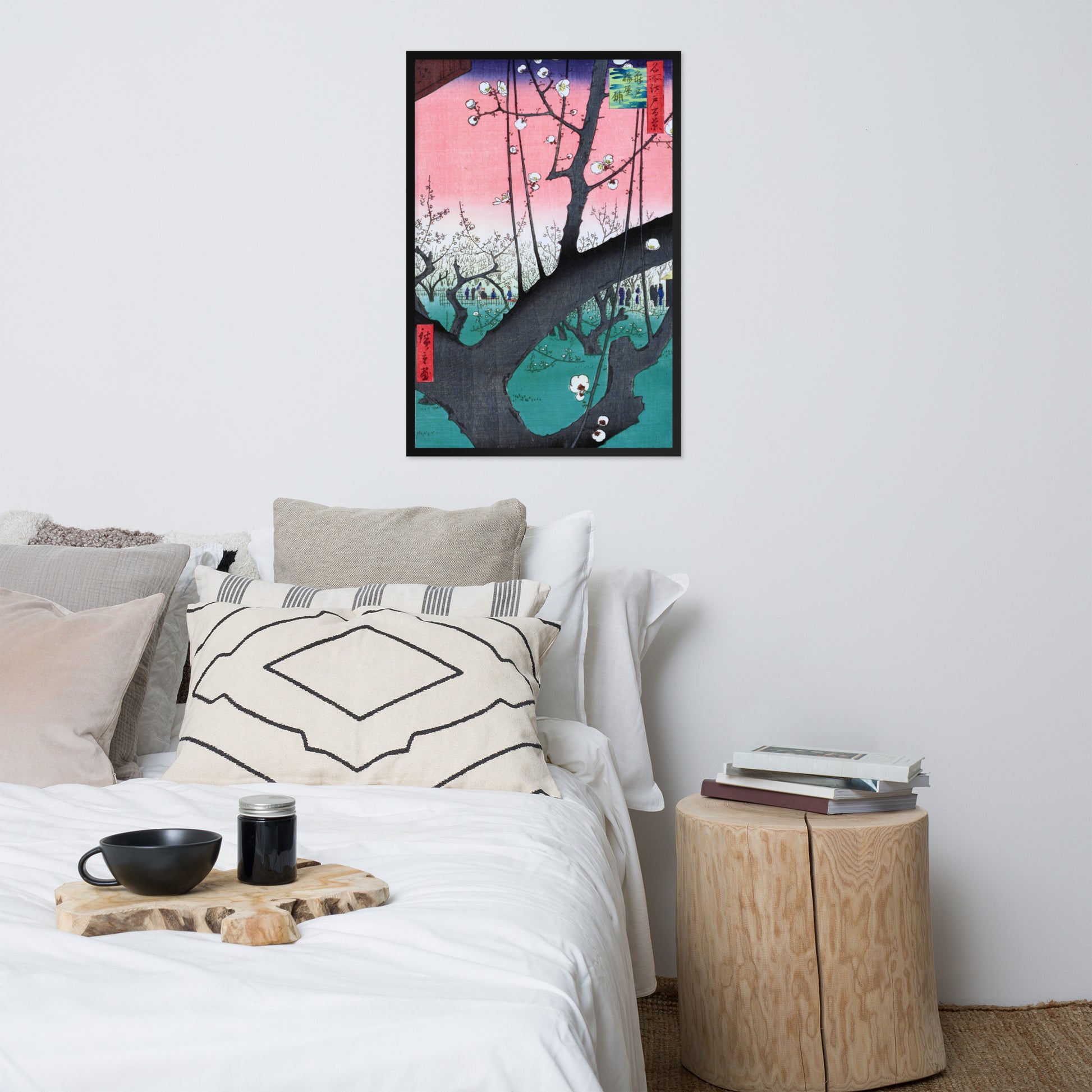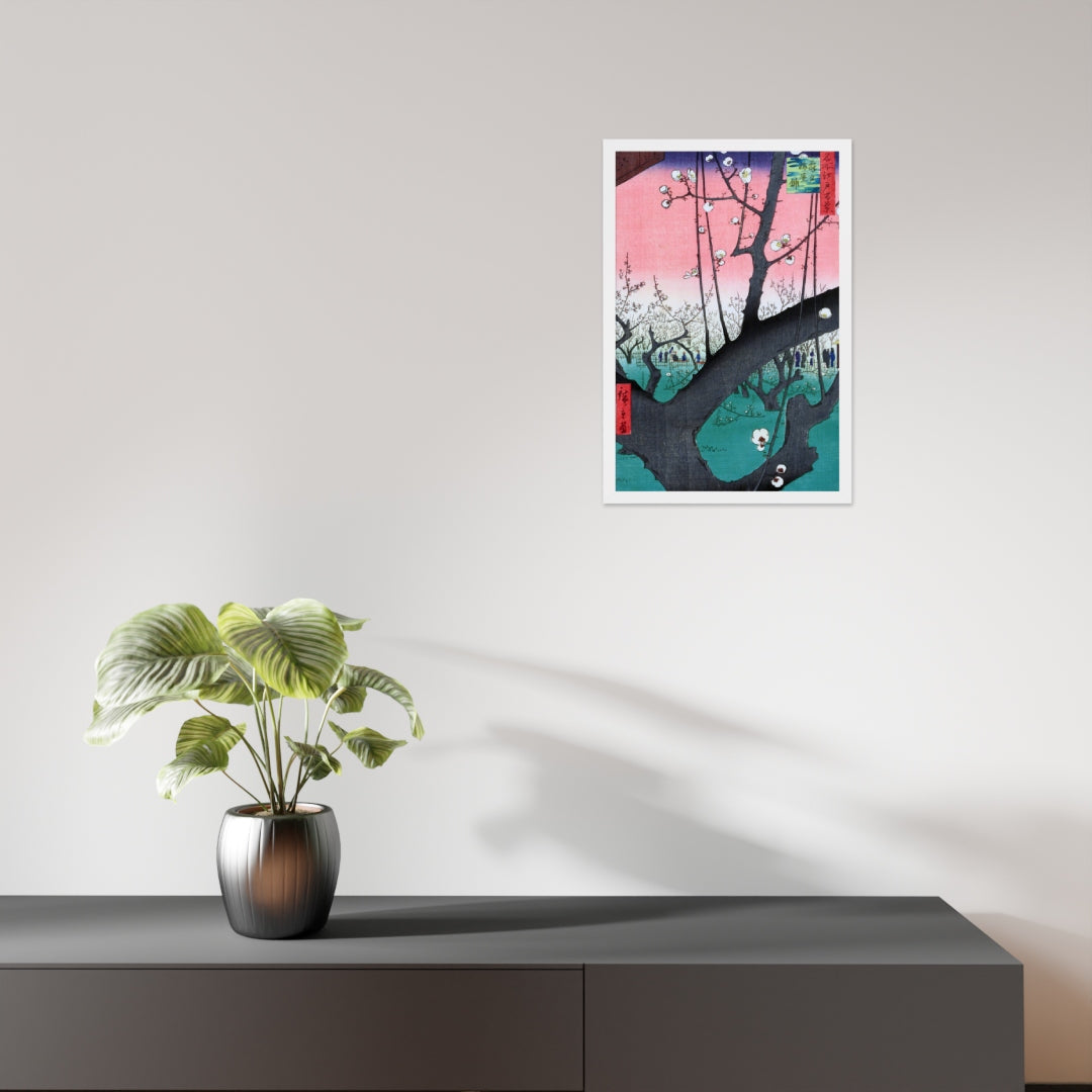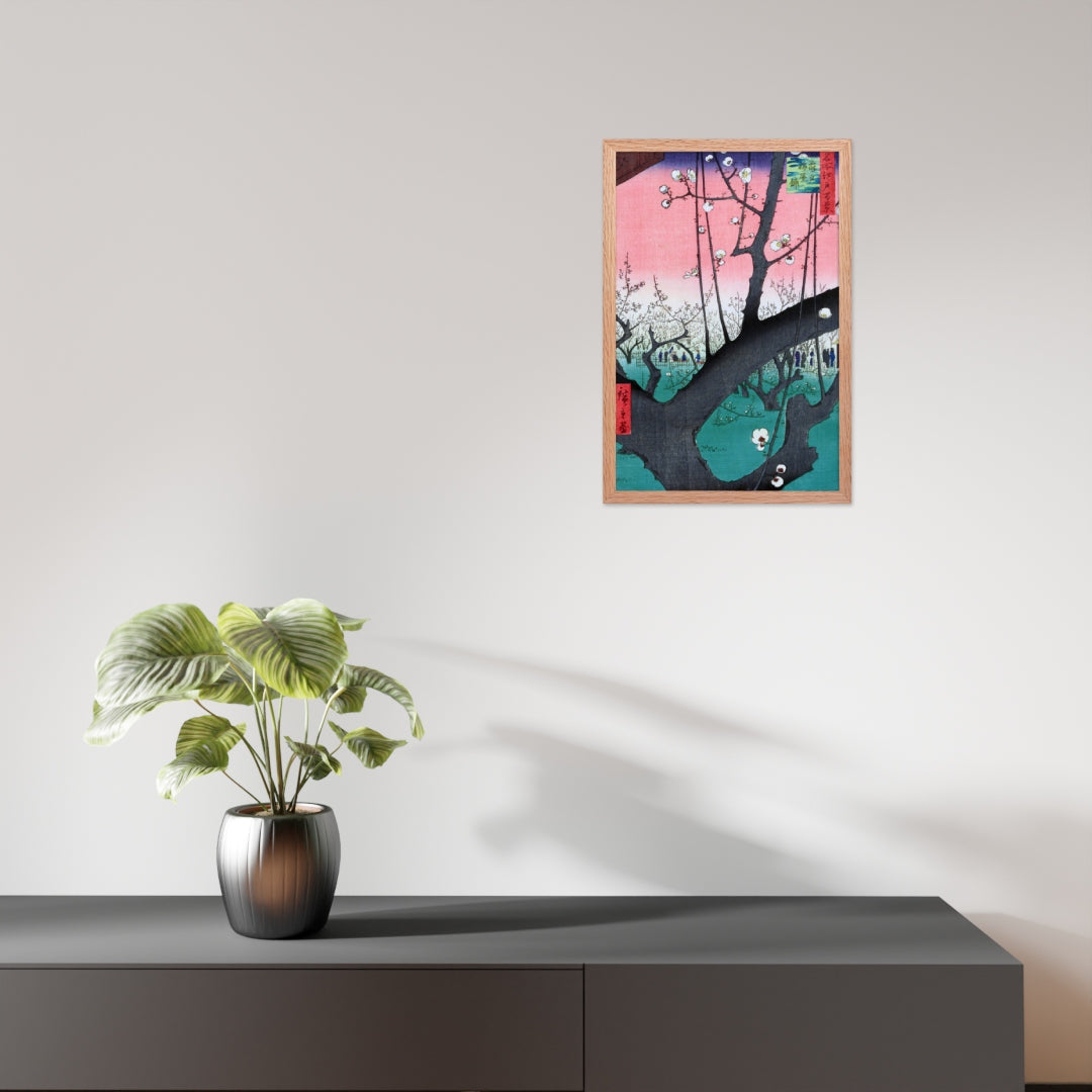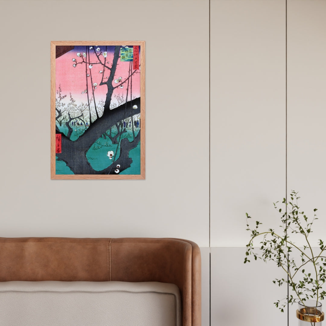 Step into the poetic serenity of Edo-period Japan with Plum Park at Kameido by Utagawa Hiroshige—an iconic piece from the celebrated tradition of Japanese Woodblock Prints (Ukiyo-e). This framed wall art captures the quiet elegance of blooming plum trees, their white blossoms scattered across gnarled branches under a twilight sky that fades from deep indigo to soft pink and green. Hiroshige’s masterful composition draws the eye through a sweeping diagonal branch, inviting viewers into a tranquil garden scene where distant figures stroll among the trees.