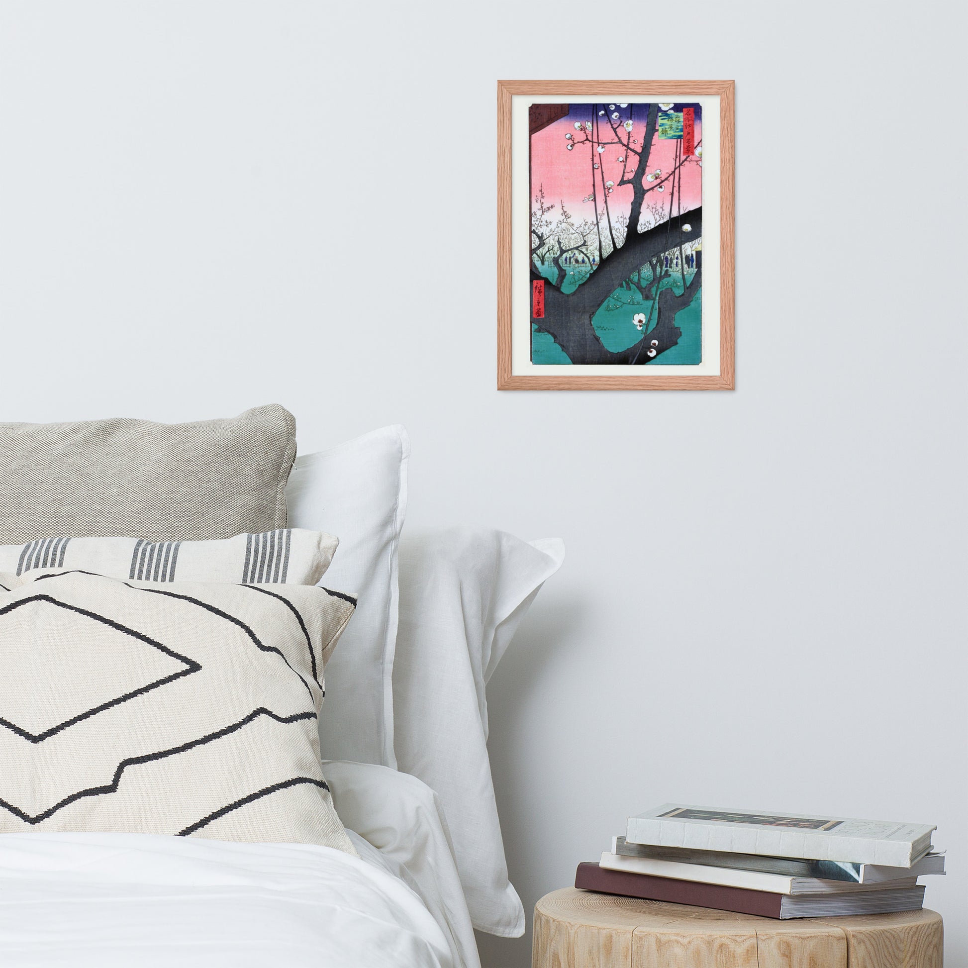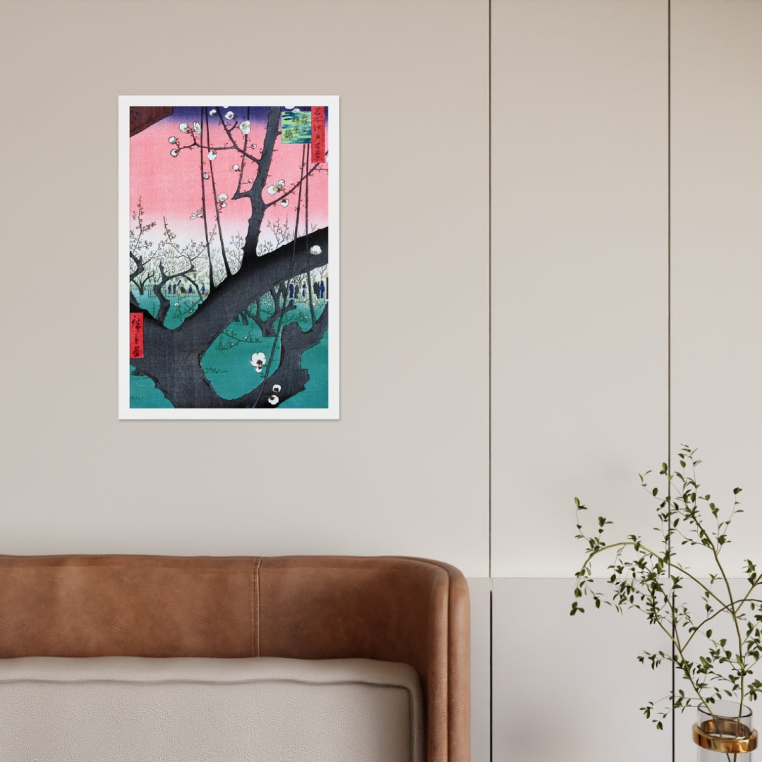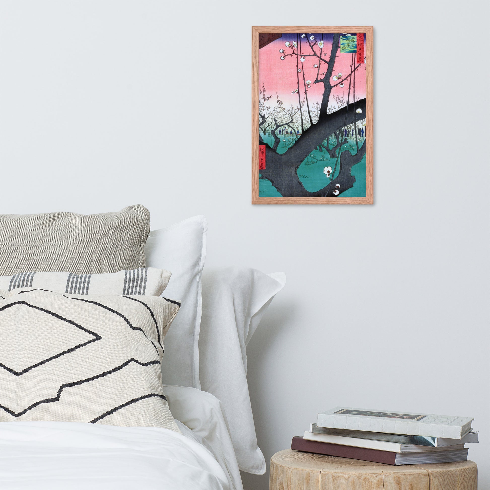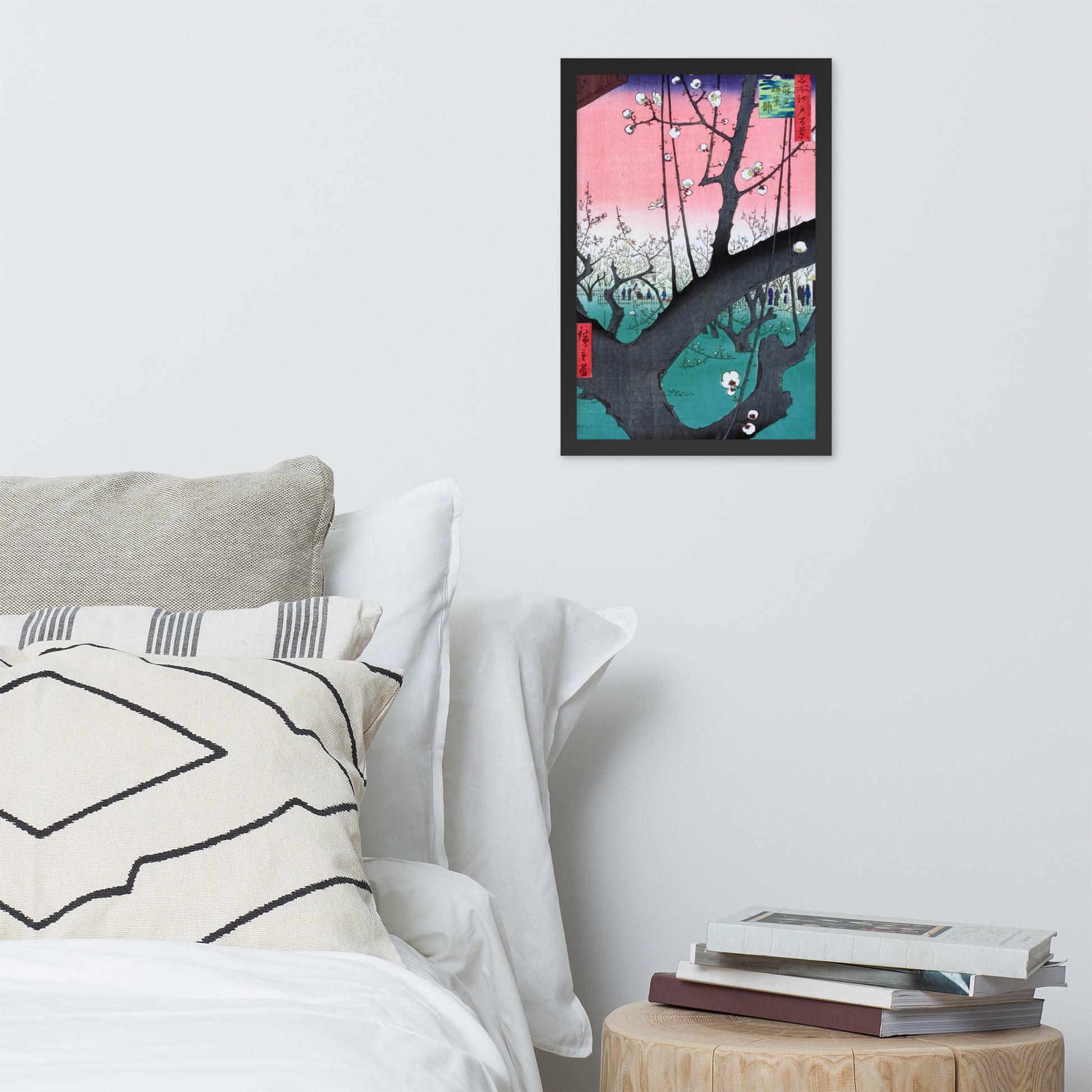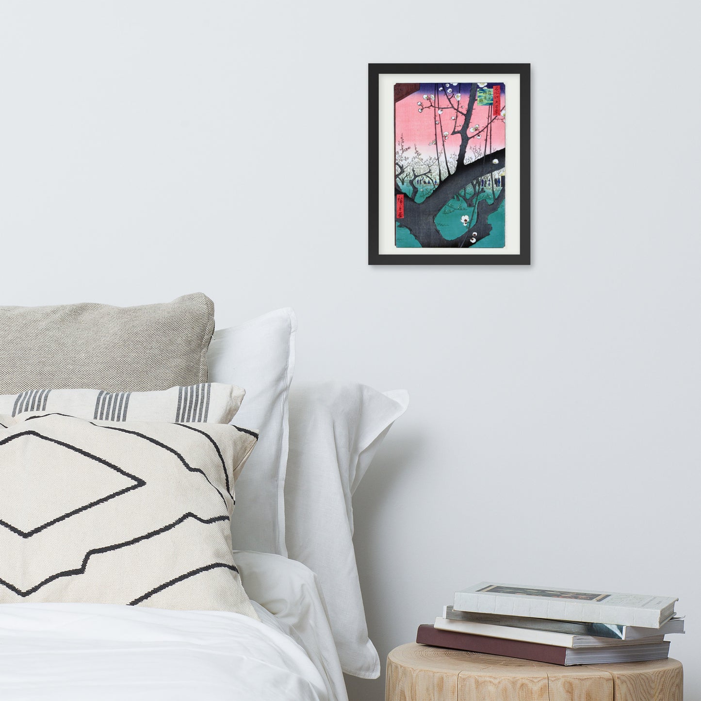 Step into the poetic serenity of Edo-period Japan with Plum Park at Kameido by Utagawa Hiroshige—an iconic piece from the celebrated tradition of Japanese Woodblock Prints (Ukiyo-e). This framed wall art captures the quiet elegance of blooming plum trees, their white blossoms scattered across gnarled branches under a twilight sky that fades from deep indigo to soft pink and green. Hiroshige’s masterful composition draws the eye through a sweeping diagonal branch, inviting viewers into a tranquil garden scene where distant figures stroll among the trees.