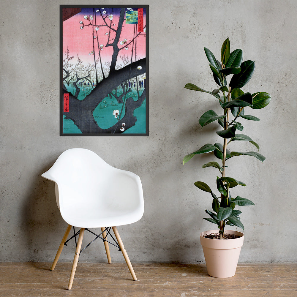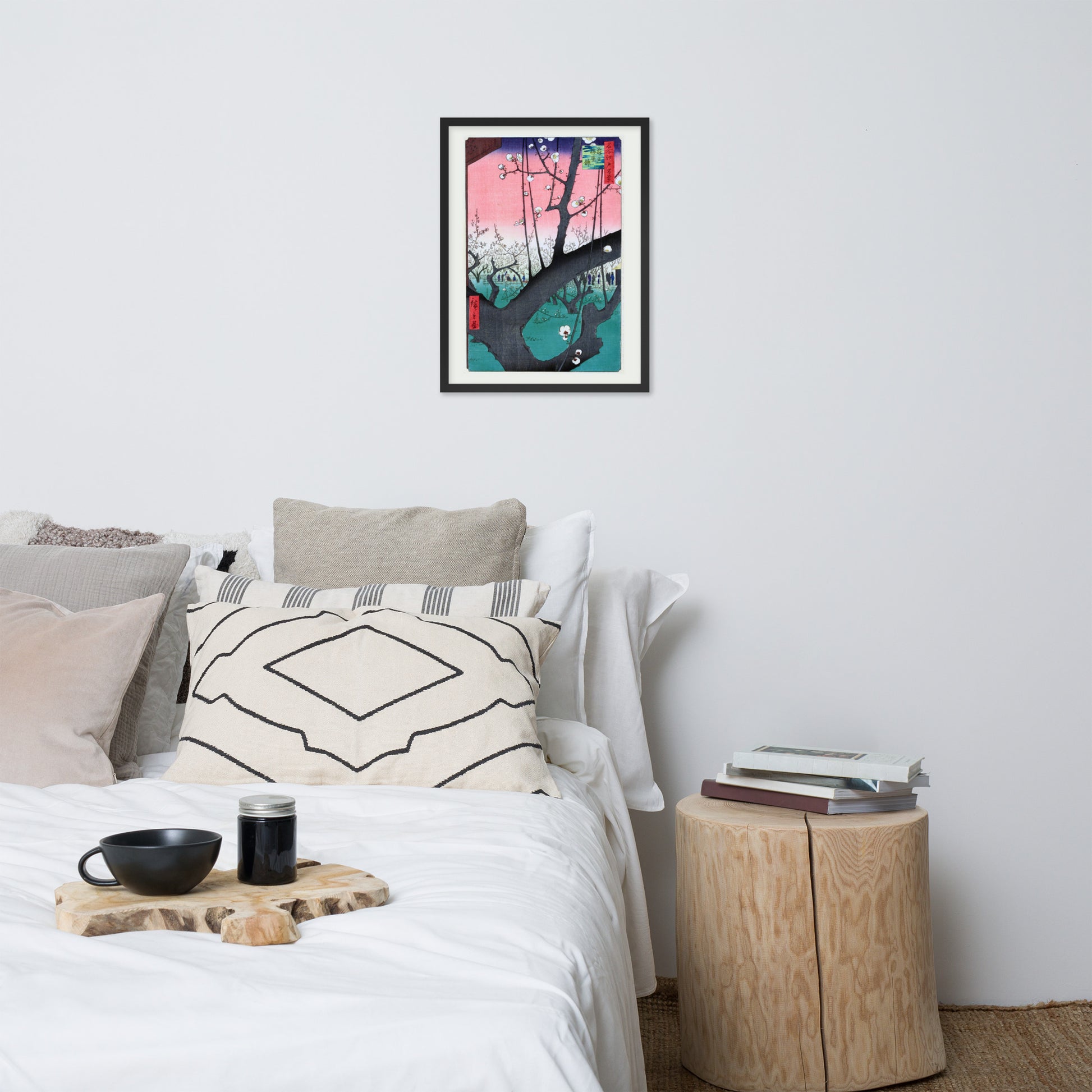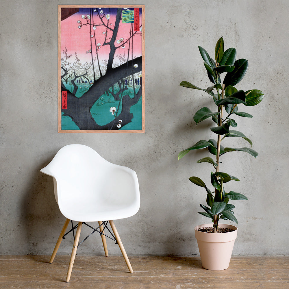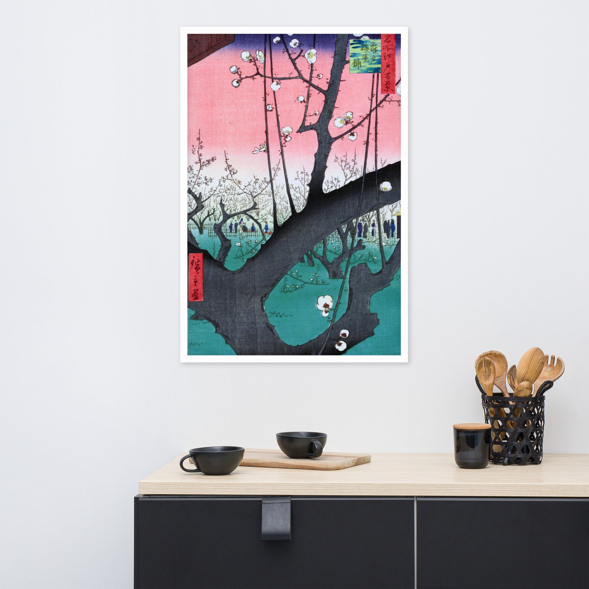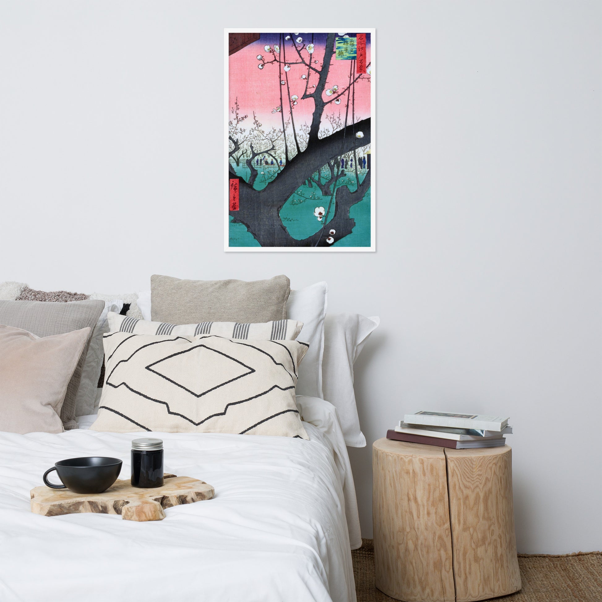 Step into the poetic serenity of Edo-period Japan with Plum Park at Kameido by Utagawa Hiroshige—an iconic piece from the celebrated tradition of Japanese Woodblock Prints (Ukiyo-e). This framed wall art captures the quiet elegance of blooming plum trees, their white blossoms scattered across gnarled branches under a twilight sky that fades from deep indigo to soft pink and green. Hiroshige’s masterful composition draws the eye through a sweeping diagonal branch, inviting viewers into a tranquil garden scene where distant figures stroll among the trees.