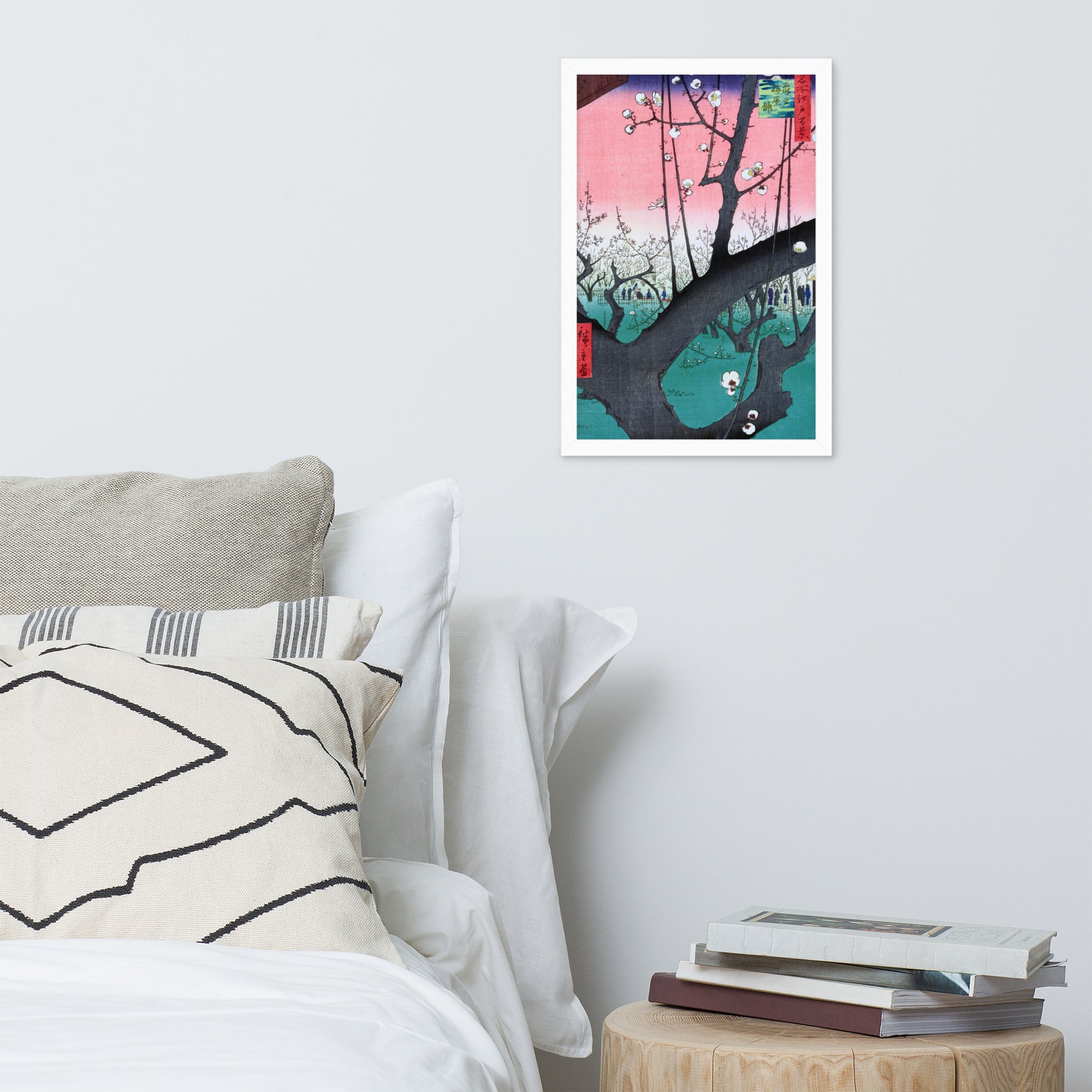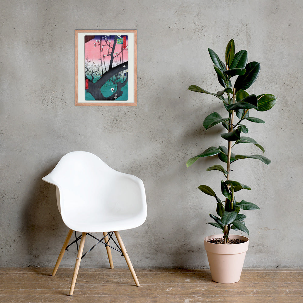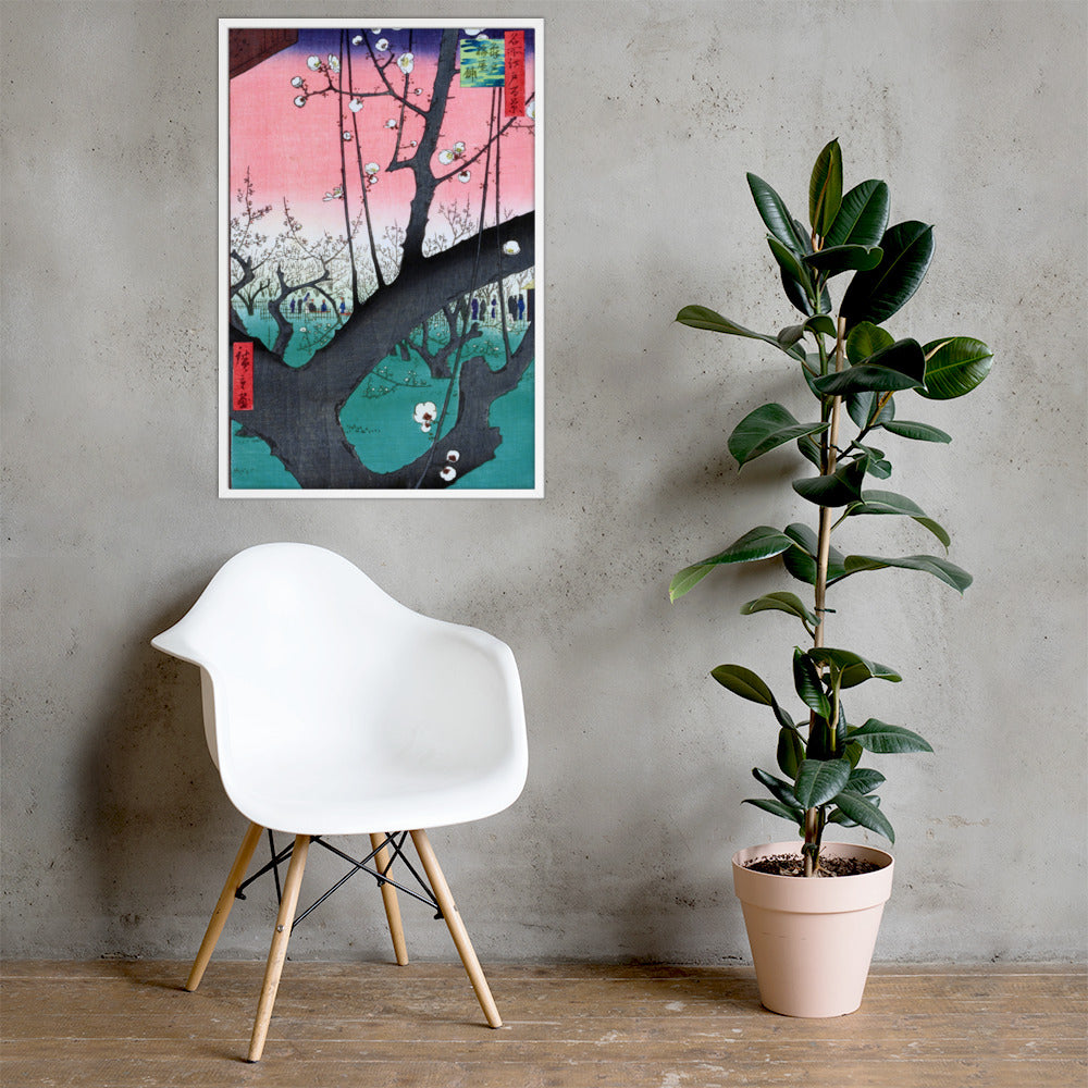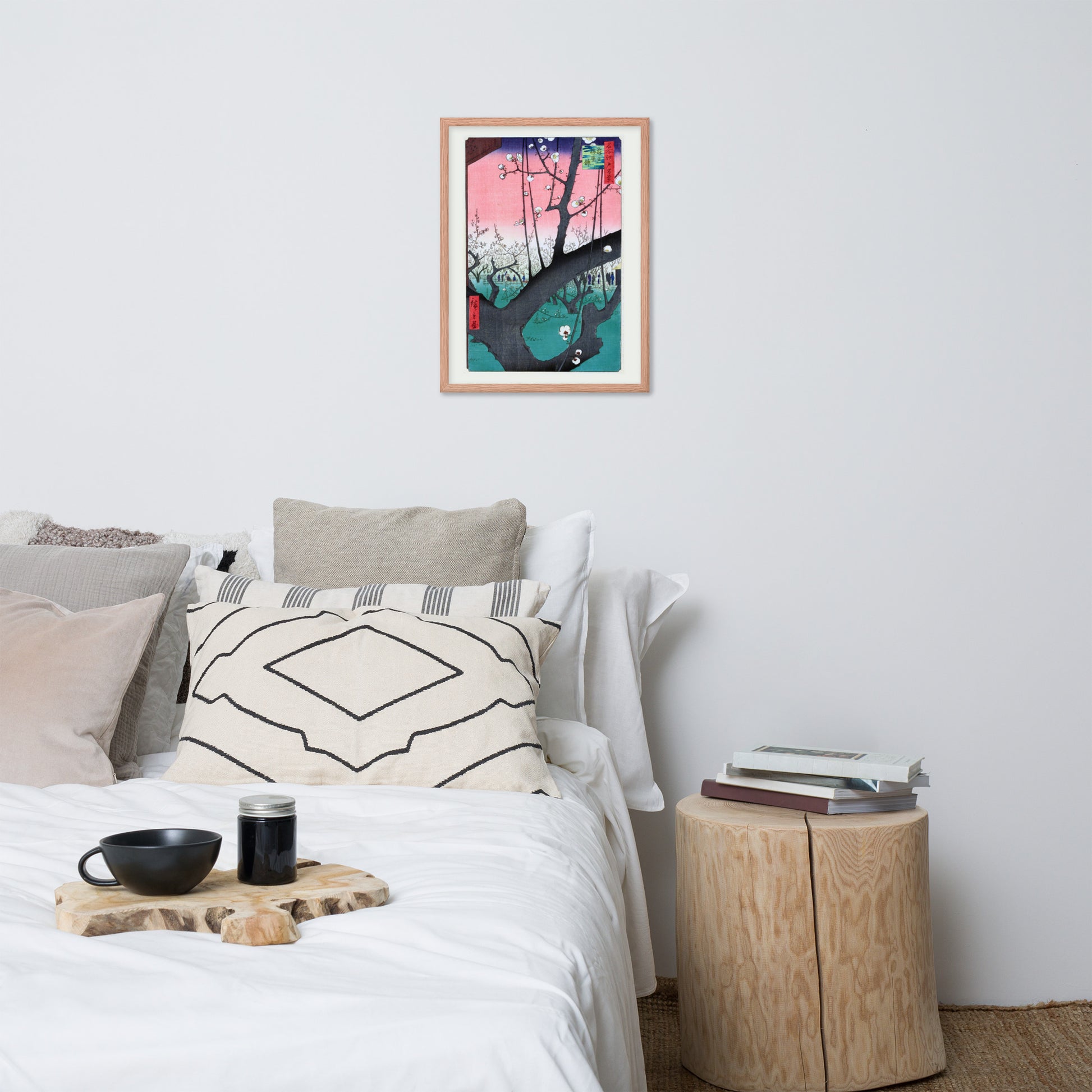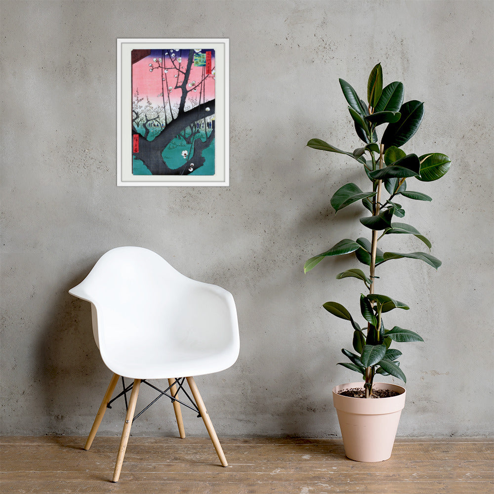 Step into the poetic serenity of Edo-period Japan with Plum Park at Kameido by Utagawa Hiroshige—an iconic piece from the celebrated tradition of Japanese Woodblock Prints (Ukiyo-e). This framed wall art captures the quiet elegance of blooming plum trees, their white blossoms scattered across gnarled branches under a twilight sky that fades from deep indigo to soft pink and green. Hiroshige’s masterful composition draws the eye through a sweeping diagonal branch, inviting viewers into a tranquil garden scene where distant figures stroll among the trees.
