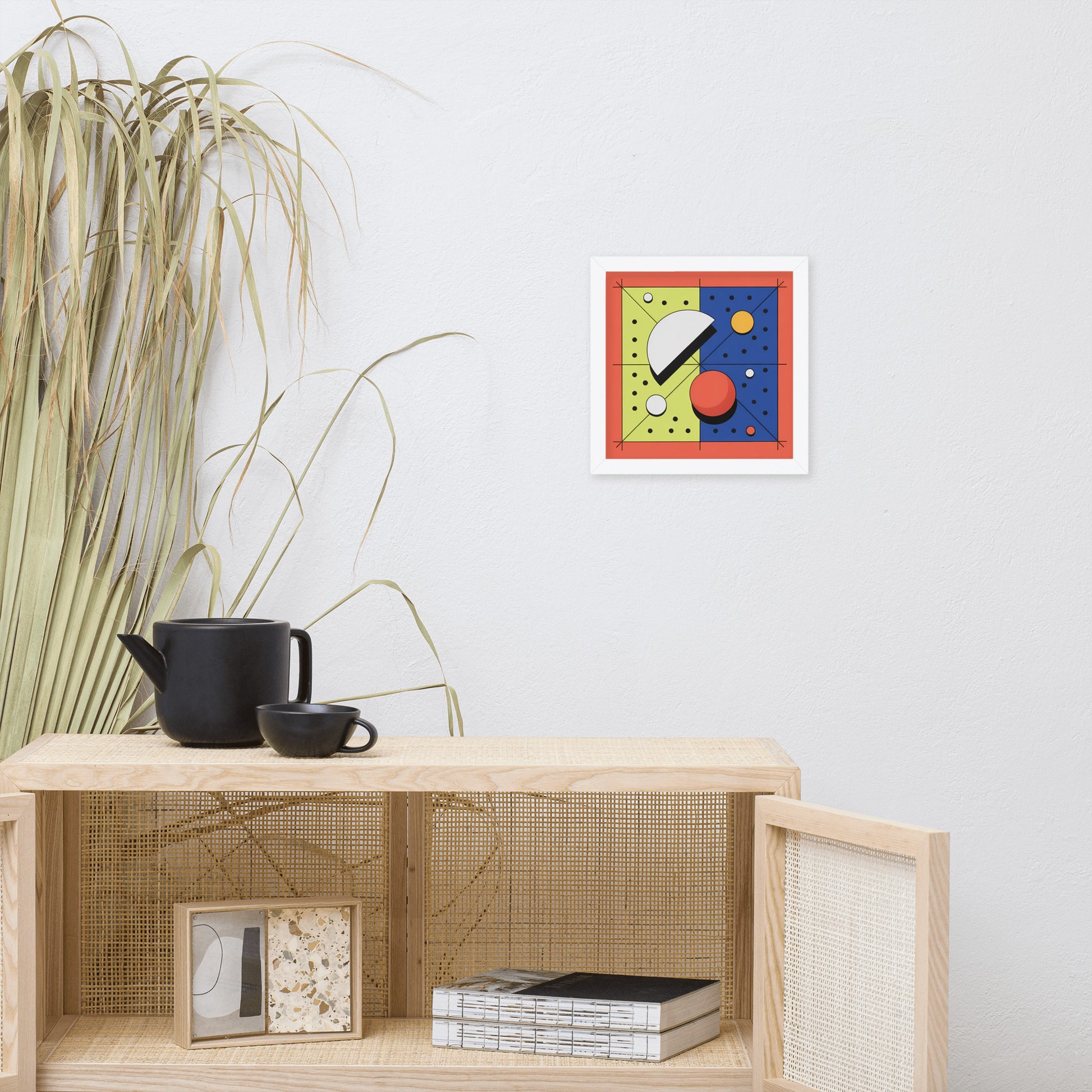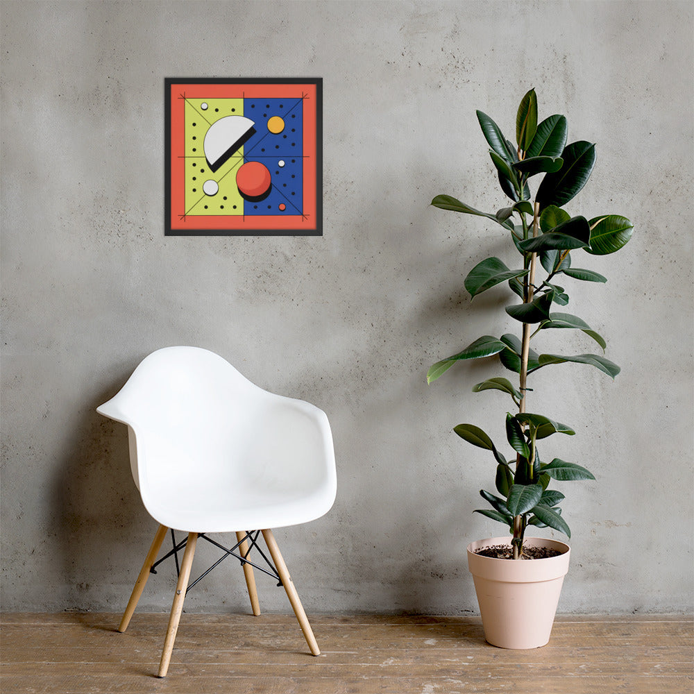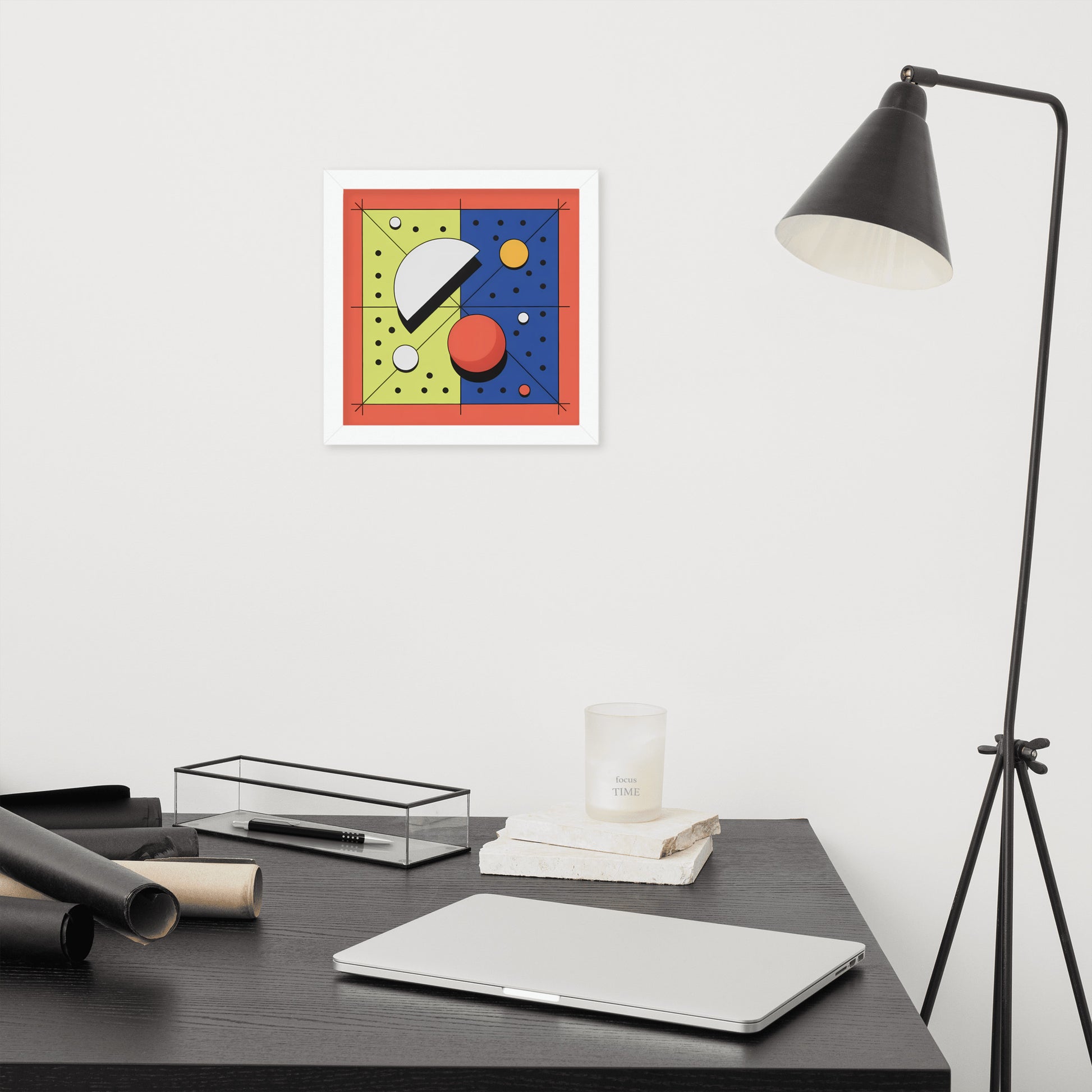 Add bold structure and vibrant energy to your space with Quadrant Echo, a striking geometric art defined by symmetry, color contrast, and playful abstraction. Divided into four quadrants by intersecting black lines, this composition features layered circles, semicircles, and dotted textures in vivid hues of yellow, blue, red, and white—all framed by a powerful red border. The dynamic interplay of shapes and shadows creates a rhythmic visual experience that’s perfect for modern interiors, creative studios, or gallery-style walls. Printed on premium paper and professionally framed, this piece brings balance and boldness to any room.