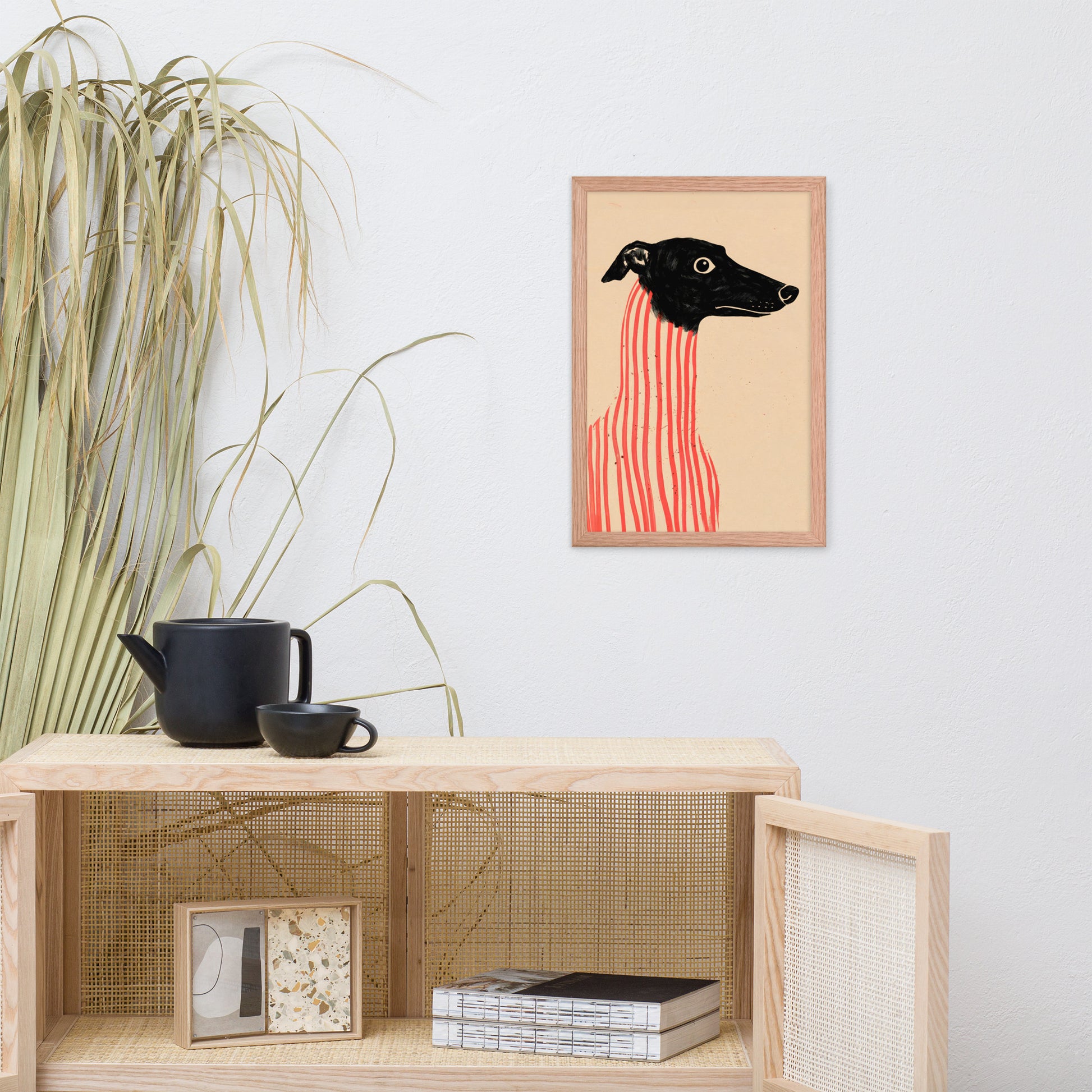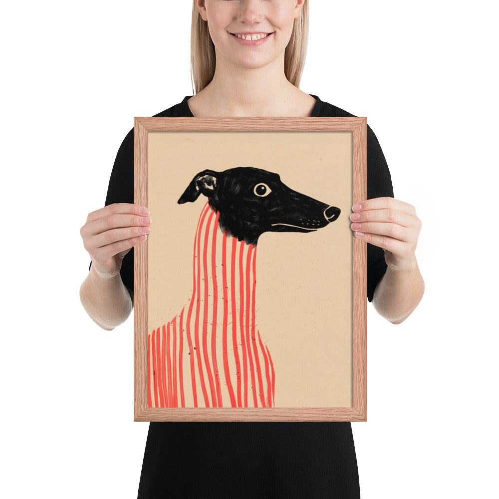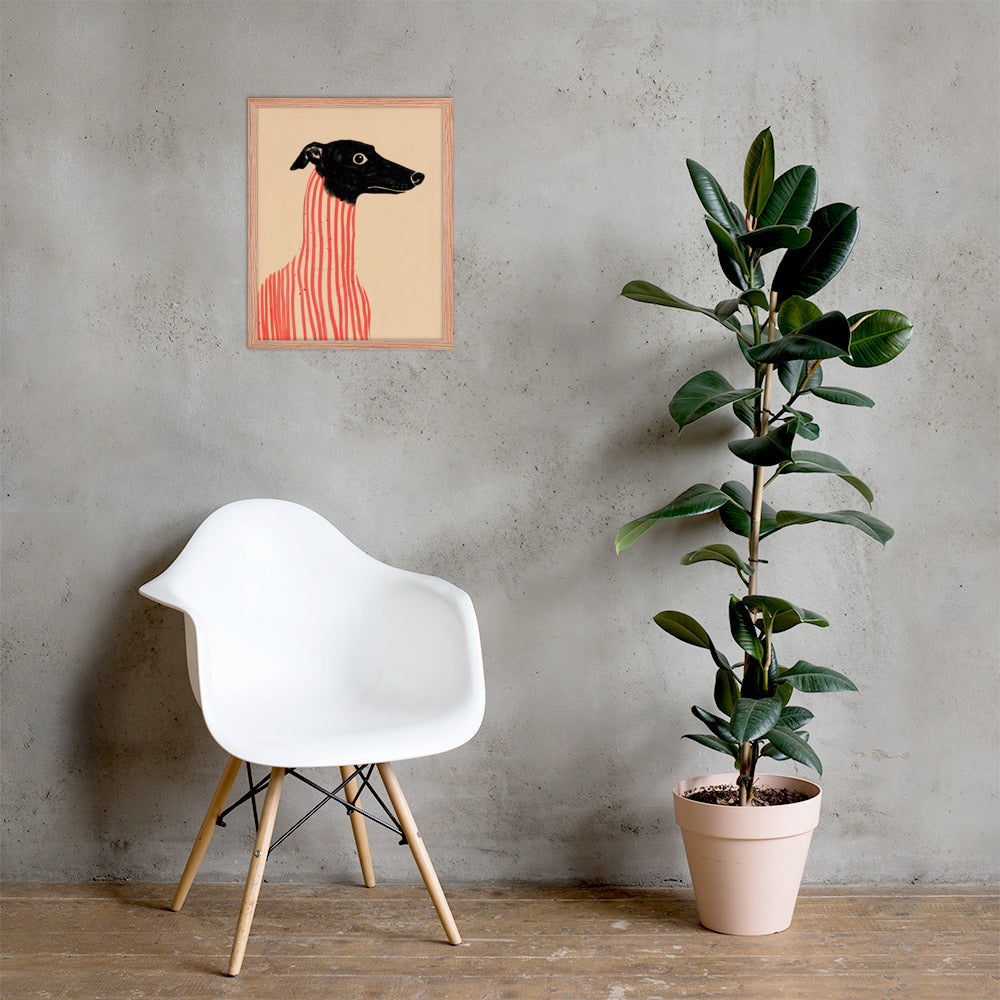 Add a dash of canine charm and artistic flair to your walls with Stripe Hound, a surreal dog portrait that blends elegance with eccentricity. Featuring a wide-eyed greyhound with a sleek black head and a body wrapped in bold vertical red stripes, this minimalist illustration plays with form and contrast to create a visually arresting composition. Set against a soft beige backdrop, the artwork balances realism and abstraction—perfect for modern interiors, pet lovers, or anyone drawn to quirky, design-forward wall art. Printed on premium paper and framed for musuem-style presentation.