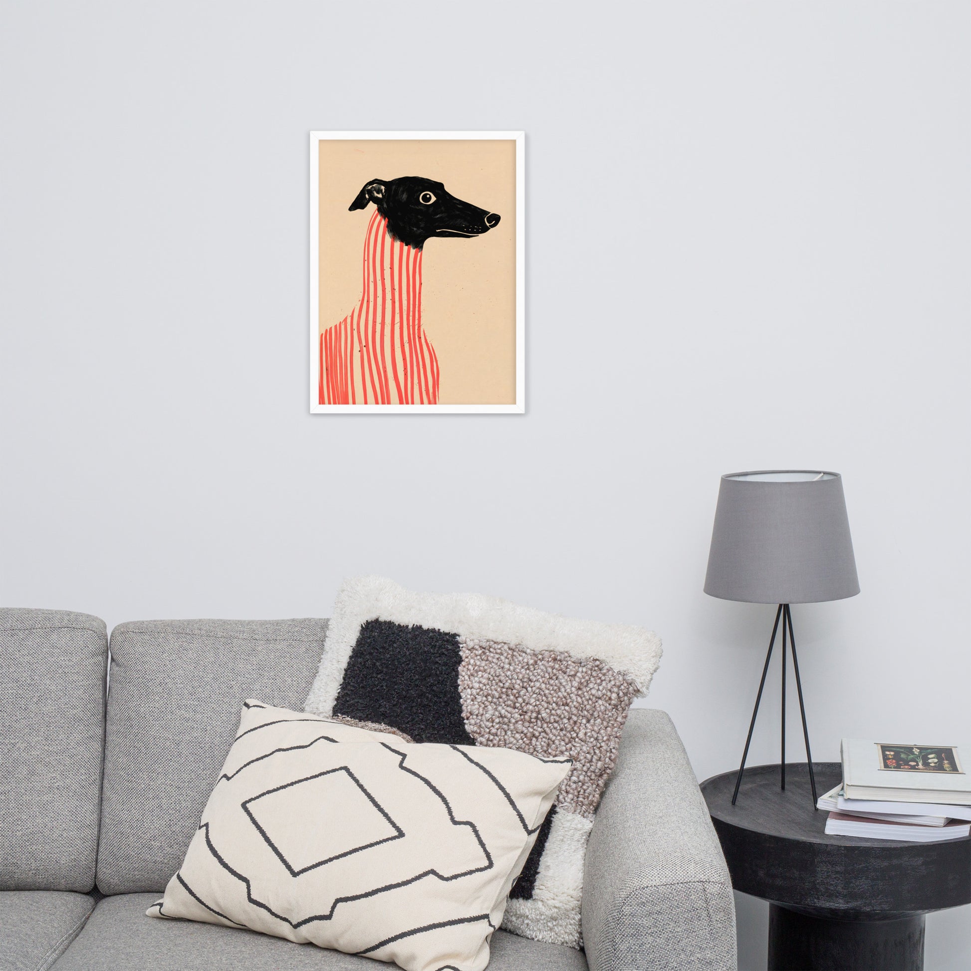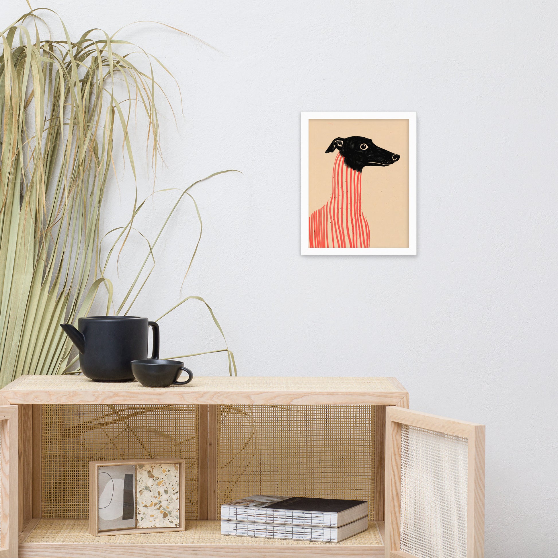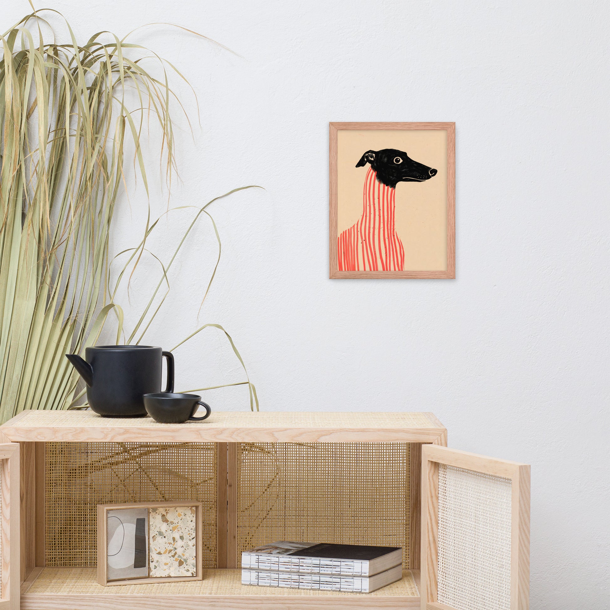 Add a dash of canine charm and artistic flair to your walls with Stripe Hound, a surreal dog portrait that blends elegance with eccentricity. Featuring a wide-eyed greyhound with a sleek black head and a body wrapped in bold vertical red stripes, this minimalist illustration plays with form and contrast to create a visually arresting composition. Set against a soft beige backdrop, the artwork balances realism and abstraction—perfect for modern interiors, pet lovers, or anyone drawn to quirky, design-forward wall art. Printed on premium paper and framed for musuem-style presentation.