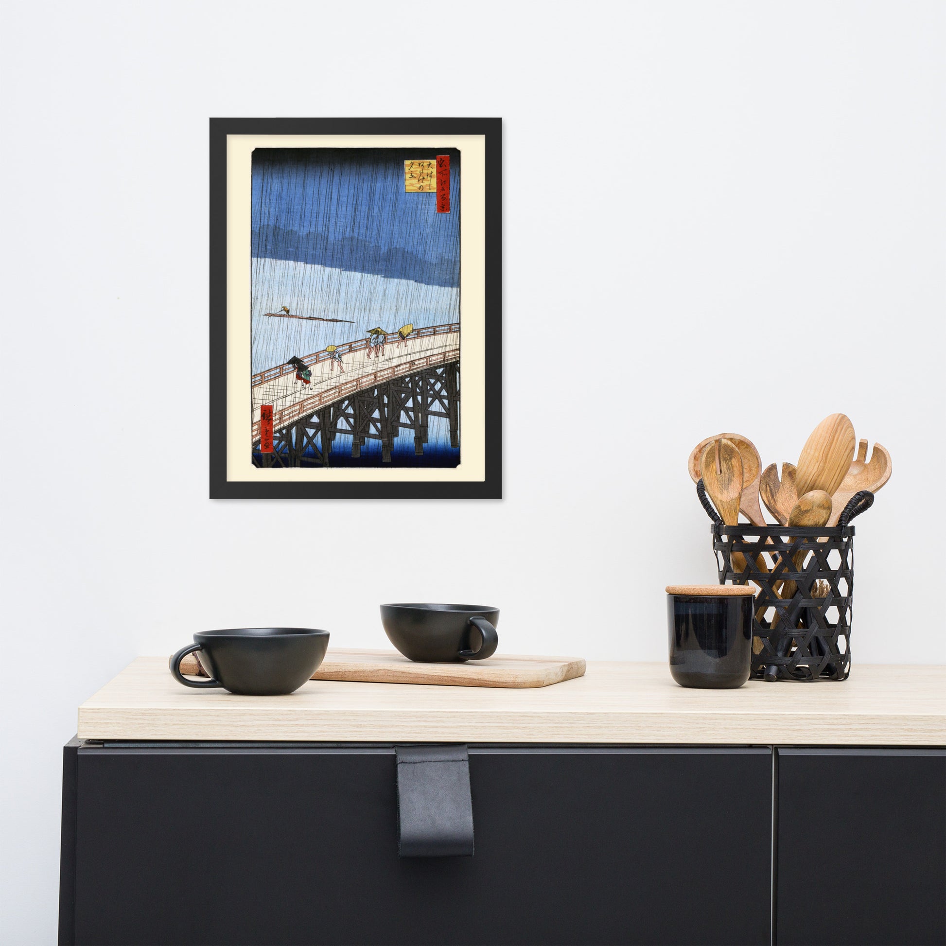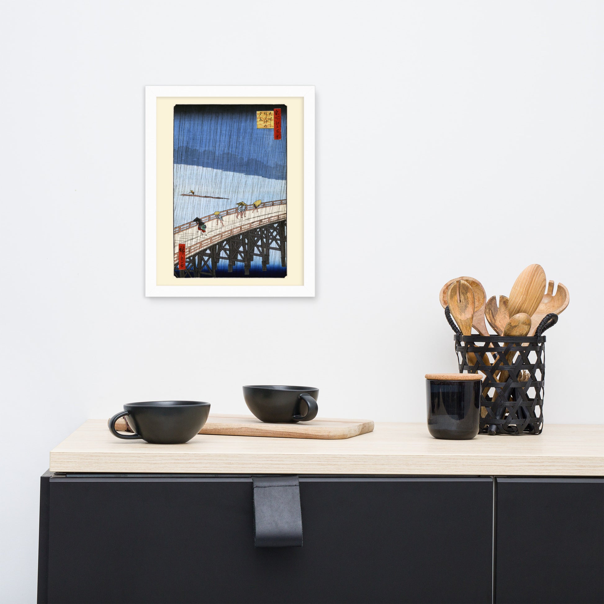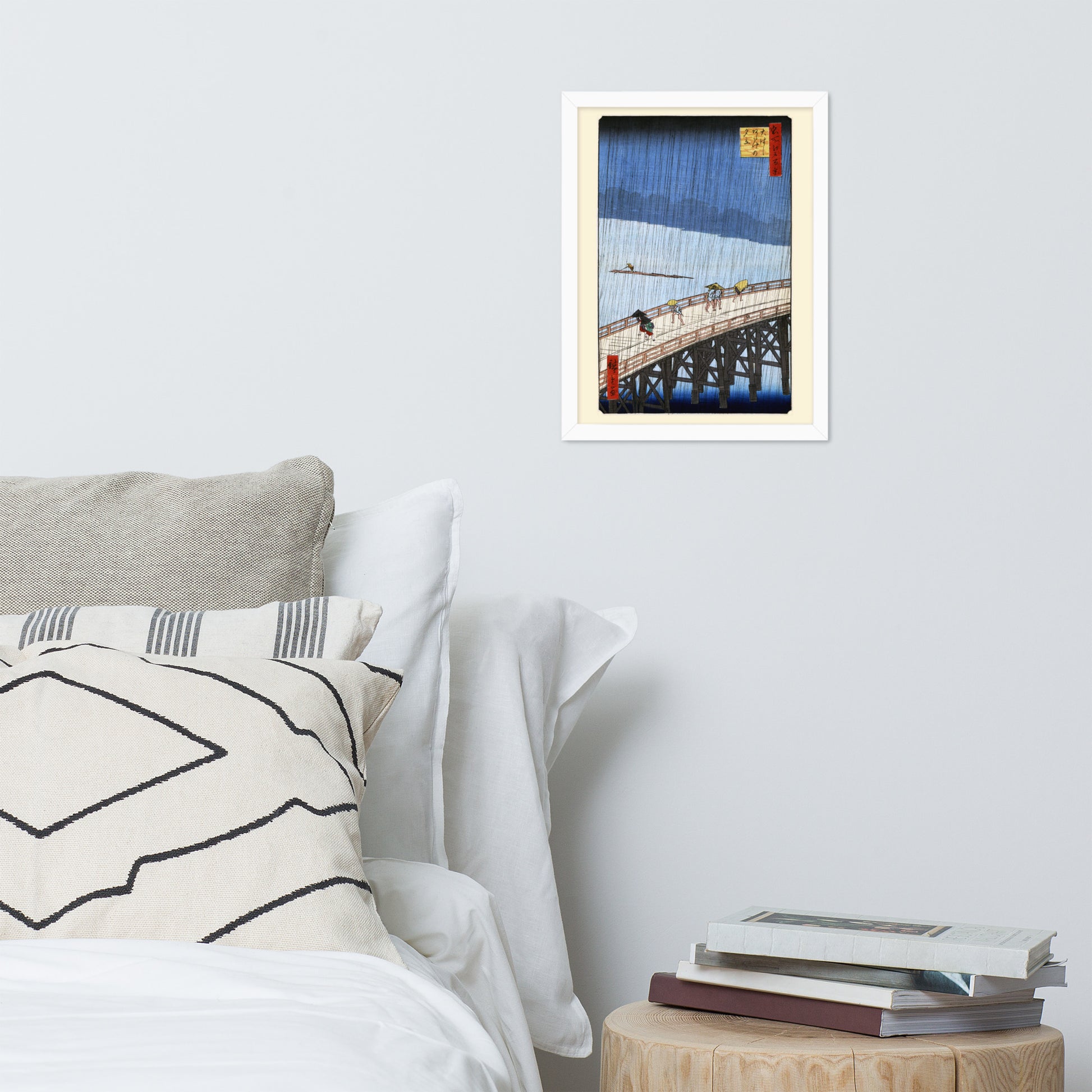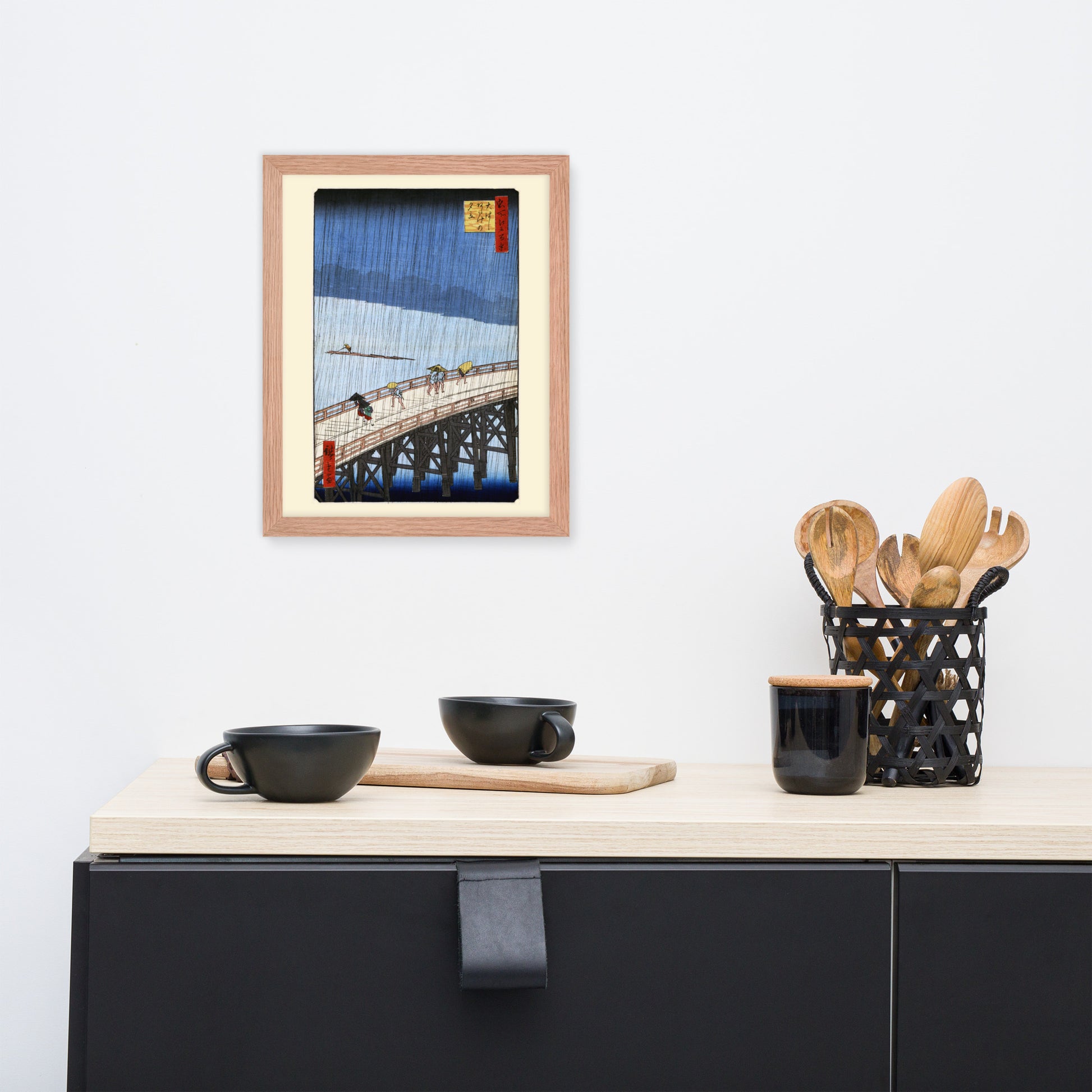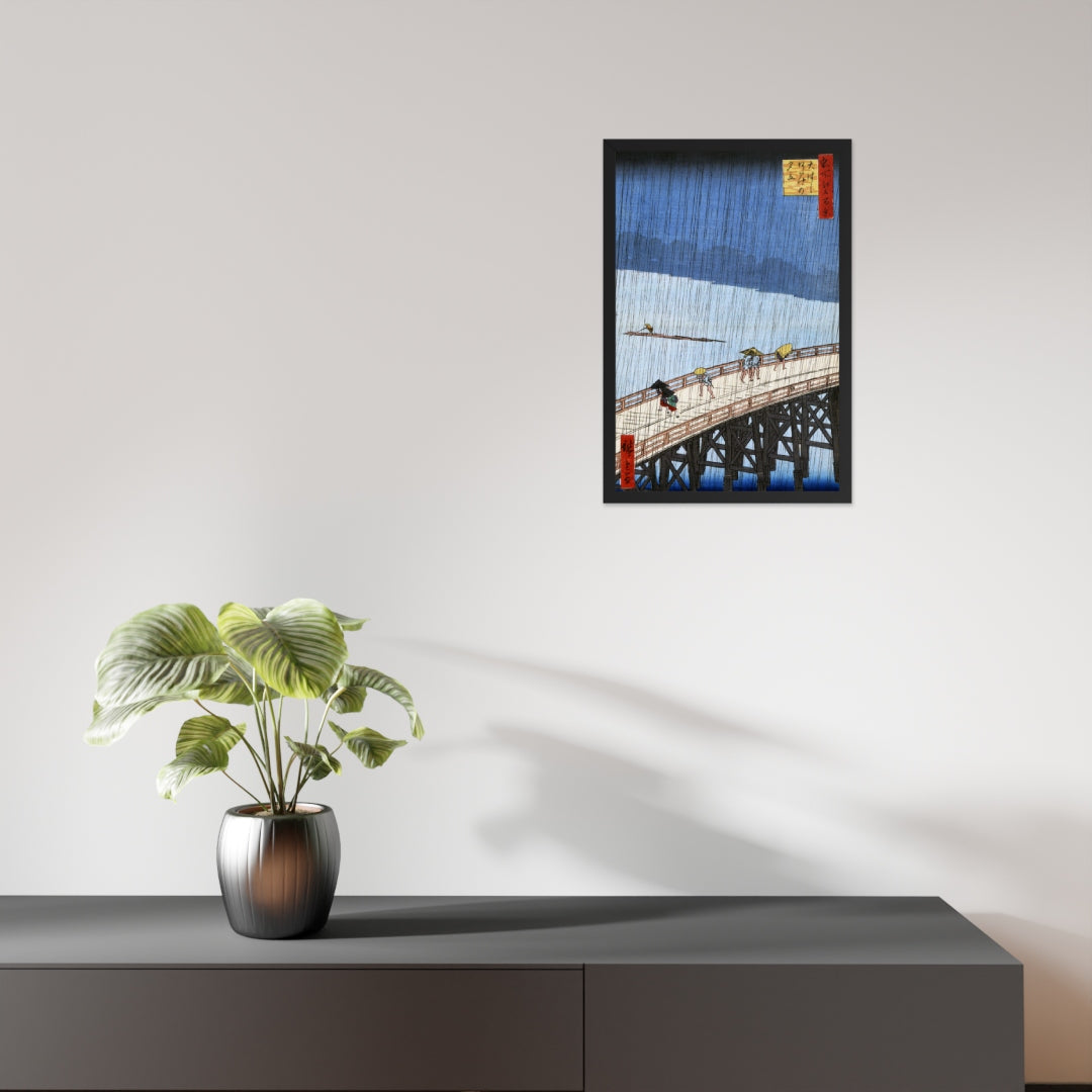 Capture the fleeting drama of nature with Sudden Shower over Shin-Ōhashi Bridge and Atake by Utagawa Hiroshige, a masterful example of Japanese Woodblock Prints (Ukiyo-e). This framed wall print immerses viewers in a rain-soaked moment as figures hurry across a wooden bridge, shielding themselves from the sudden downpour. The muted palette and vertical rain lines create a sense of urgency and movement, while the distant boat and calm water offer quiet contrast.