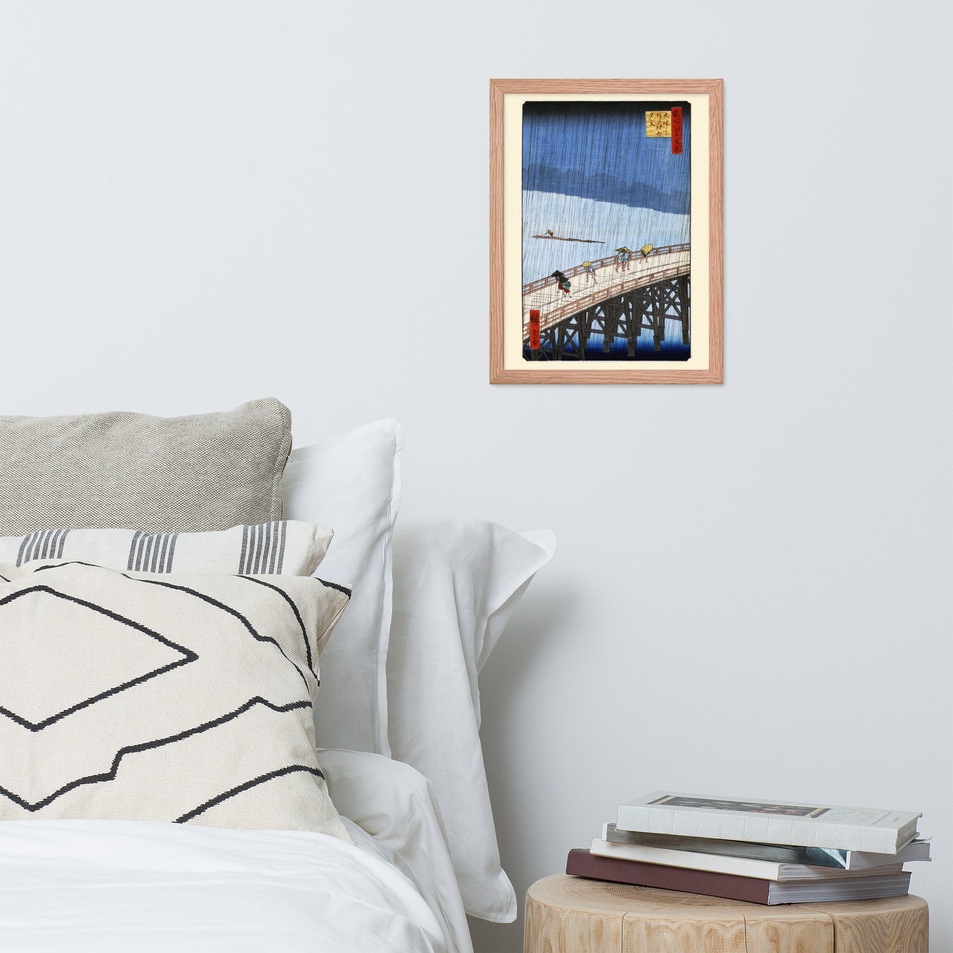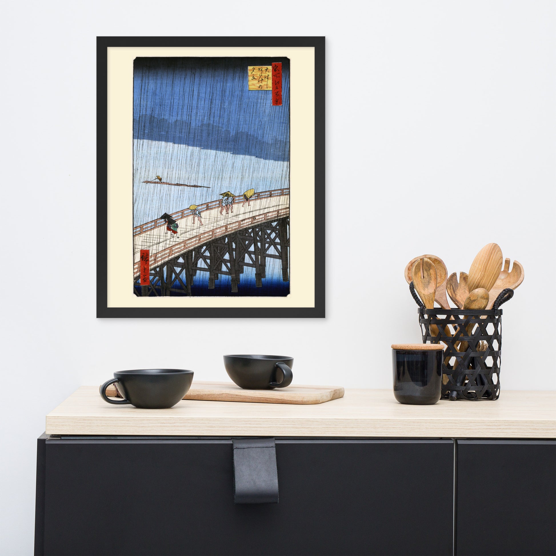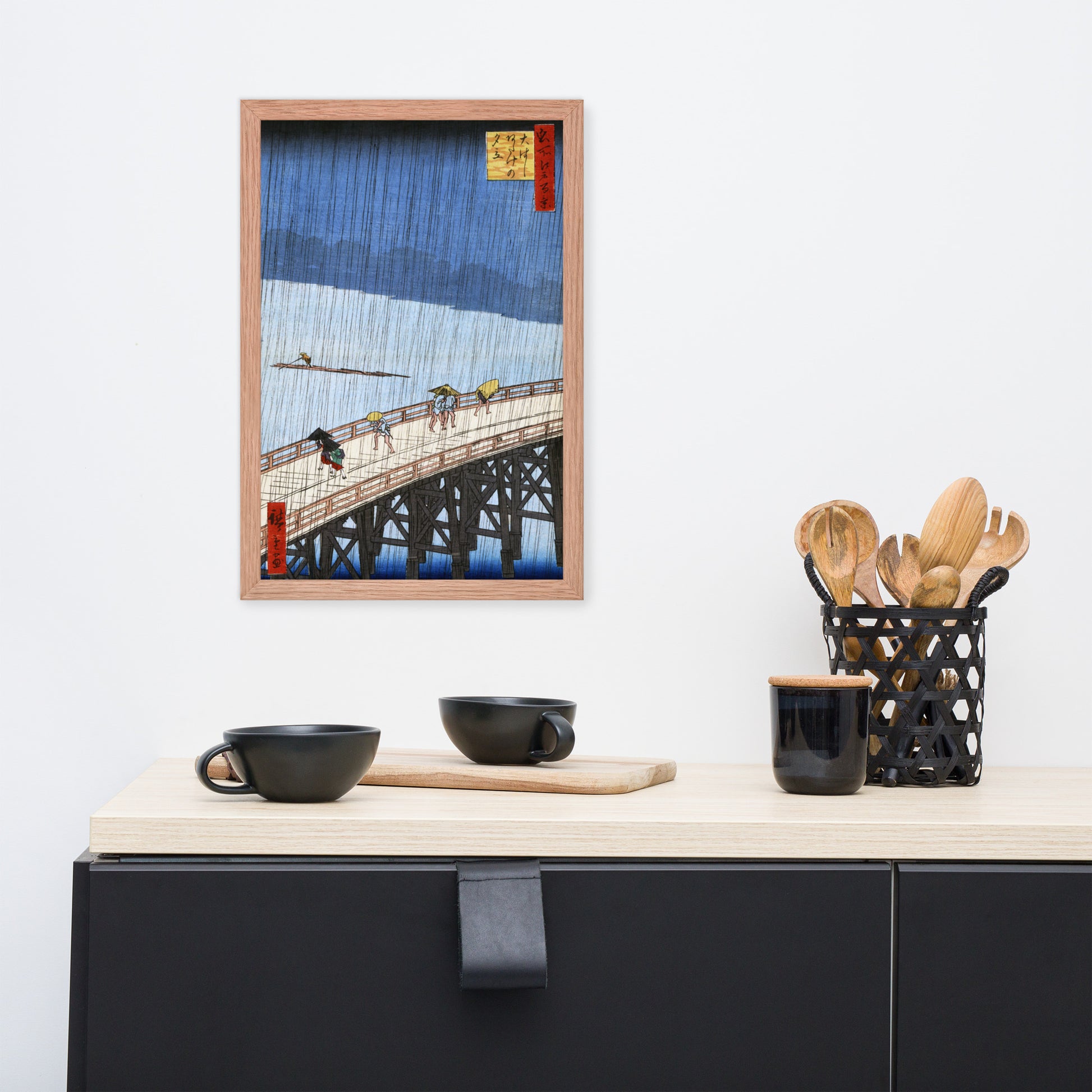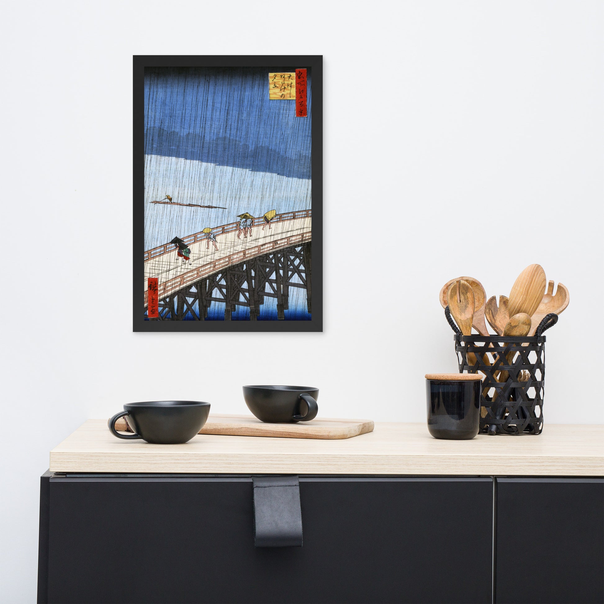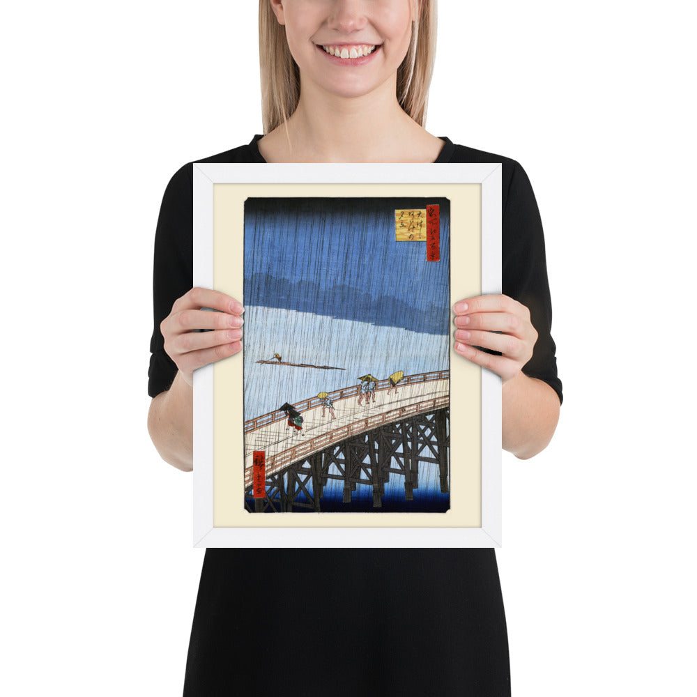 Capture the fleeting drama of nature with Sudden Shower over Shin-Ōhashi Bridge and Atake by Utagawa Hiroshige, a masterful example of Japanese Woodblock Prints (Ukiyo-e). This framed wall print immerses viewers in a rain-soaked moment as figures hurry across a wooden bridge, shielding themselves from the sudden downpour. The muted palette and vertical rain lines create a sense of urgency and movement, while the distant boat and calm water offer quiet contrast.