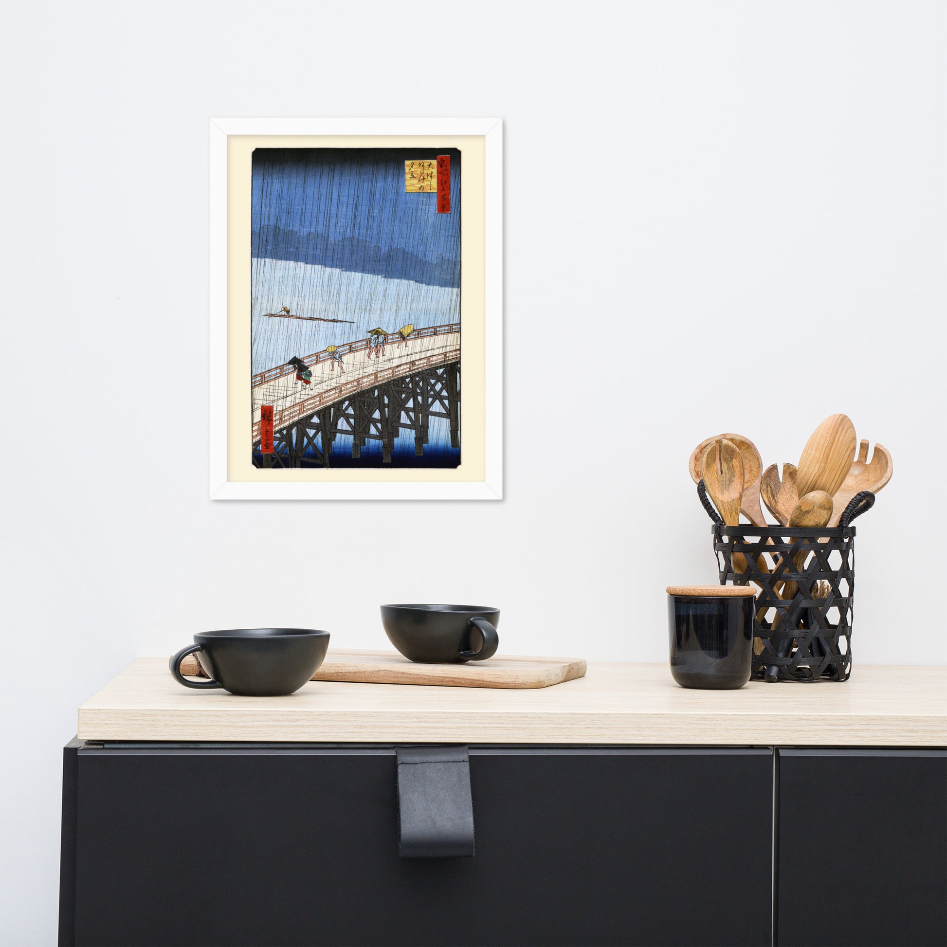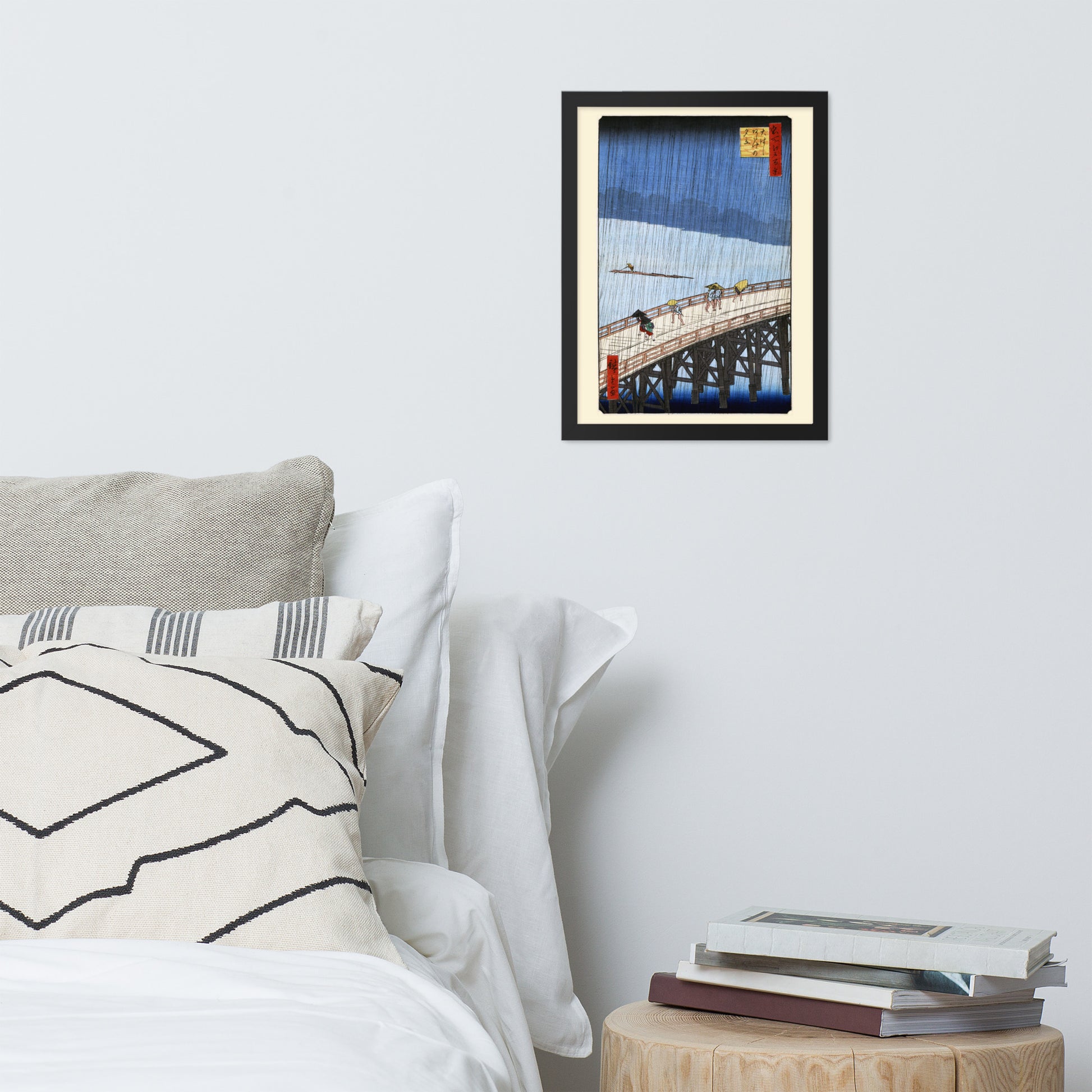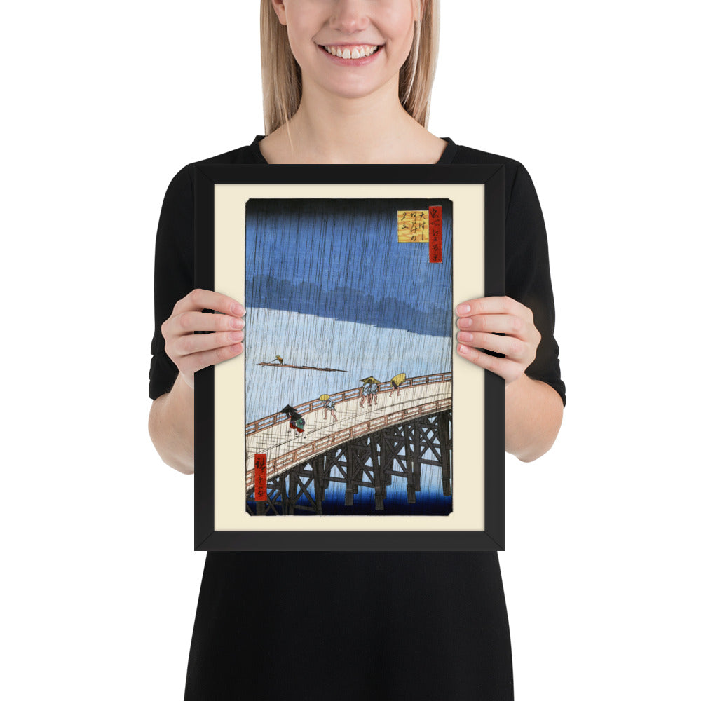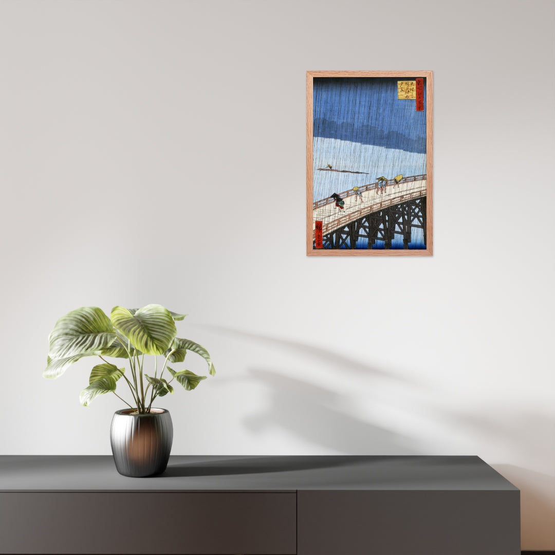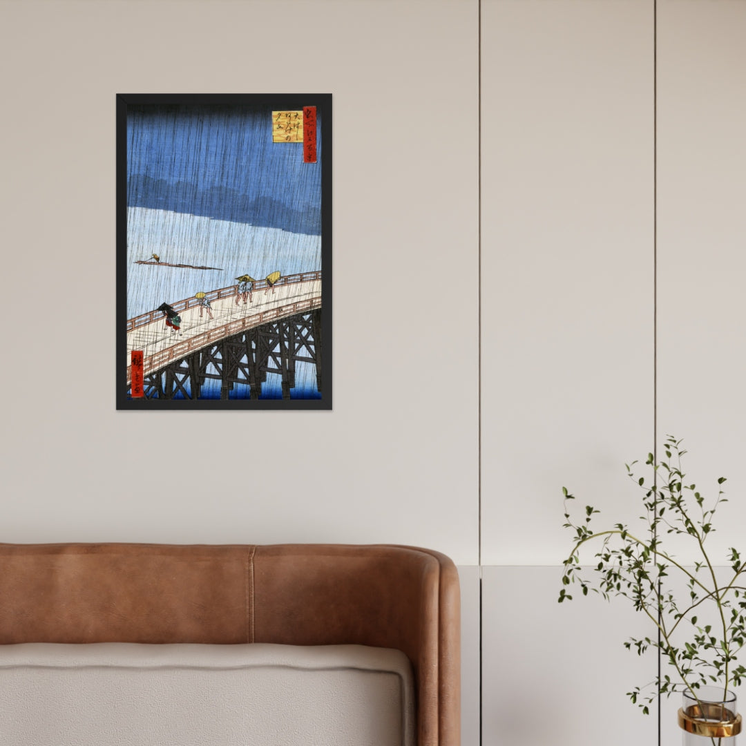 Capture the fleeting drama of nature with Sudden Shower over Shin-Ōhashi Bridge and Atake by Utagawa Hiroshige, a masterful example of Japanese Woodblock Prints (Ukiyo-e). This framed wall print immerses viewers in a rain-soaked moment as figures hurry across a wooden bridge, shielding themselves from the sudden downpour. The muted palette and vertical rain lines create a sense of urgency and movement, while the distant boat and calm water offer quiet contrast.