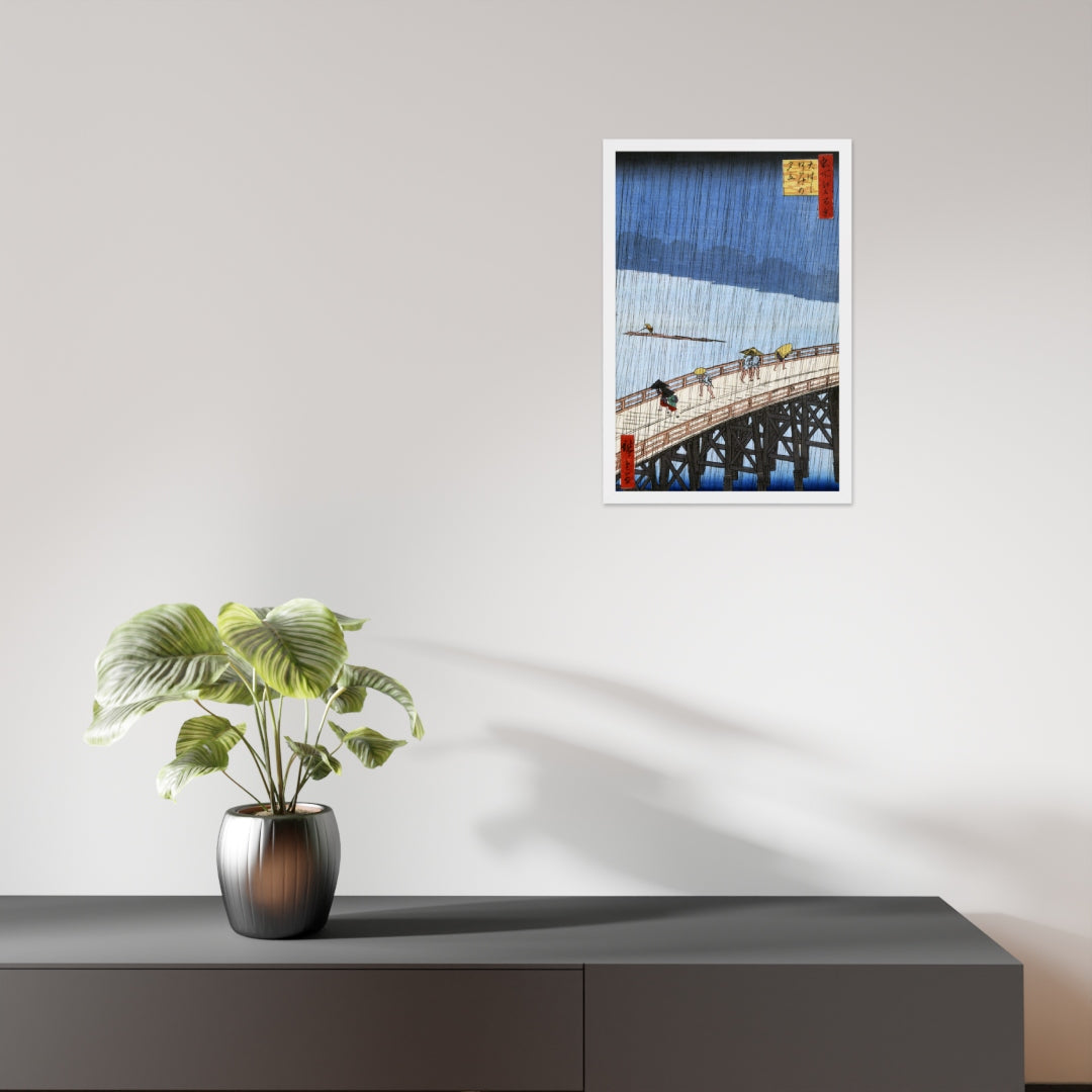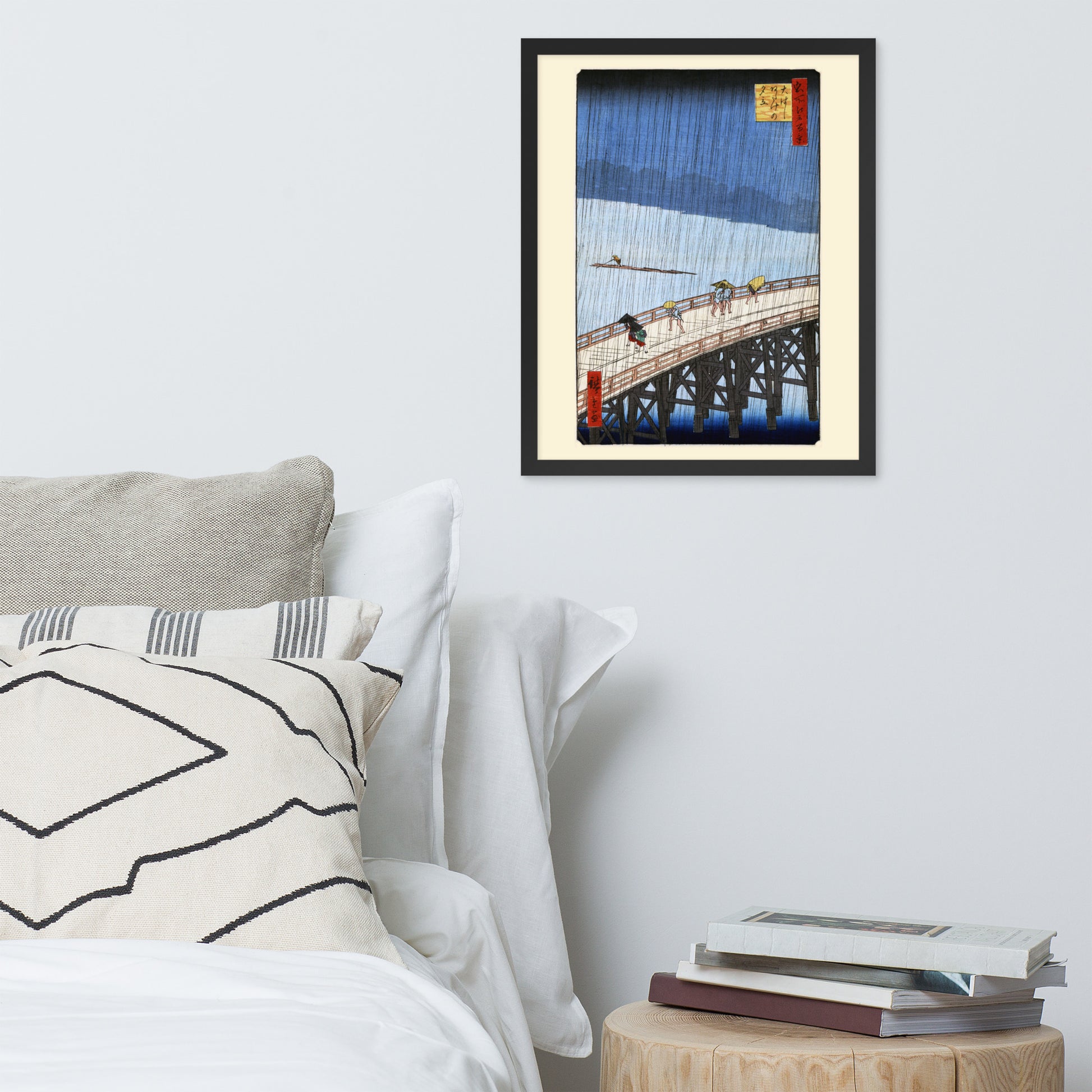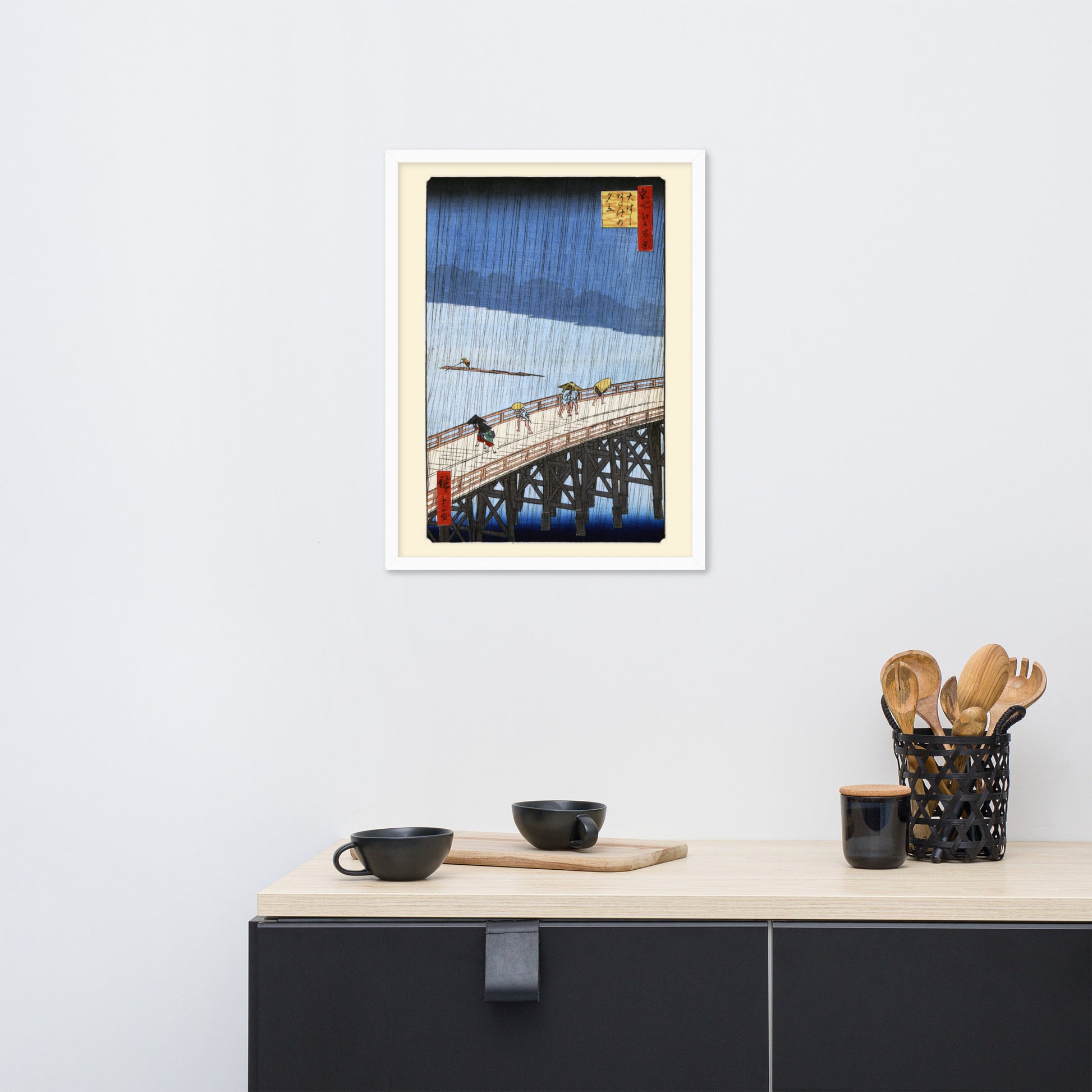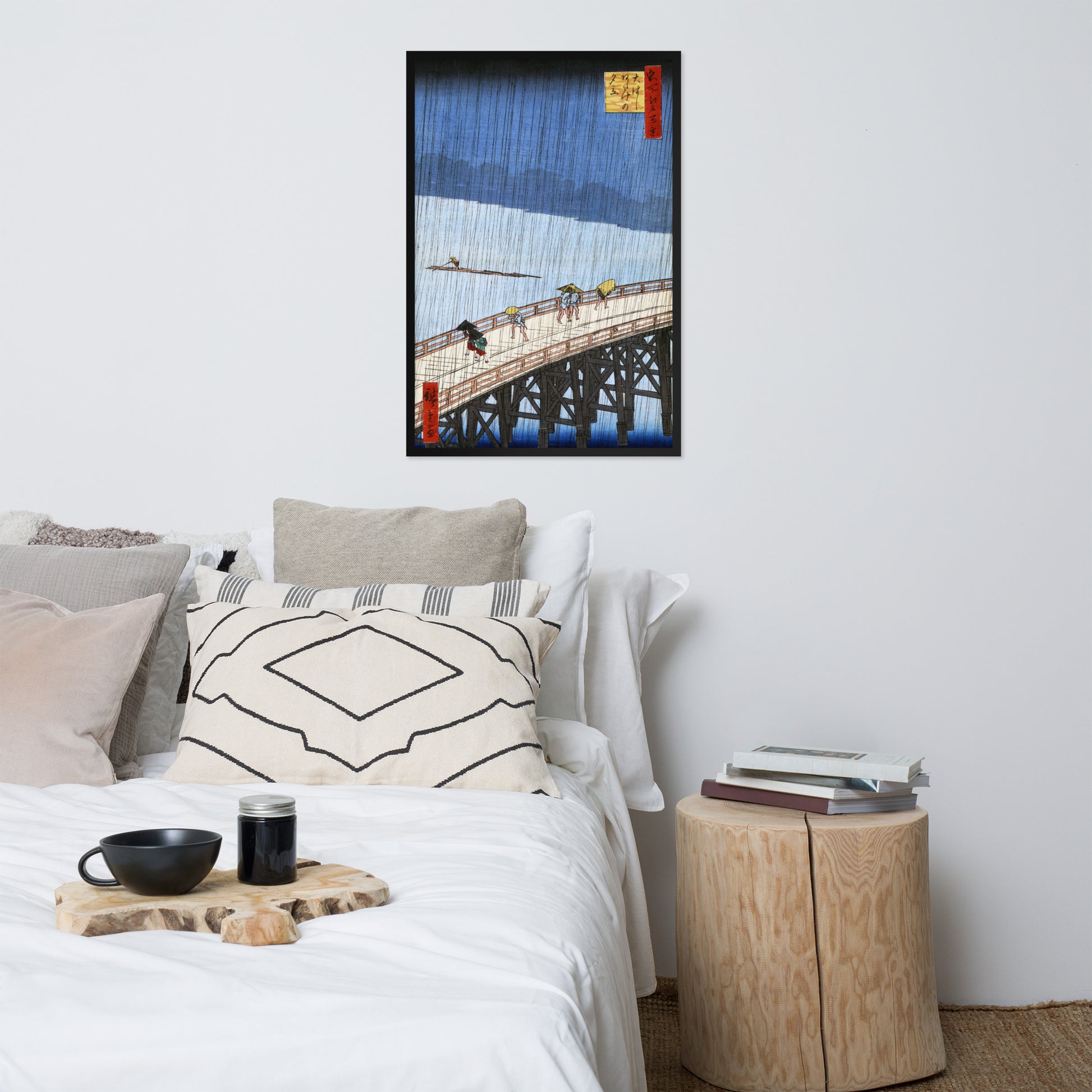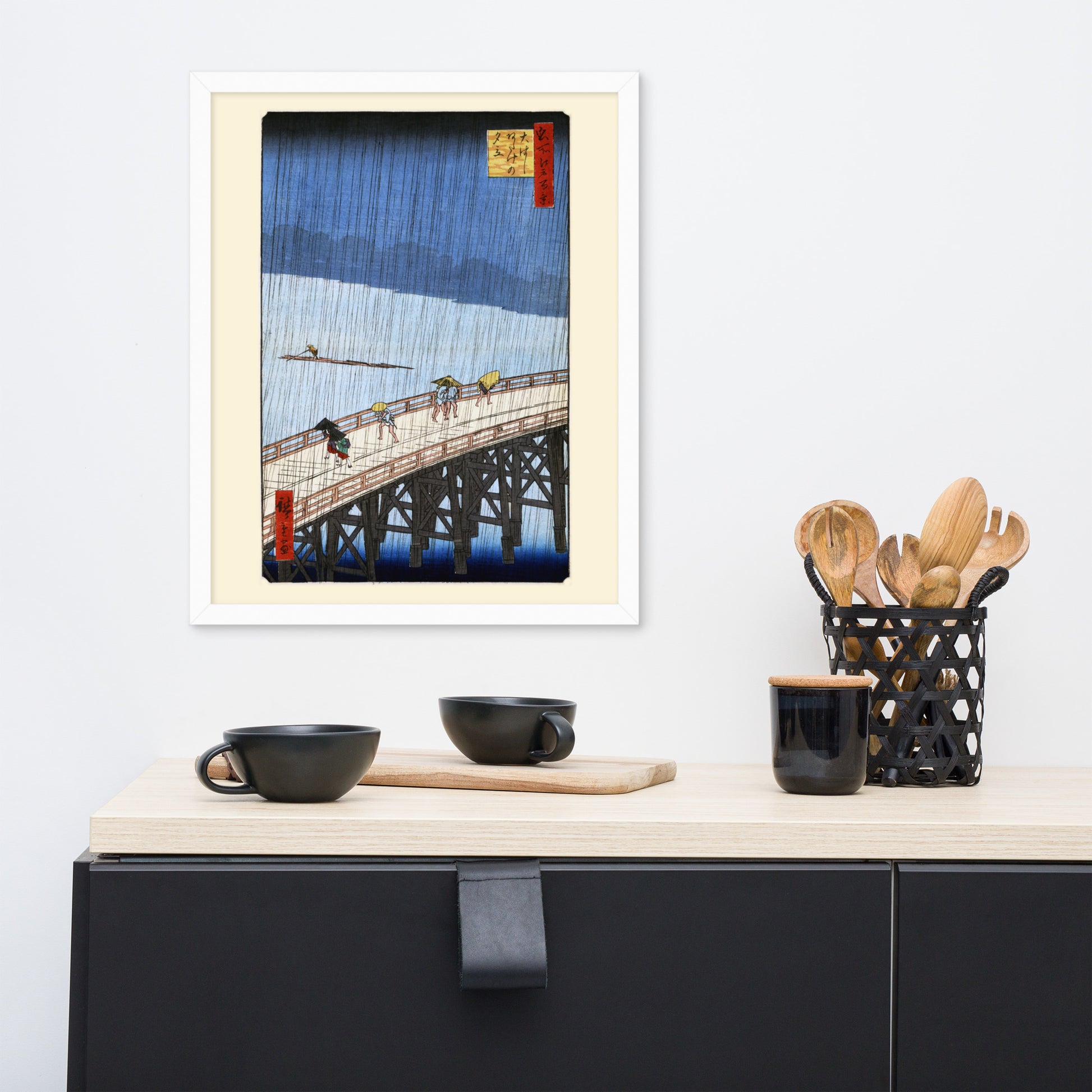 Capture the fleeting drama of nature with Sudden Shower over Shin-Ōhashi Bridge and Atake by Utagawa Hiroshige, a masterful example of Japanese Woodblock Prints (Ukiyo-e). This framed wall print immerses viewers in a rain-soaked moment as figures hurry across a wooden bridge, shielding themselves from the sudden downpour. The muted palette and vertical rain lines create a sense of urgency and movement, while the distant boat and calm water offer quiet contrast.