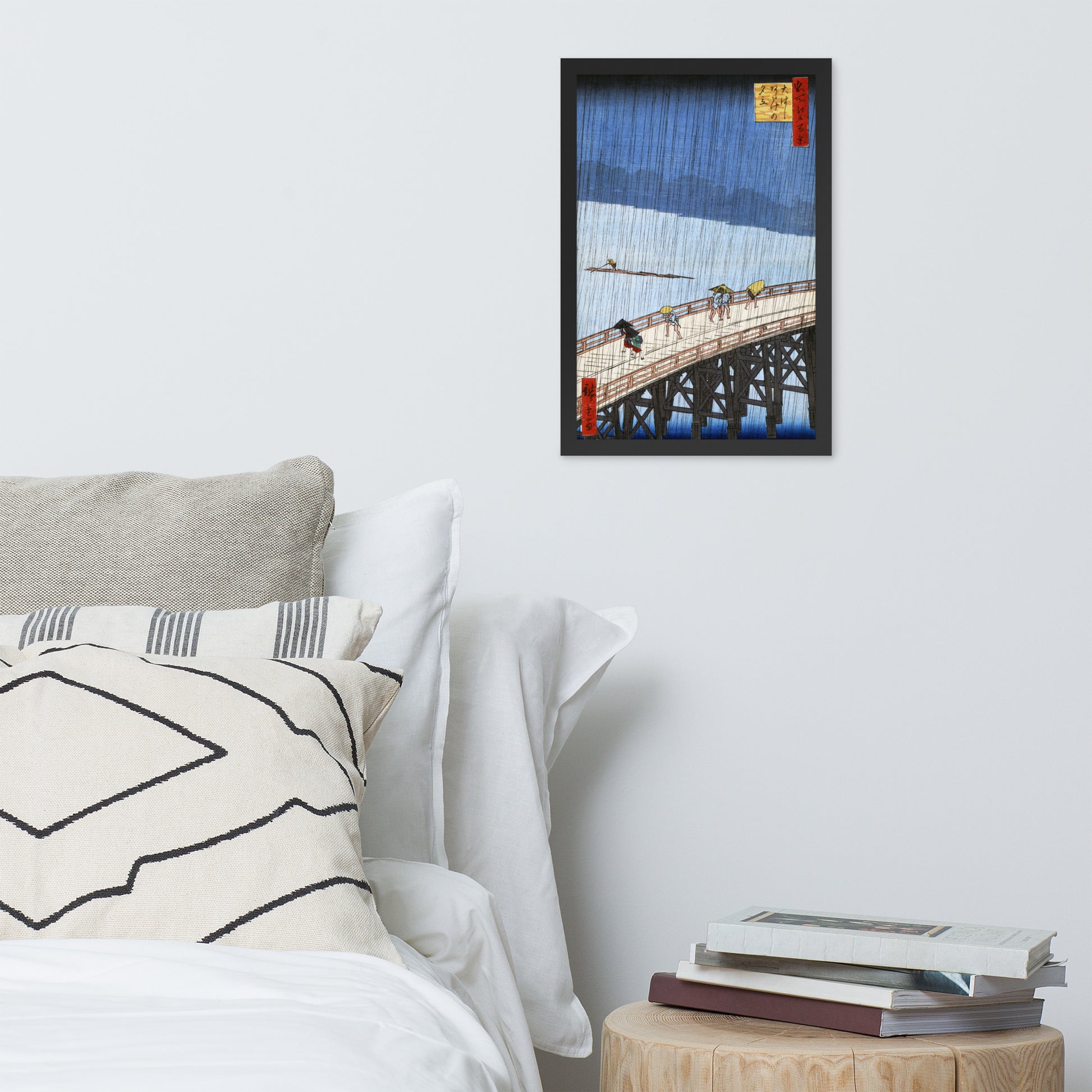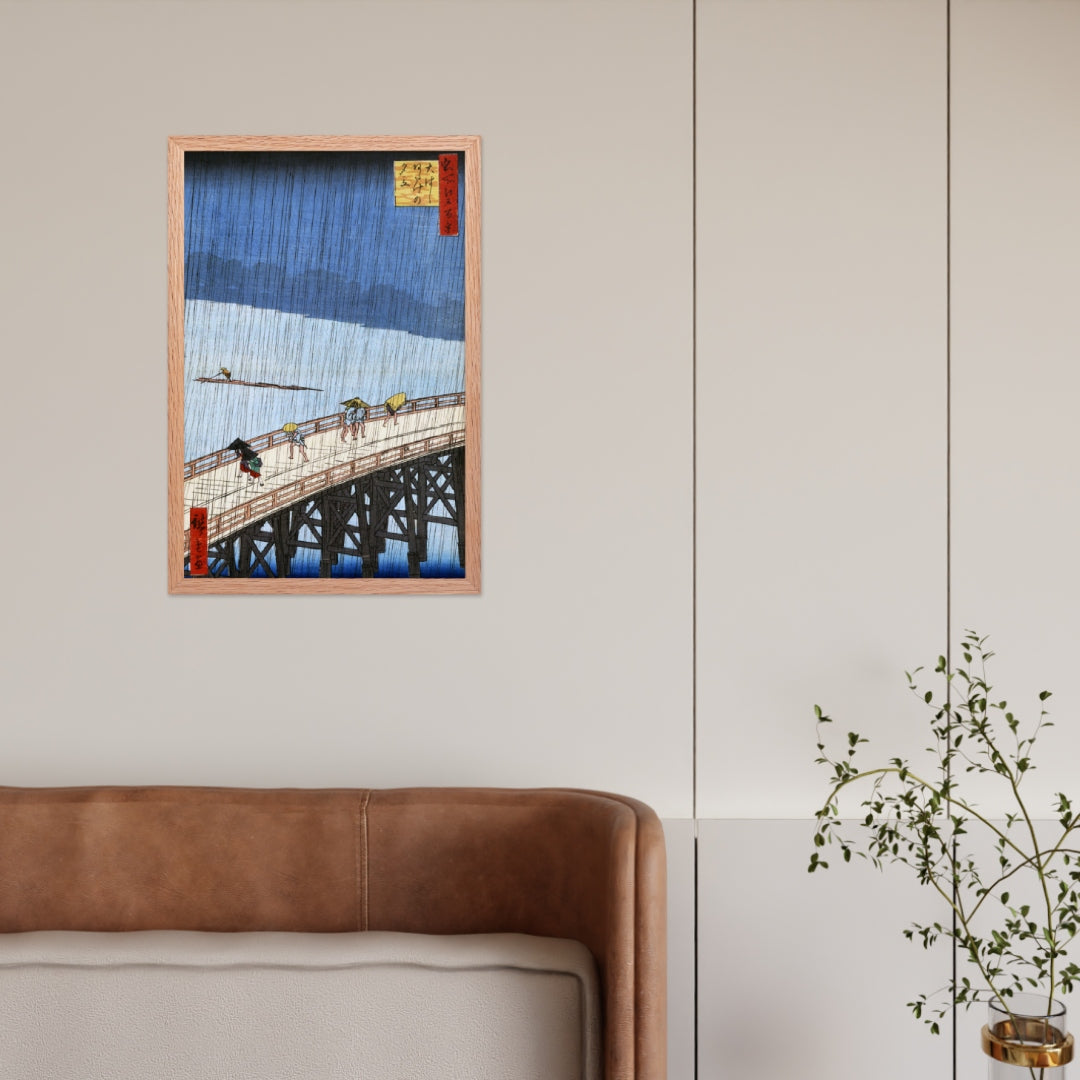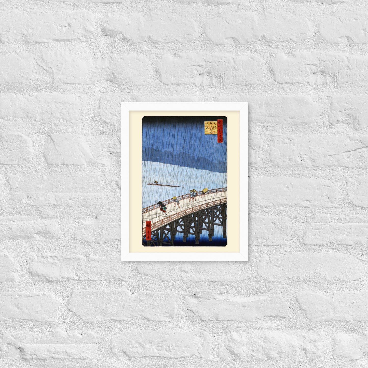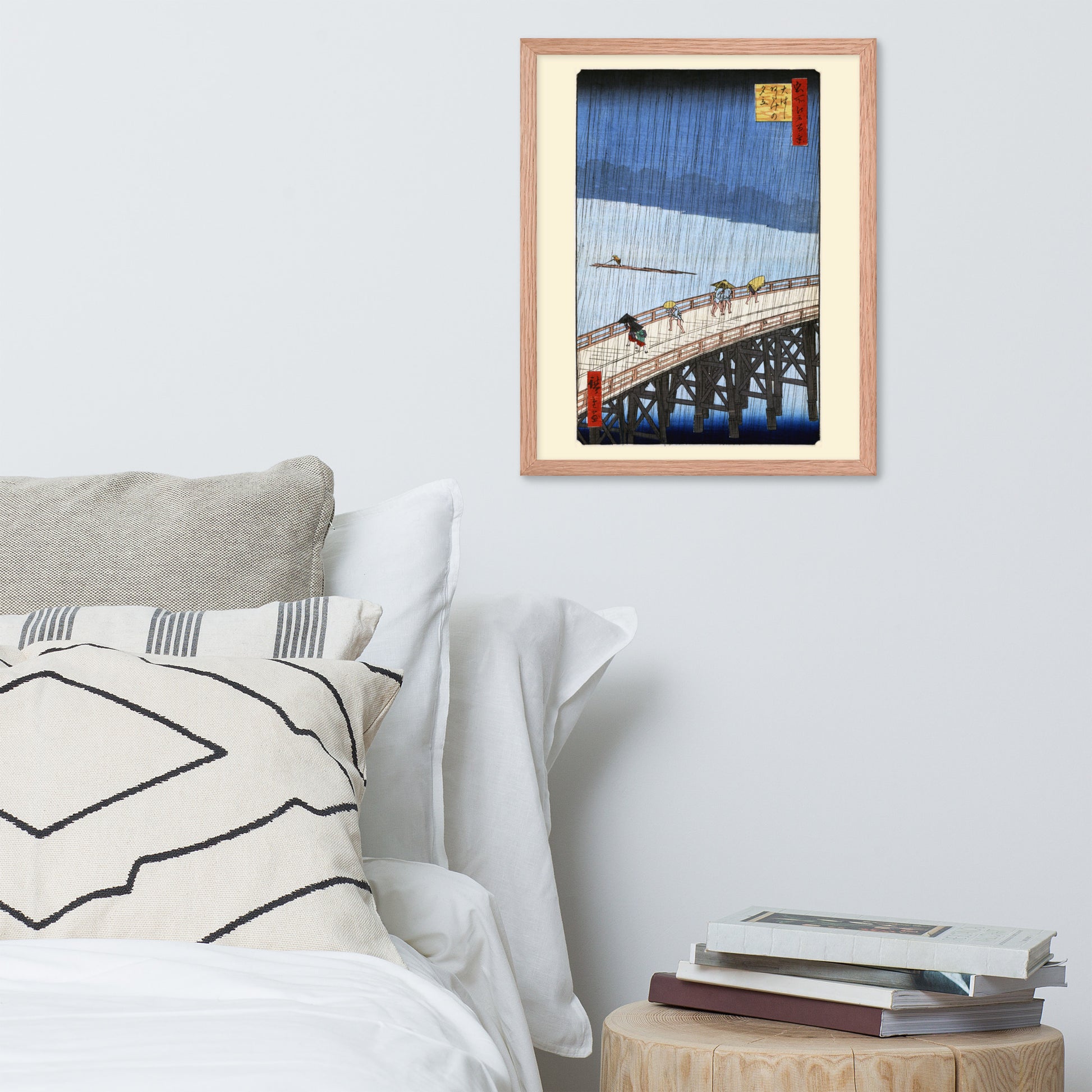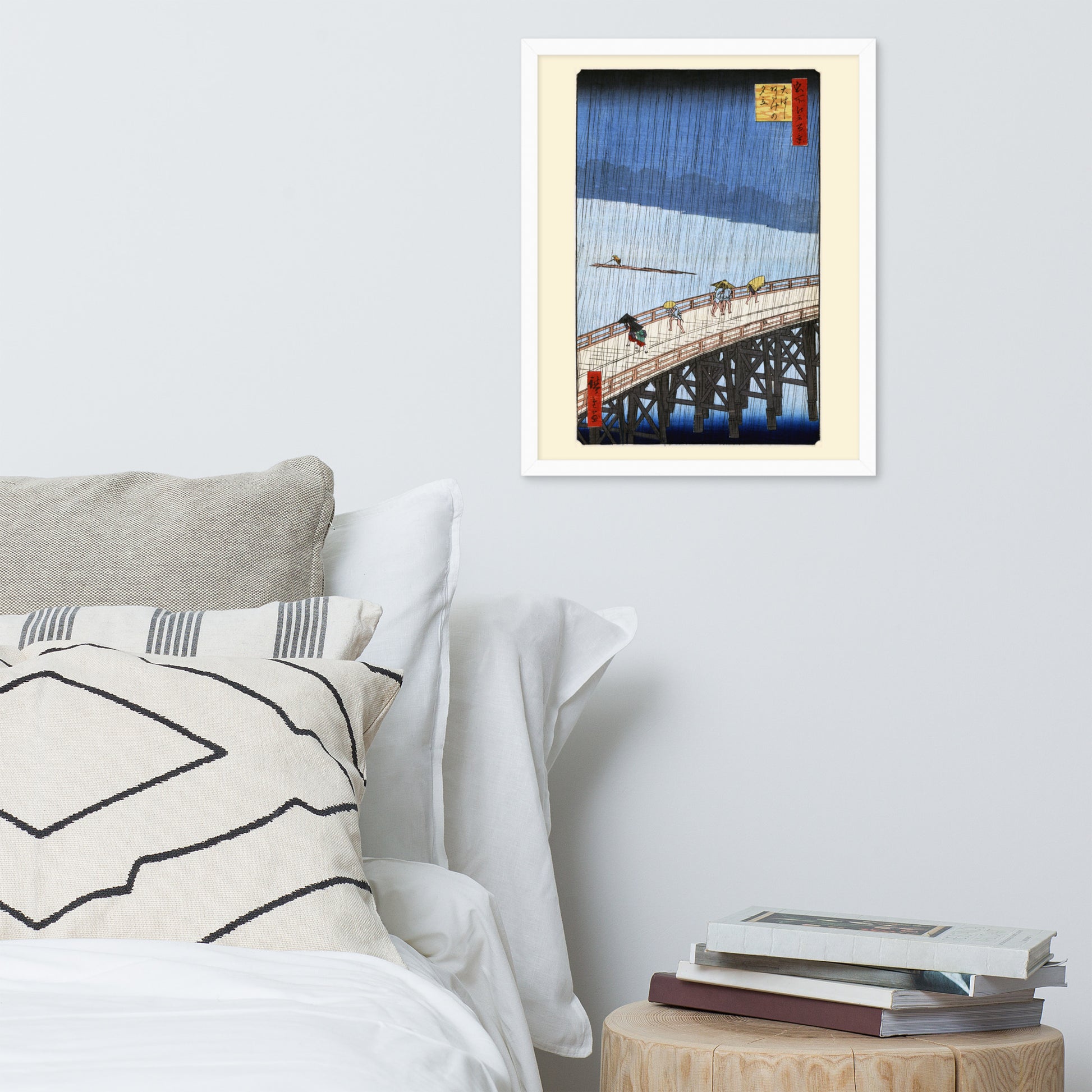 Capture the fleeting drama of nature with Sudden Shower over Shin-Ōhashi Bridge and Atake by Utagawa Hiroshige, a masterful example of Japanese Woodblock Prints (Ukiyo-e). This framed wall print immerses viewers in a rain-soaked moment as figures hurry across a wooden bridge, shielding themselves from the sudden downpour. The muted palette and vertical rain lines create a sense of urgency and movement, while the distant boat and calm water offer quiet contrast.