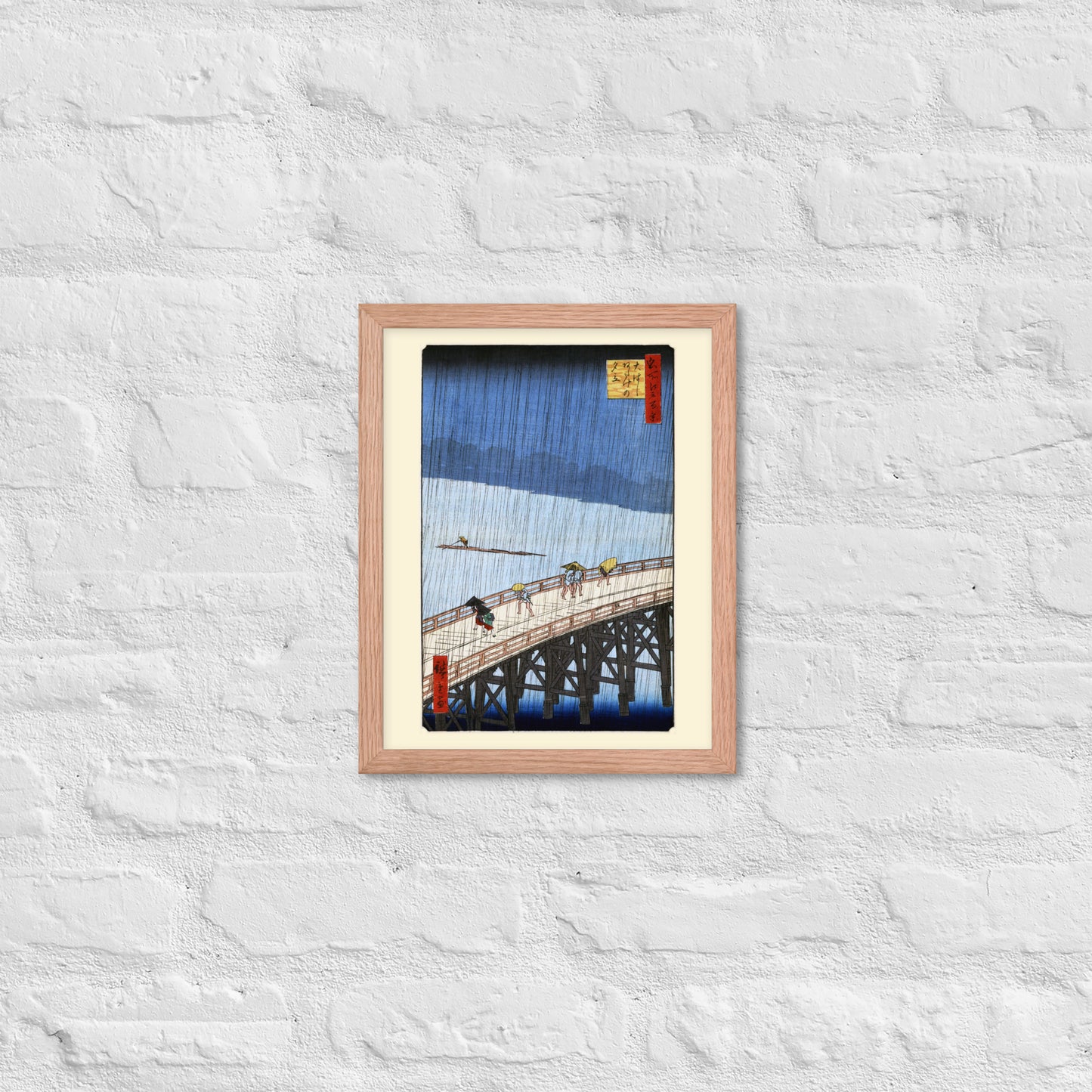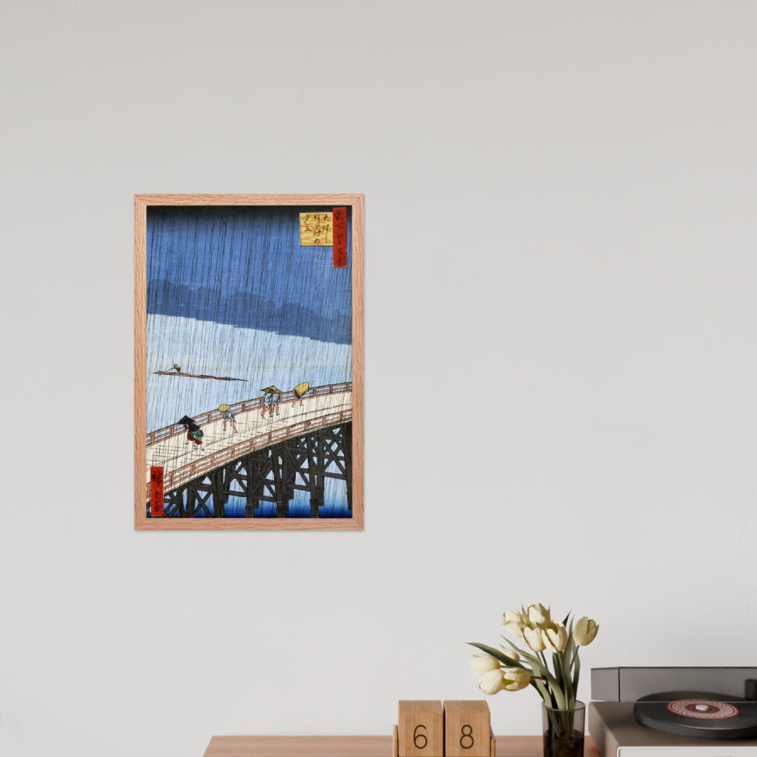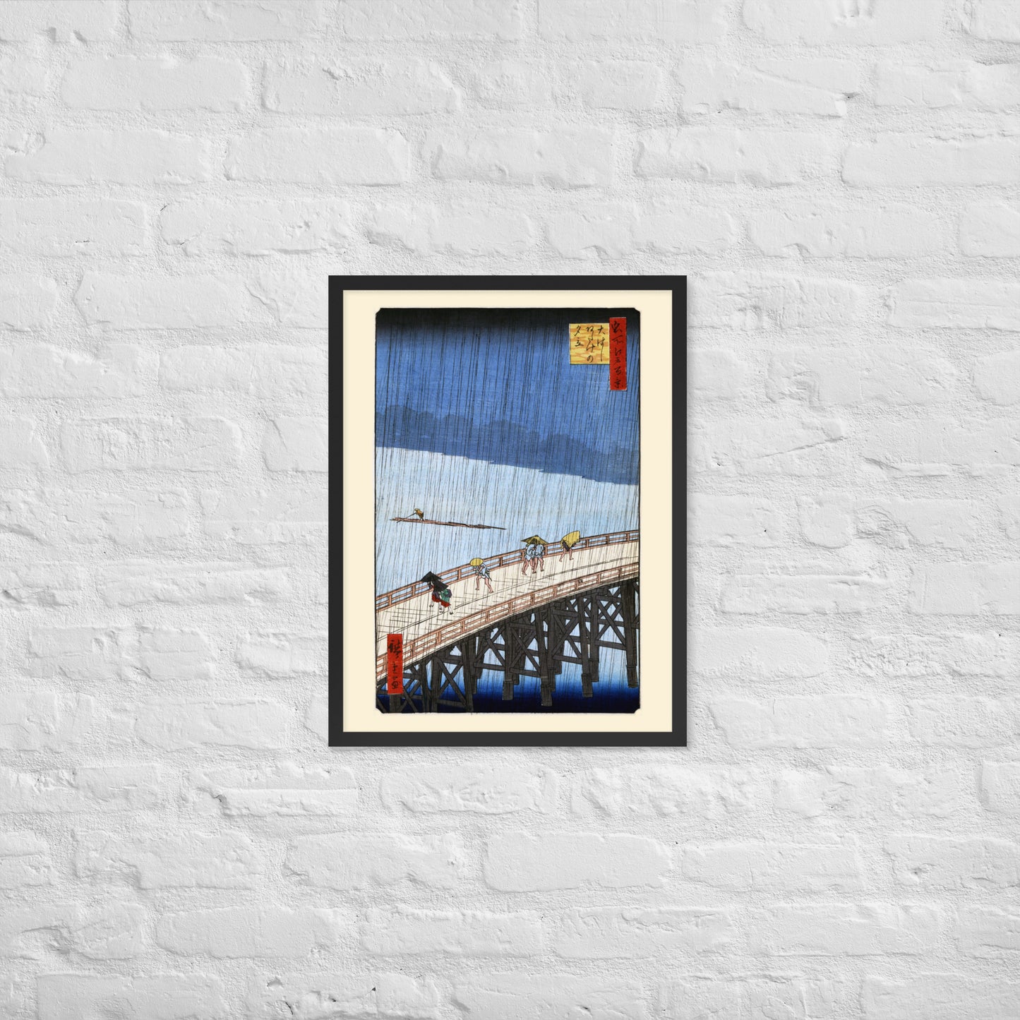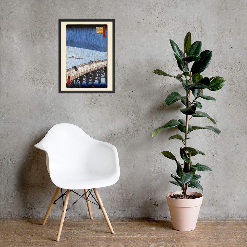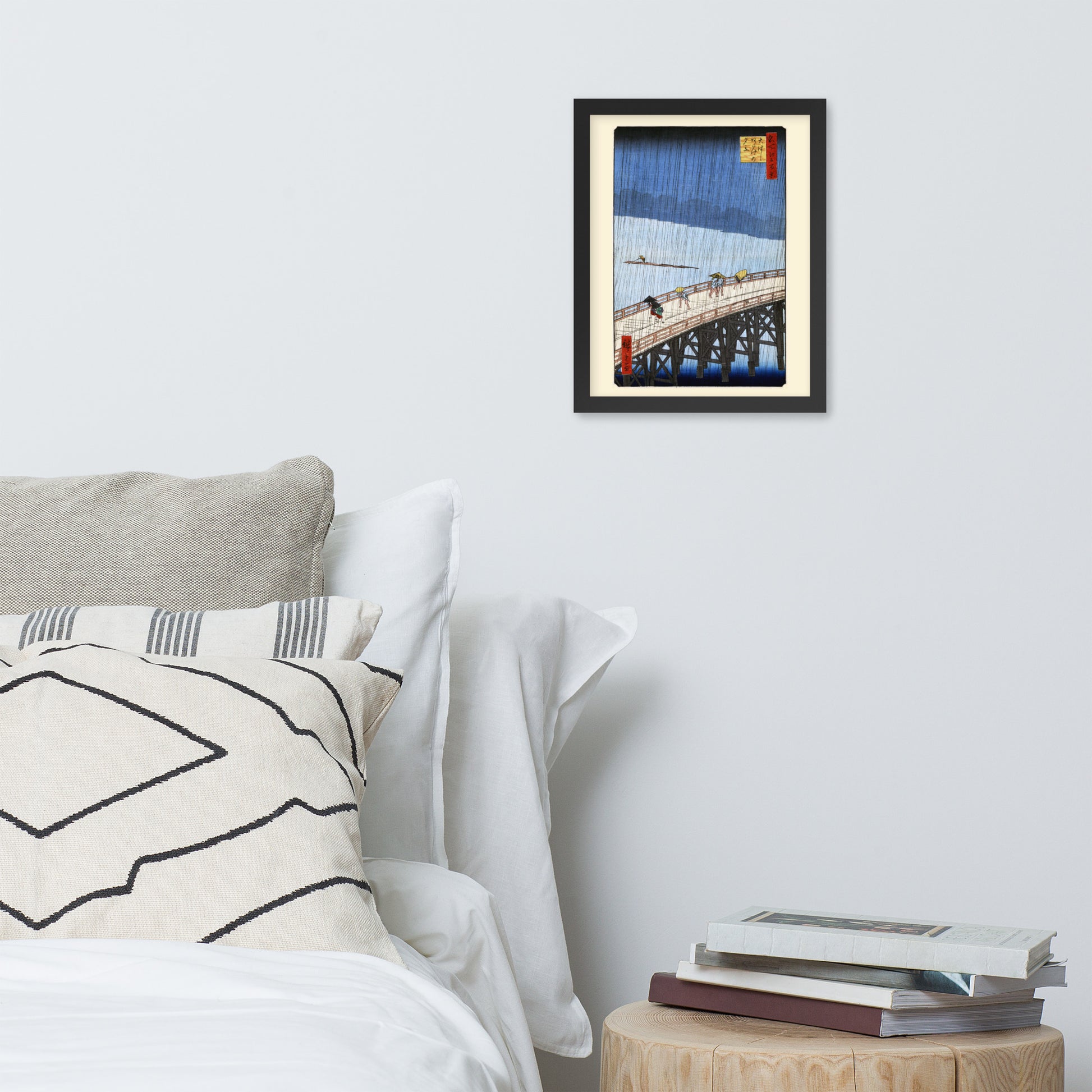 Capture the fleeting drama of nature with Sudden Shower over Shin-Ōhashi Bridge and Atake by Utagawa Hiroshige, a masterful example of Japanese Woodblock Prints (Ukiyo-e). This framed wall print immerses viewers in a rain-soaked moment as figures hurry across a wooden bridge, shielding themselves from the sudden downpour. The muted palette and vertical rain lines create a sense of urgency and movement, while the distant boat and calm water offer quiet contrast.