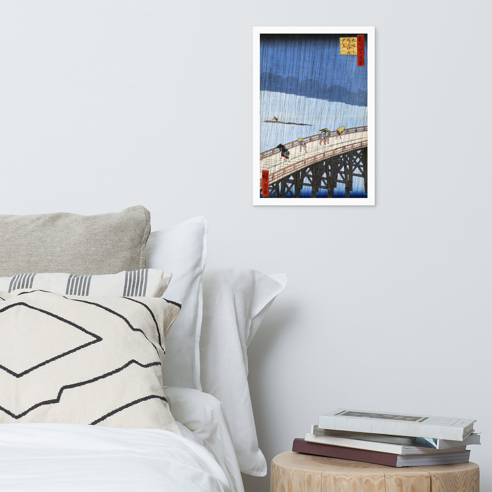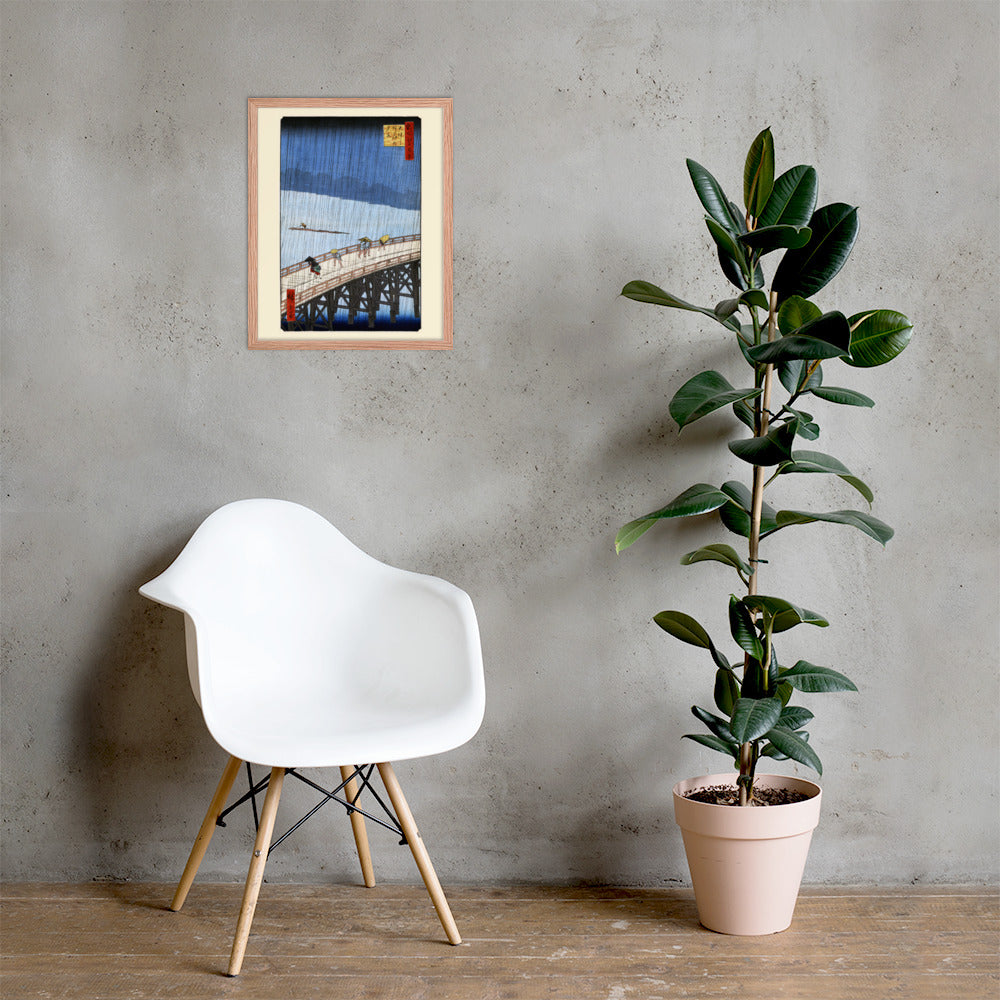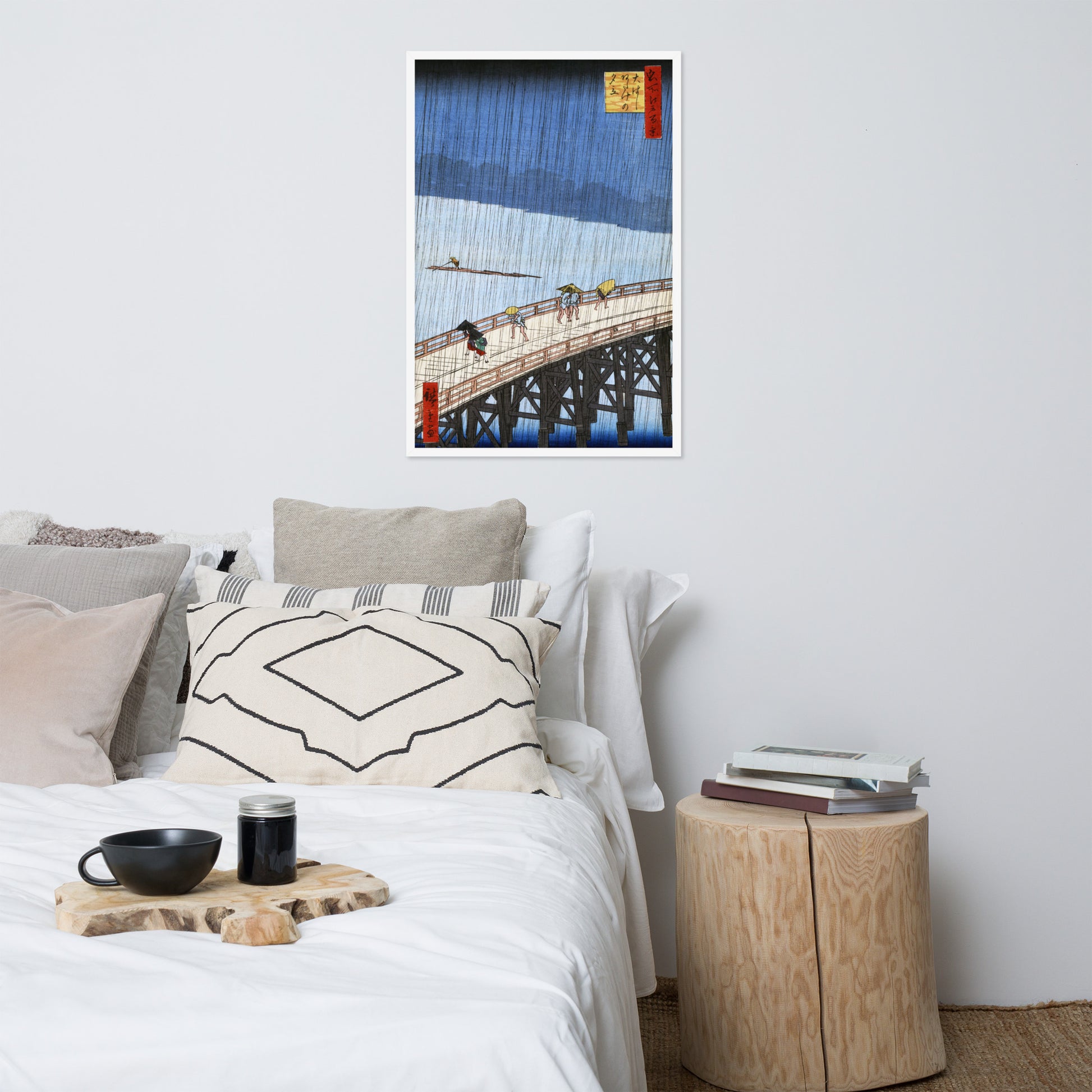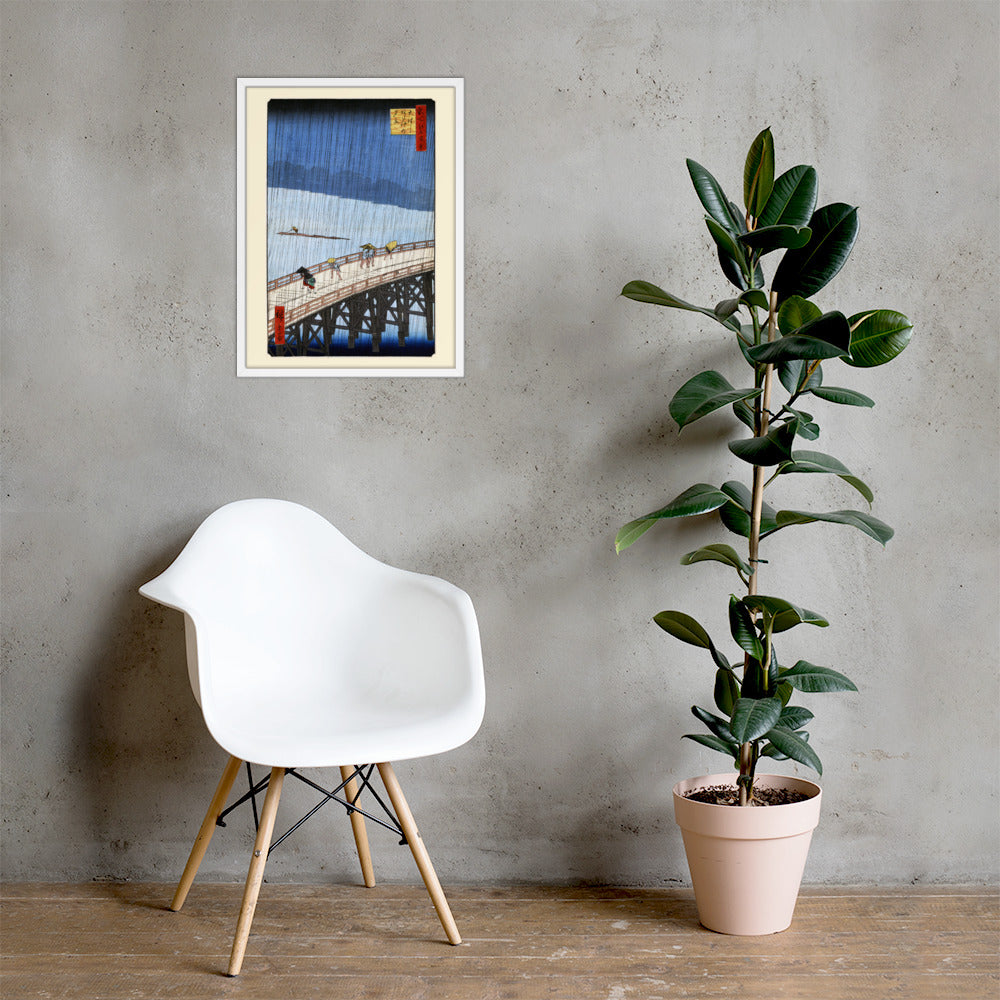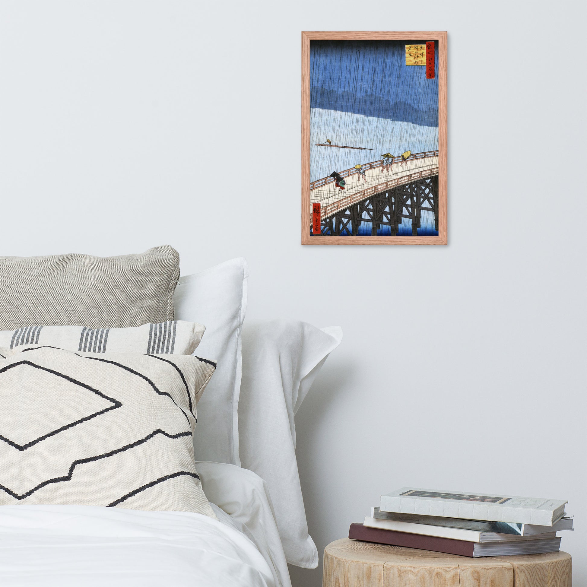 Capture the fleeting drama of nature with Sudden Shower over Shin-Ōhashi Bridge and Atake by Utagawa Hiroshige, a masterful example of Japanese Woodblock Prints (Ukiyo-e). This framed wall print immerses viewers in a rain-soaked moment as figures hurry across a wooden bridge, shielding themselves from the sudden downpour. The muted palette and vertical rain lines create a sense of urgency and movement, while the distant boat and calm water offer quiet contrast.