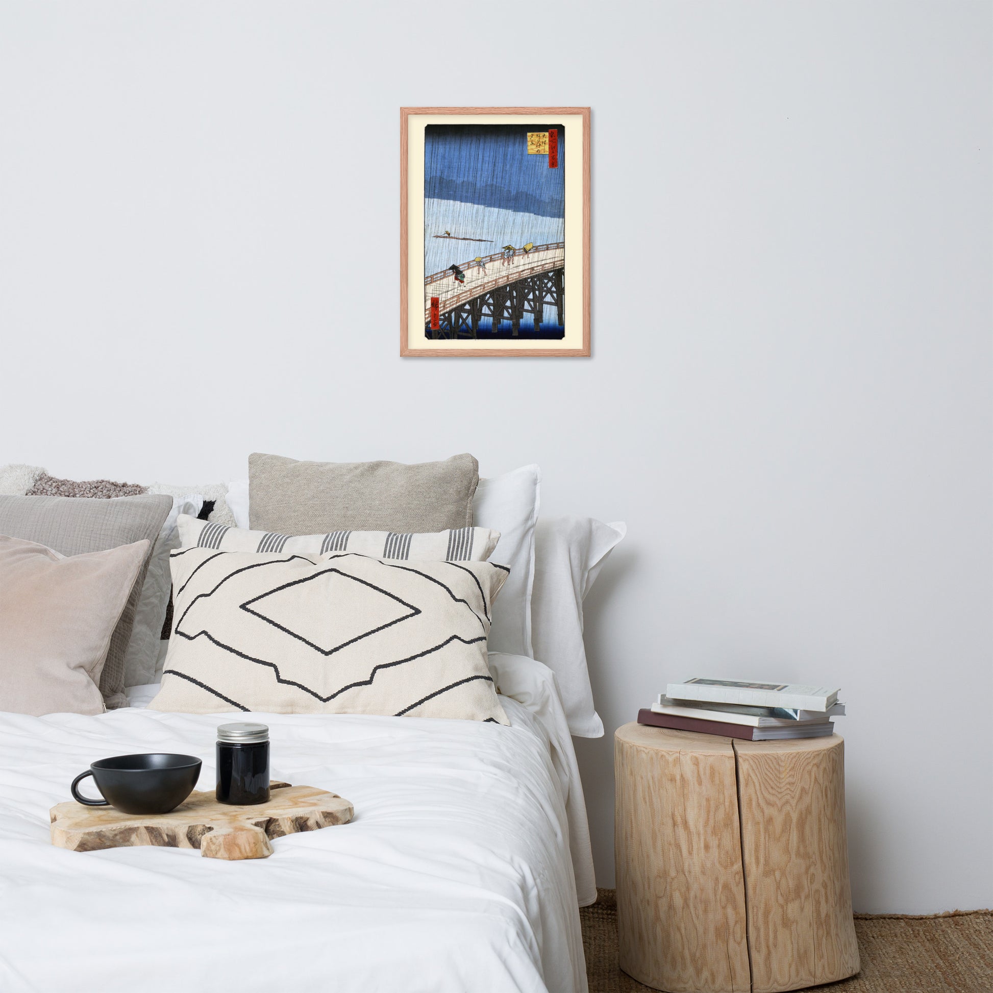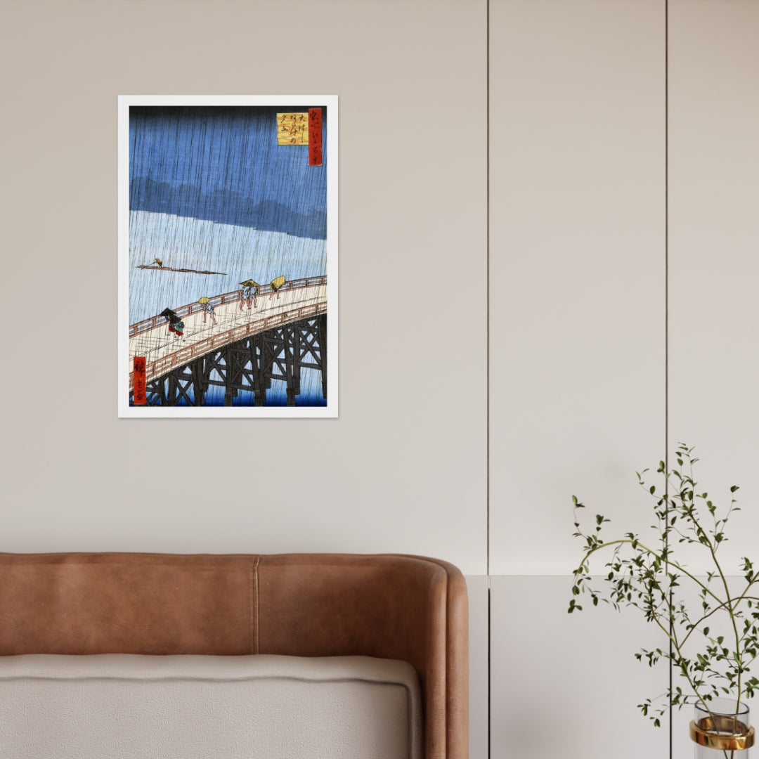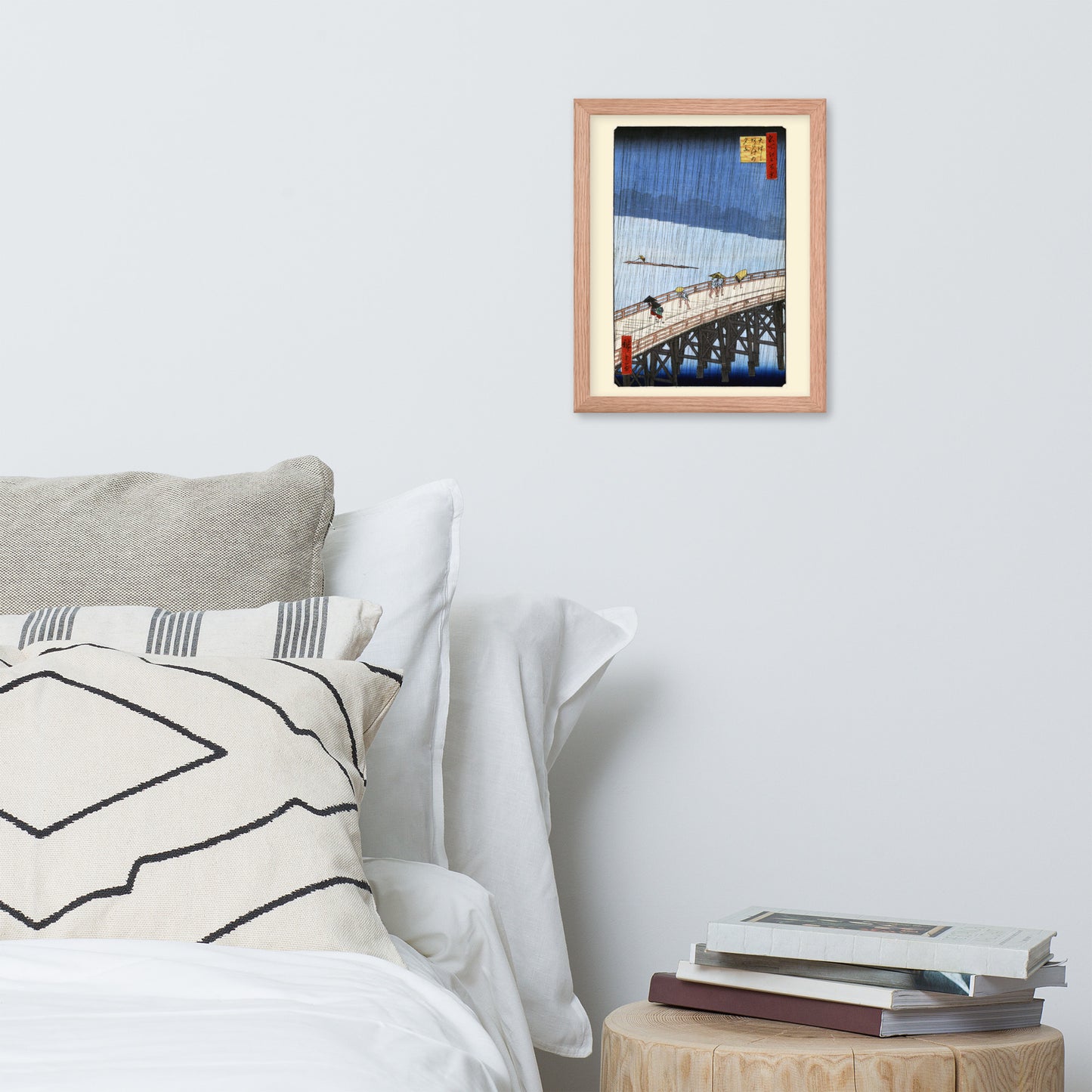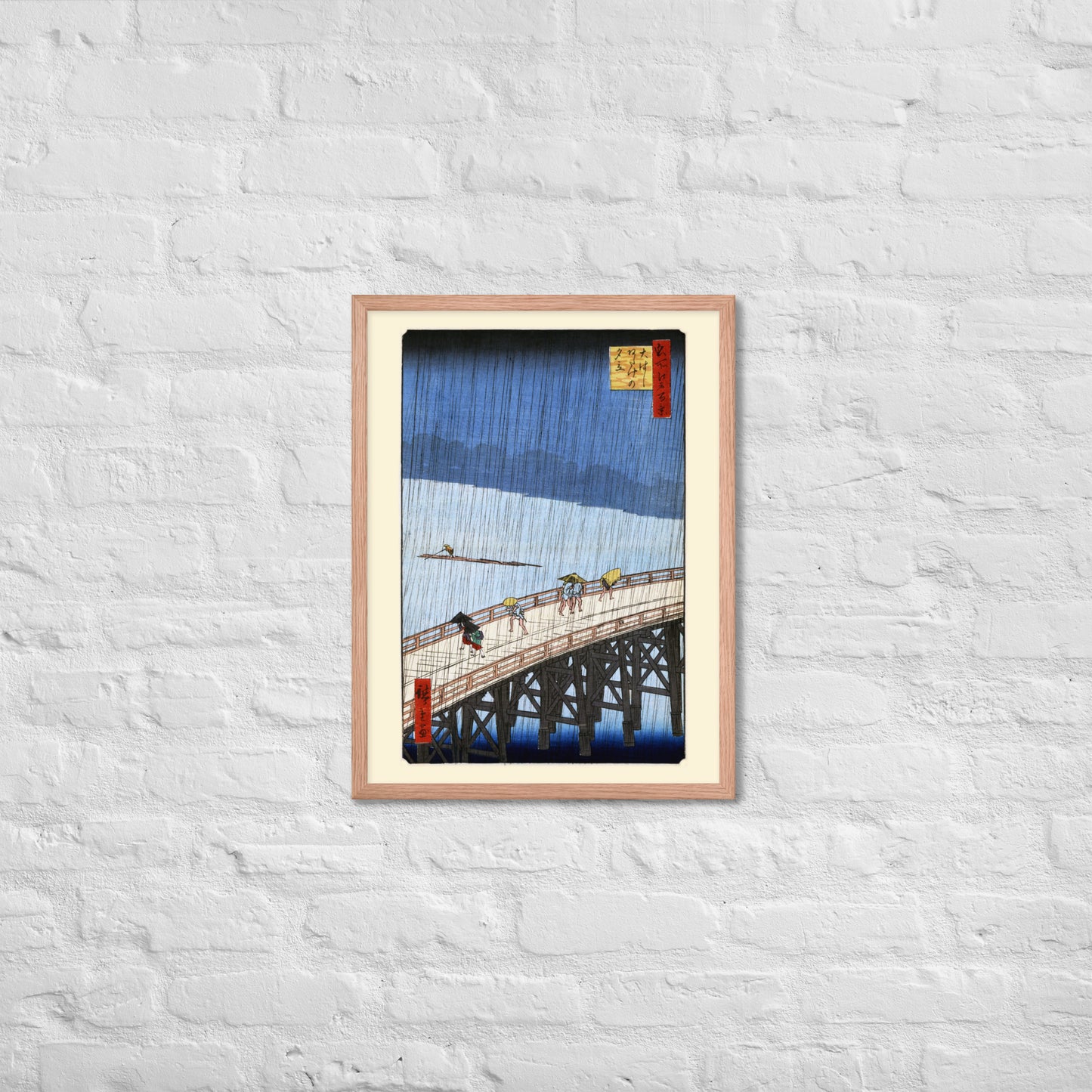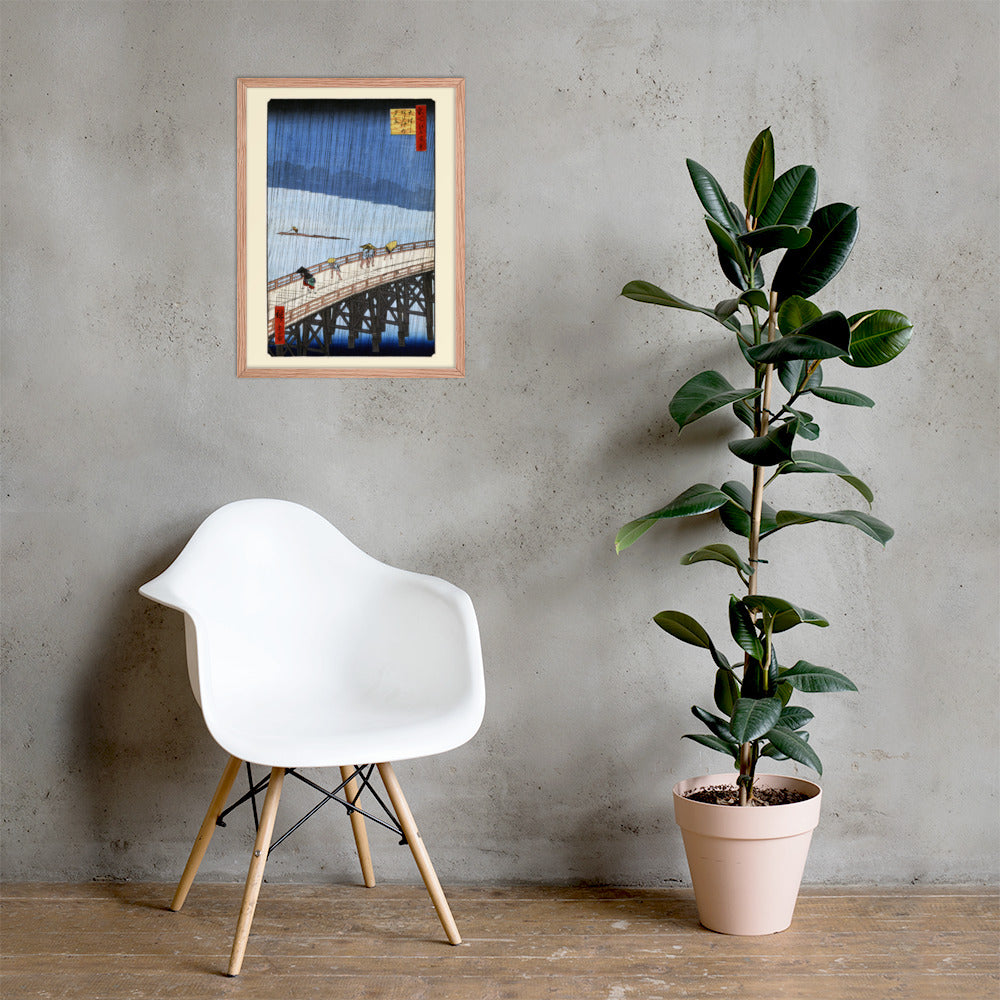 Capture the fleeting drama of nature with Sudden Shower over Shin-Ōhashi Bridge and Atake by Utagawa Hiroshige, a masterful example of Japanese Woodblock Prints (Ukiyo-e). This framed wall print immerses viewers in a rain-soaked moment as figures hurry across a wooden bridge, shielding themselves from the sudden downpour. The muted palette and vertical rain lines create a sense of urgency and movement, while the distant boat and calm water offer quiet contrast.