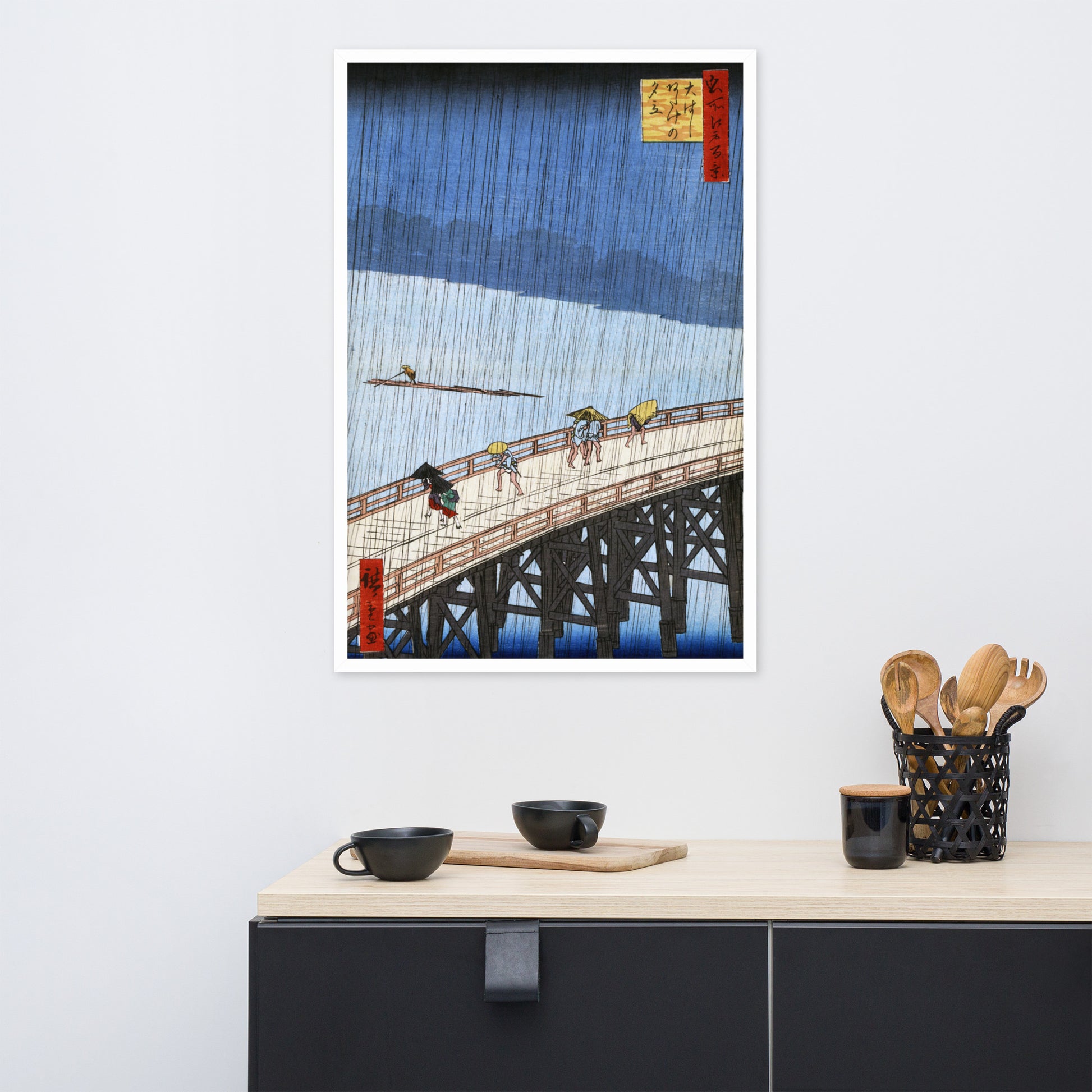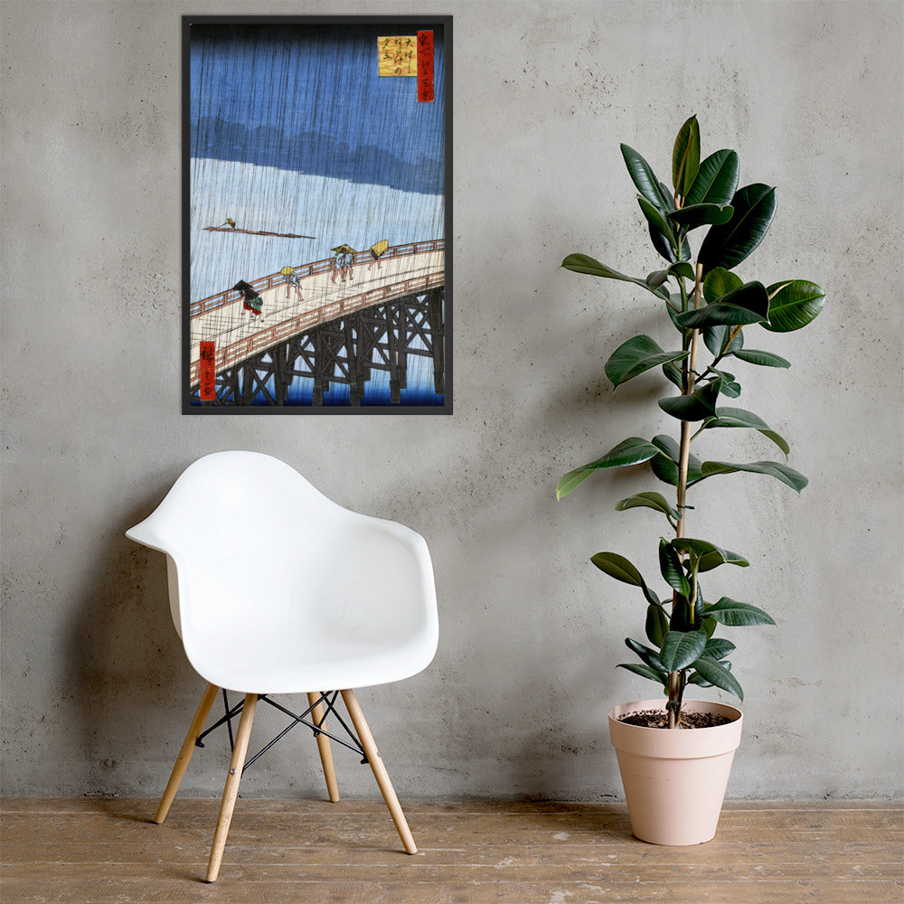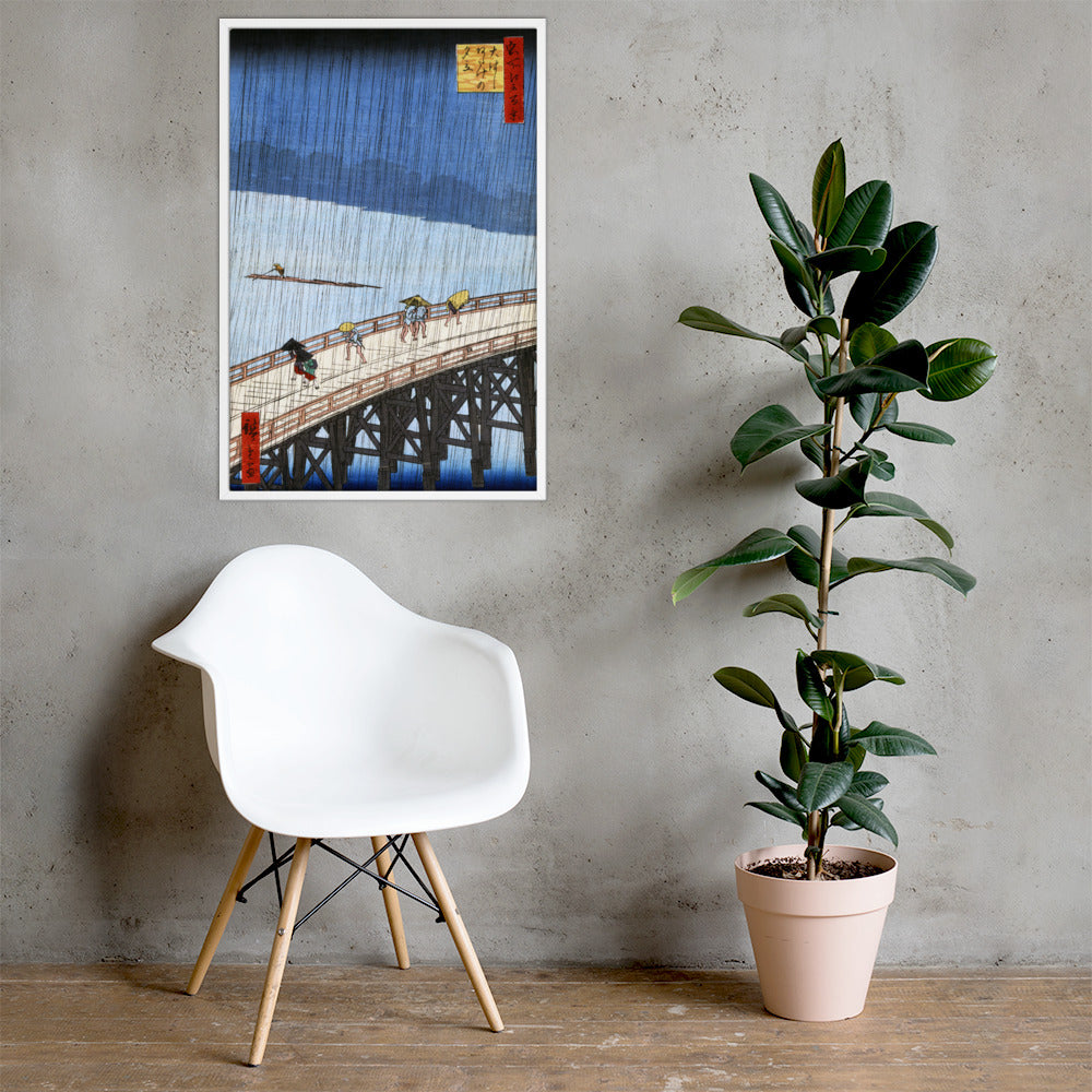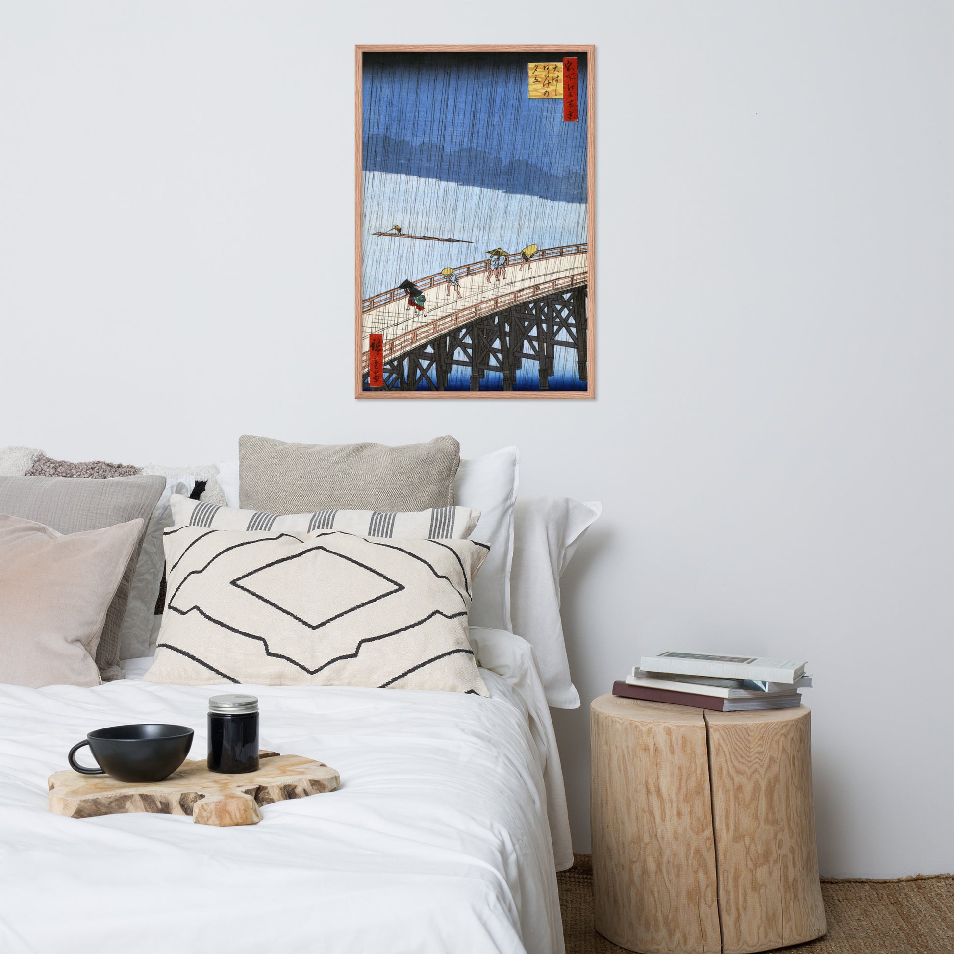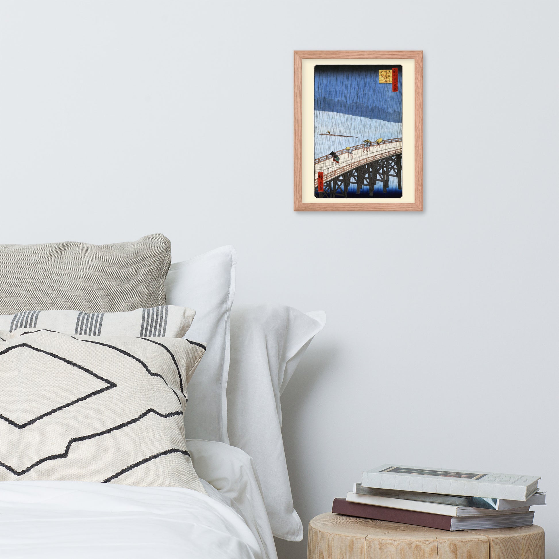 Capture the fleeting drama of nature with Sudden Shower over Shin-Ōhashi Bridge and Atake by Utagawa Hiroshige, a masterful example of Japanese Woodblock Prints (Ukiyo-e). This framed wall print immerses viewers in a rain-soaked moment as figures hurry across a wooden bridge, shielding themselves from the sudden downpour. The muted palette and vertical rain lines create a sense of urgency and movement, while the distant boat and calm water offer quiet contrast.