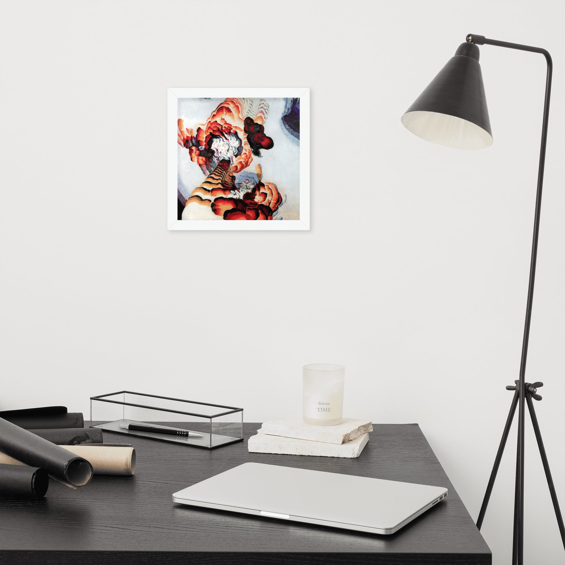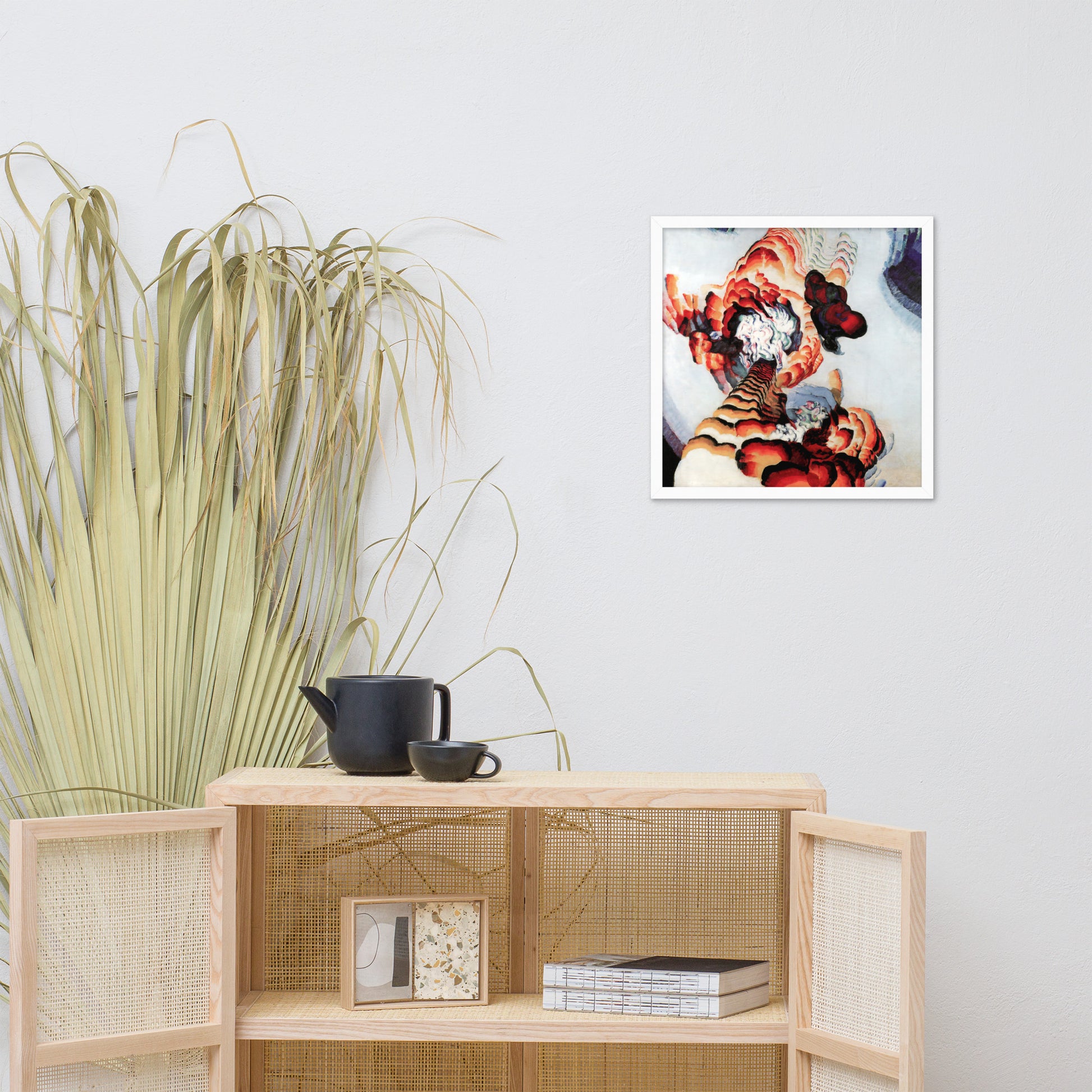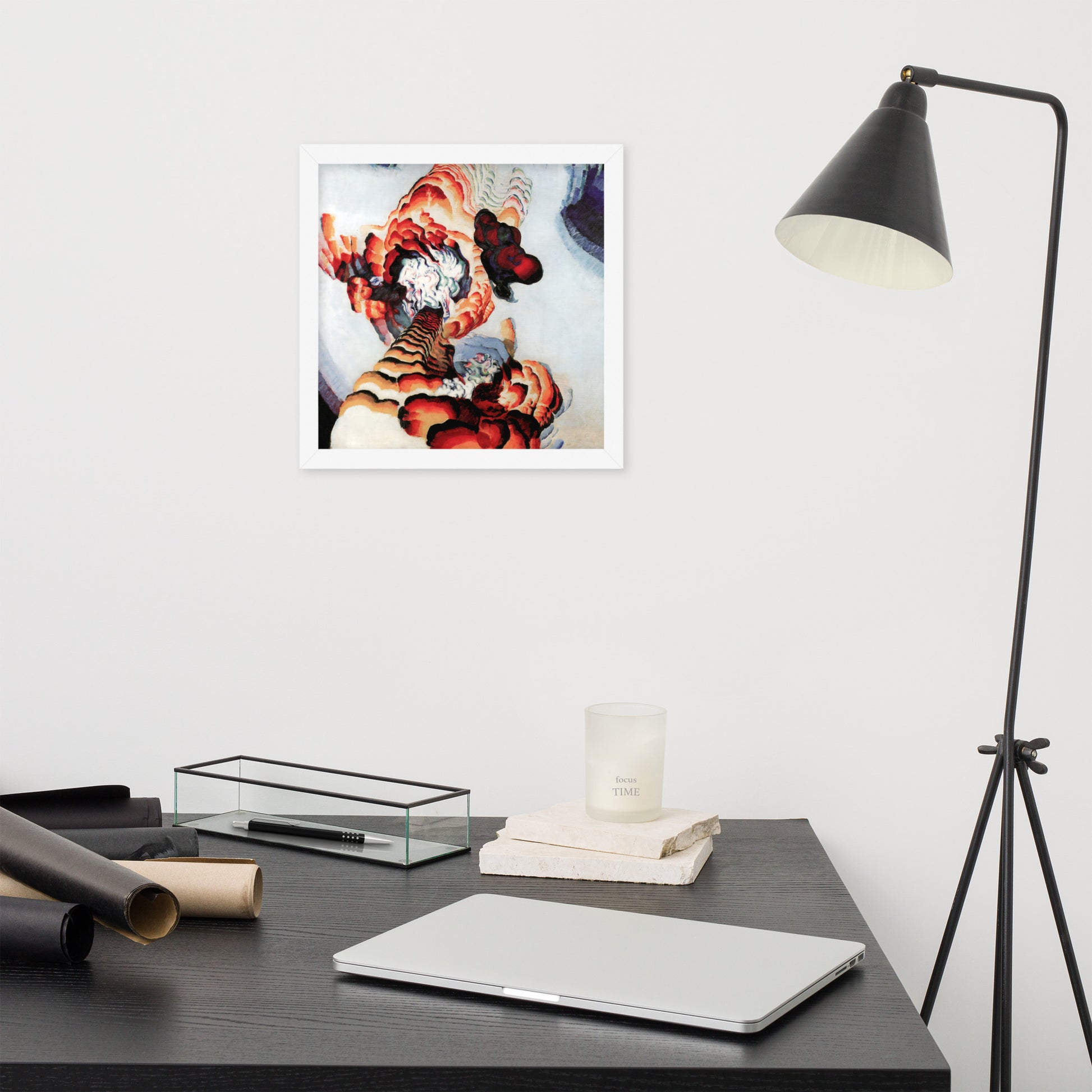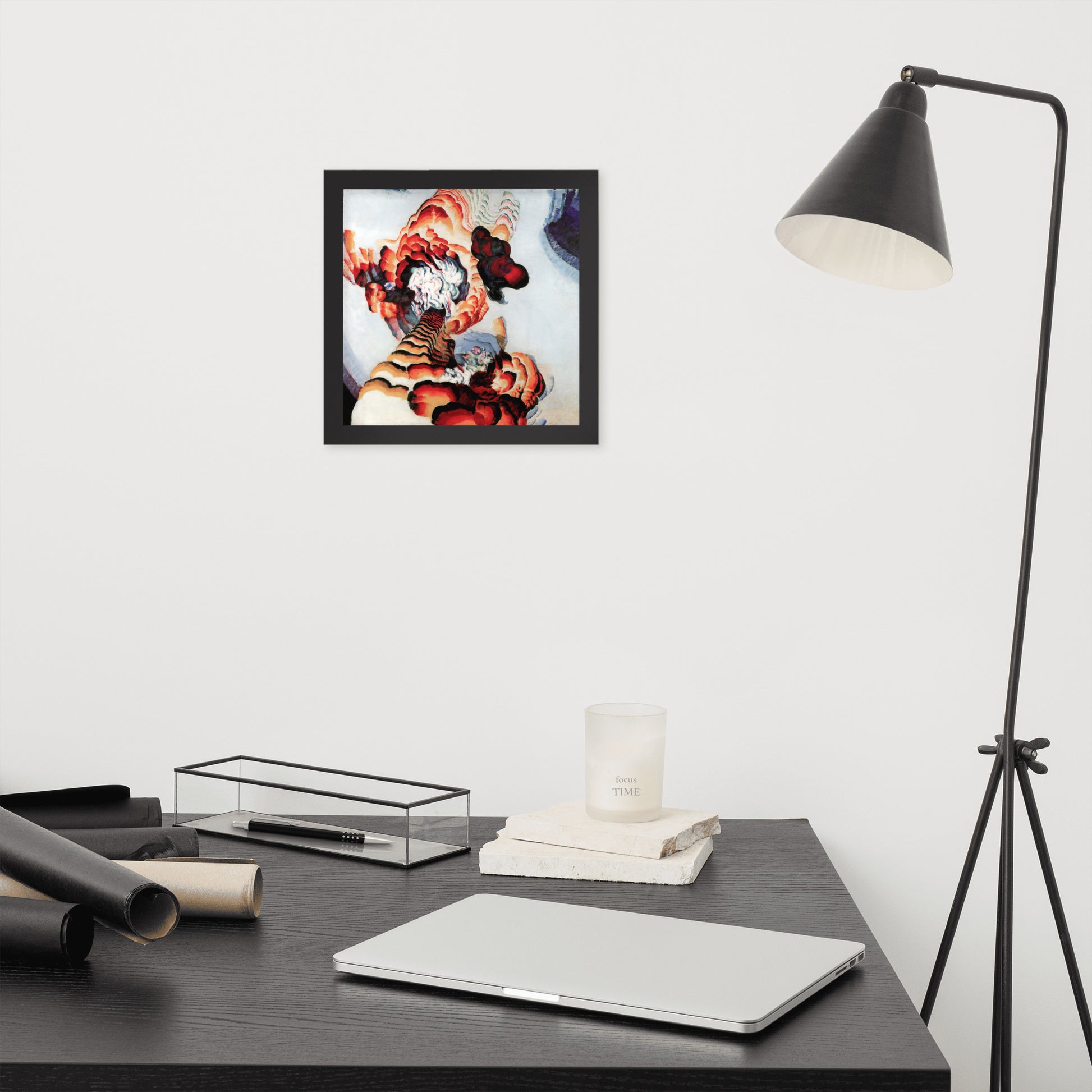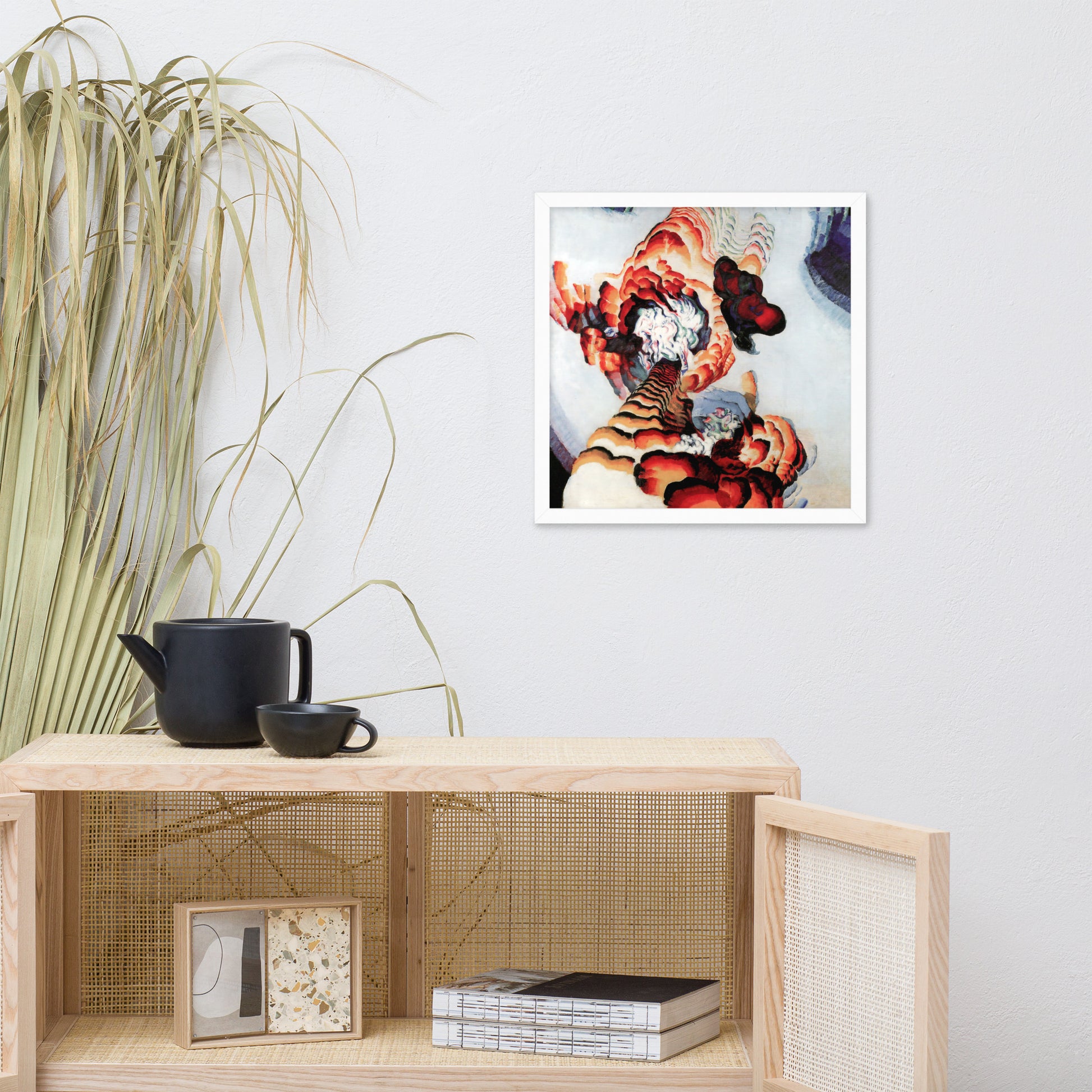 Set against a soft gradient of blues and whites, the artwork’s layered textures and vibrant contrasts invite contemplation and conversation. Whether displayed in a minimalist living room or a creative studio, this abstract piece adds depth and drama without overpowering the space. Professionally framed in sleek black, it’s ready to hang and elevate your environment with a touch of avant-garde elegance.