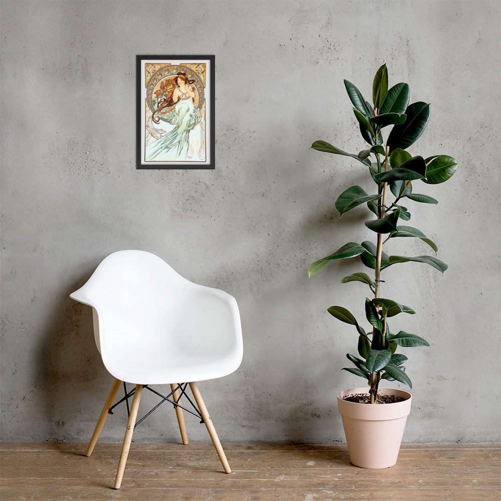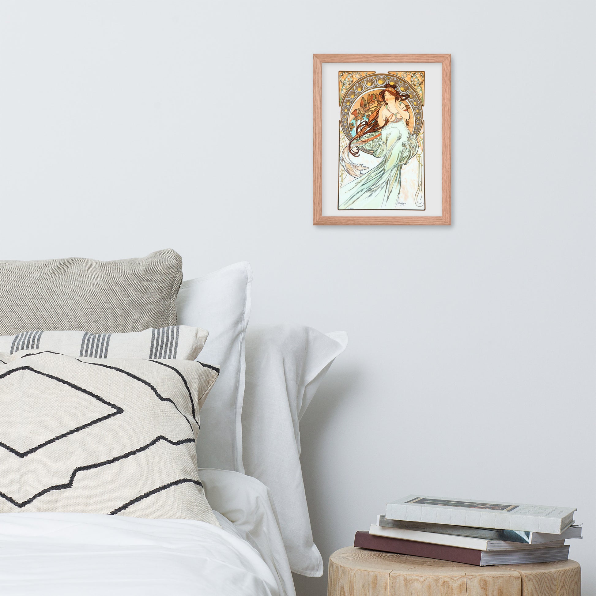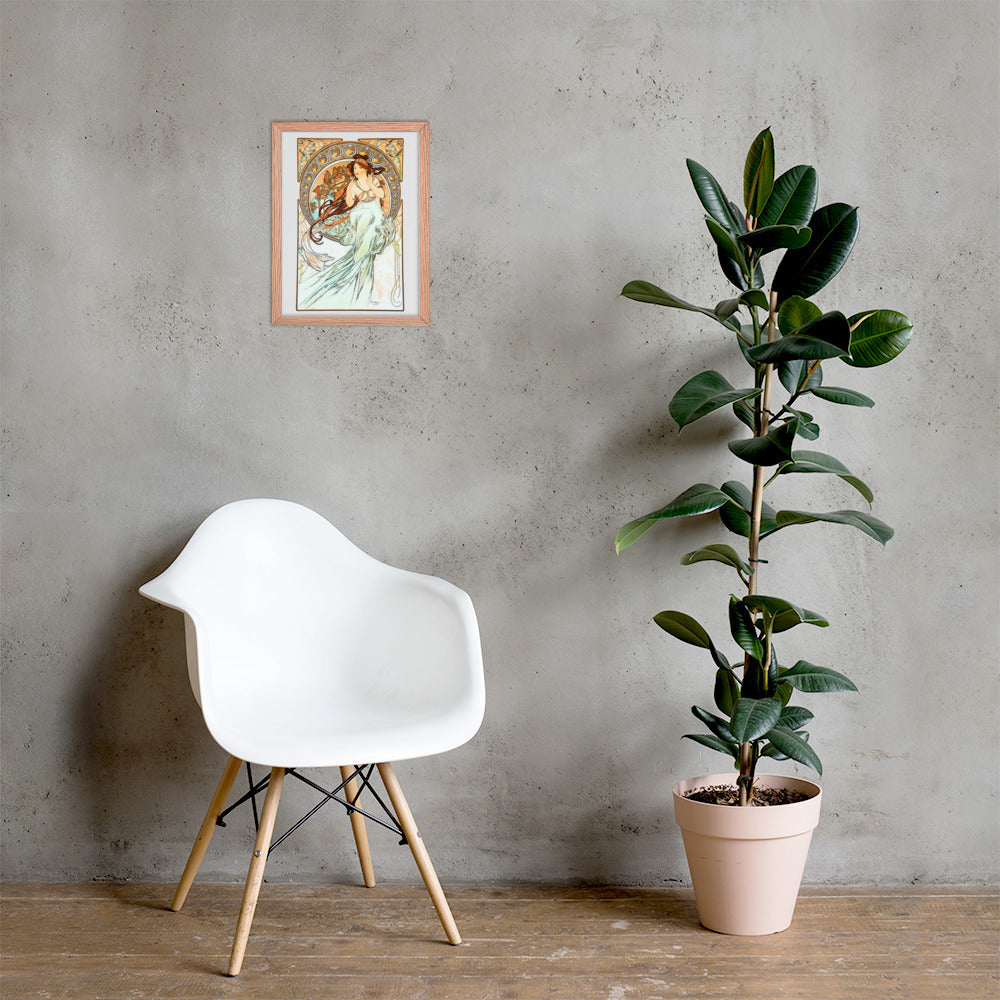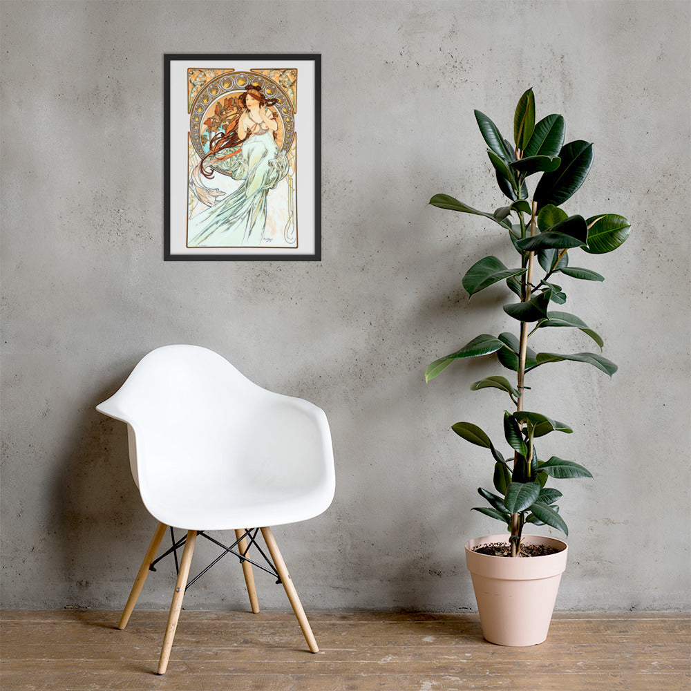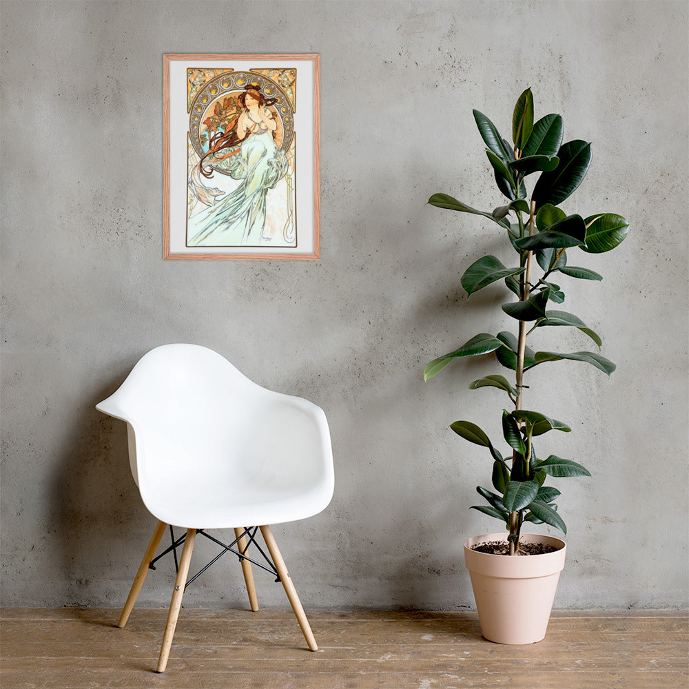 Immerse your space in the lyrical beauty of Art Nouveau with this framed wall print of The Arts, Music by Alphonse Maria Mucha. This captivating illustration features a seated woman in a flowing pale green gown, her long, dark hair cascading like a melody around her. She is encircled by an ornate halo of floral motifs, celestial stars, and decorative patterns that evoke rhythm and harmony. Mucha’s signature style—warm tones, intricate detailing, and ethereal composition—transforms this piece into a visual symphony of grace and serenity.