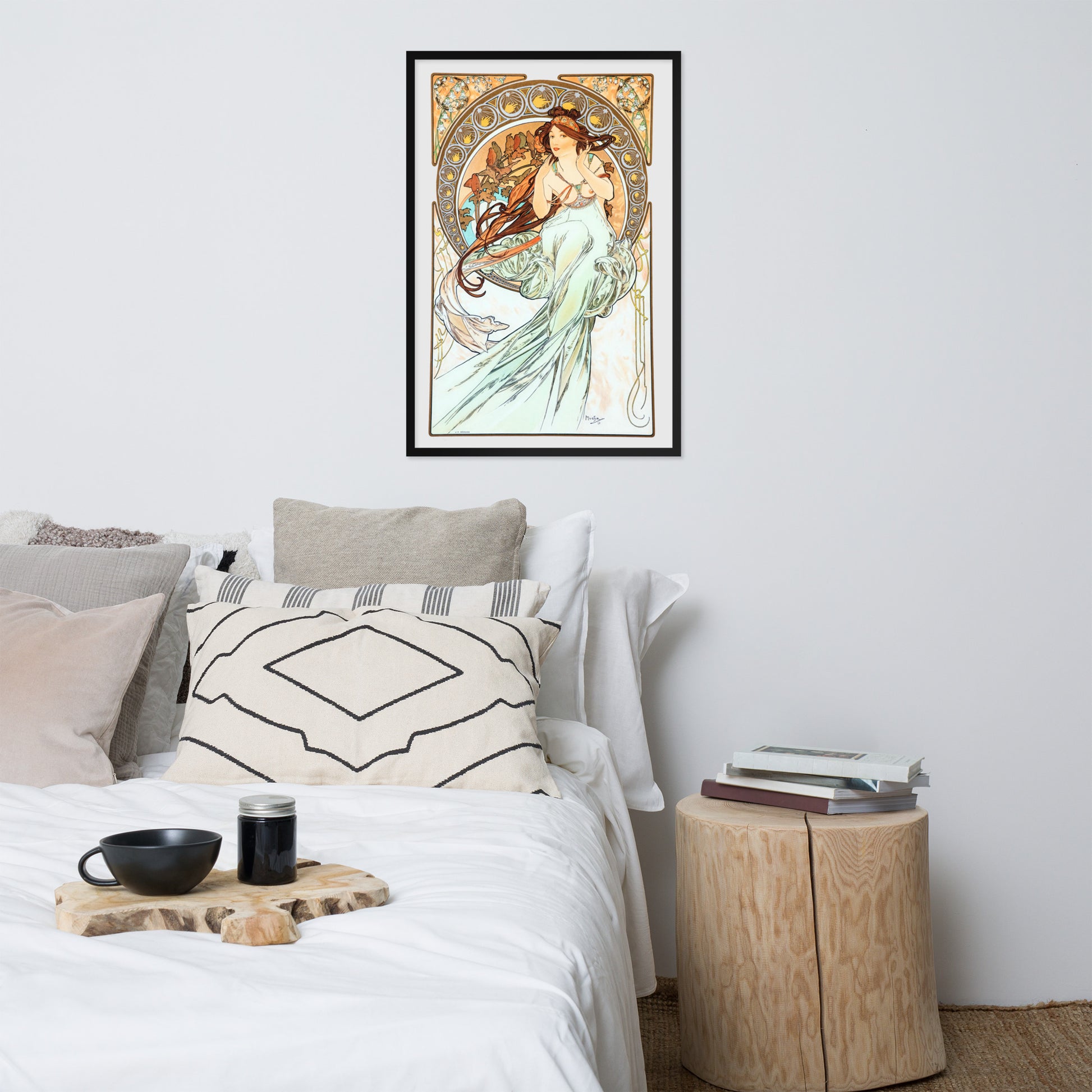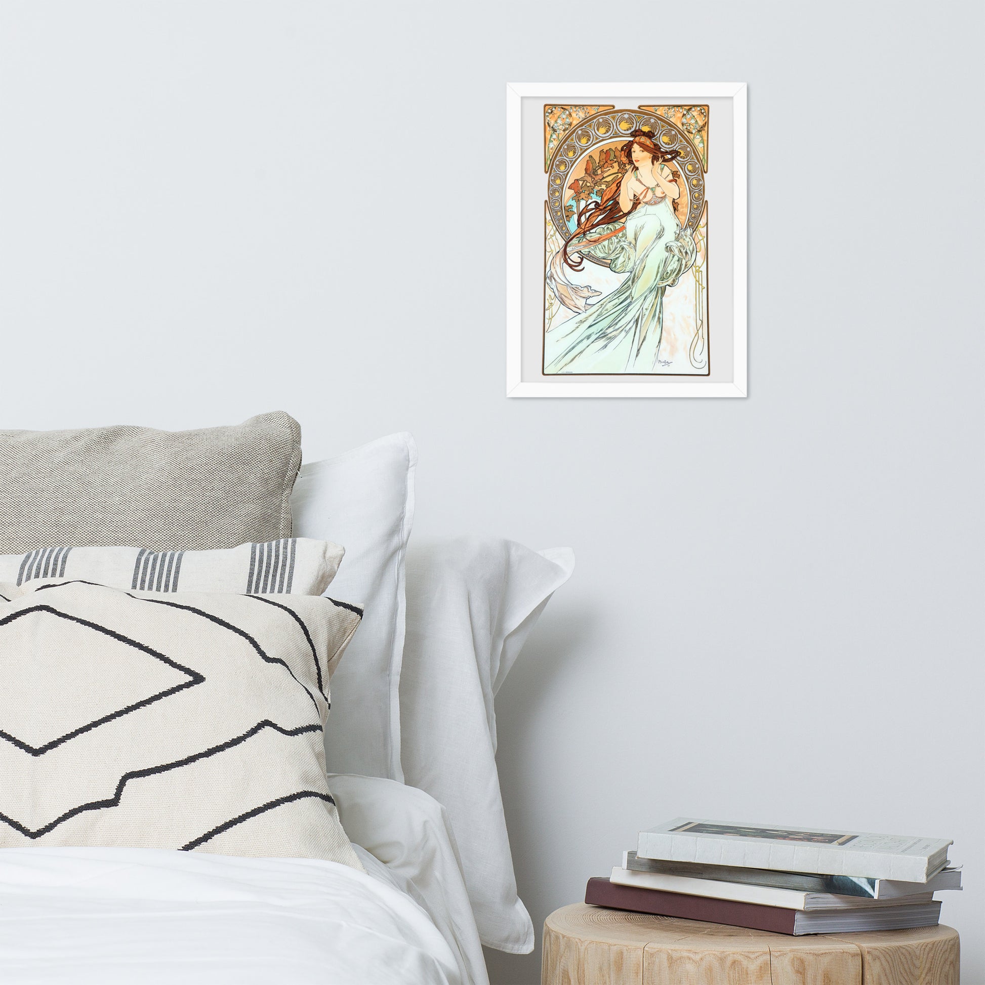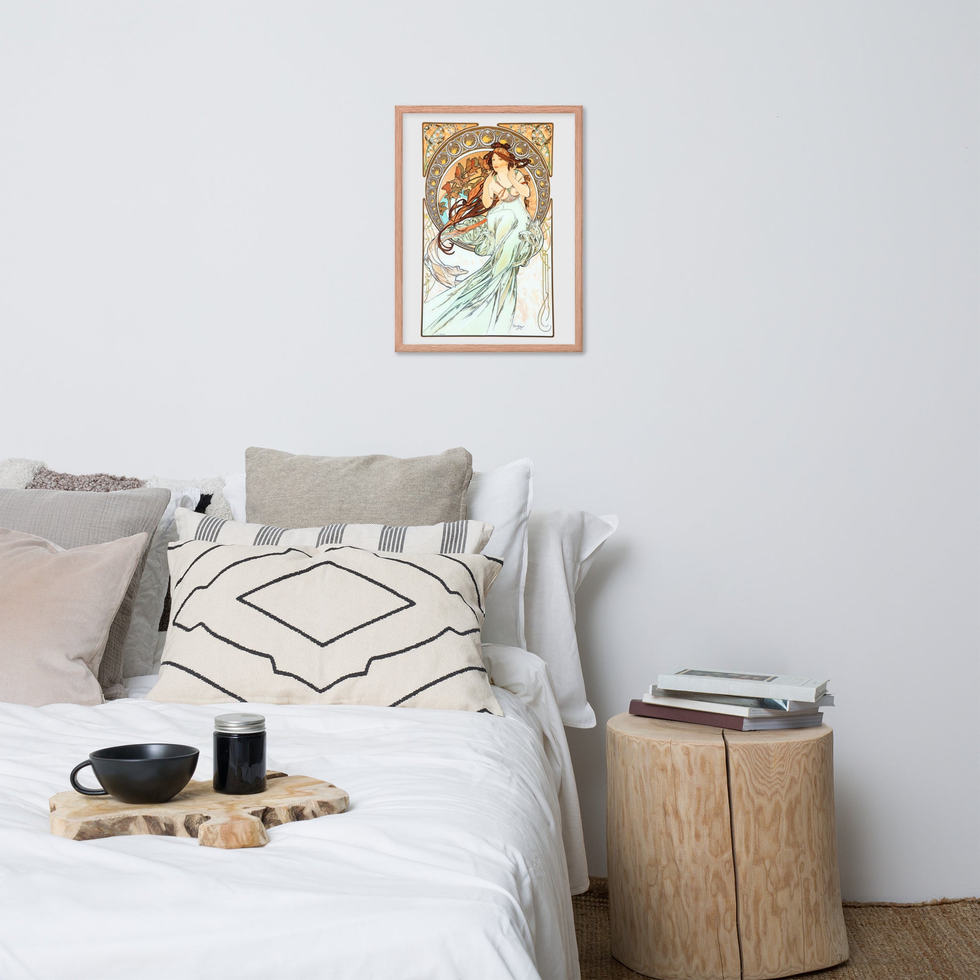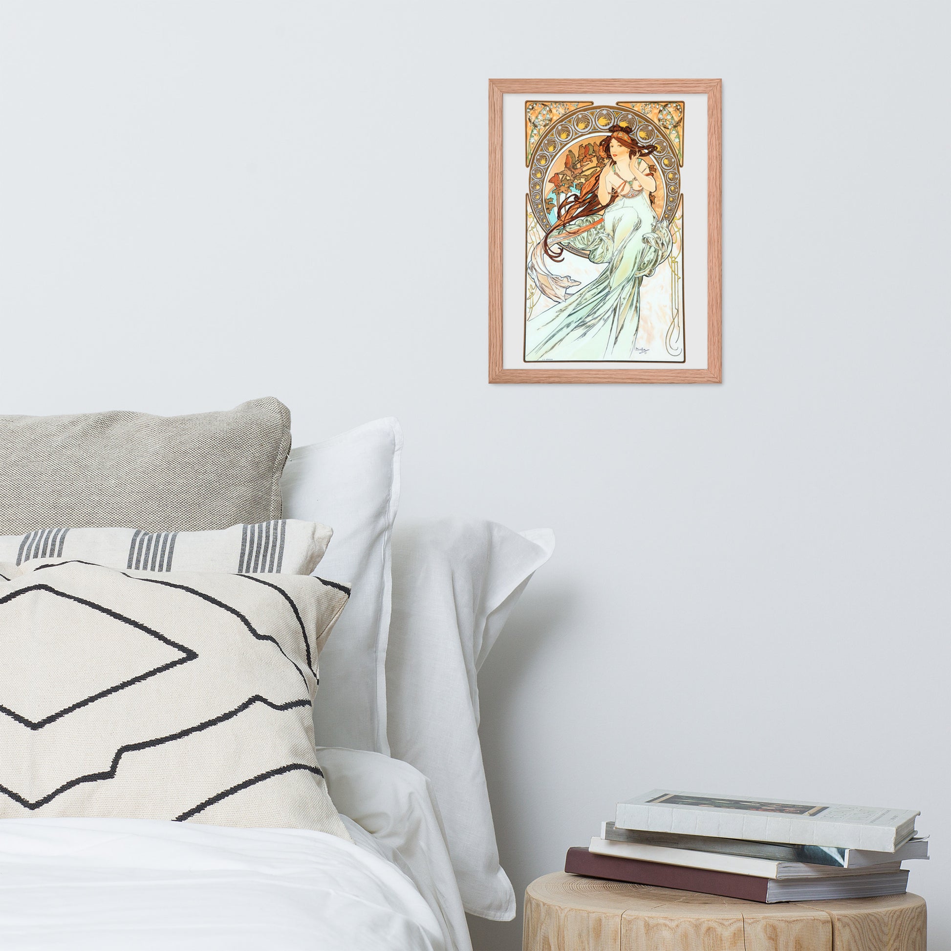Immerse your space in the lyrical beauty of Art Nouveau with this framed wall print of The Arts, Music by Alphonse Maria Mucha. This captivating illustration features a seated woman in a flowing pale green gown, her long, dark hair cascading like a melody around her. She is encircled by an ornate halo of floral motifs, celestial stars, and decorative patterns that evoke rhythm and harmony. Mucha’s signature style—warm tones, intricate detailing, and ethereal composition—transforms this piece into a visual symphony of grace and serenity.