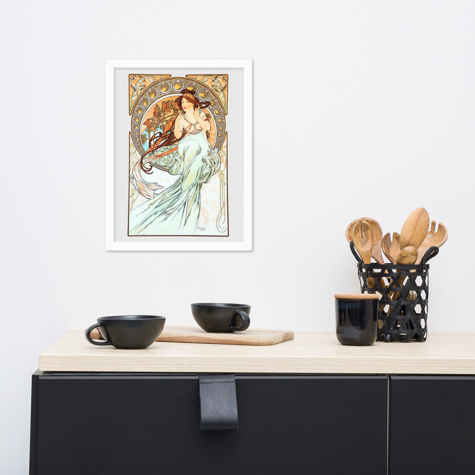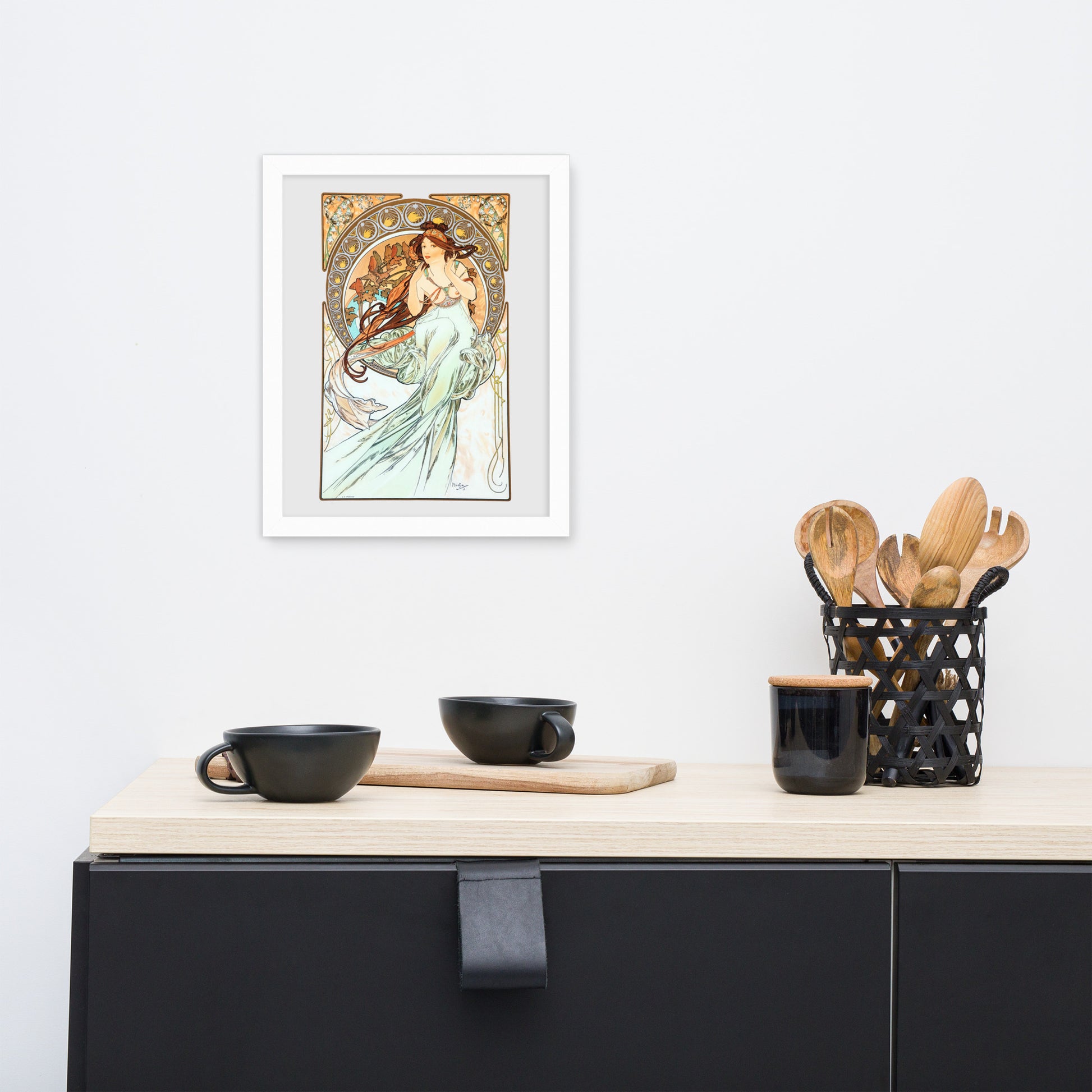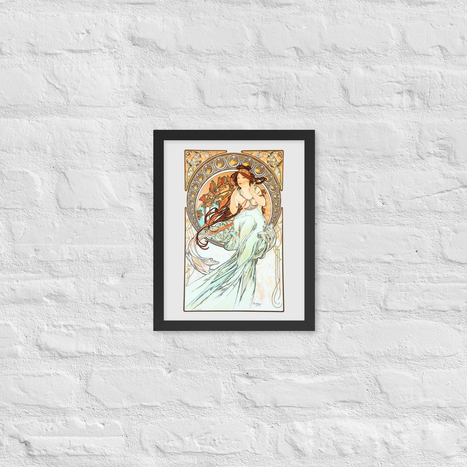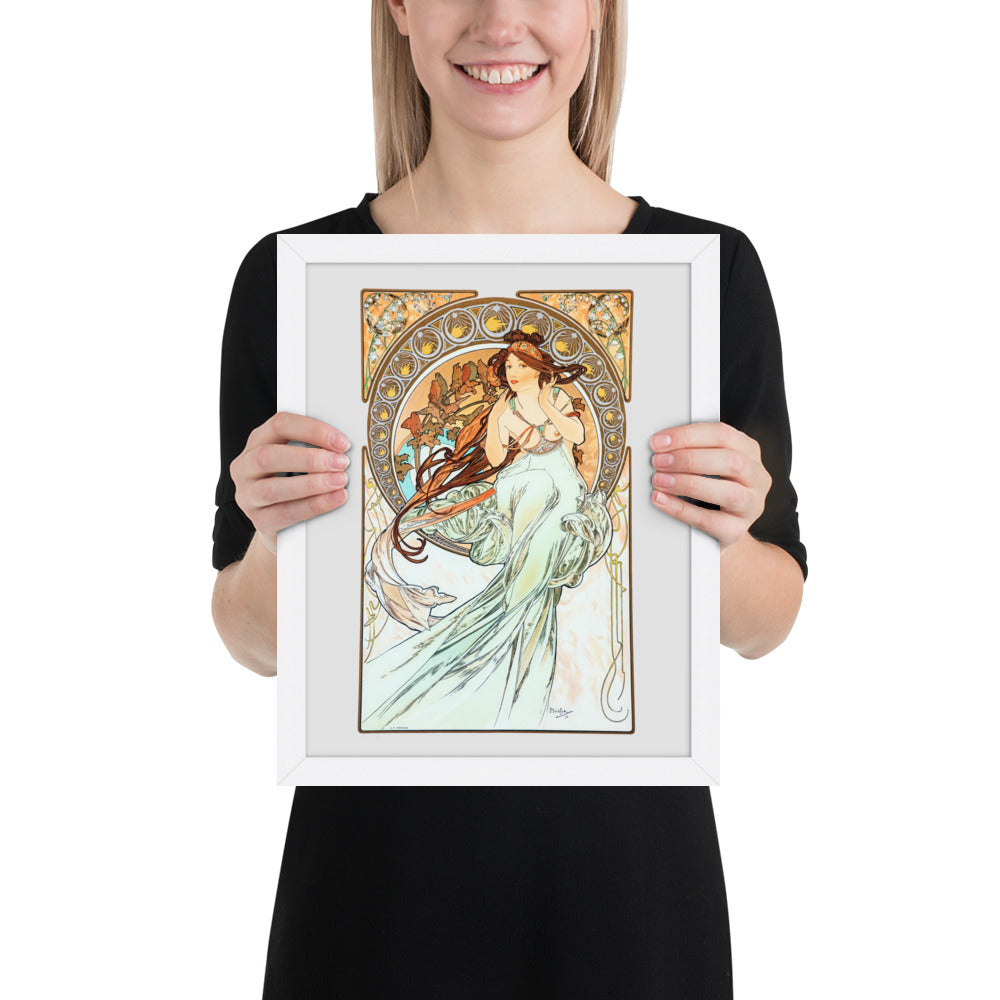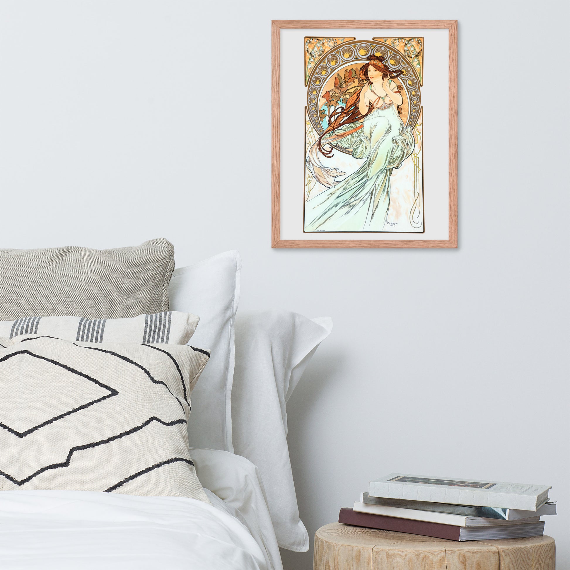 Immerse your space in the lyrical beauty of Art Nouveau with this framed wall print of The Arts, Music by Alphonse Maria Mucha. This captivating illustration features a seated woman in a flowing pale green gown, her long, dark hair cascading like a melody around her. She is encircled by an ornate halo of floral motifs, celestial stars, and decorative patterns that evoke rhythm and harmony. Mucha’s signature style—warm tones, intricate detailing, and ethereal composition—transforms this piece into a visual symphony of grace and serenity.