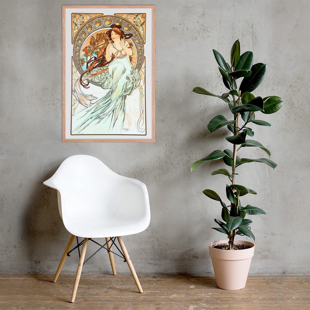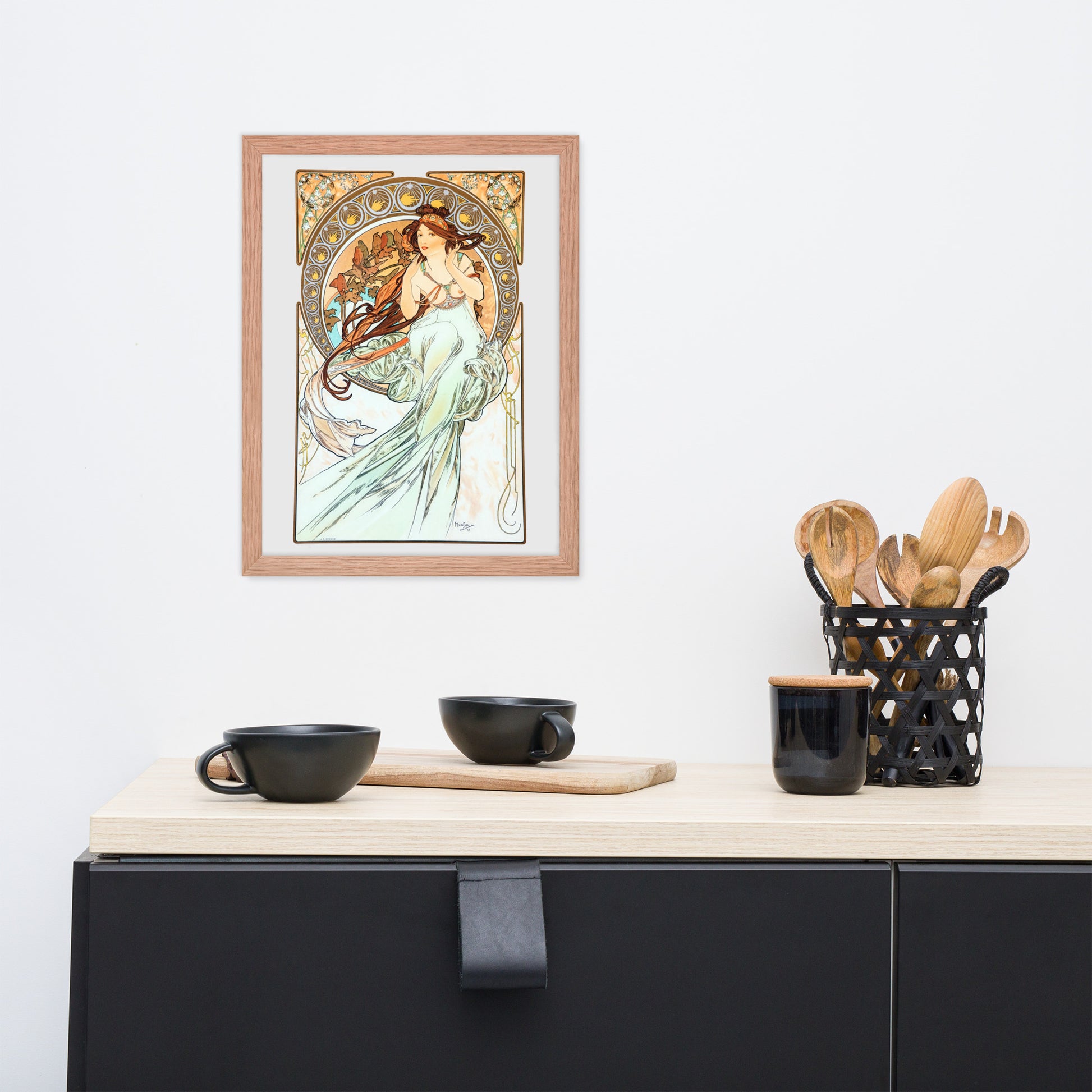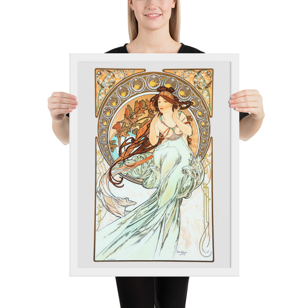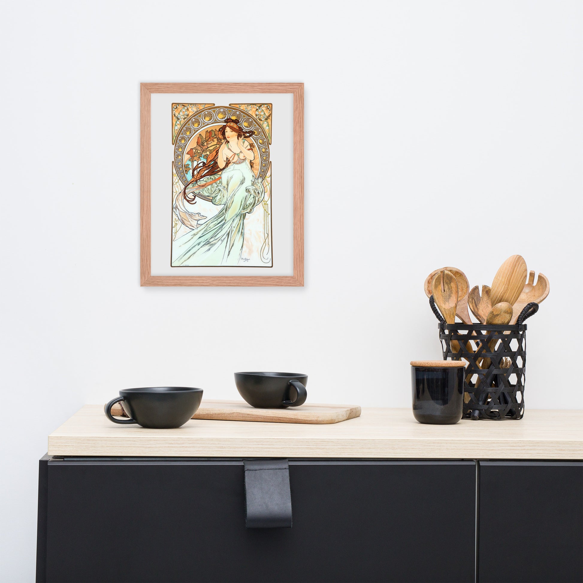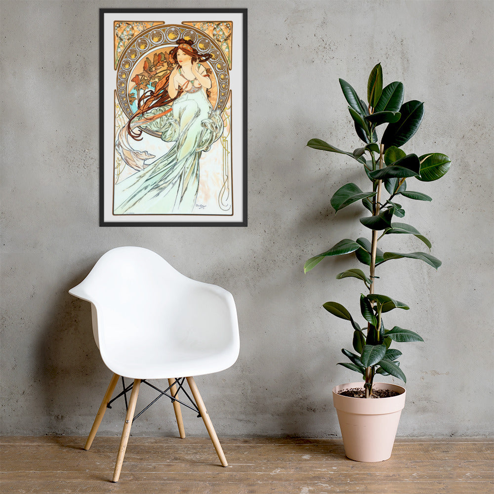 Immerse your space in the lyrical beauty of Art Nouveau with this framed wall print of The Arts, Music by Alphonse Maria Mucha. This captivating illustration features a seated woman in a flowing pale green gown, her long, dark hair cascading like a melody around her. She is encircled by an ornate halo of floral motifs, celestial stars, and decorative patterns that evoke rhythm and harmony. Mucha’s signature style—warm tones, intricate detailing, and ethereal composition—transforms this piece into a visual symphony of grace and serenity.