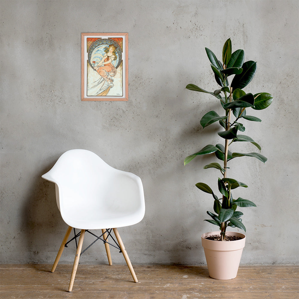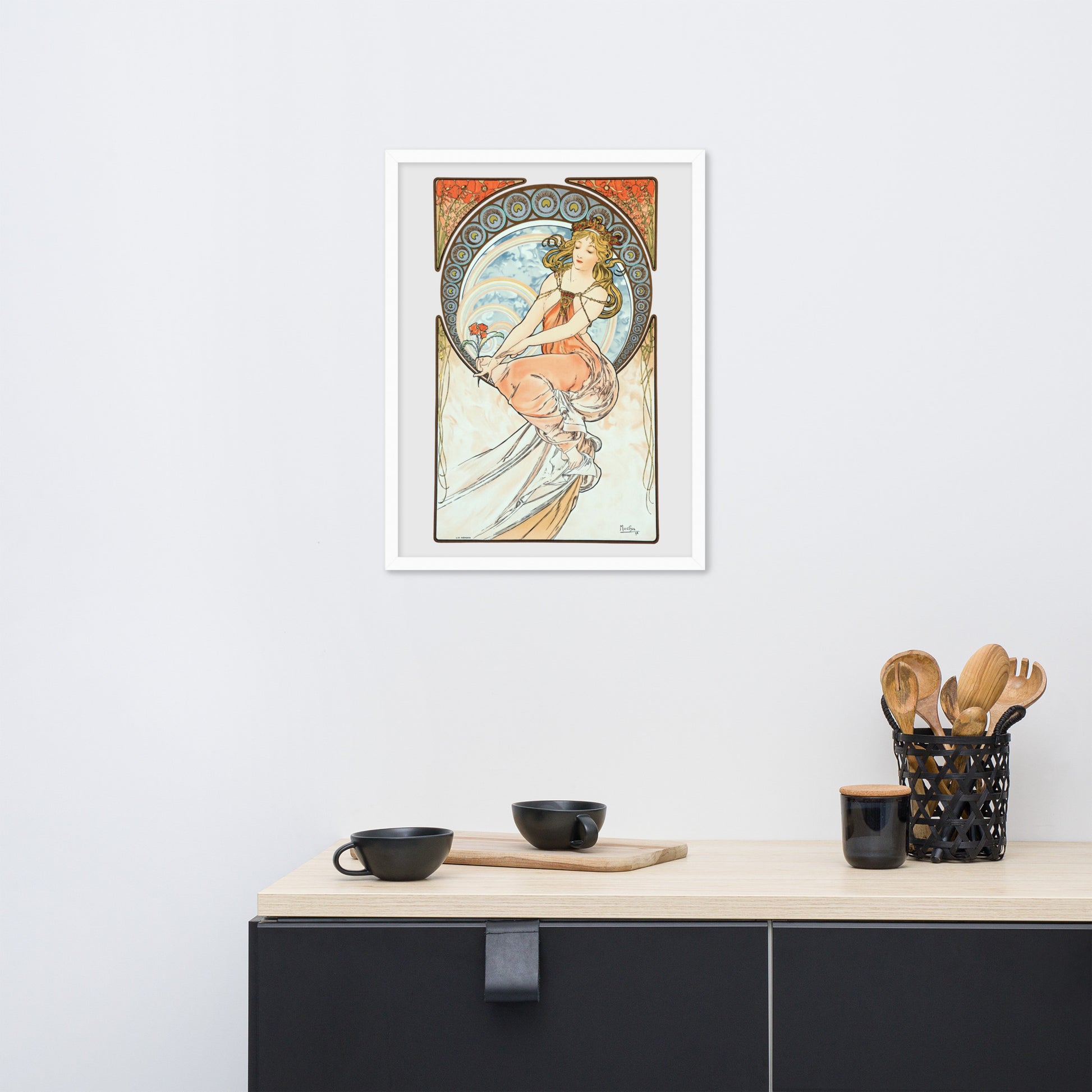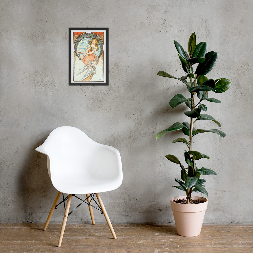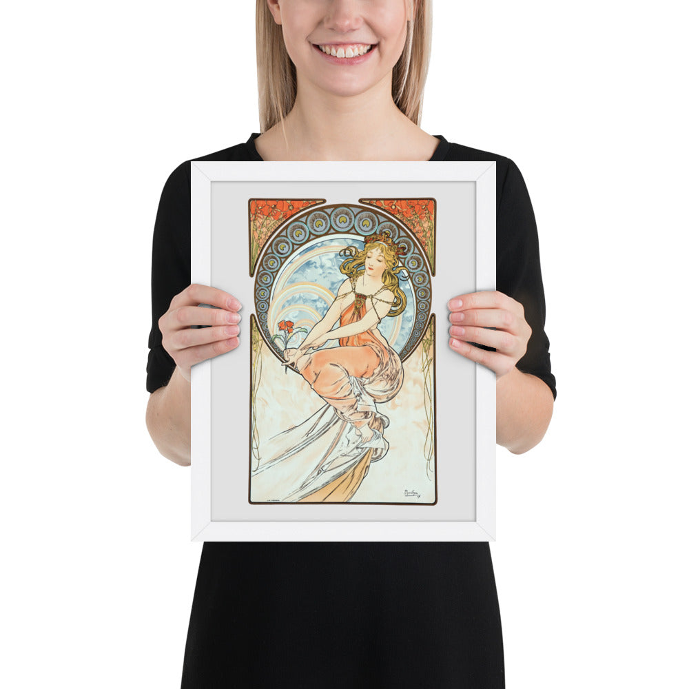 Celebrate the elegance of Art Nouveau with this premium framed wall print of The Arts, Painting by Alphonse Maria Mucha. This iconic illustration features a serene woman seated gracefully, her flowing garments and cascading hair adorned with delicate blossoms. Encircled by an ornate halo of floral motifs and decorative patterns, the composition radiates harmony and refinement. Mucha’s signature style—soft pastels, warm tones, and intricate linework—evokes a timeless sense of beauty and femininity. Perfect for adding a touch of vintage sophistication to your living space, studio, or gallery wall.
