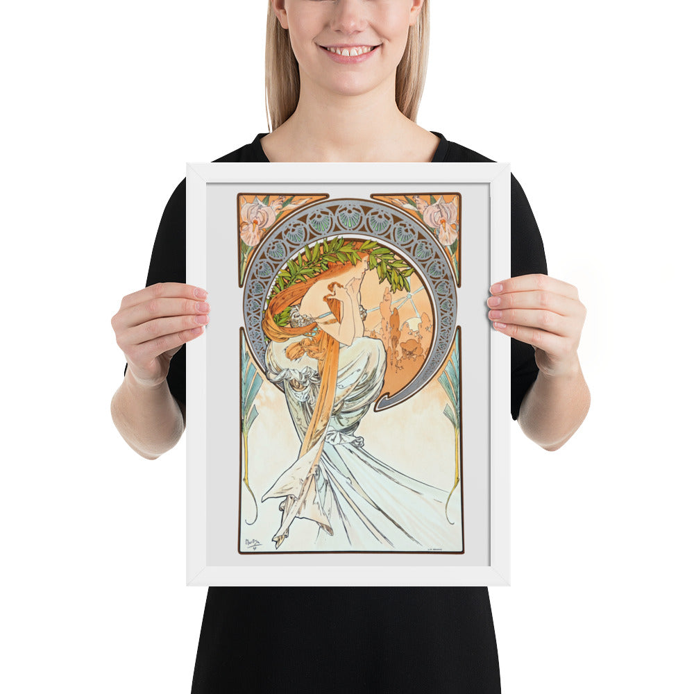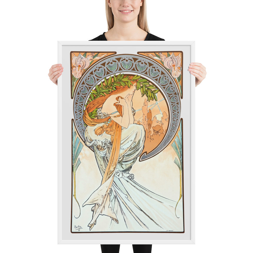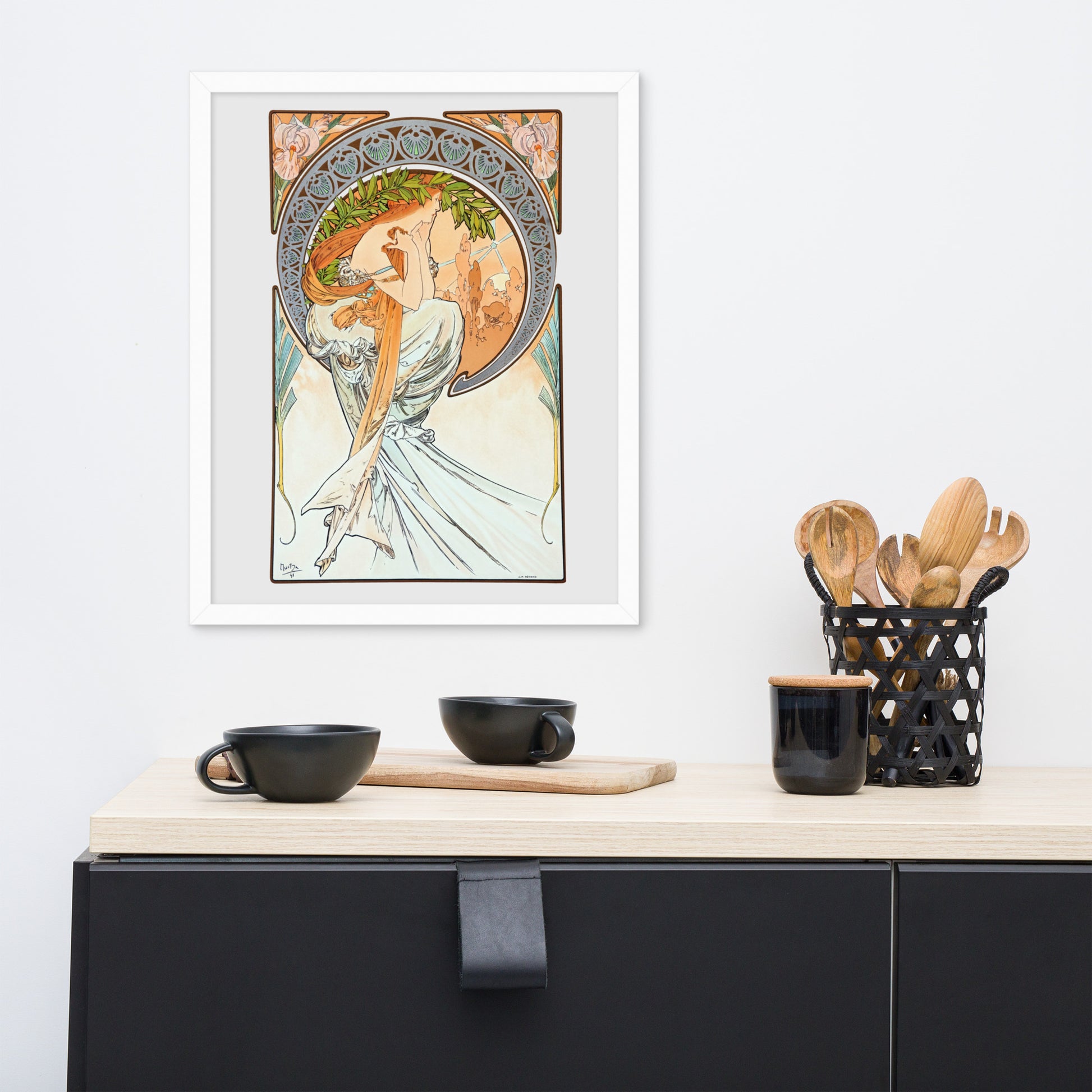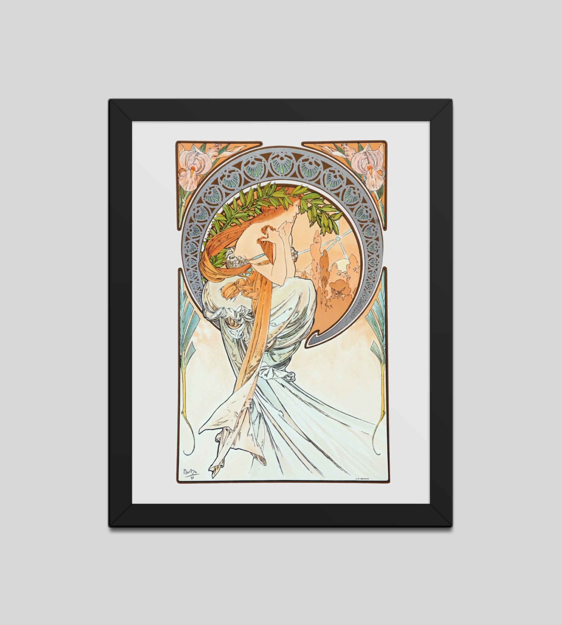 Celebrate the timeless elegance of The Arts, Poetry by Maria Mucha—a captivating framed wall print that embodies the spirit of the Art Nouveau movement. This piece features a graceful woman in a flowing white gown, her vibrant orange hair cascading like firelight as she cradles a lyre-like instrument in a moment of serene reflection. Encircled by a crescent-shaped arch adorned with floral motifs and lush green foliage, she stands against a dreamy backdrop of pastel clouds and soft atmospheric tones. The intricate detailing and harmonious composition evoke themes of beauty, creativity, and poetic inspiration—making this artwork a stunning centerpiece for any space.