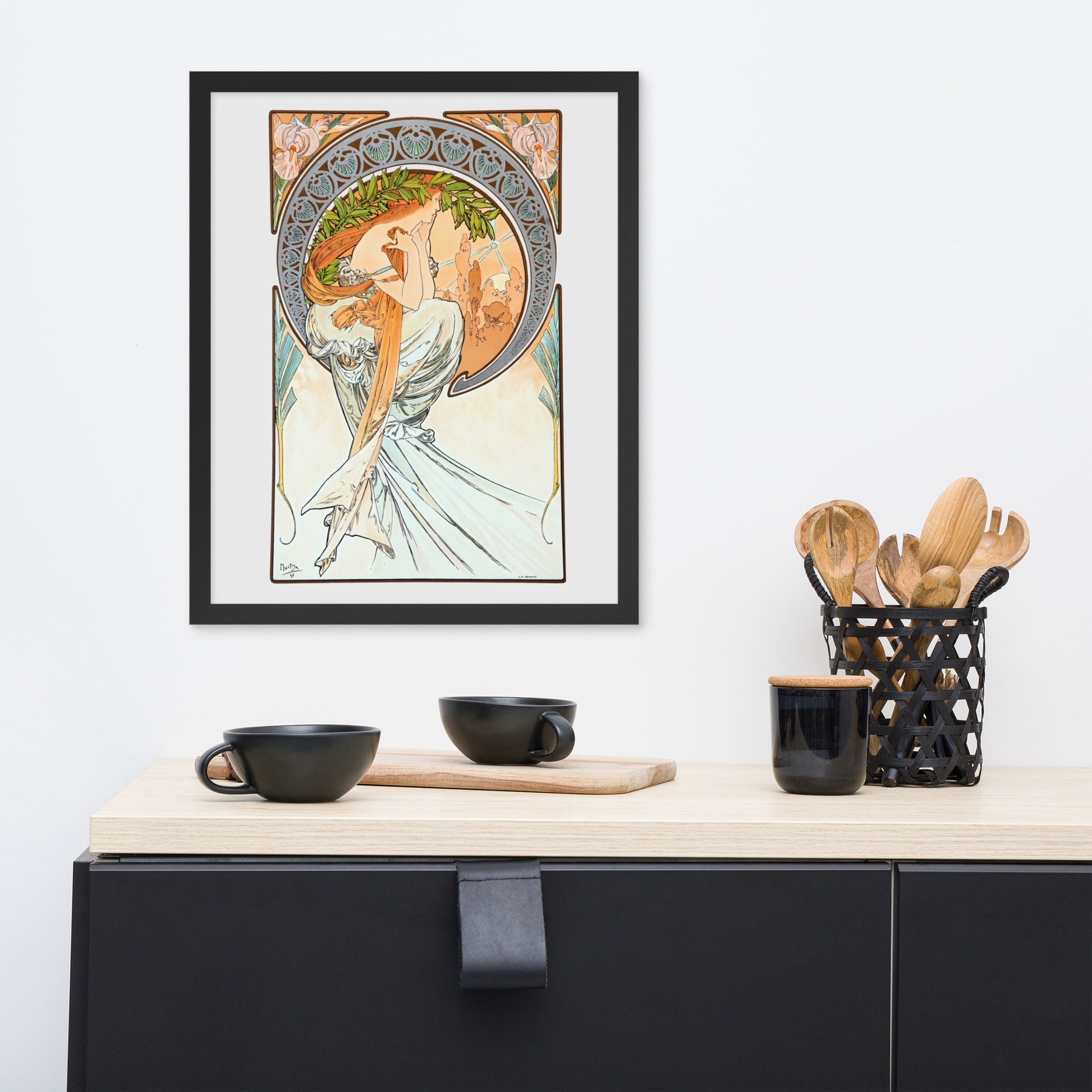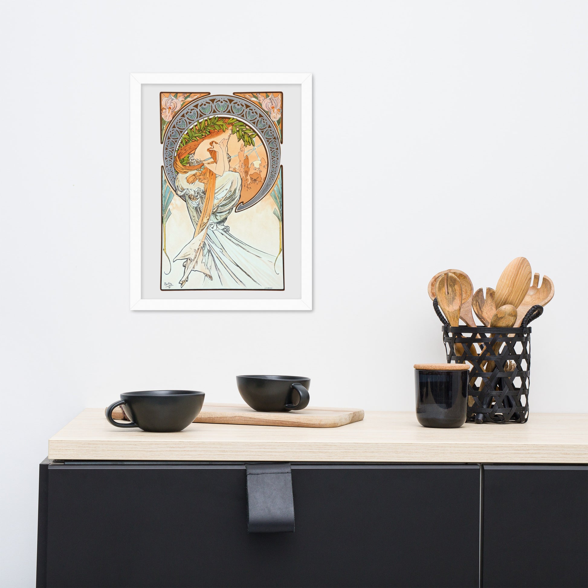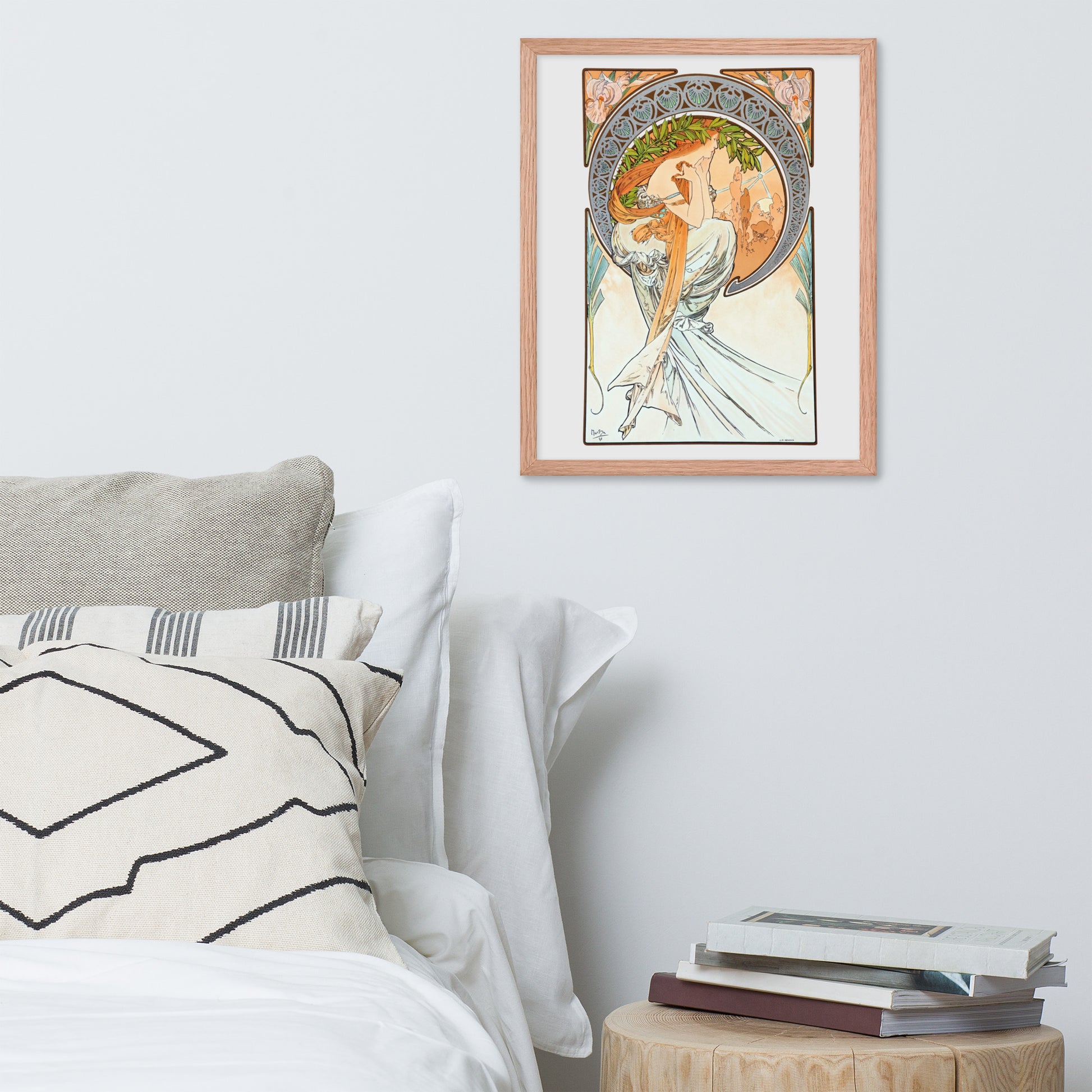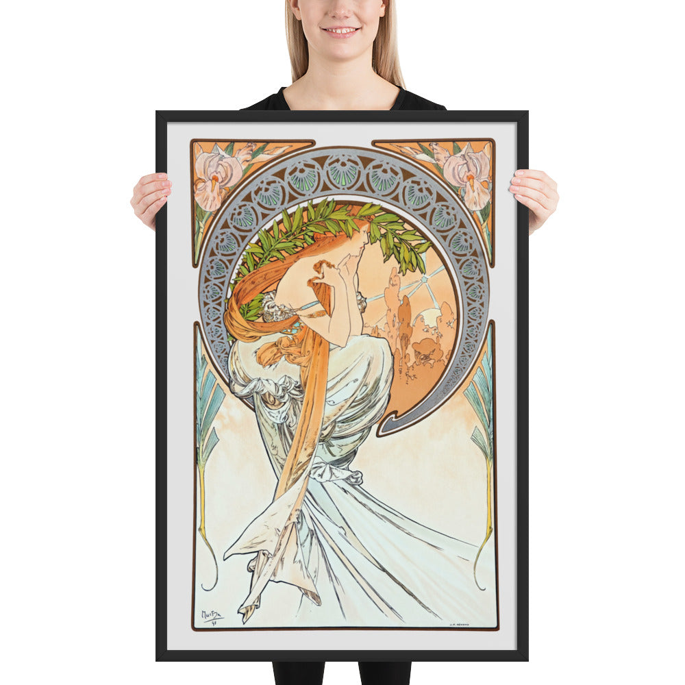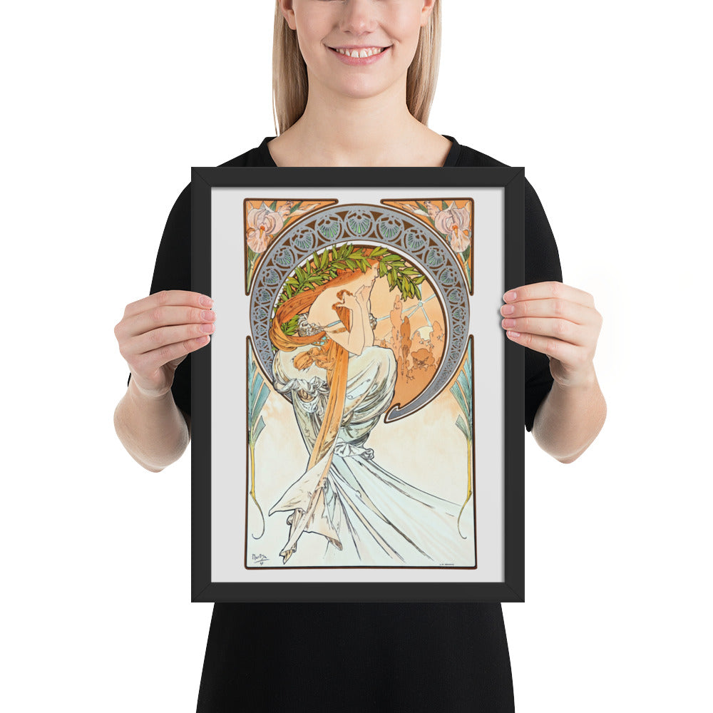 Celebrate the timeless elegance of The Arts, Poetry by Maria Mucha—a captivating framed wall print that embodies the spirit of the Art Nouveau movement. This piece features a graceful woman in a flowing white gown, her vibrant orange hair cascading like firelight as she cradles a lyre-like instrument in a moment of serene reflection. Encircled by a crescent-shaped arch adorned with floral motifs and lush green foliage, she stands against a dreamy backdrop of pastel clouds and soft atmospheric tones. The intricate detailing and harmonious composition evoke themes of beauty, creativity, and poetic inspiration—making this artwork a stunning centerpiece for any space.