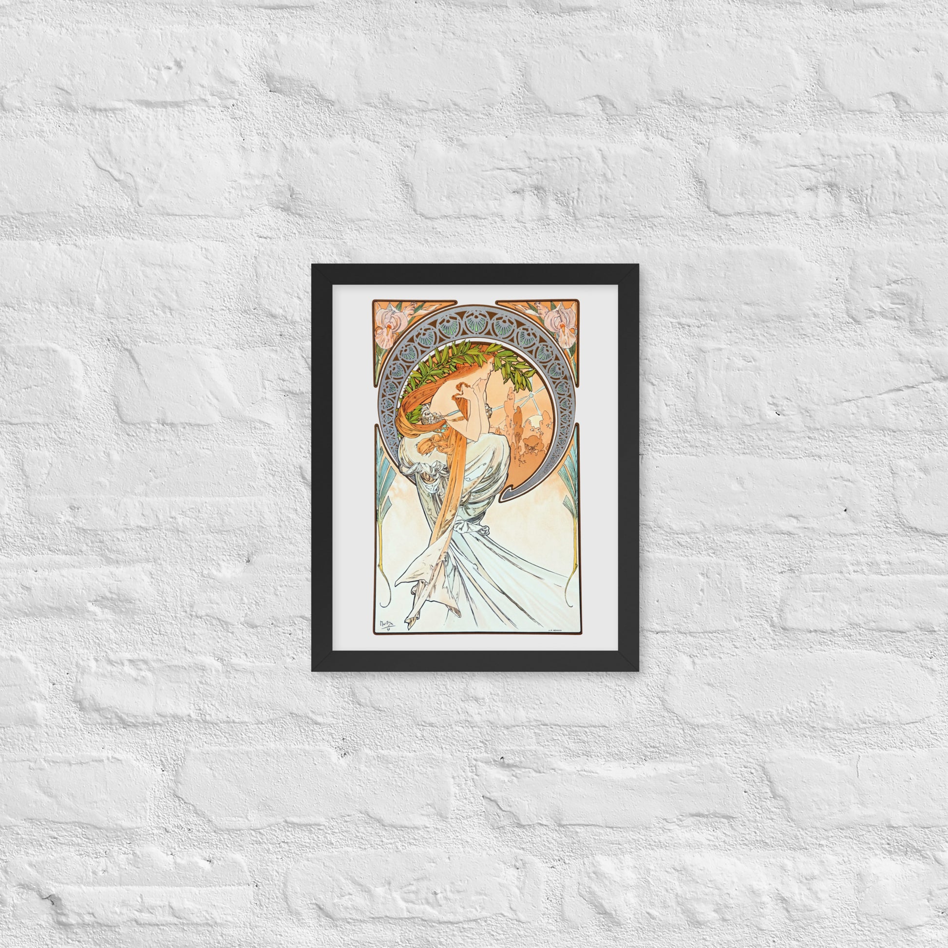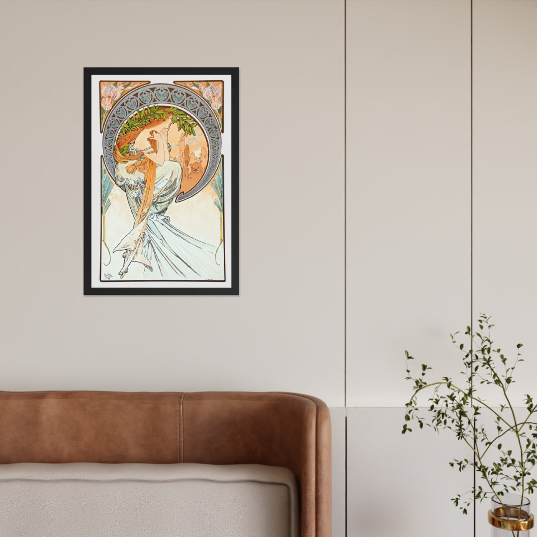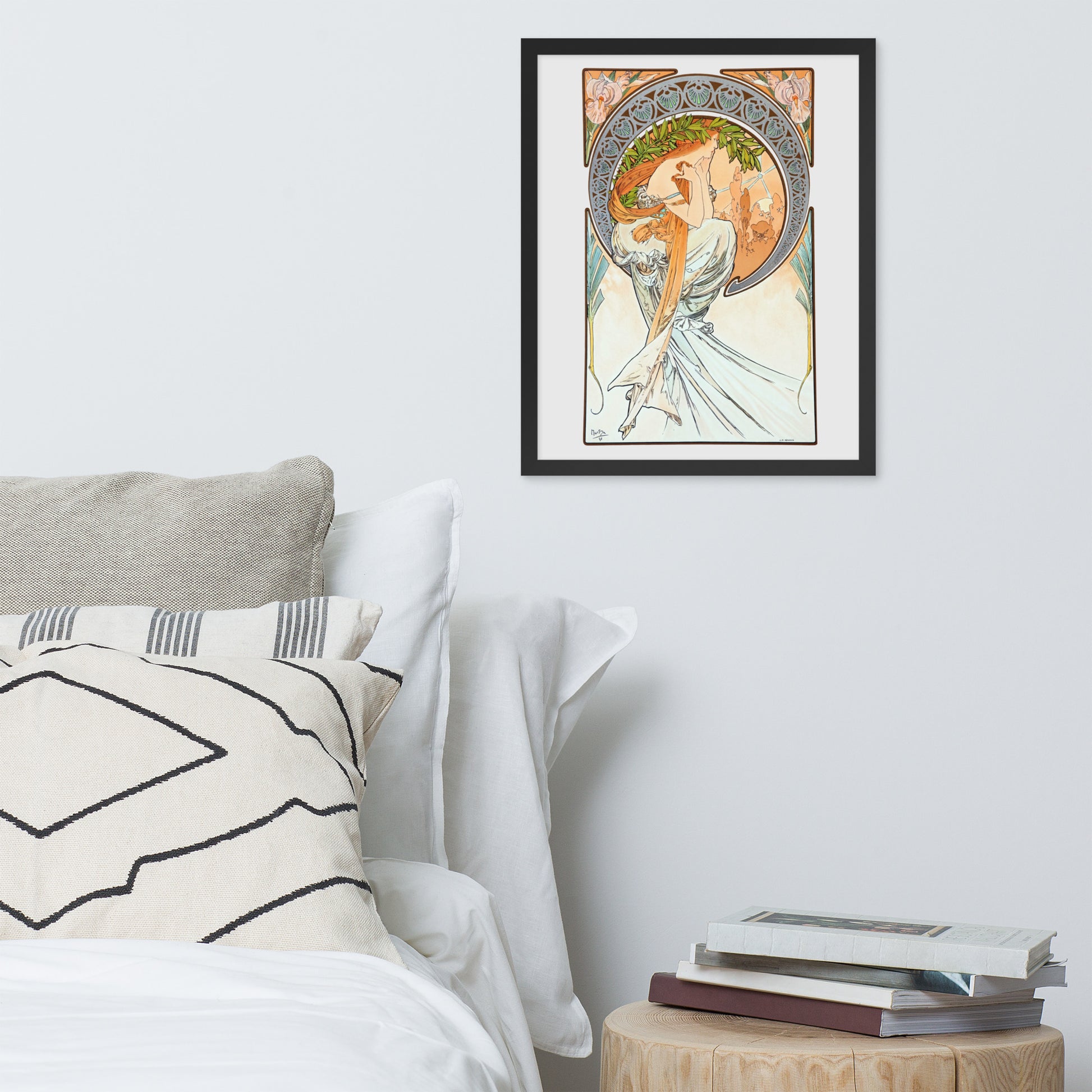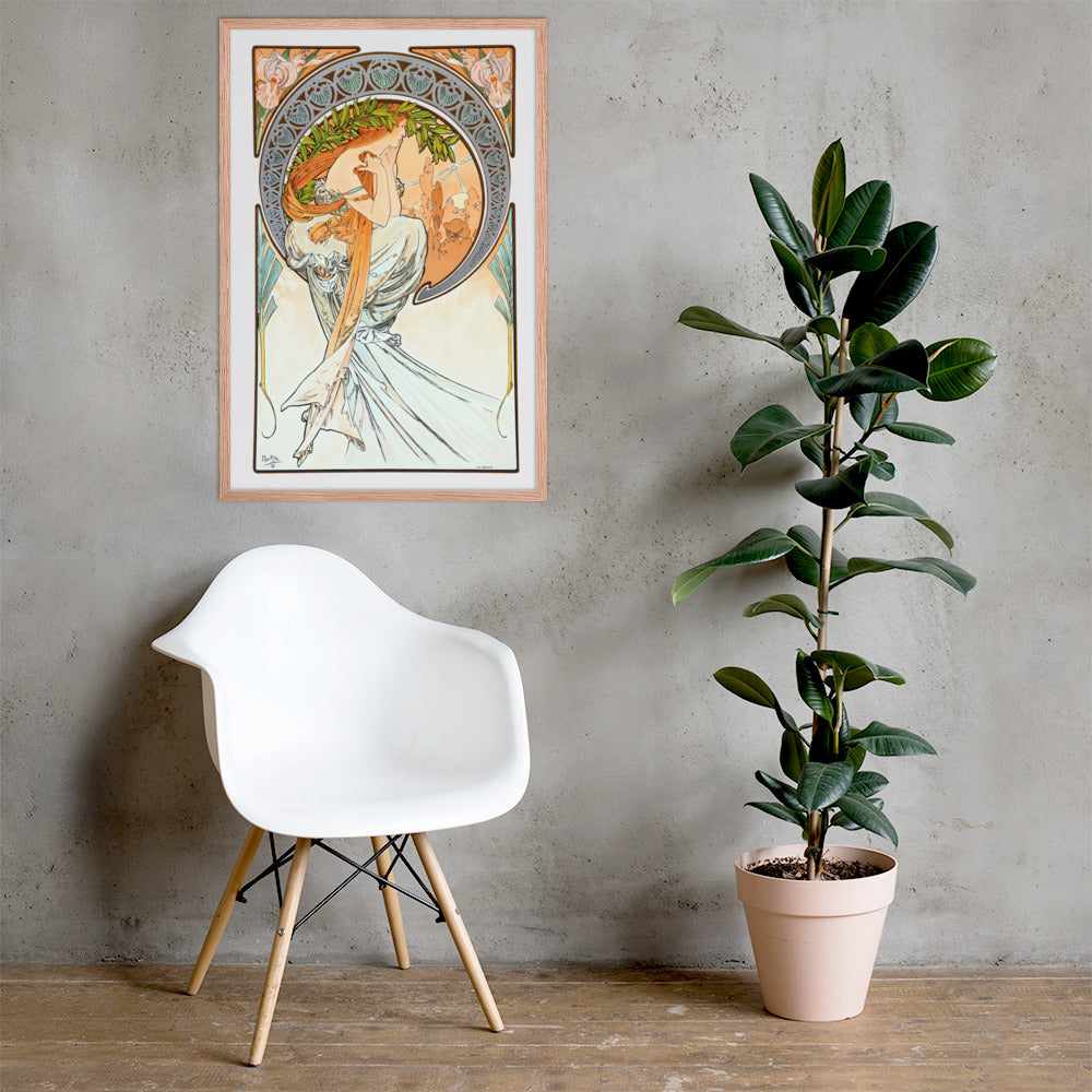 Celebrate the timeless elegance of The Arts, Poetry by Maria Mucha—a captivating framed wall print that embodies the spirit of the Art Nouveau movement. This piece features a graceful woman in a flowing white gown, her vibrant orange hair cascading like firelight as she cradles a lyre-like instrument in a moment of serene reflection. Encircled by a crescent-shaped arch adorned with floral motifs and lush green foliage, she stands against a dreamy backdrop of pastel clouds and soft atmospheric tones. The intricate detailing and harmonious composition evoke themes of beauty, creativity, and poetic inspiration—making this artwork a stunning centerpiece for any space.