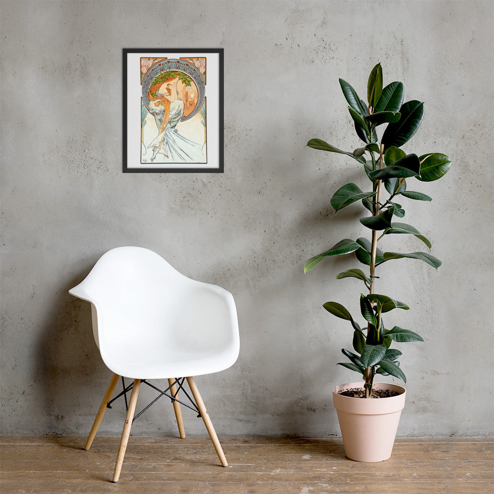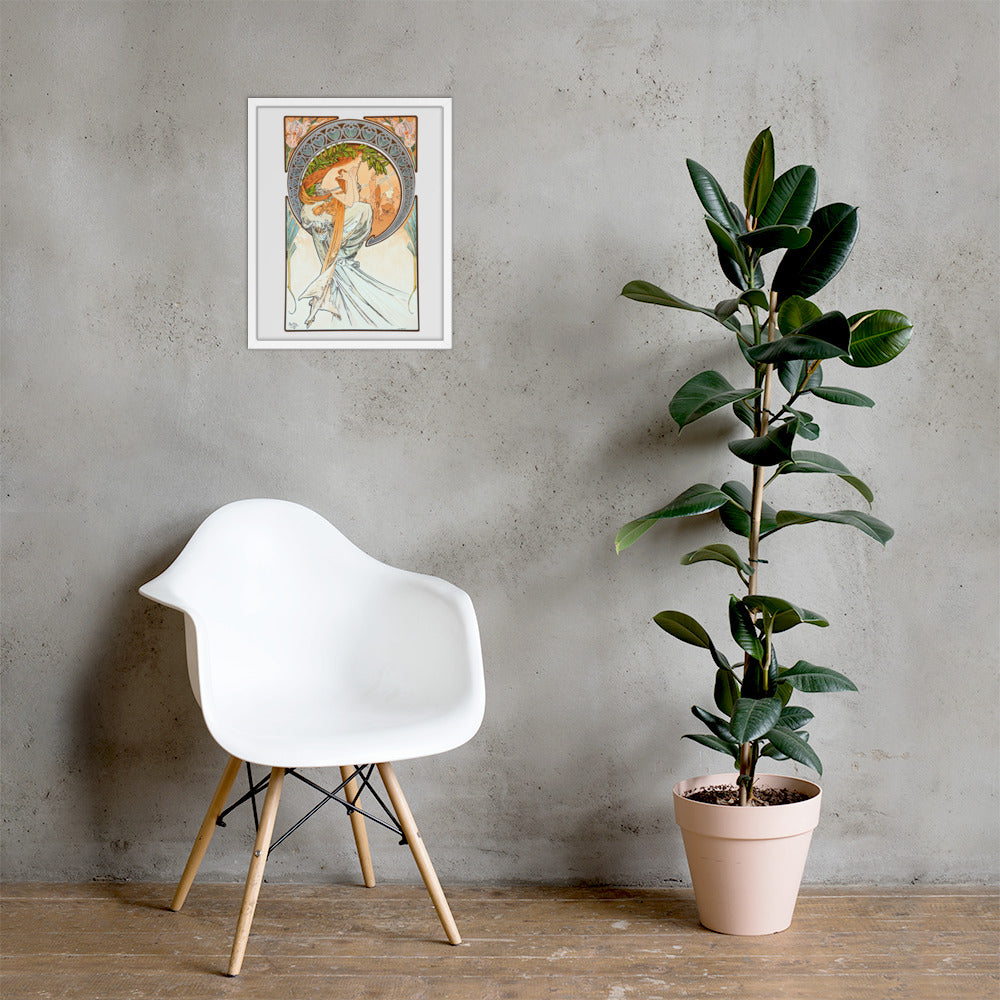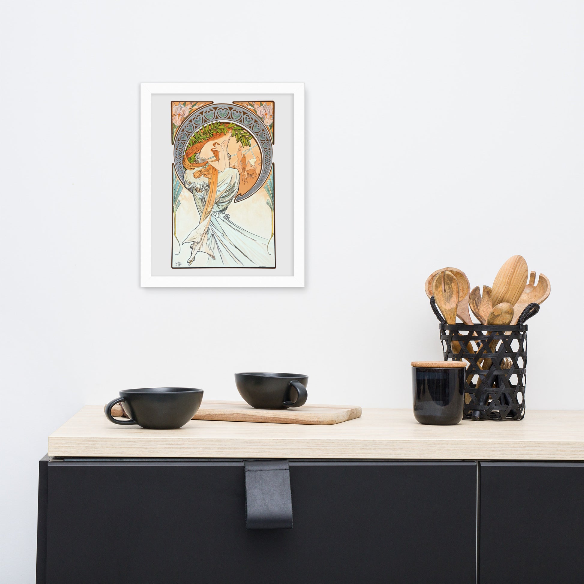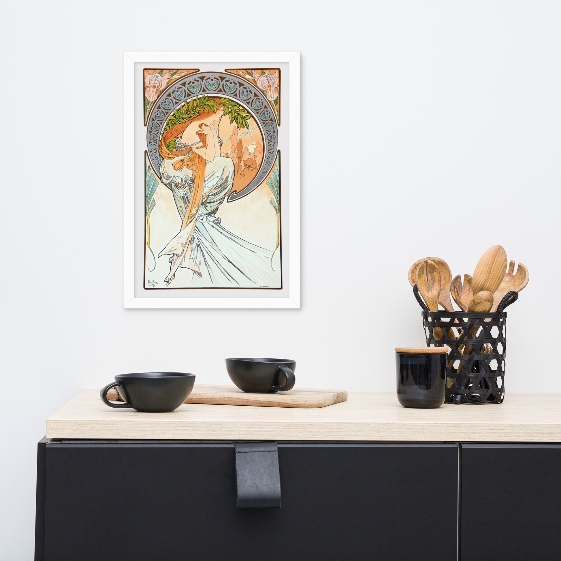 Celebrate the timeless elegance of The Arts, Poetry by Maria Mucha—a captivating framed wall print that embodies the spirit of the Art Nouveau movement. This piece features a graceful woman in a flowing white gown, her vibrant orange hair cascading like firelight as she cradles a lyre-like instrument in a moment of serene reflection. Encircled by a crescent-shaped arch adorned with floral motifs and lush green foliage, she stands against a dreamy backdrop of pastel clouds and soft atmospheric tones. The intricate detailing and harmonious composition evoke themes of beauty, creativity, and poetic inspiration—making this artwork a stunning centerpiece for any space.
