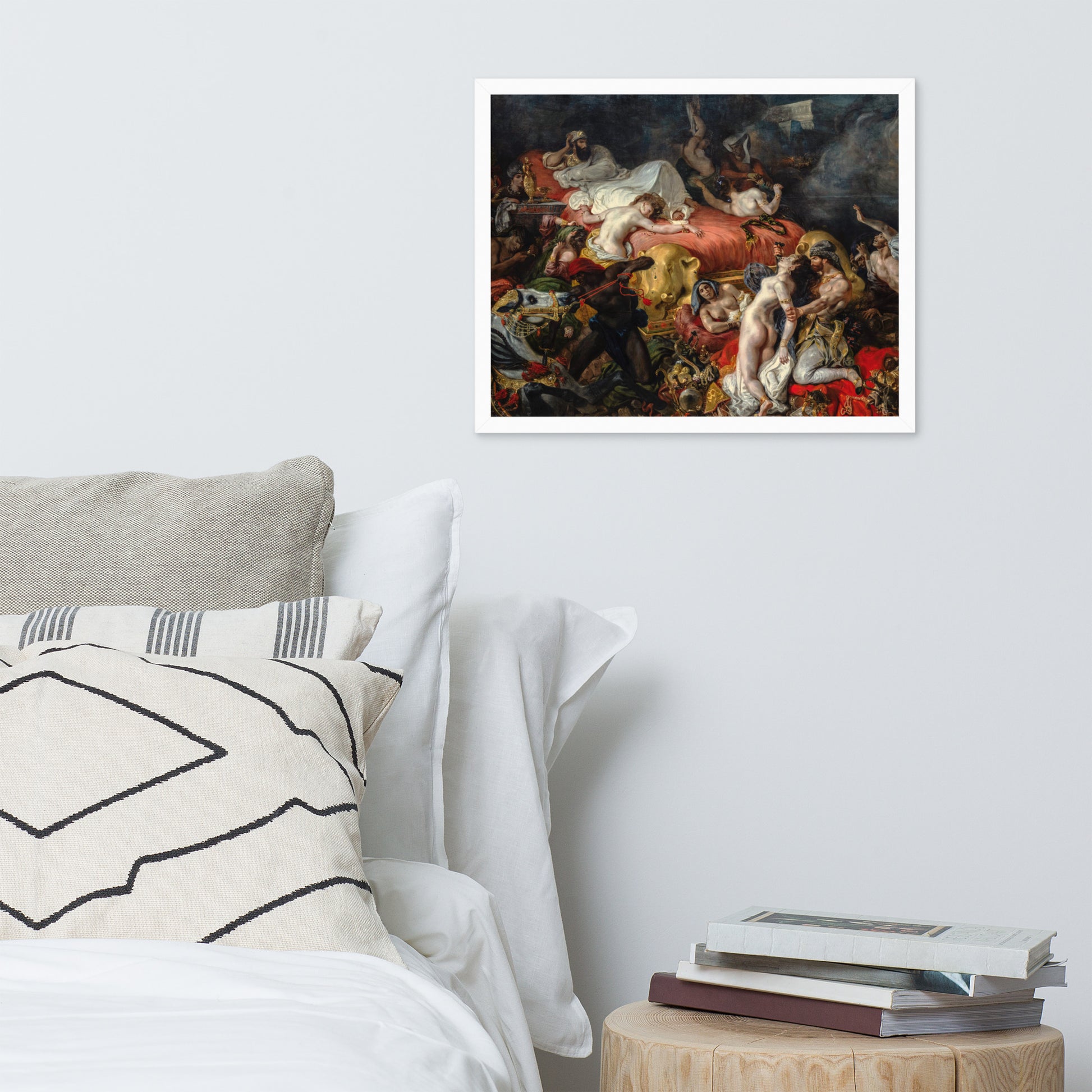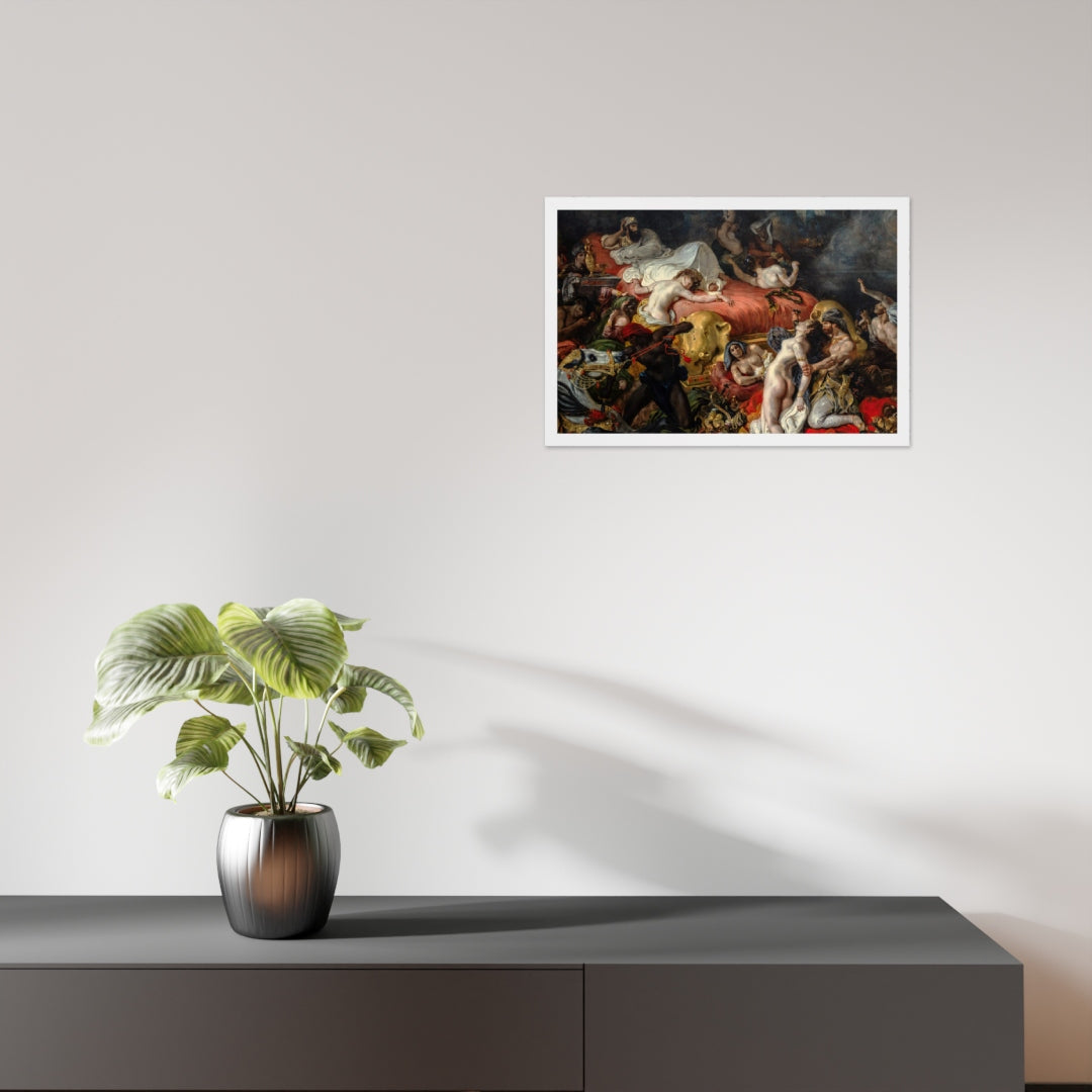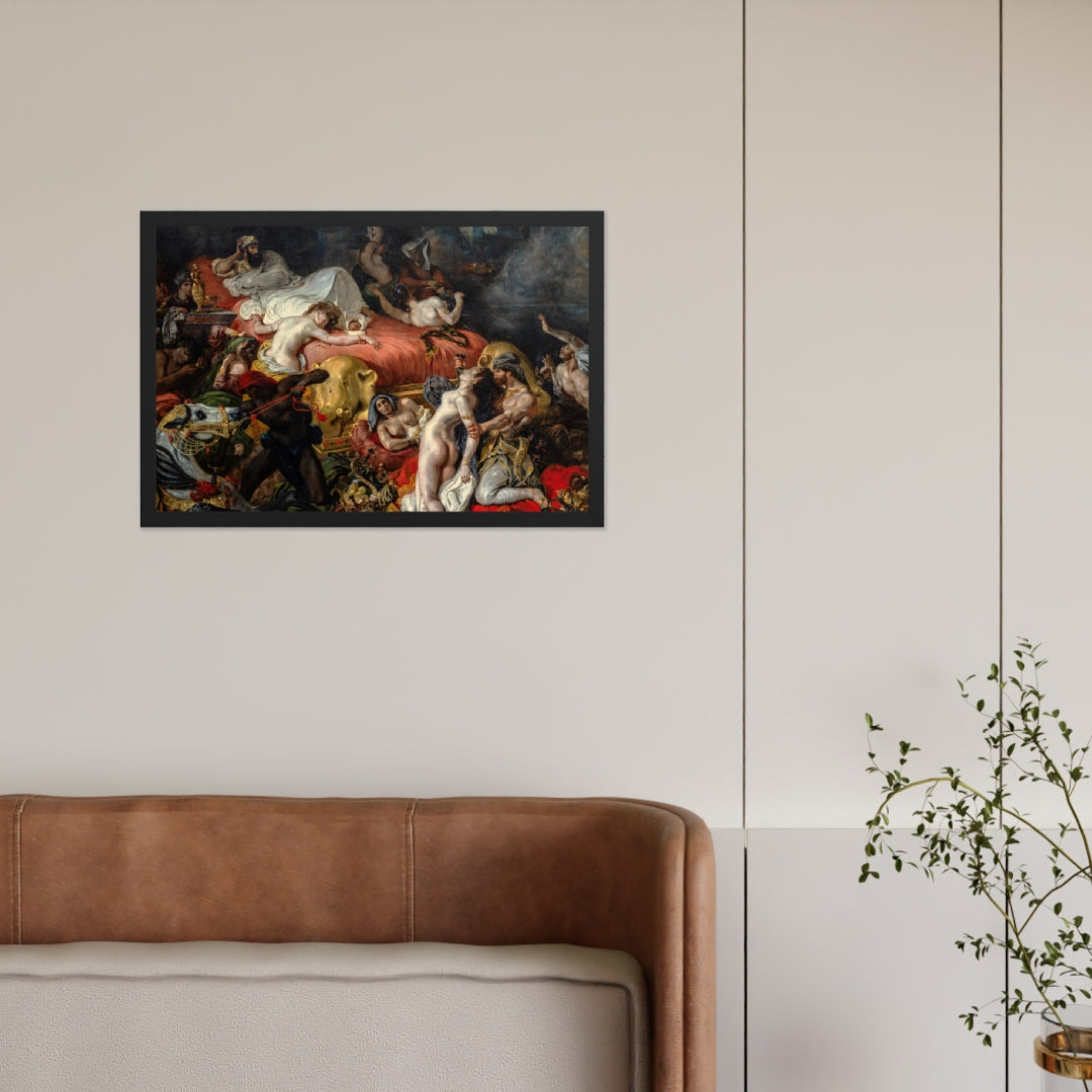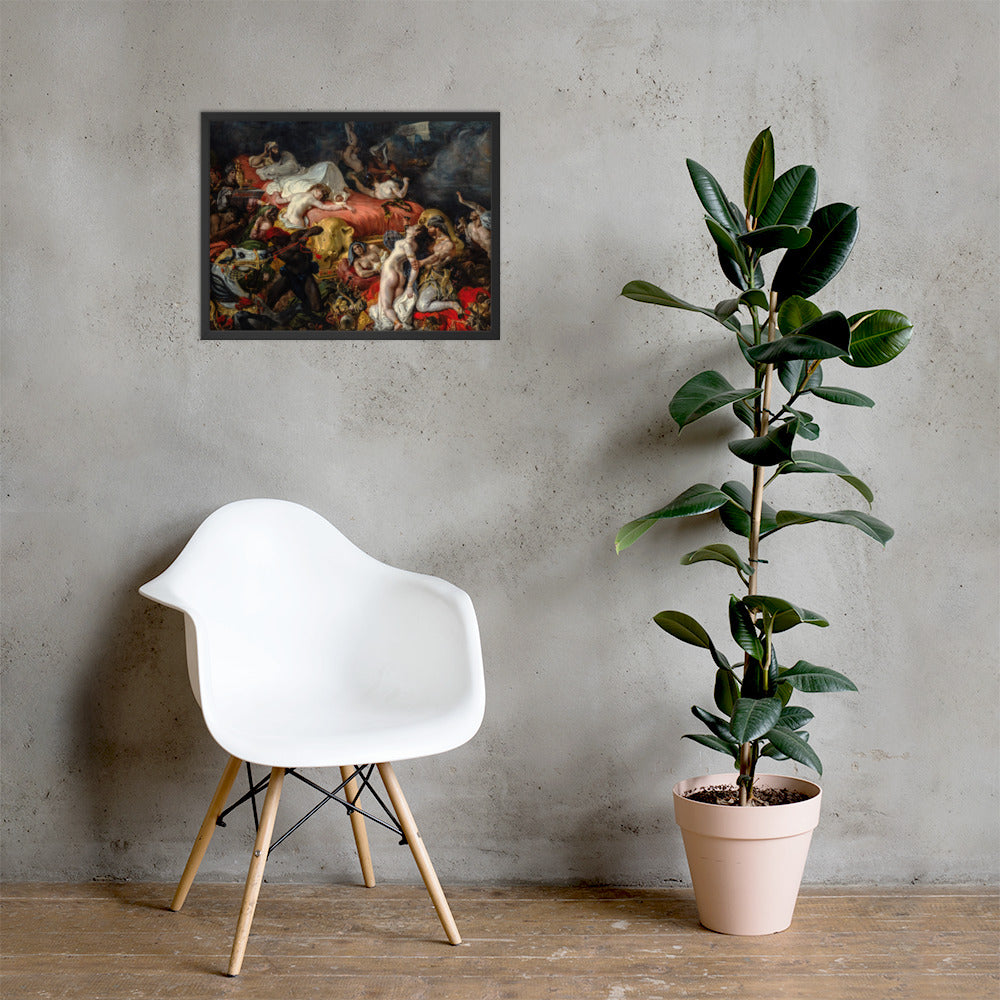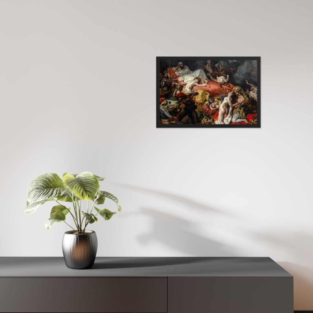 Step into the fevered imagination of Romanticism with The Death of Sardanapalus by Eugène Delacroix—a tempest of color, emotion, and mythic collapse. This framed wall print captures the infamous Assyrian king’s final act of defiance, surrounded by opulence, worship, and destruction. At the heart of the composition lies a golden bull atop crimson cloth, symbolizing both divine indulgence and moral decay, while nude and anguished figures swirl in a chaotic ballet of ecstasy and despair.