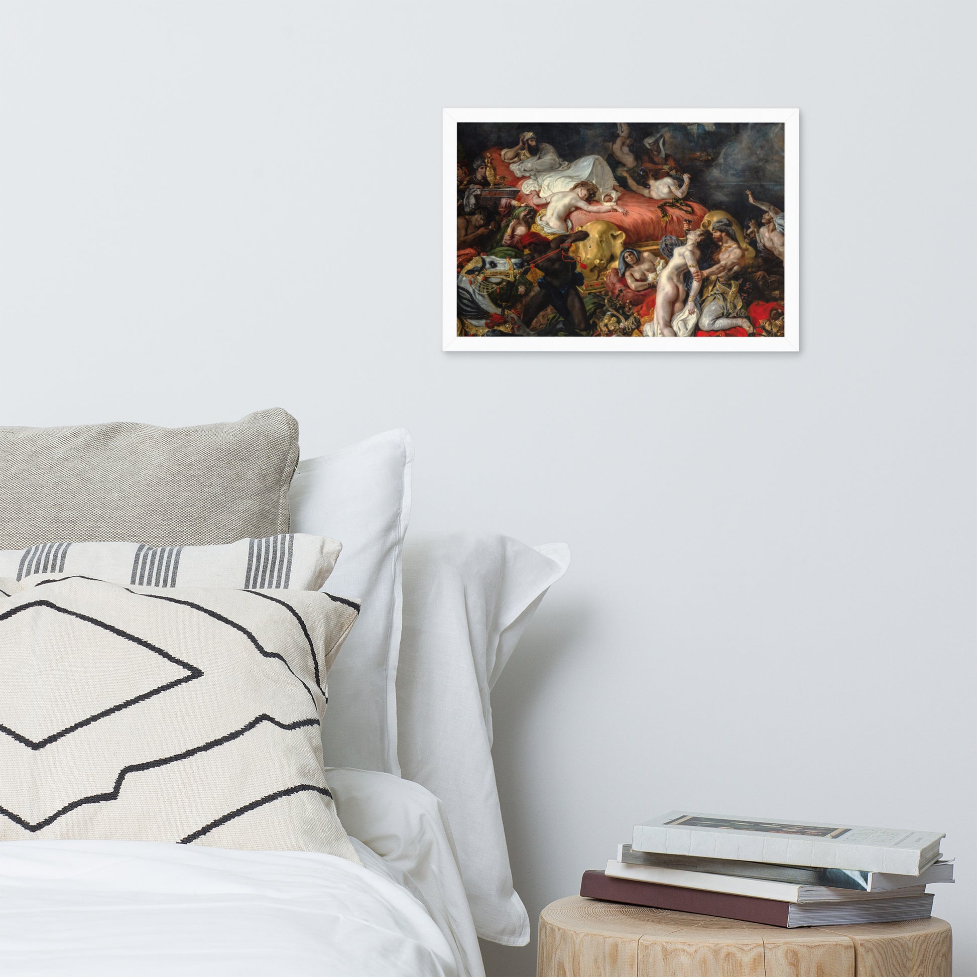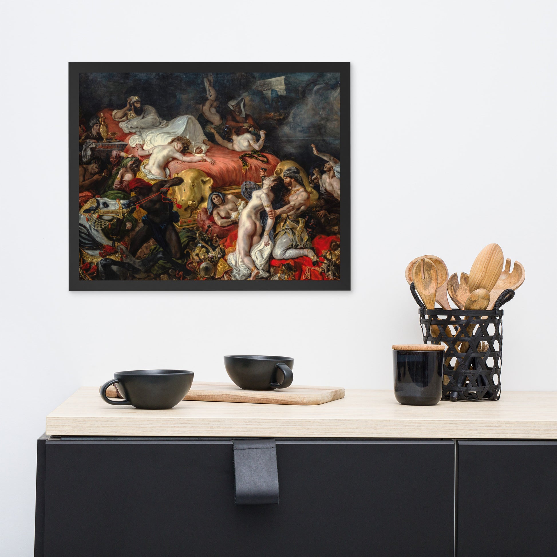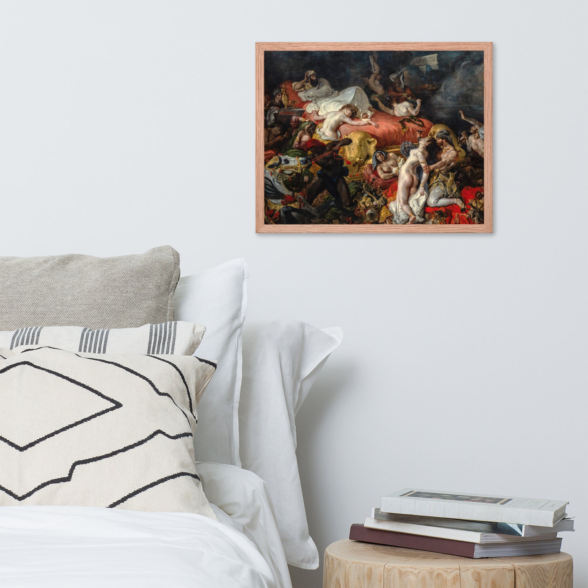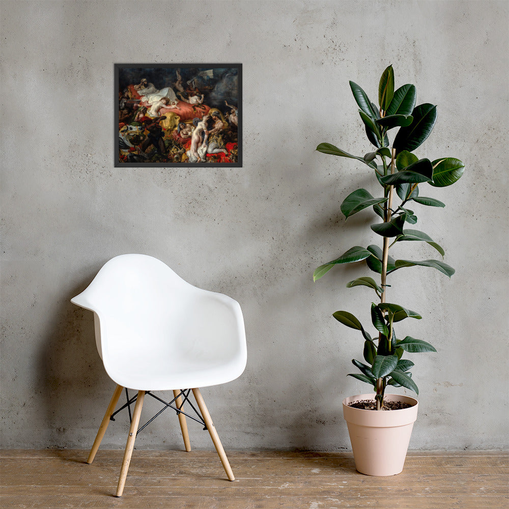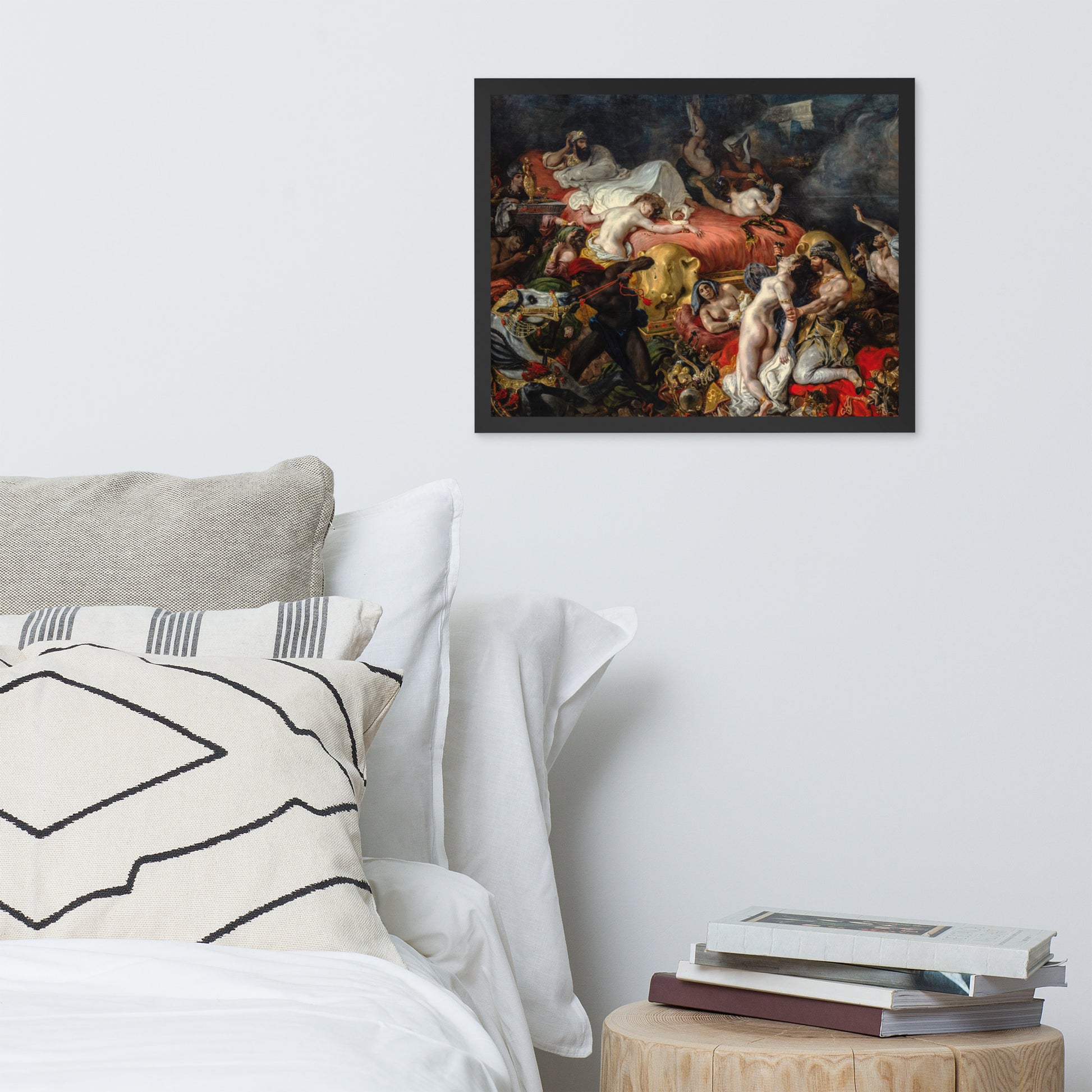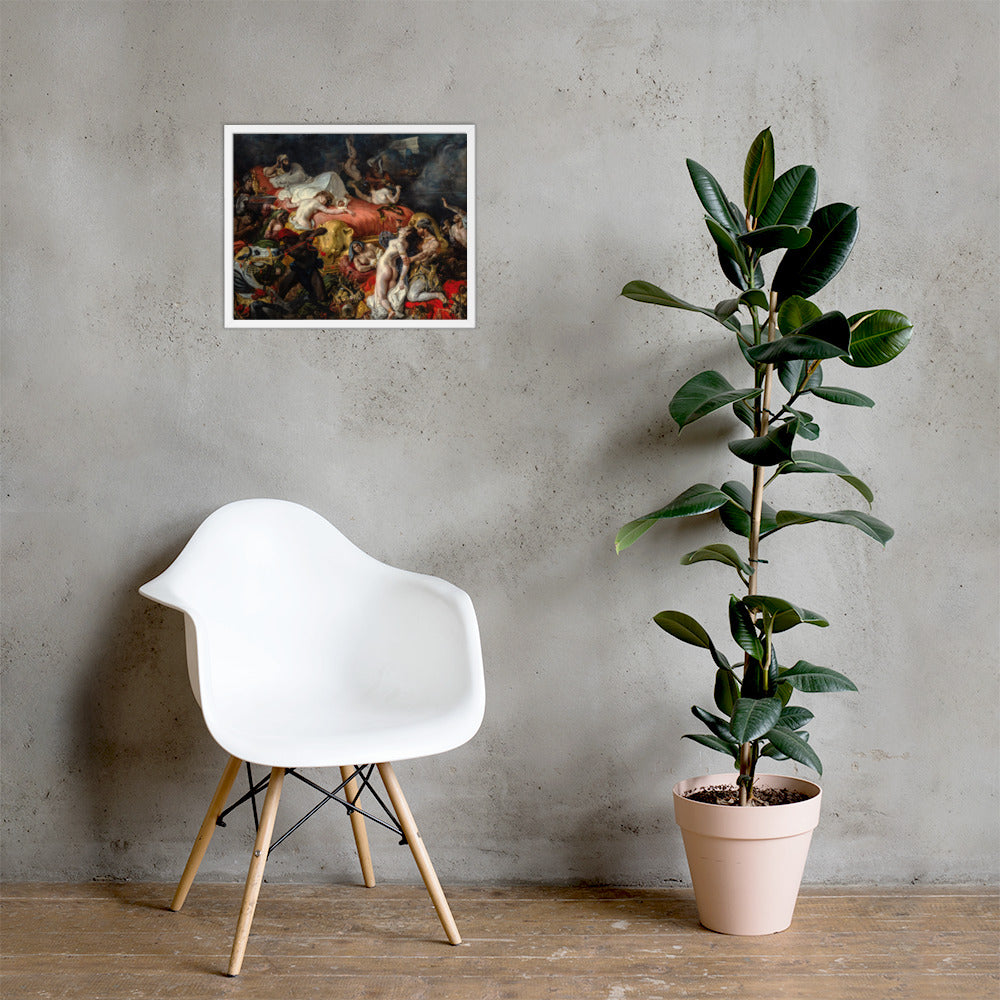 Step into the fevered imagination of Romanticism with The Death of Sardanapalus by Eugène Delacroix—a tempest of color, emotion, and mythic collapse. This framed wall print captures the infamous Assyrian king’s final act of defiance, surrounded by opulence, worship, and destruction. At the heart of the composition lies a golden bull atop crimson cloth, symbolizing both divine indulgence and moral decay, while nude and anguished figures swirl in a chaotic ballet of ecstasy and despair.
