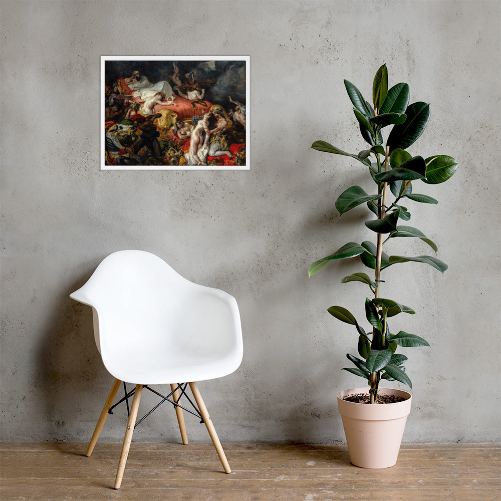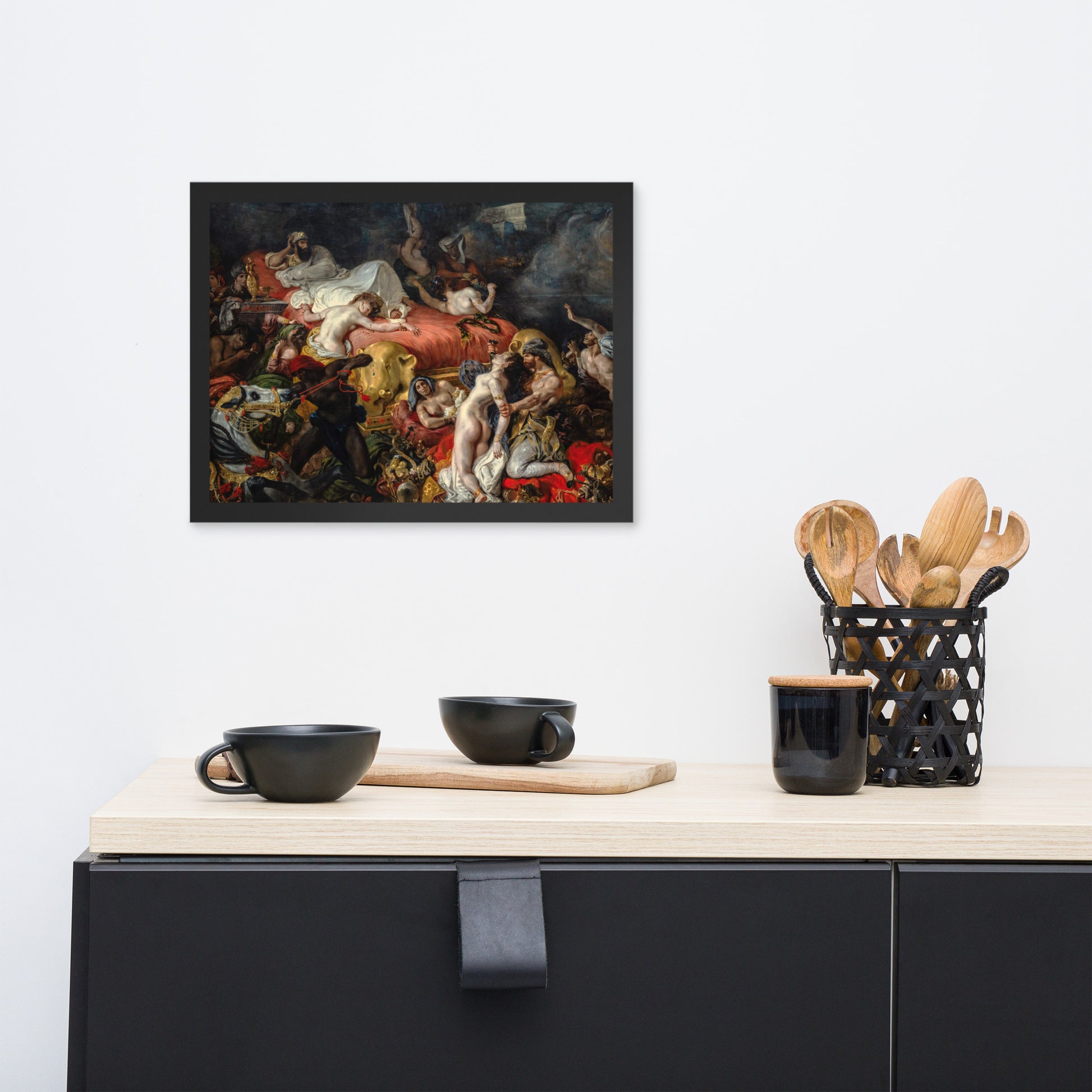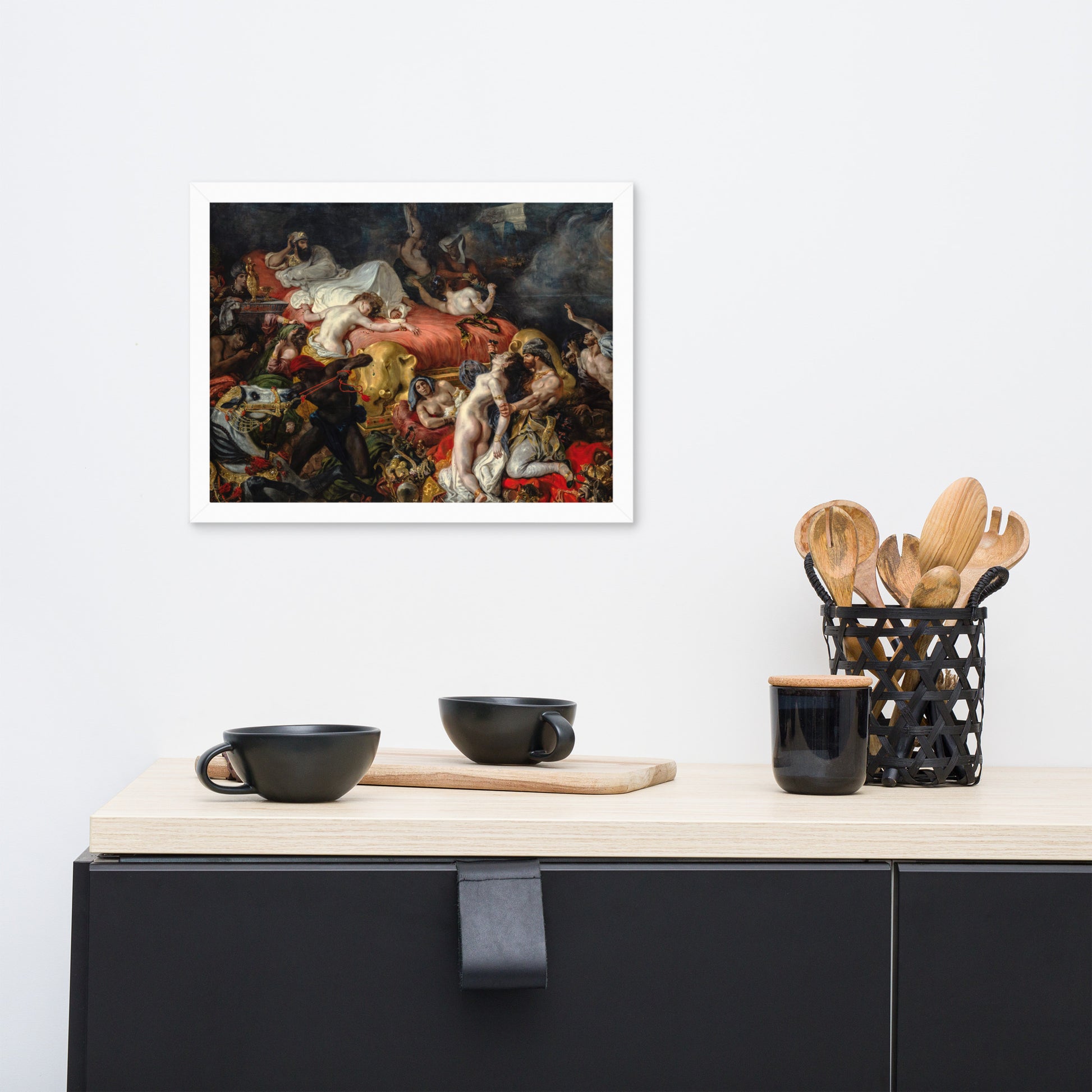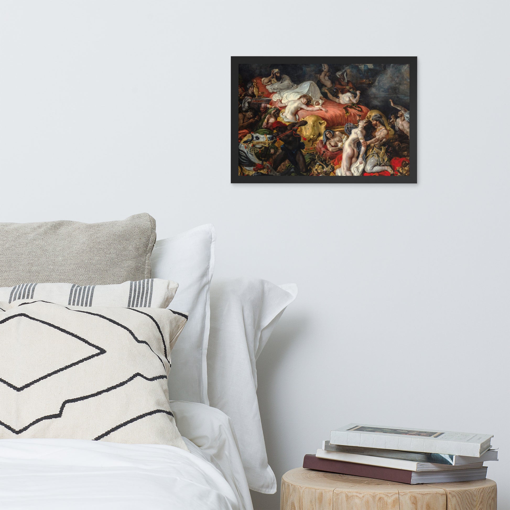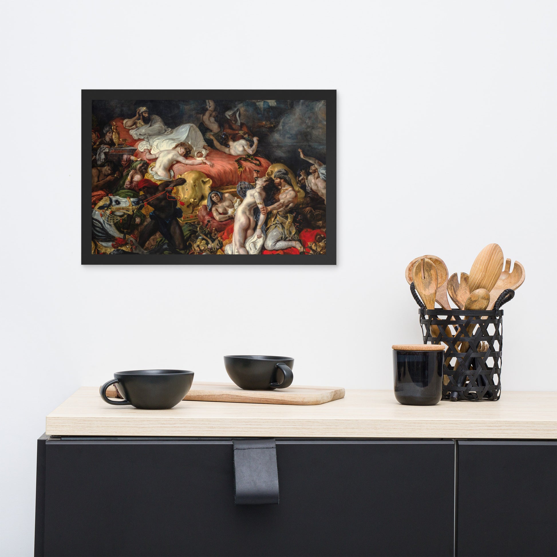 Step into the fevered imagination of Romanticism with The Death of Sardanapalus by Eugène Delacroix—a tempest of color, emotion, and mythic collapse. This framed wall print captures the infamous Assyrian king’s final act of defiance, surrounded by opulence, worship, and destruction. At the heart of the composition lies a golden bull atop crimson cloth, symbolizing both divine indulgence and moral decay, while nude and anguished figures swirl in a chaotic ballet of ecstasy and despair.