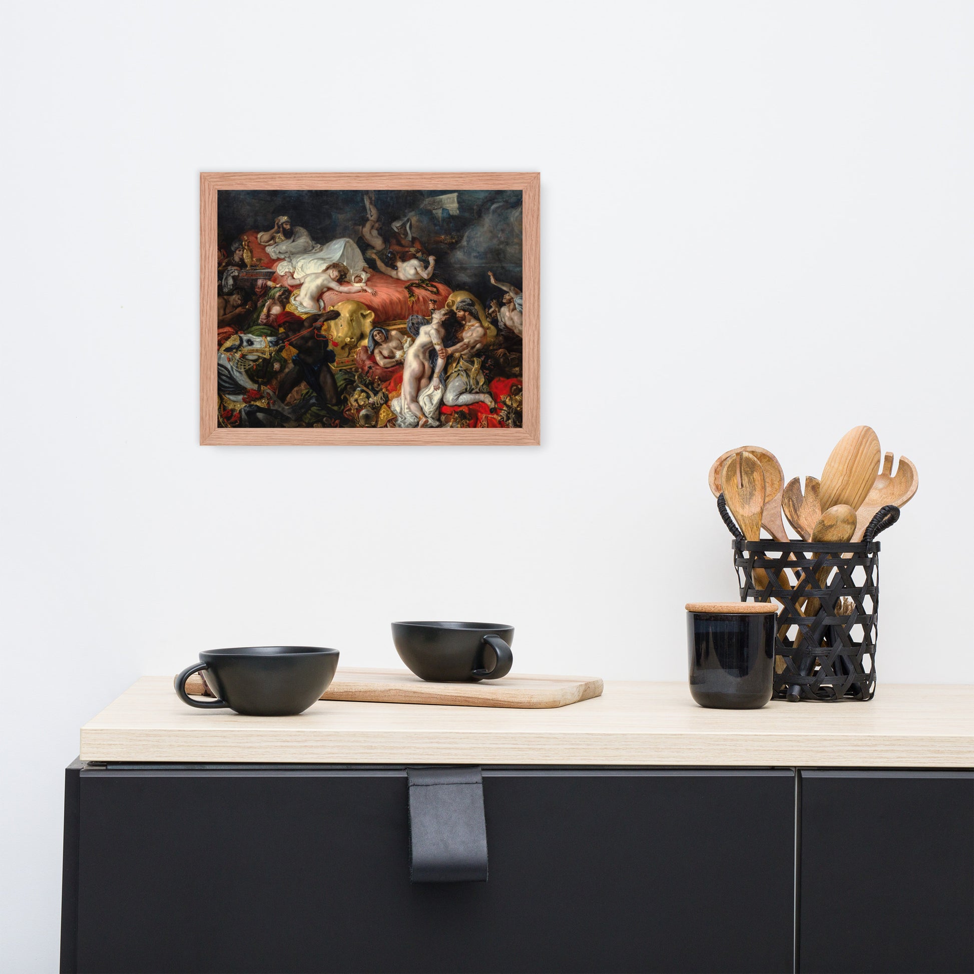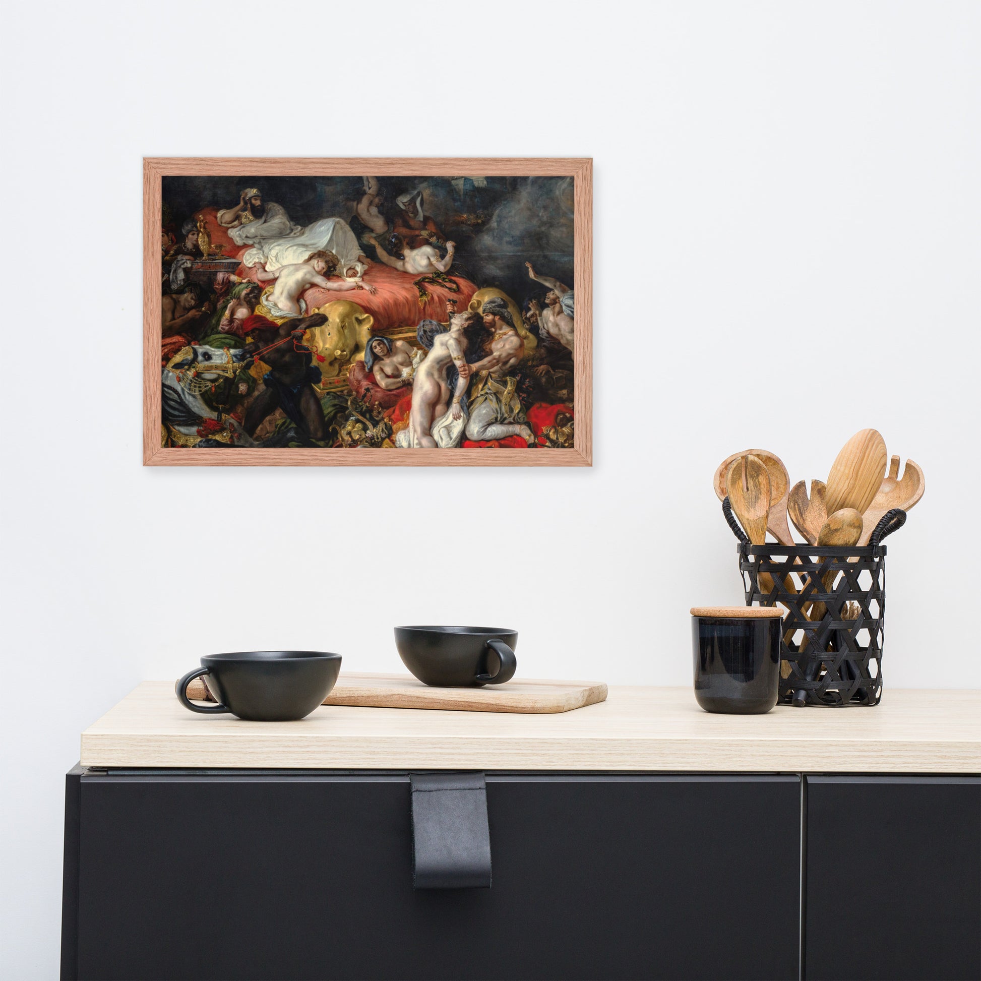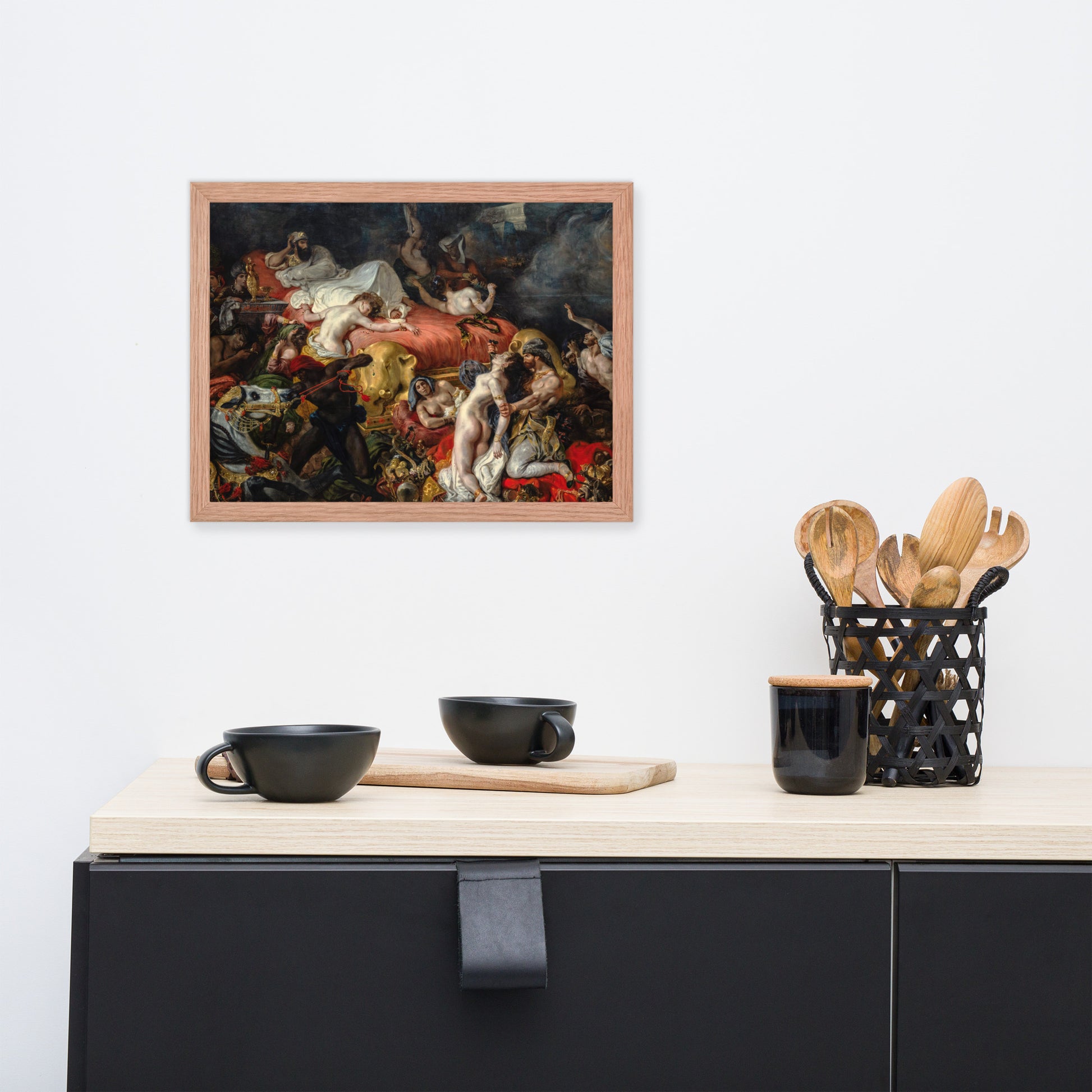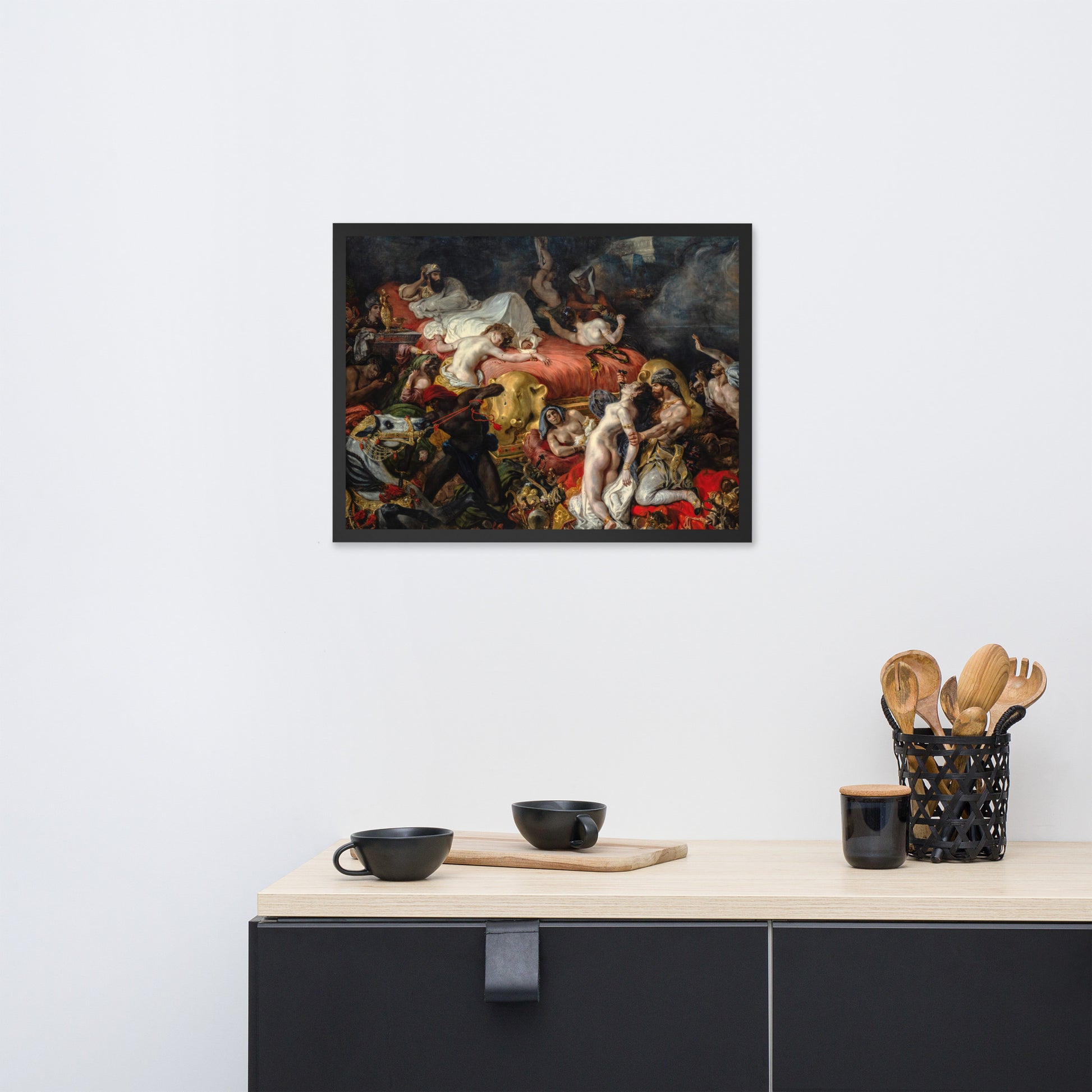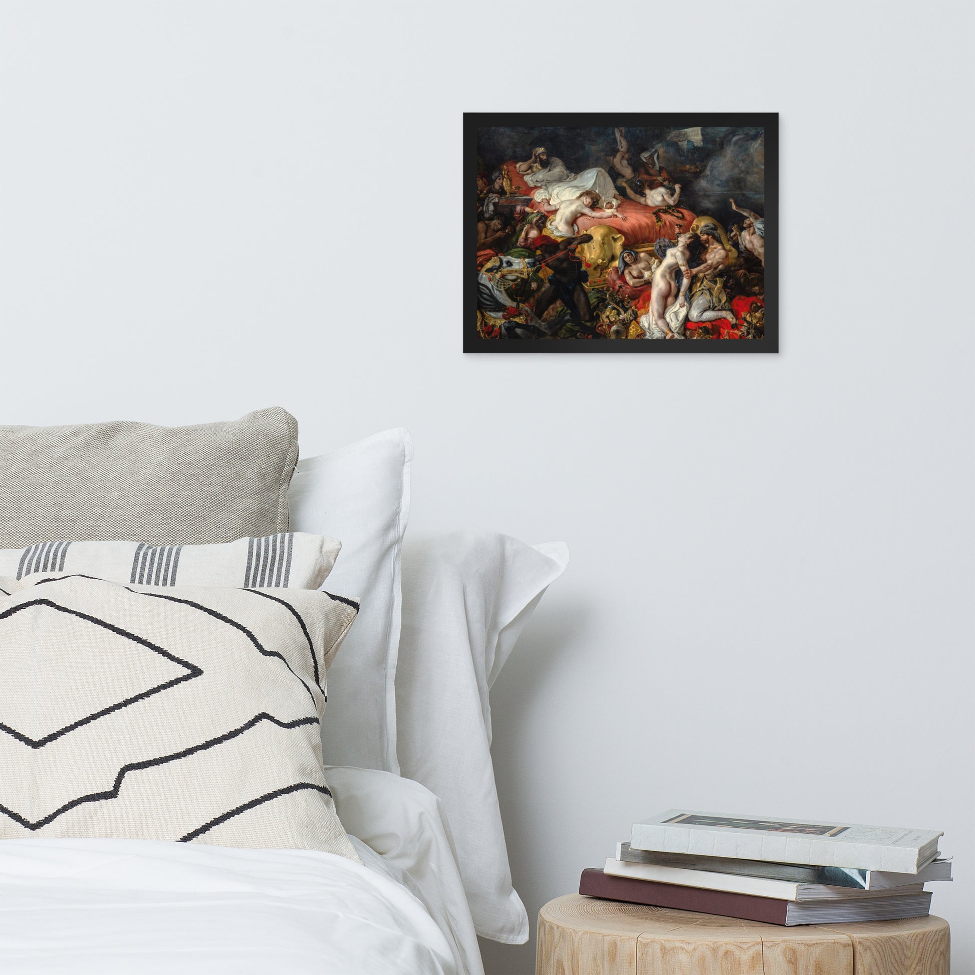 Step into the fevered imagination of Romanticism with The Death of Sardanapalus by Eugène Delacroix—a tempest of color, emotion, and mythic collapse. This framed wall print captures the infamous Assyrian king’s final act of defiance, surrounded by opulence, worship, and destruction. At the heart of the composition lies a golden bull atop crimson cloth, symbolizing both divine indulgence and moral decay, while nude and anguished figures swirl in a chaotic ballet of ecstasy and despair.