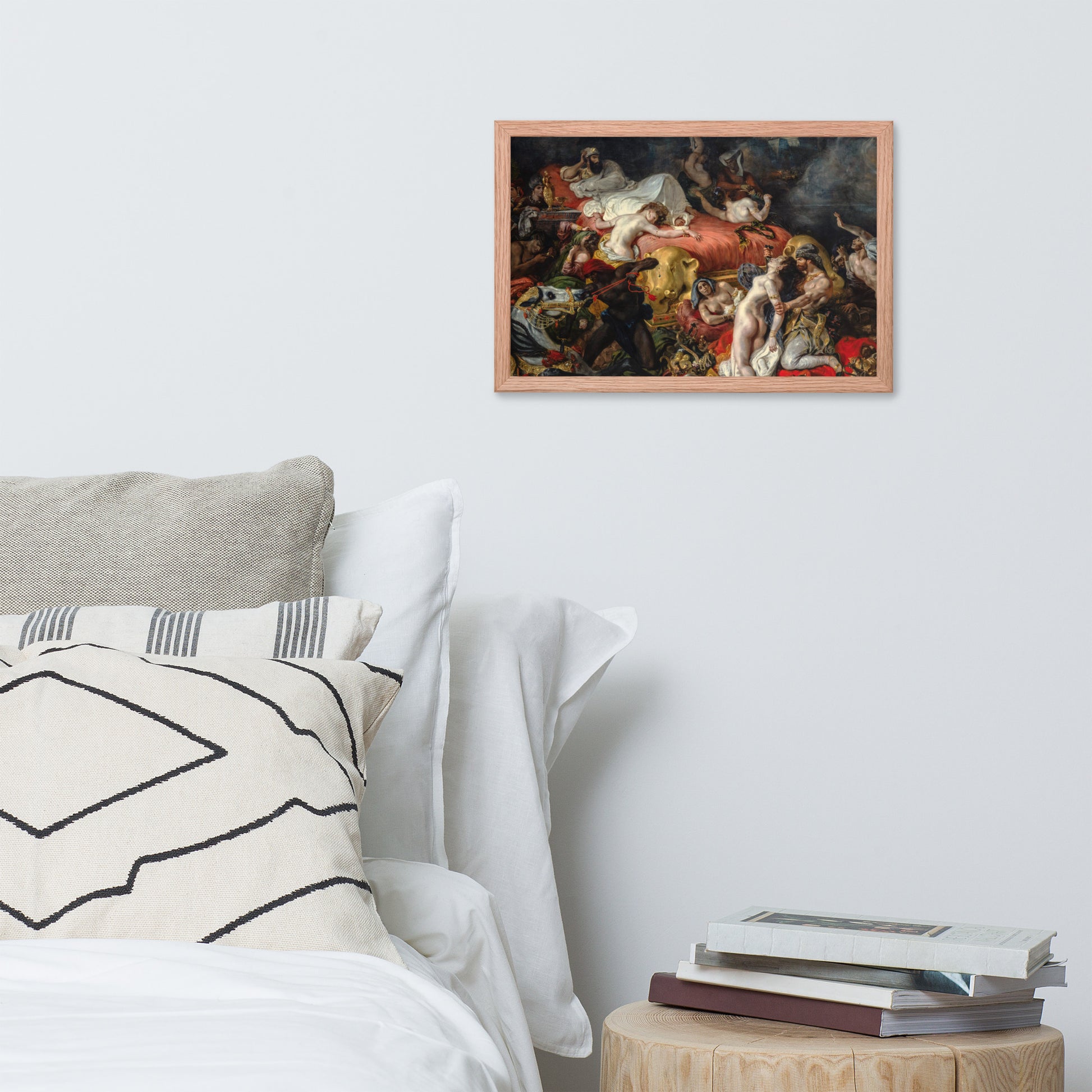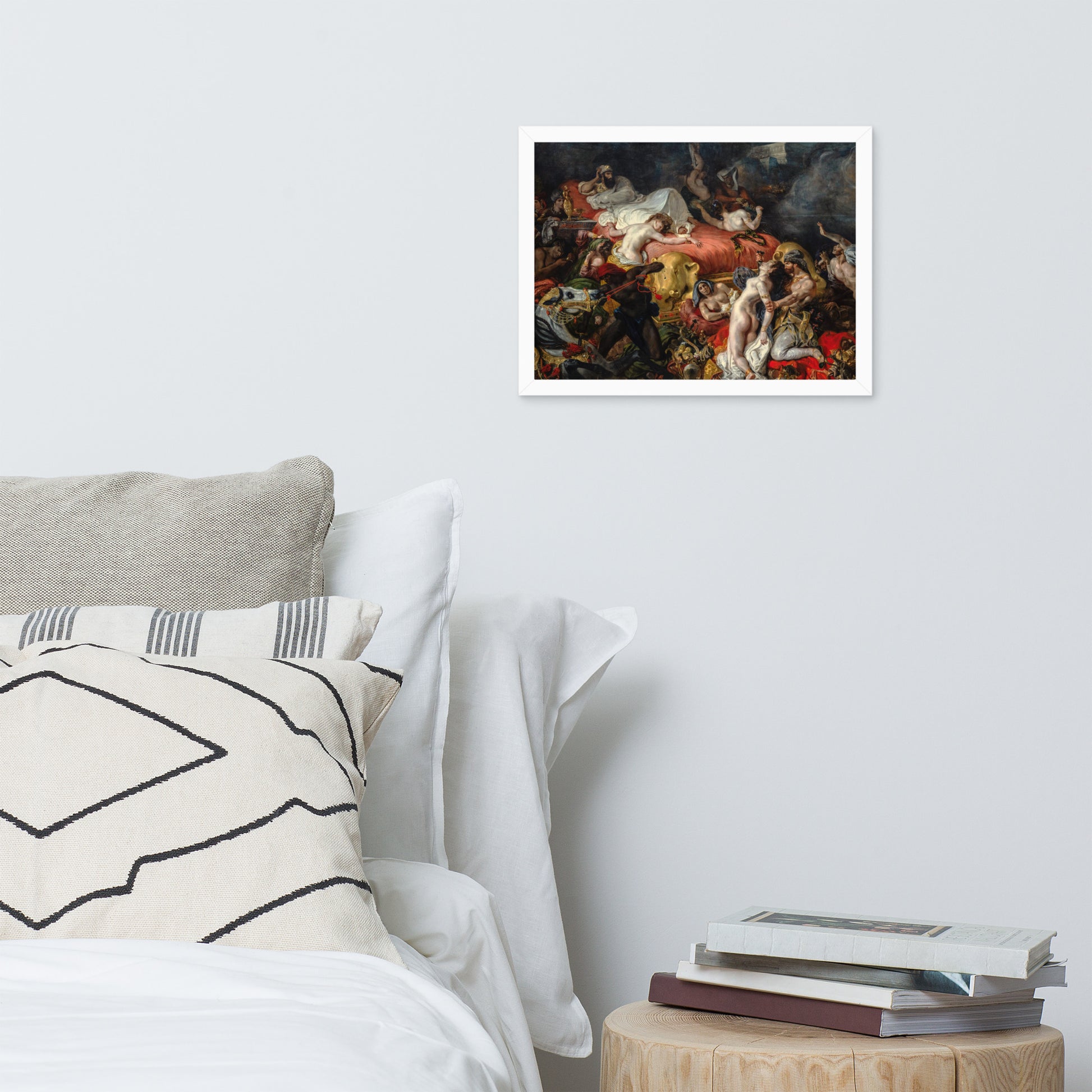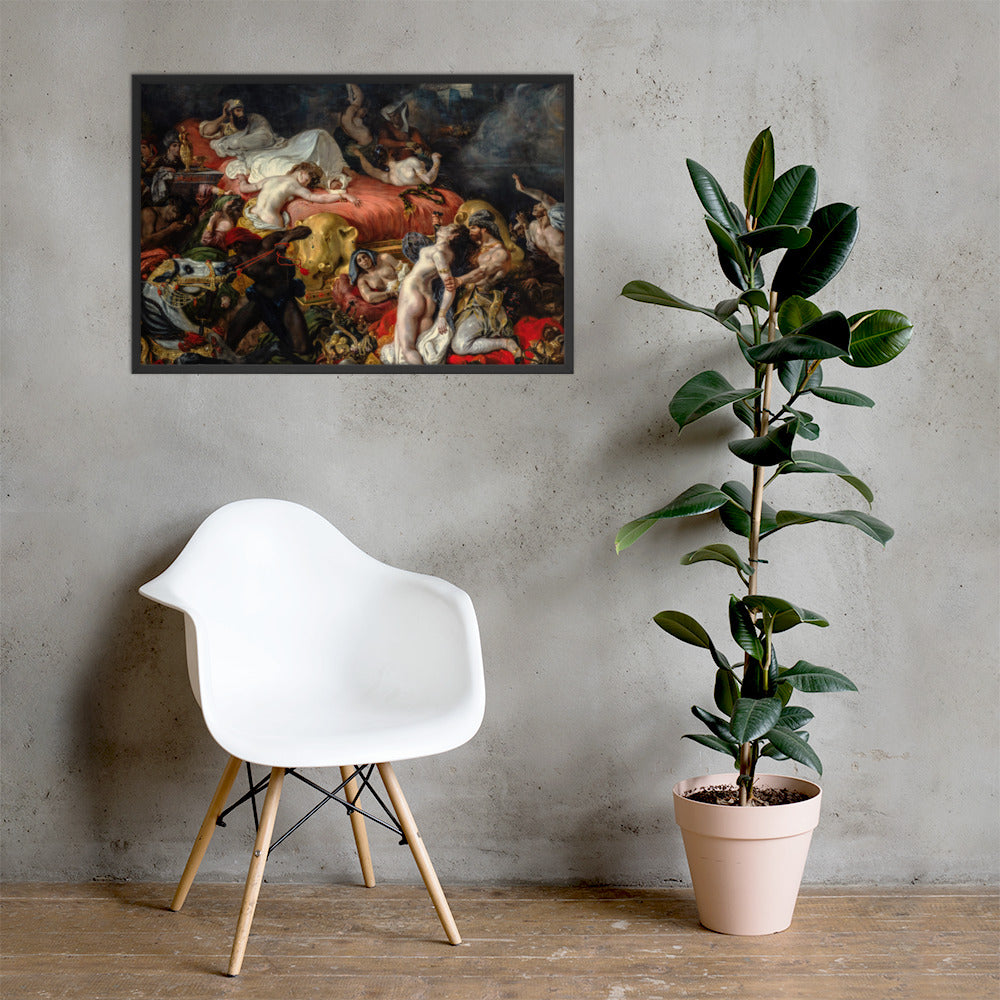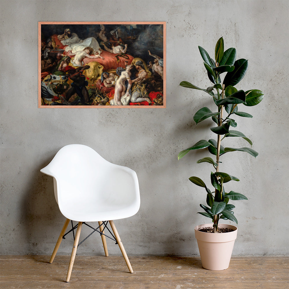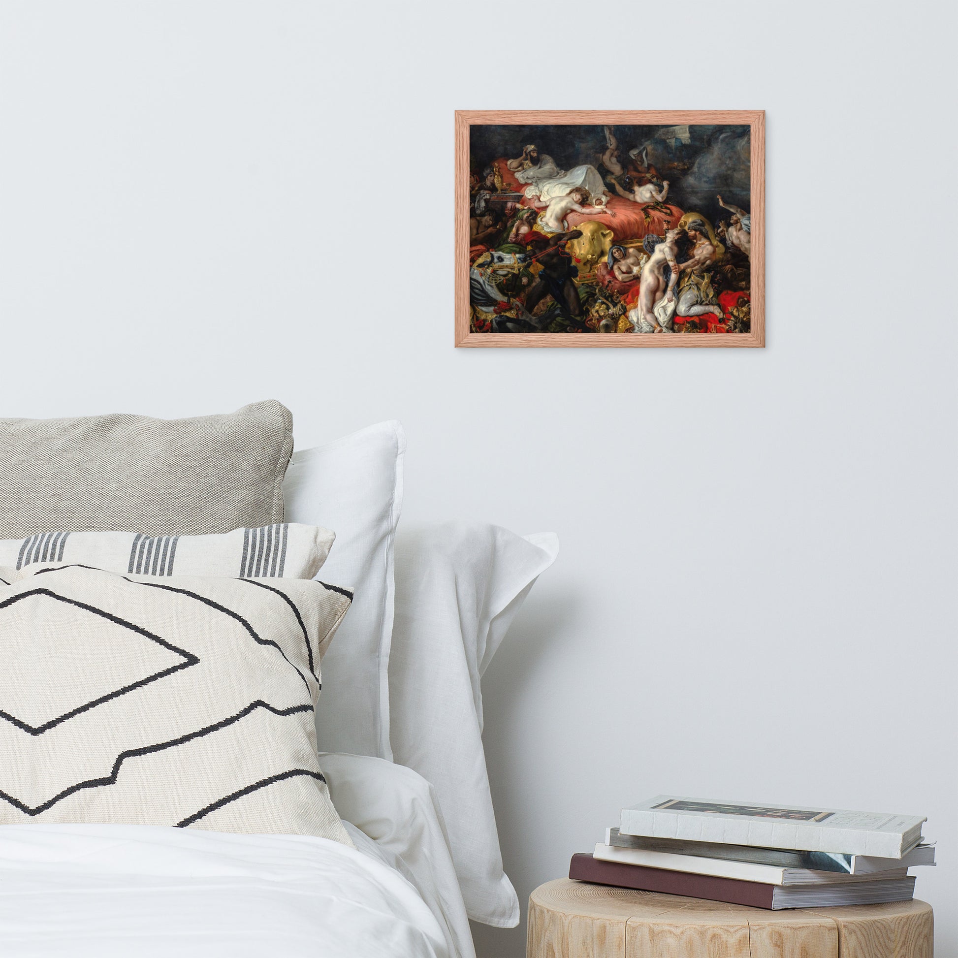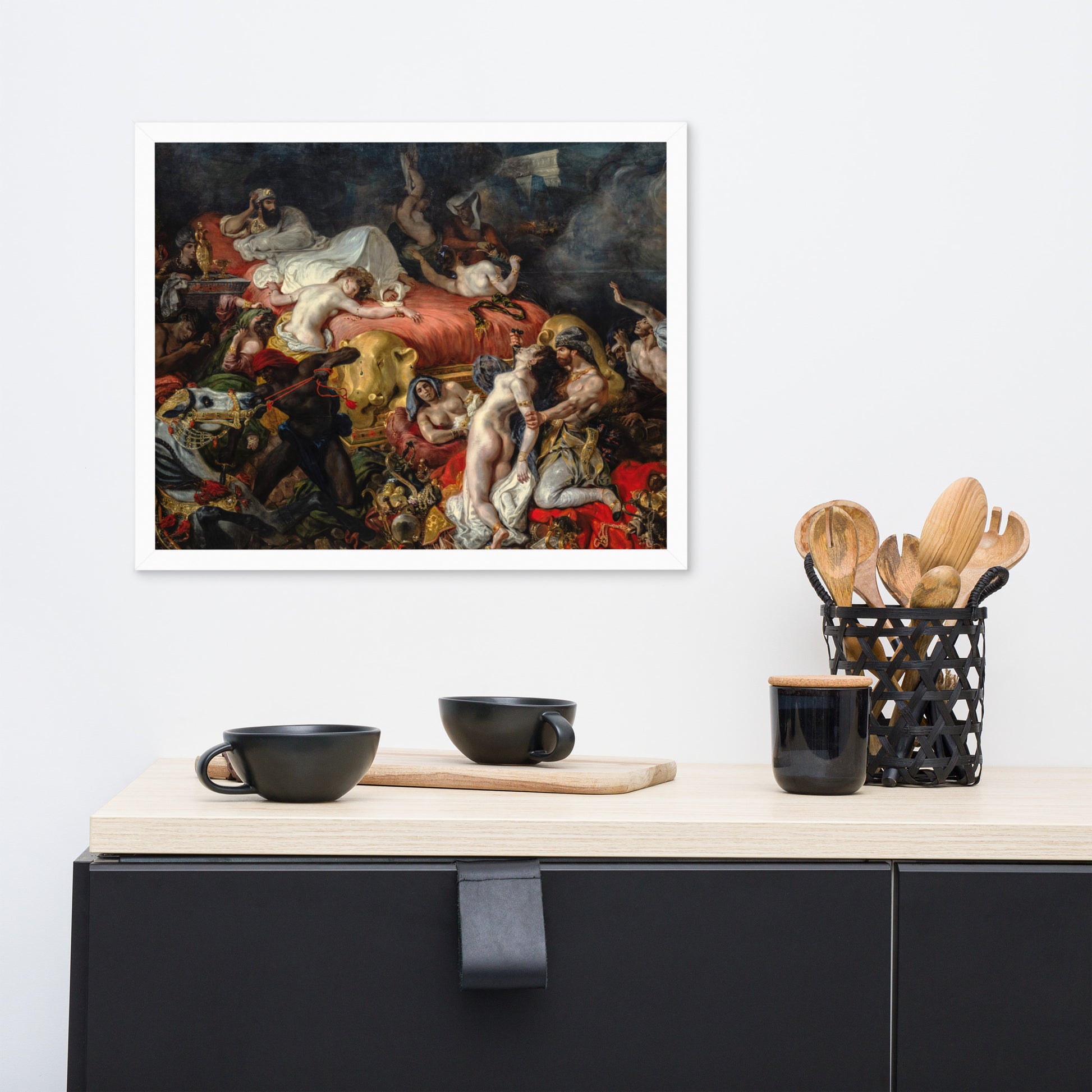 Step into the fevered imagination of Romanticism with The Death of Sardanapalus by Eugène Delacroix—a tempest of color, emotion, and mythic collapse. This framed wall print captures the infamous Assyrian king’s final act of defiance, surrounded by opulence, worship, and destruction. At the heart of the composition lies a golden bull atop crimson cloth, symbolizing both divine indulgence and moral decay, while nude and anguished figures swirl in a chaotic ballet of ecstasy and despair.