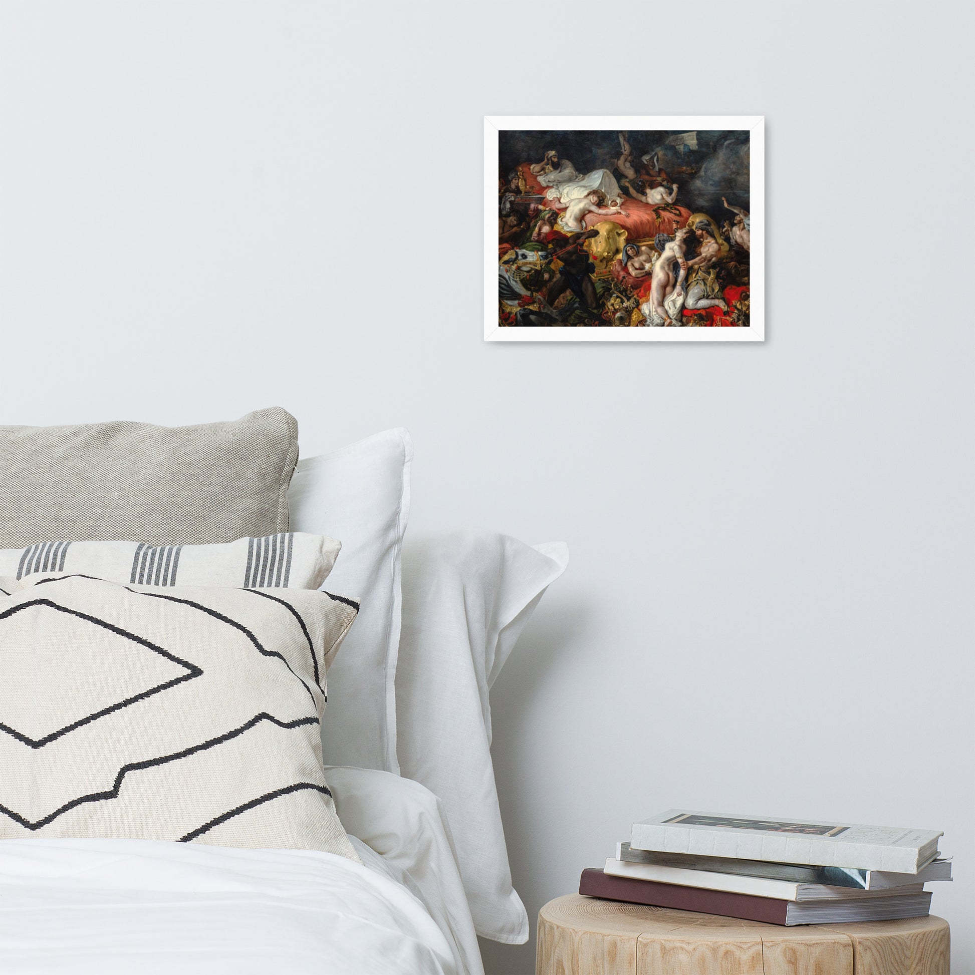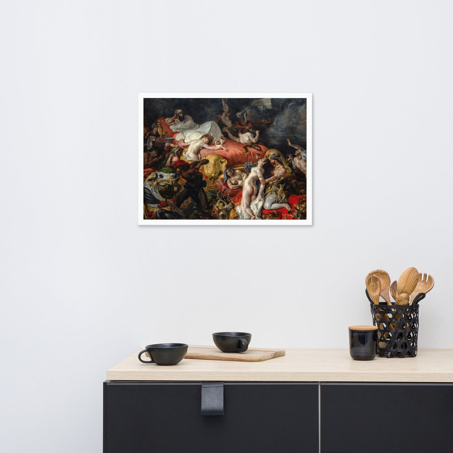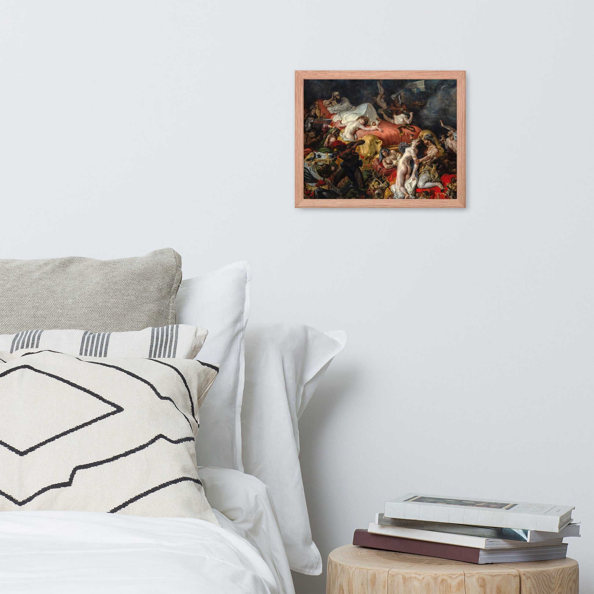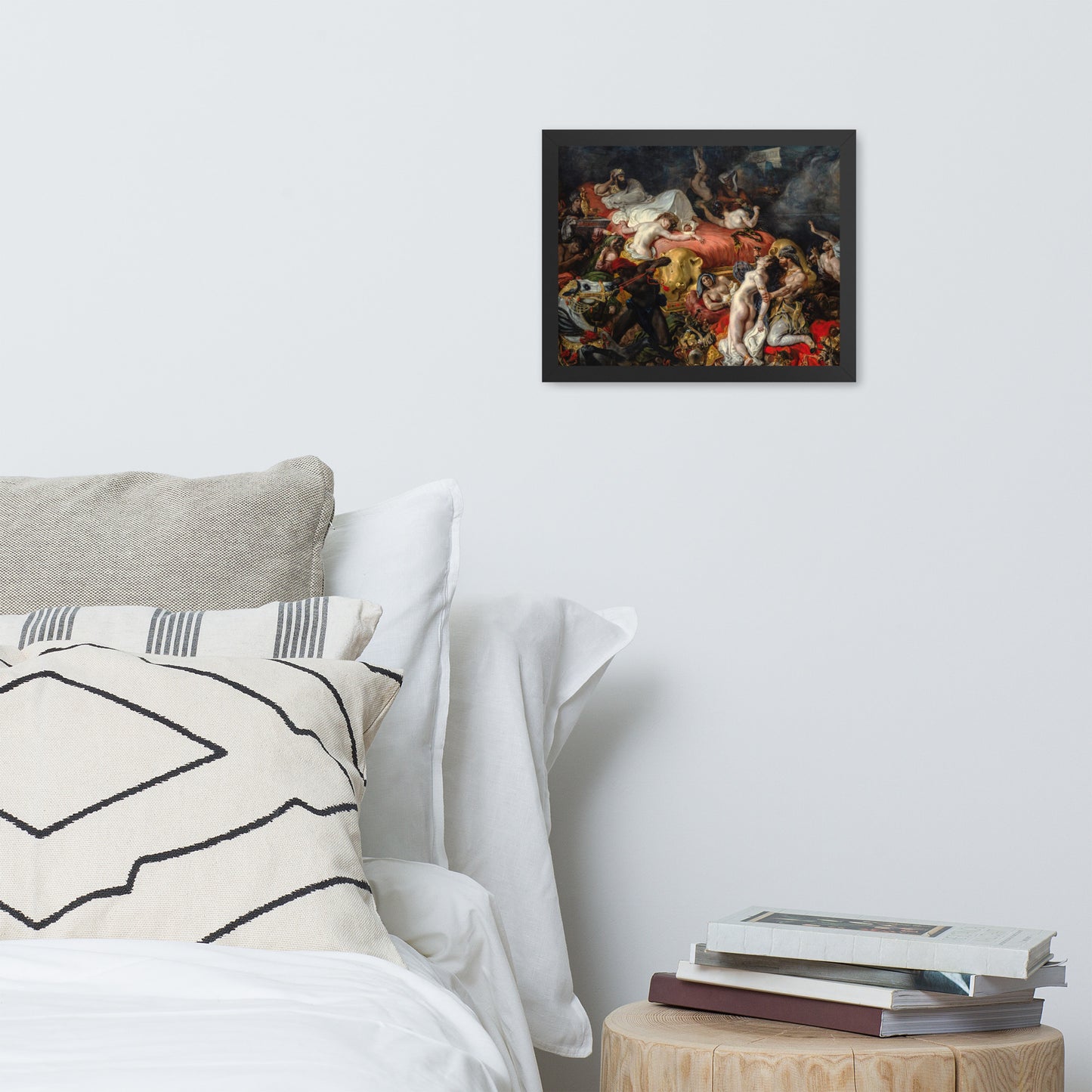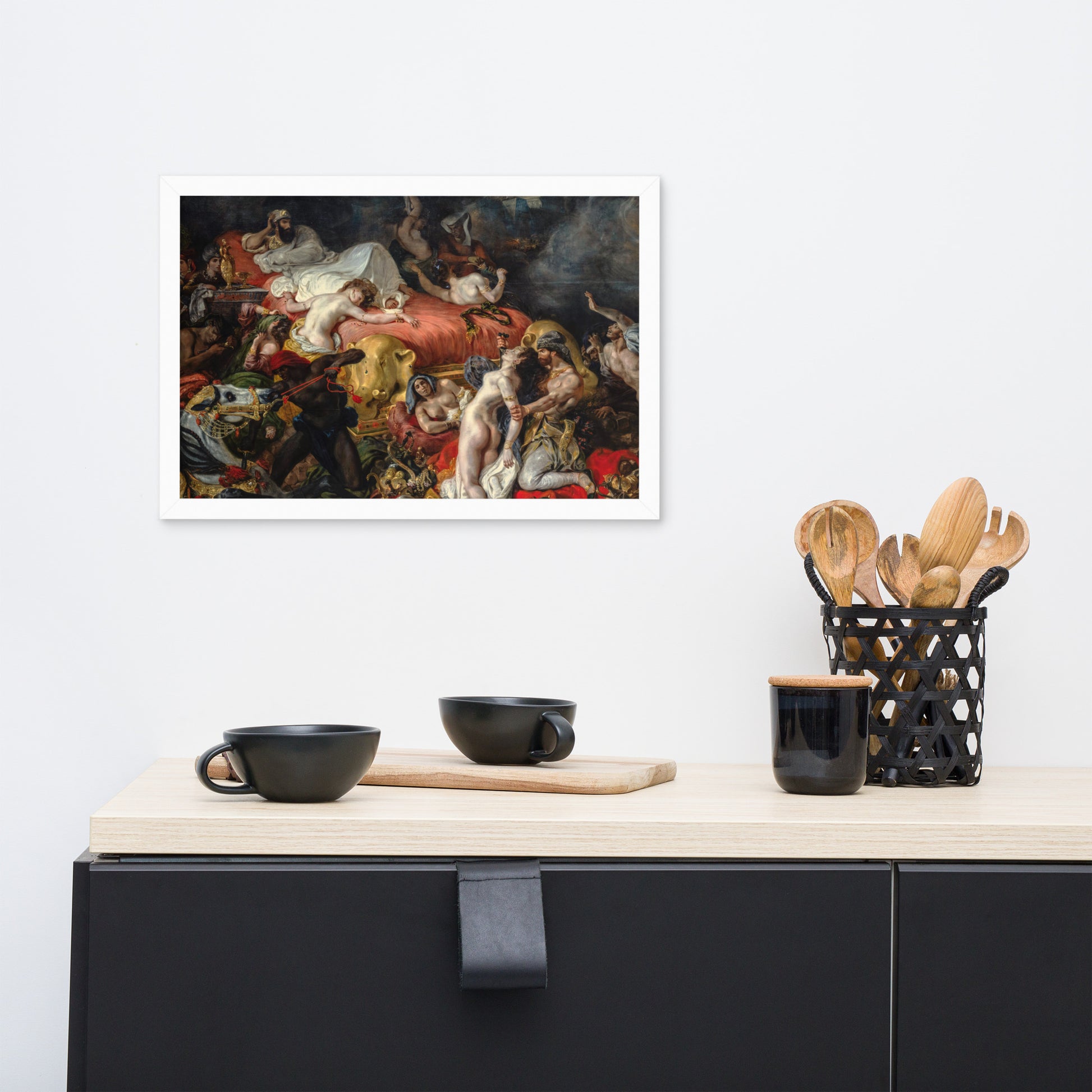 Step into the fevered imagination of Romanticism with The Death of Sardanapalus by Eugène Delacroix—a tempest of color, emotion, and mythic collapse. This framed wall print captures the infamous Assyrian king’s final act of defiance, surrounded by opulence, worship, and destruction. At the heart of the composition lies a golden bull atop crimson cloth, symbolizing both divine indulgence and moral decay, while nude and anguished figures swirl in a chaotic ballet of ecstasy and despair.