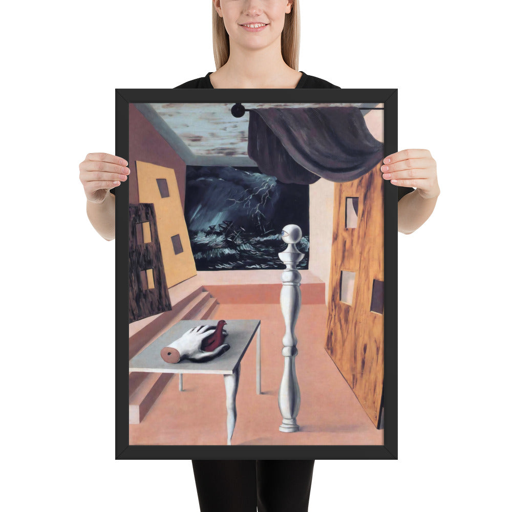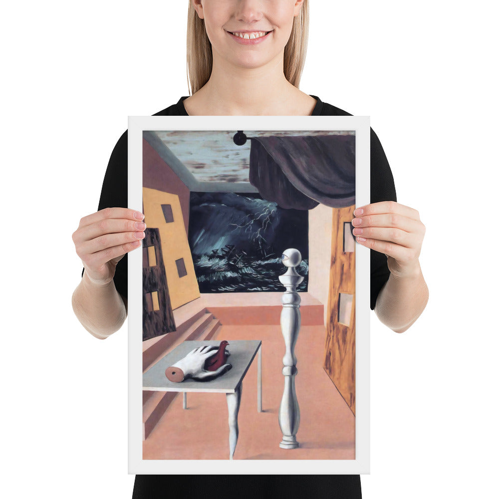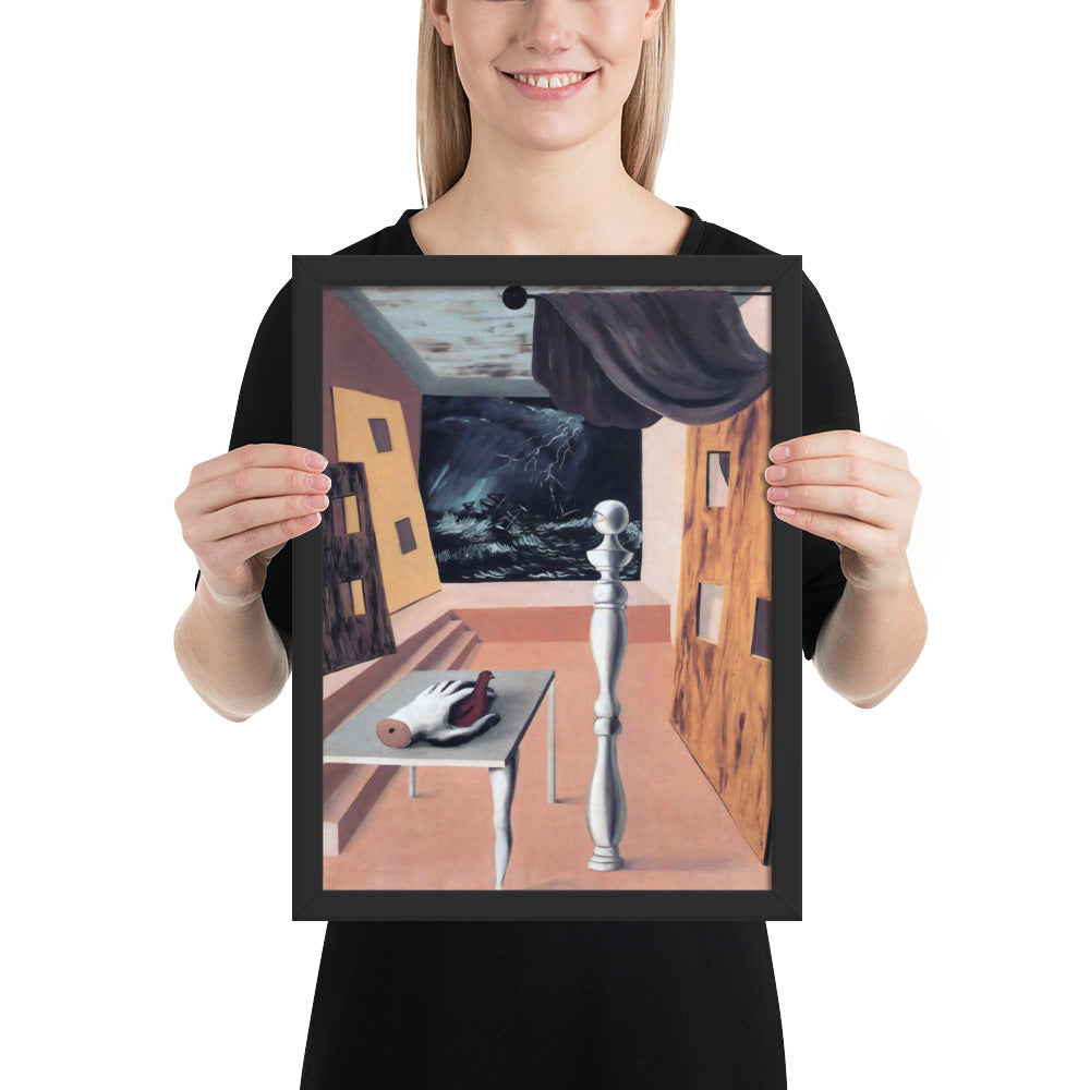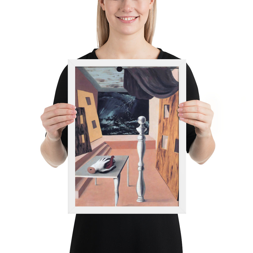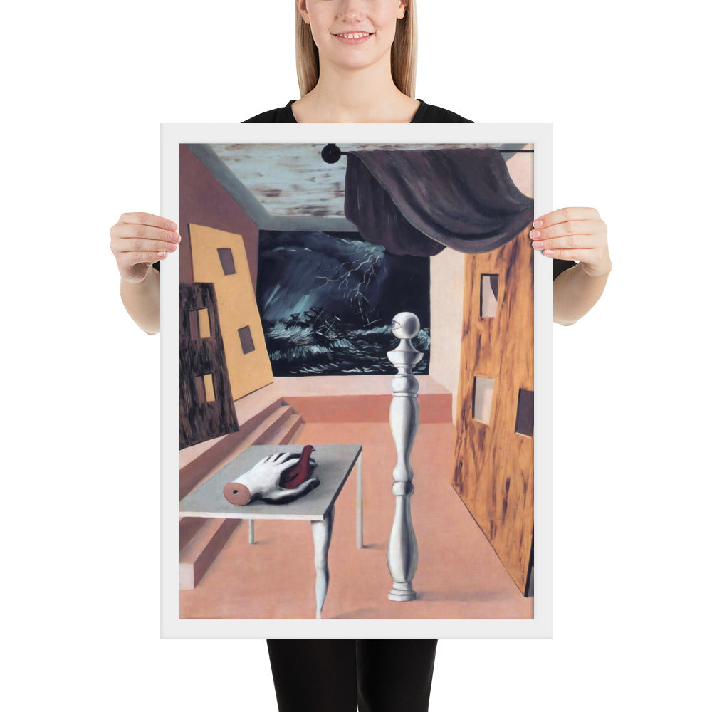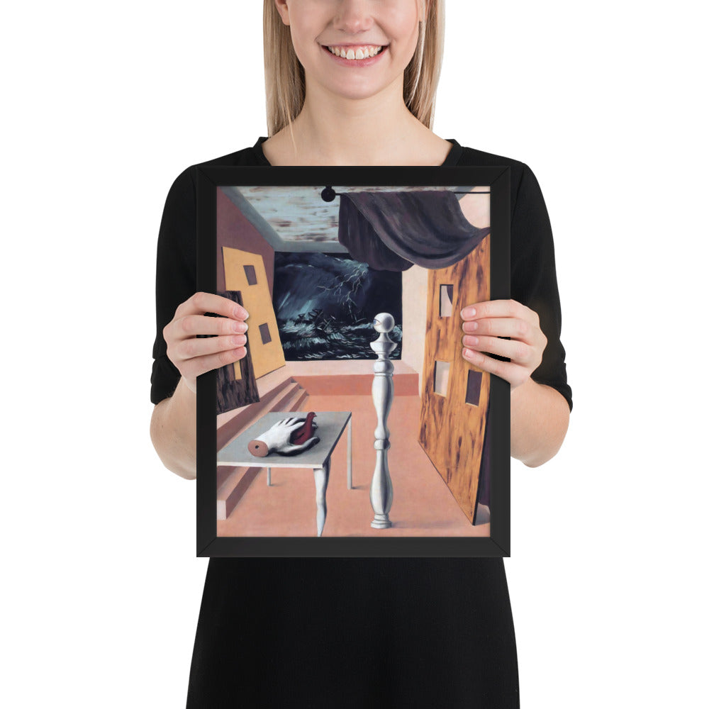 Step into the enigmatic world of surrealism with The Difficult Crossing by René Magritte. This framed wall print invites viewers into a dreamlike interior where disjointed forms and stormy vistas collide. A disembodied hand, elongated table legs, and a spindle-like column evoke mystery and tension—perfect for collectors who crave thought-provoking art with emotional depth. Printed with crisp detail and framed for modern display, this piece transforms any space into a portal of imagination and introspection.