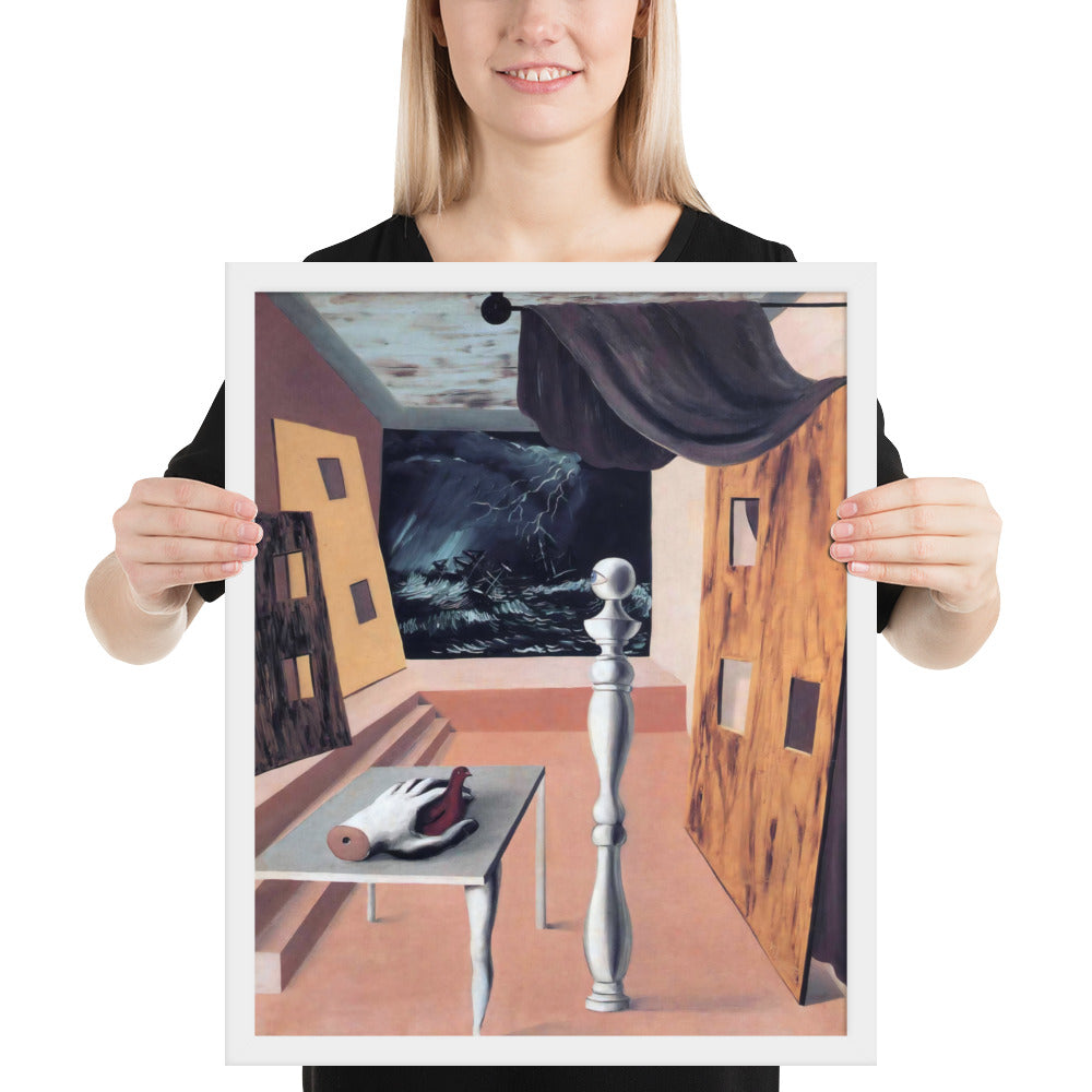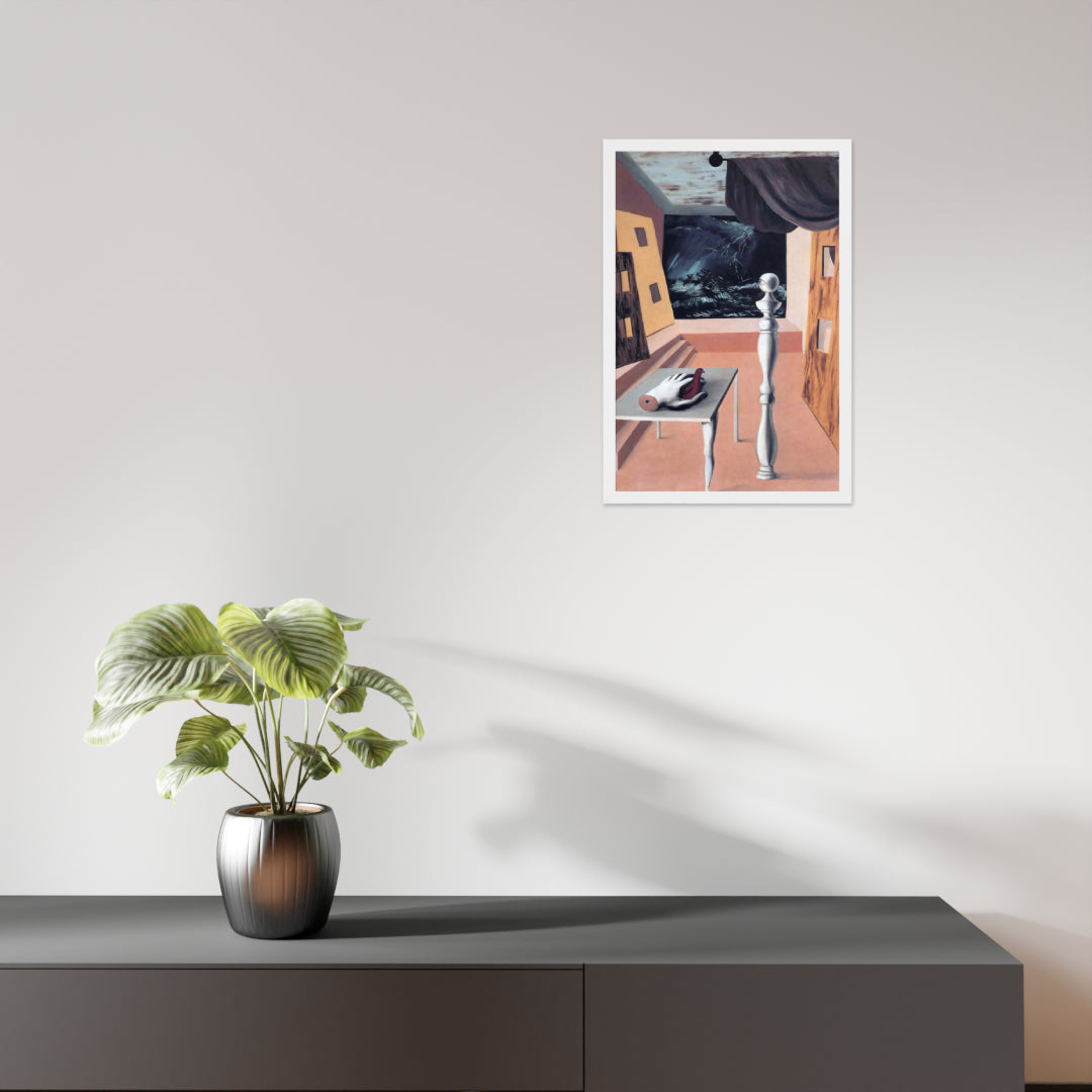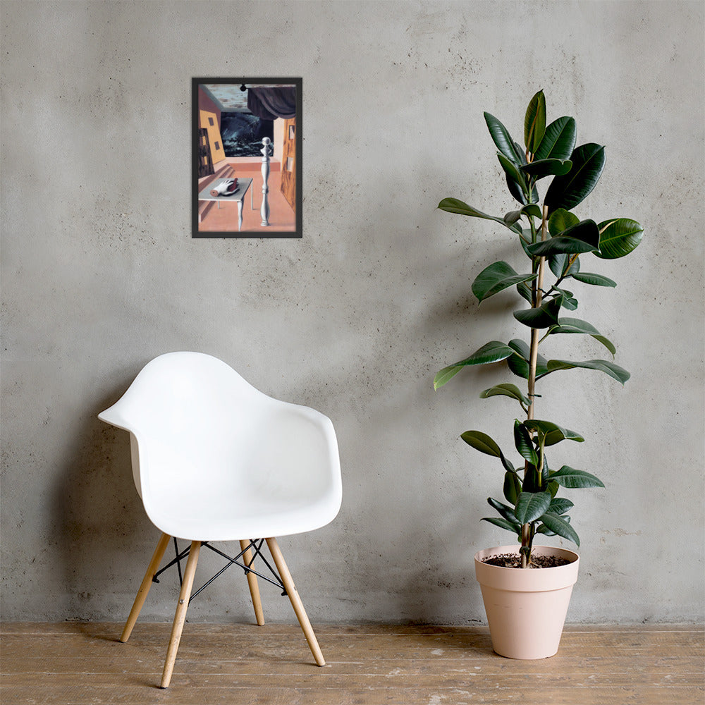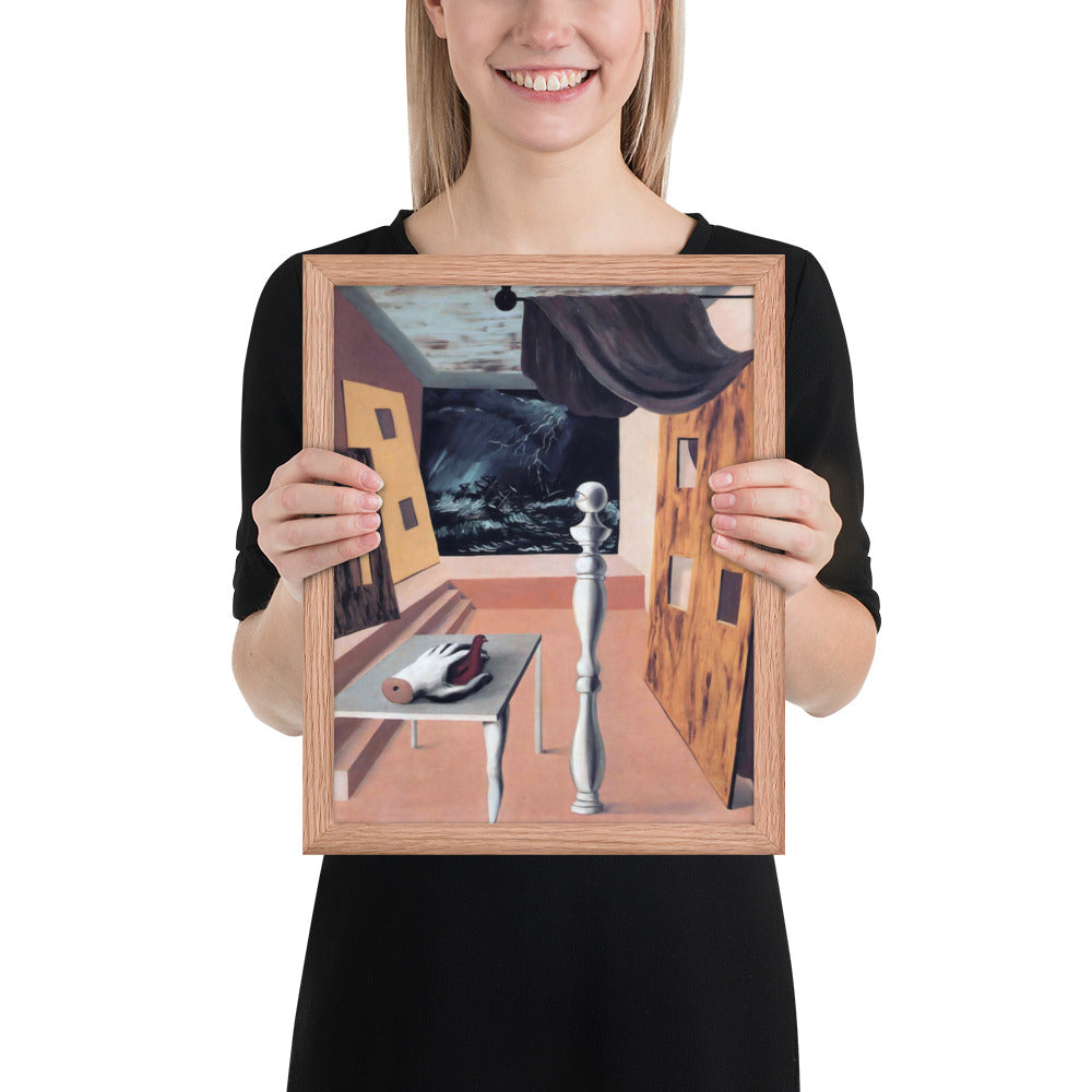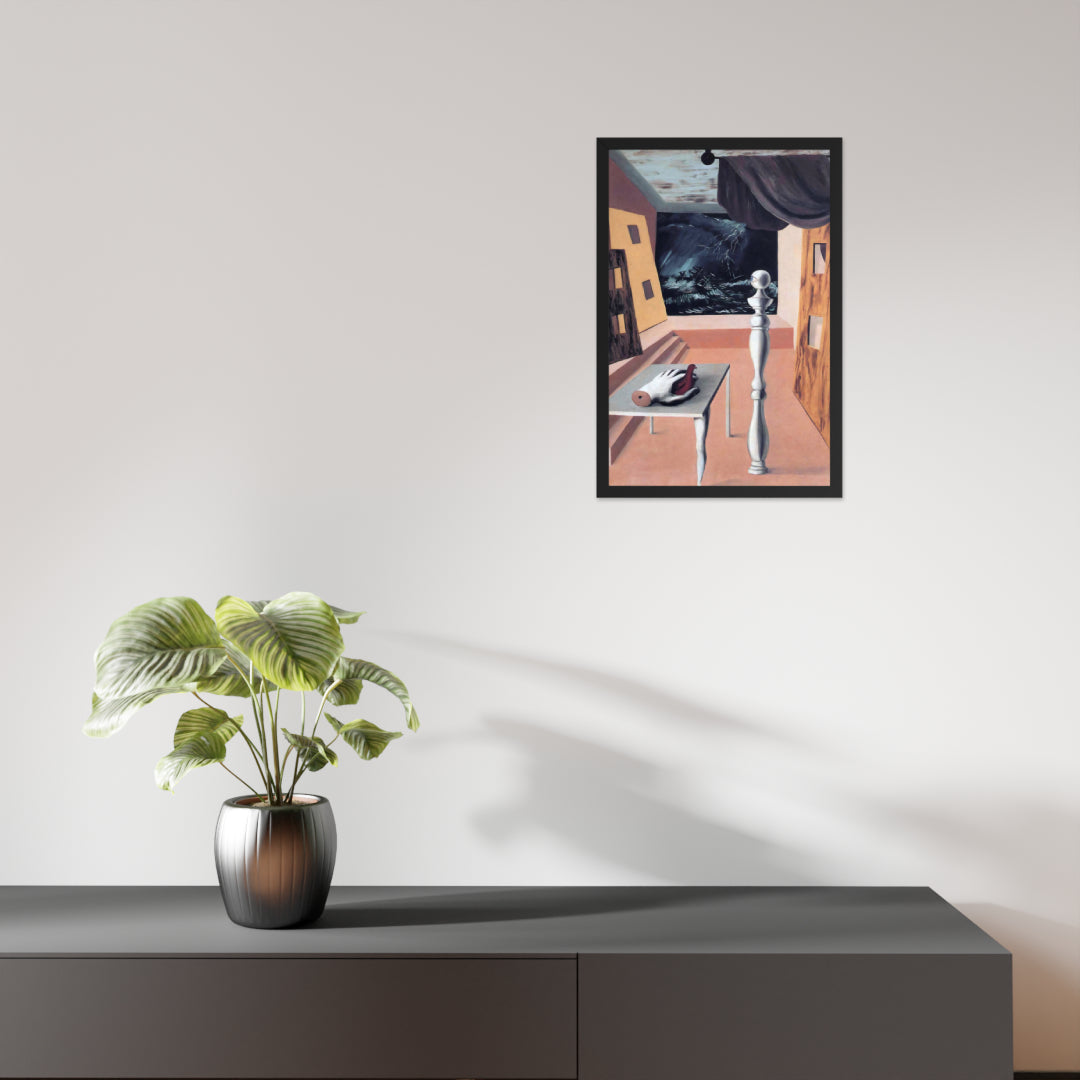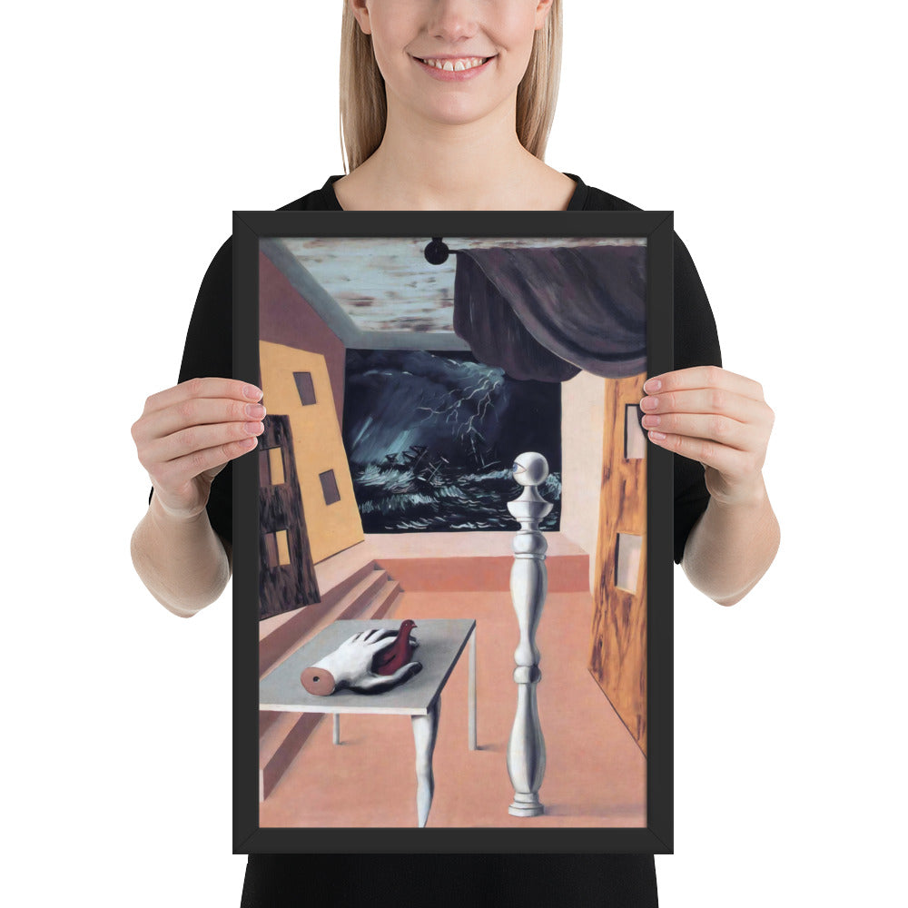 Step into the enigmatic world of surrealism with The Difficult Crossing by René Magritte. This framed wall print invites viewers into a dreamlike interior where disjointed forms and stormy vistas collide. A disembodied hand, elongated table legs, and a spindle-like column evoke mystery and tension—perfect for collectors who crave thought-provoking art with emotional depth. Printed with crisp detail and framed for modern display, this piece transforms any space into a portal of imagination and introspection.