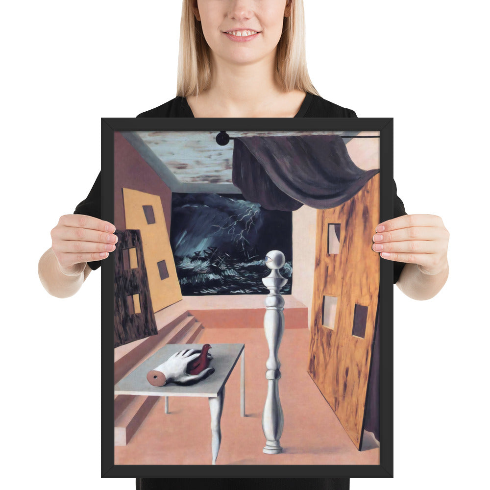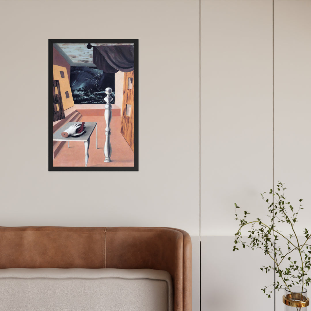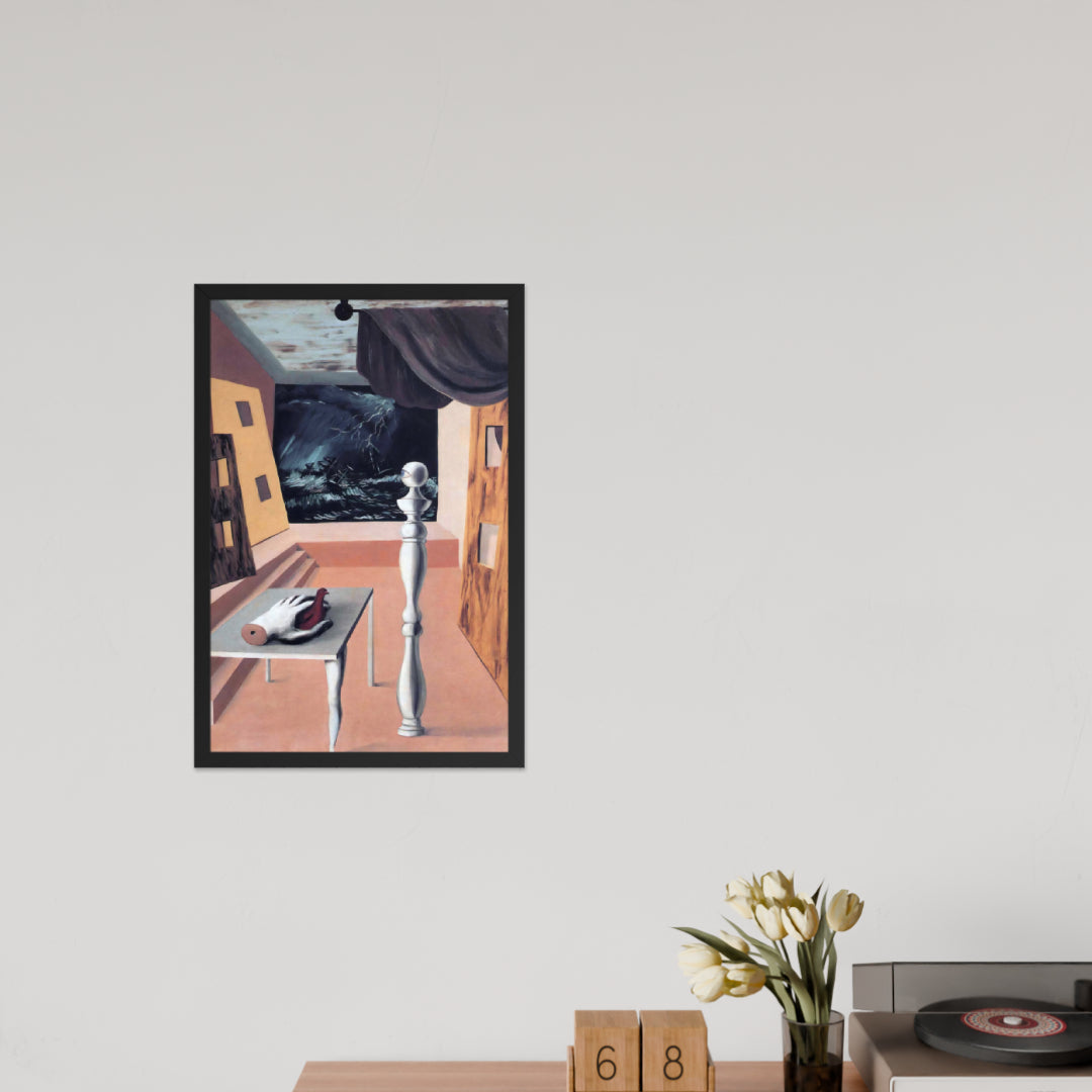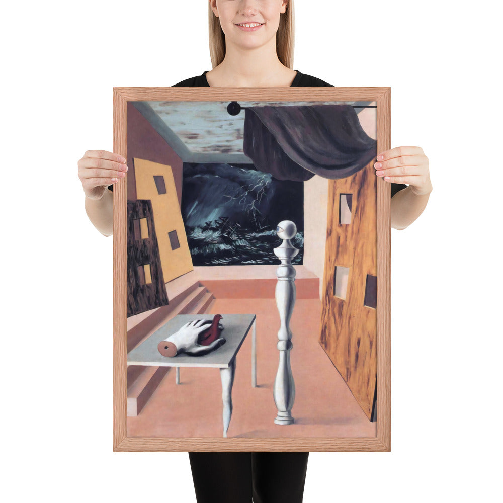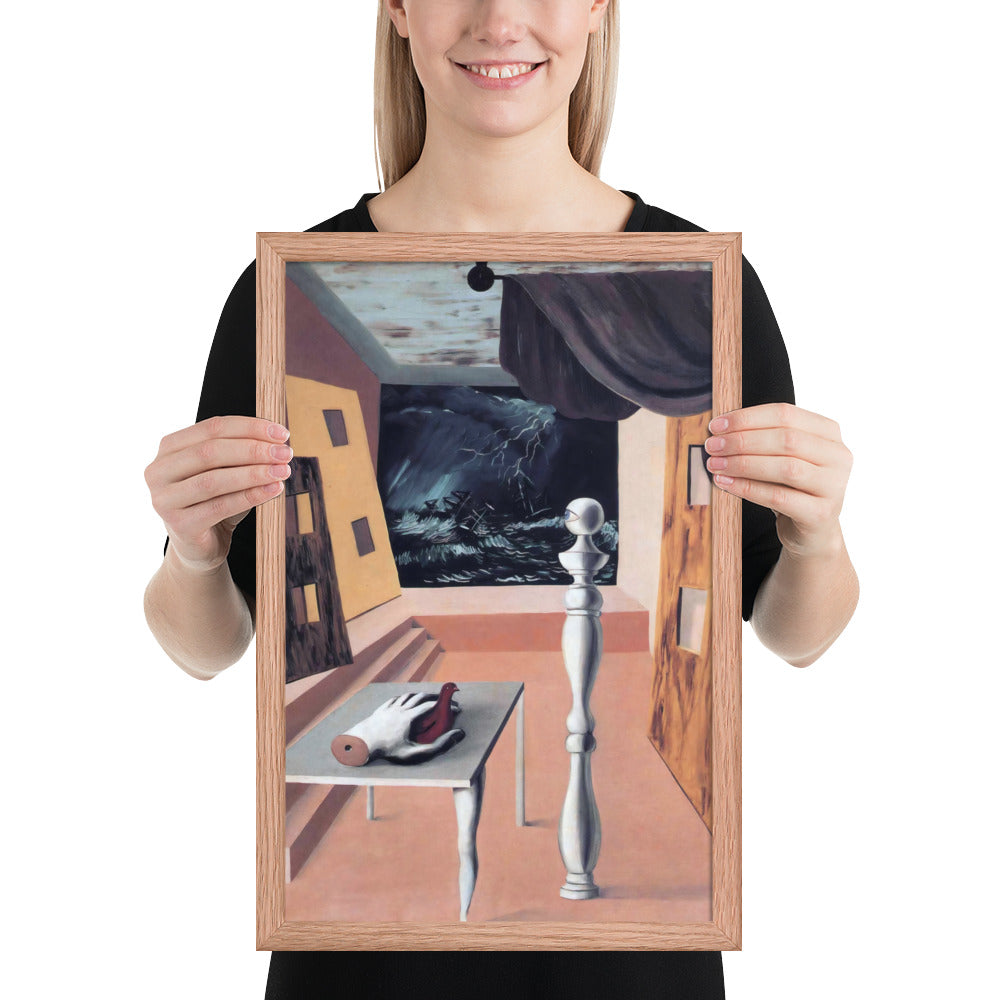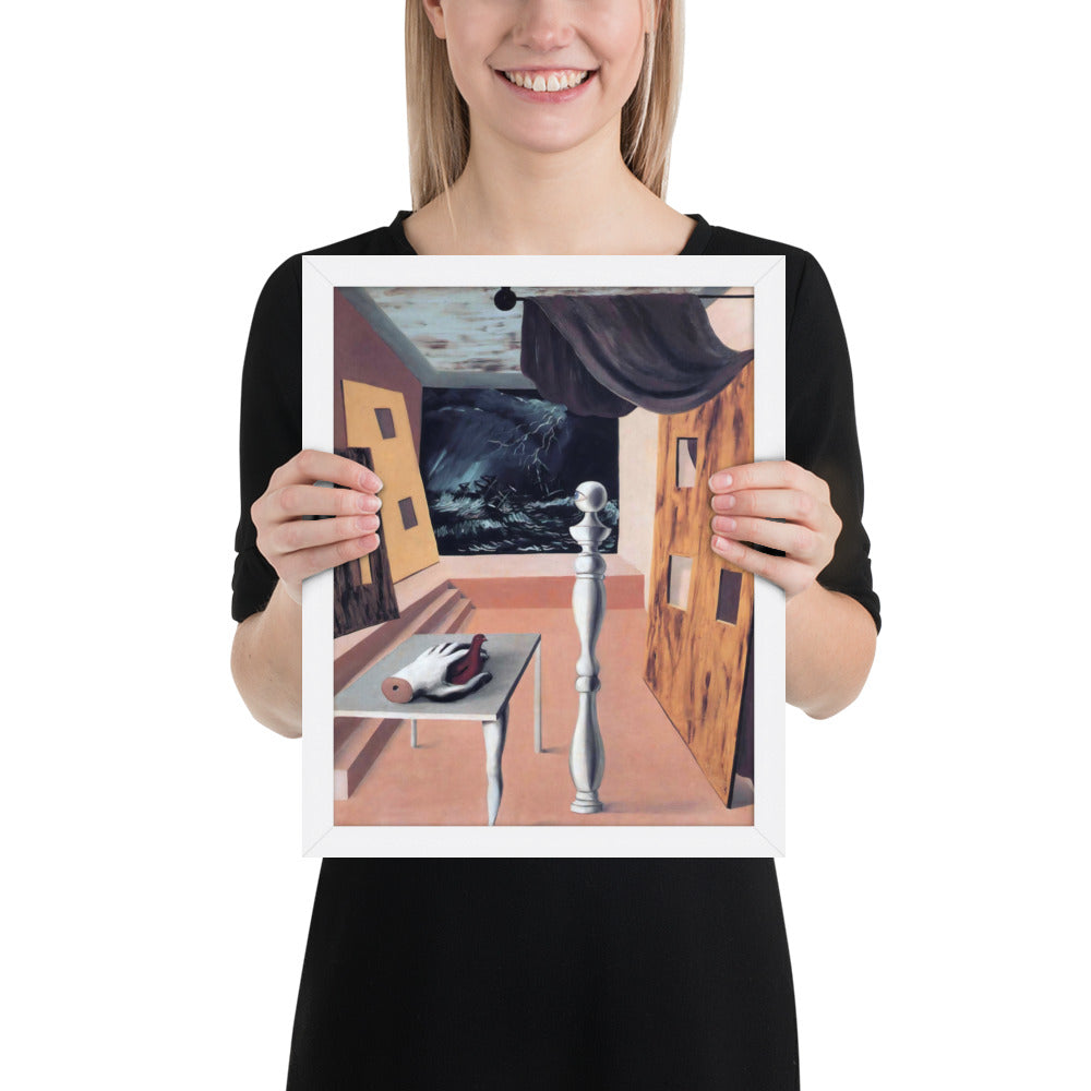 Step into the enigmatic world of surrealism with The Difficult Crossing by René Magritte. This framed wall print invites viewers into a dreamlike interior where disjointed forms and stormy vistas collide. A disembodied hand, elongated table legs, and a spindle-like column evoke mystery and tension—perfect for collectors who crave thought-provoking art with emotional depth. Printed with crisp detail and framed for modern display, this piece transforms any space into a portal of imagination and introspection.