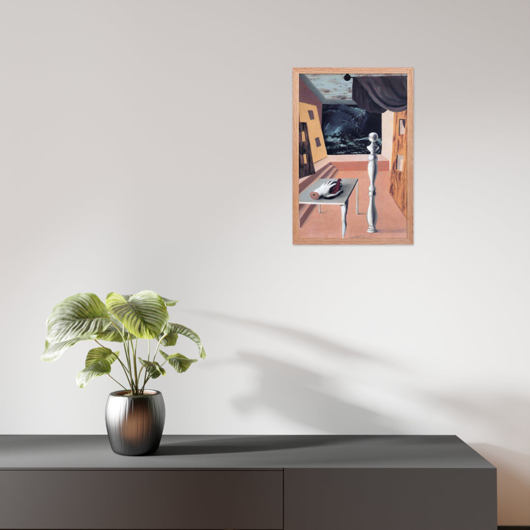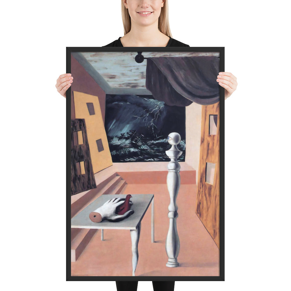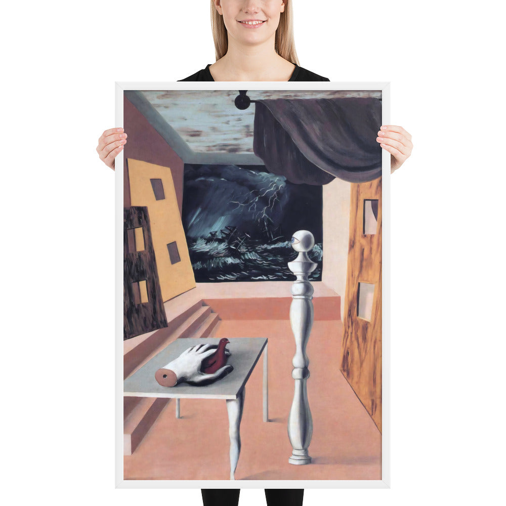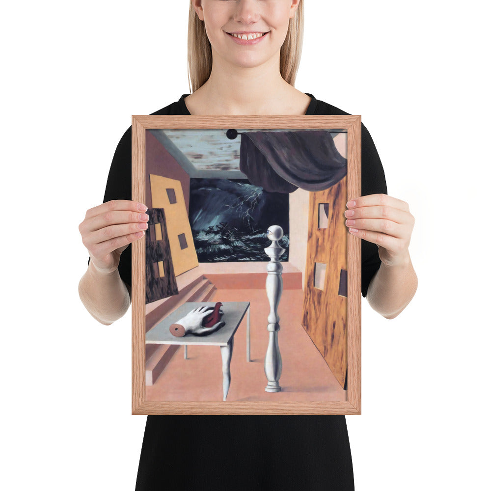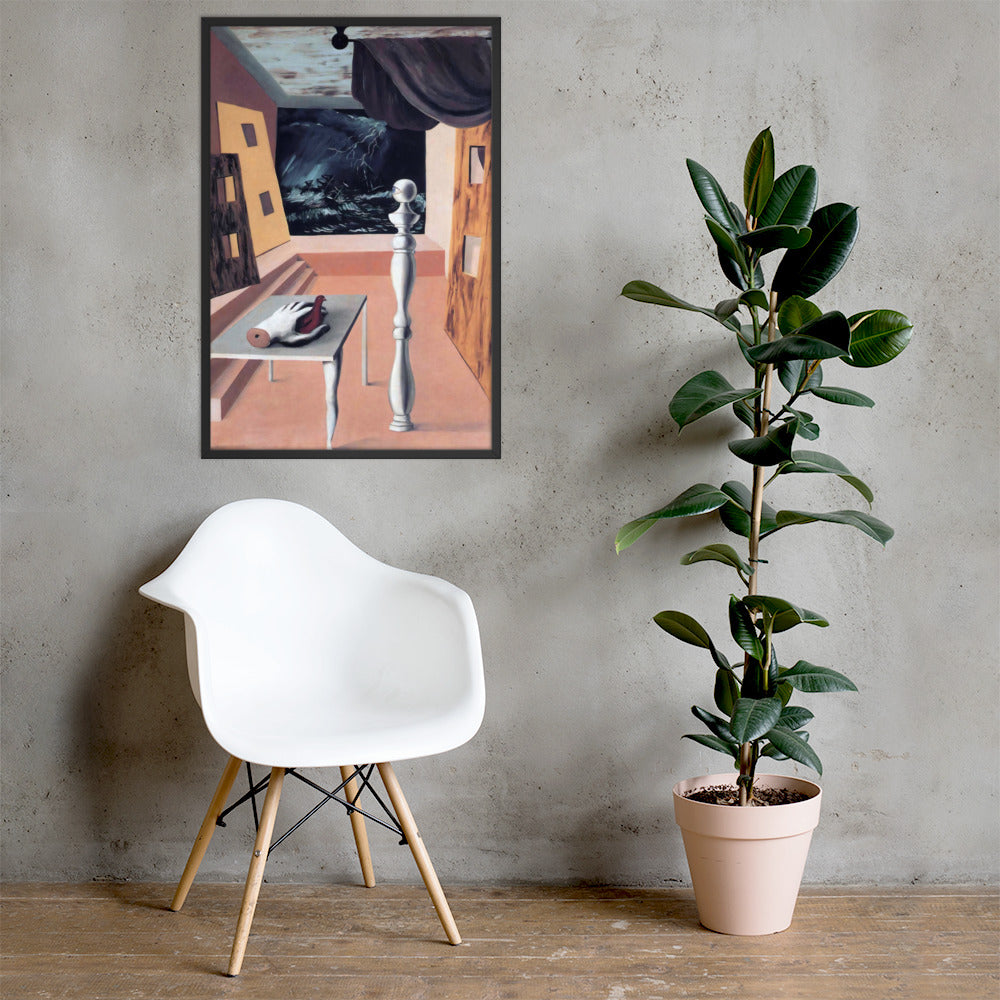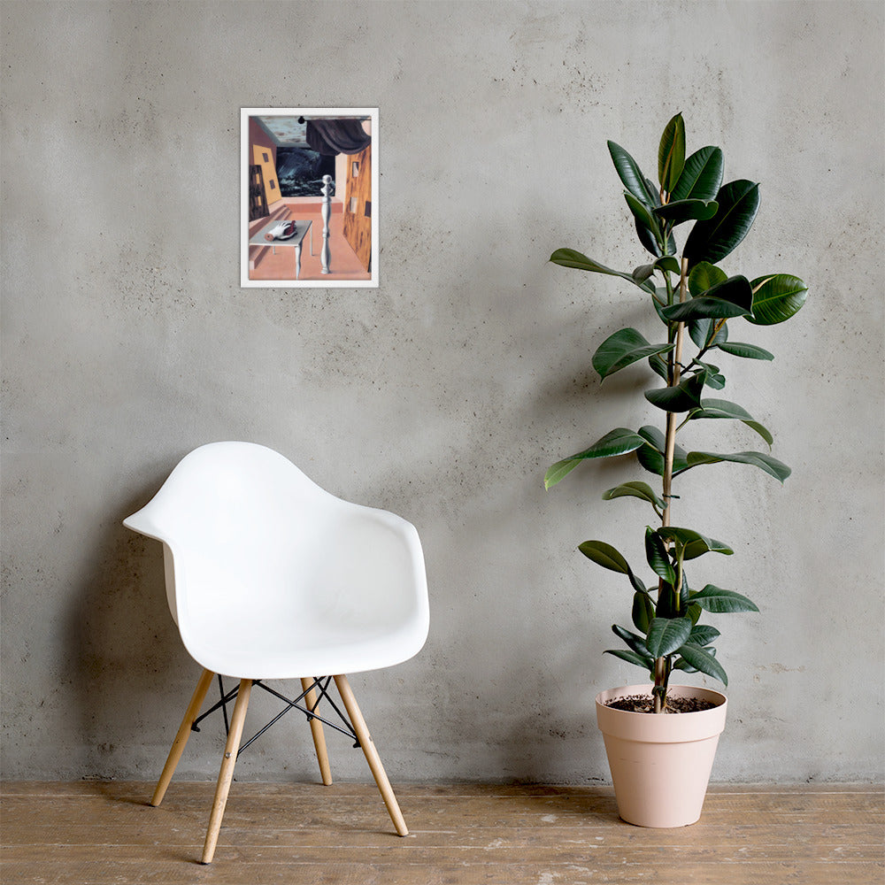 Step into the enigmatic world of surrealism with The Difficult Crossing by René Magritte. This framed wall print invites viewers into a dreamlike interior where disjointed forms and stormy vistas collide. A disembodied hand, elongated table legs, and a spindle-like column evoke mystery and tension—perfect for collectors who crave thought-provoking art with emotional depth. Printed with crisp detail and framed for modern display, this piece transforms any space into a portal of imagination and introspection.