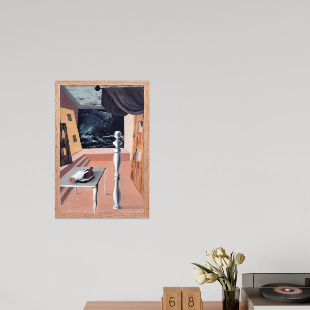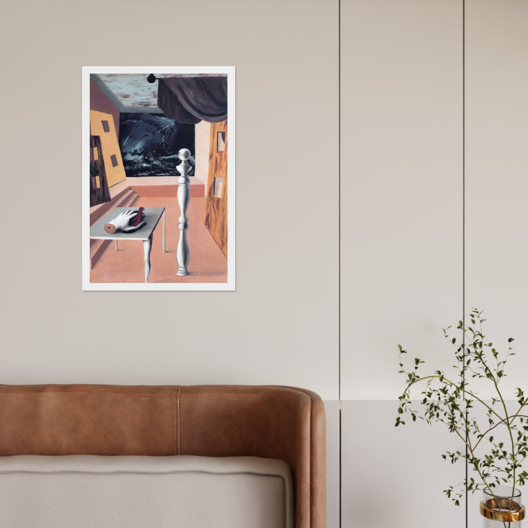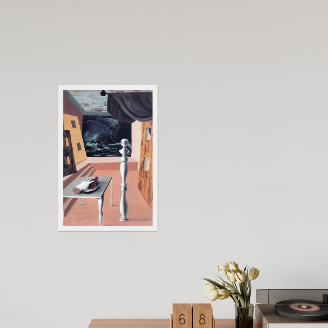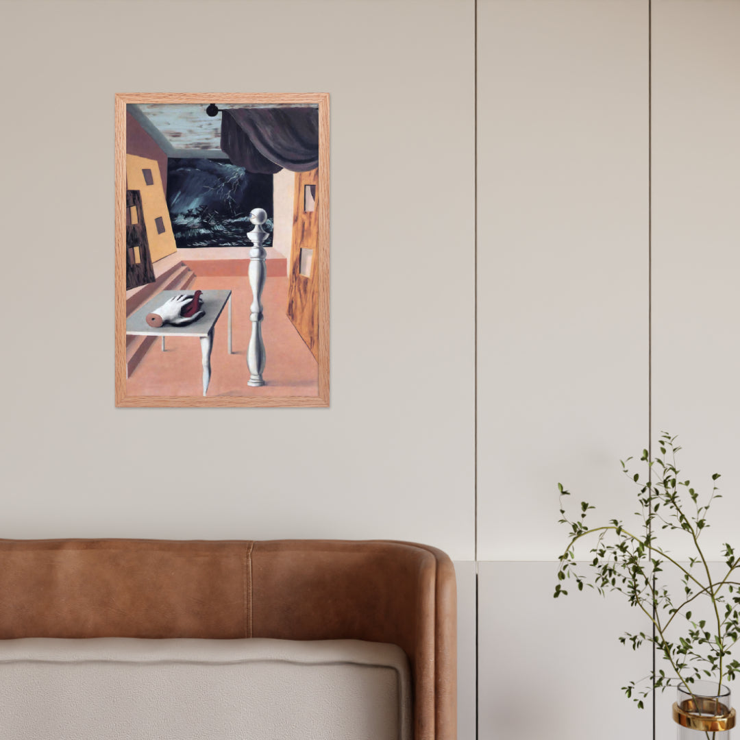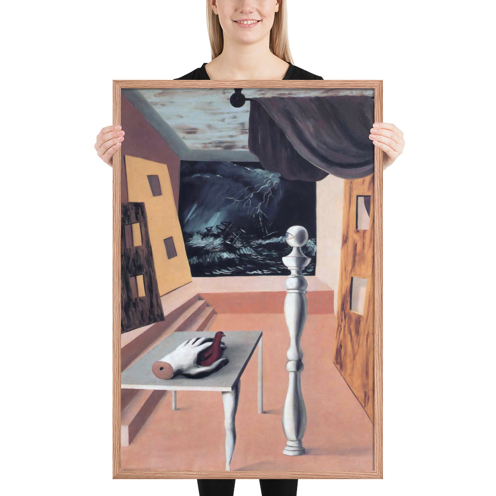 Step into the enigmatic world of surrealism with The Difficult Crossing by René Magritte. This framed wall print invites viewers into a dreamlike interior where disjointed forms and stormy vistas collide. A disembodied hand, elongated table legs, and a spindle-like column evoke mystery and tension—perfect for collectors who crave thought-provoking art with emotional depth. Printed with crisp detail and framed for modern display, this piece transforms any space into a portal of imagination and introspection.