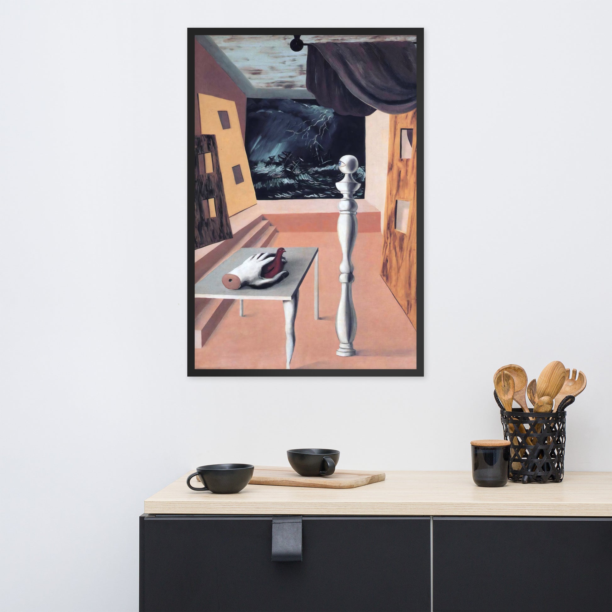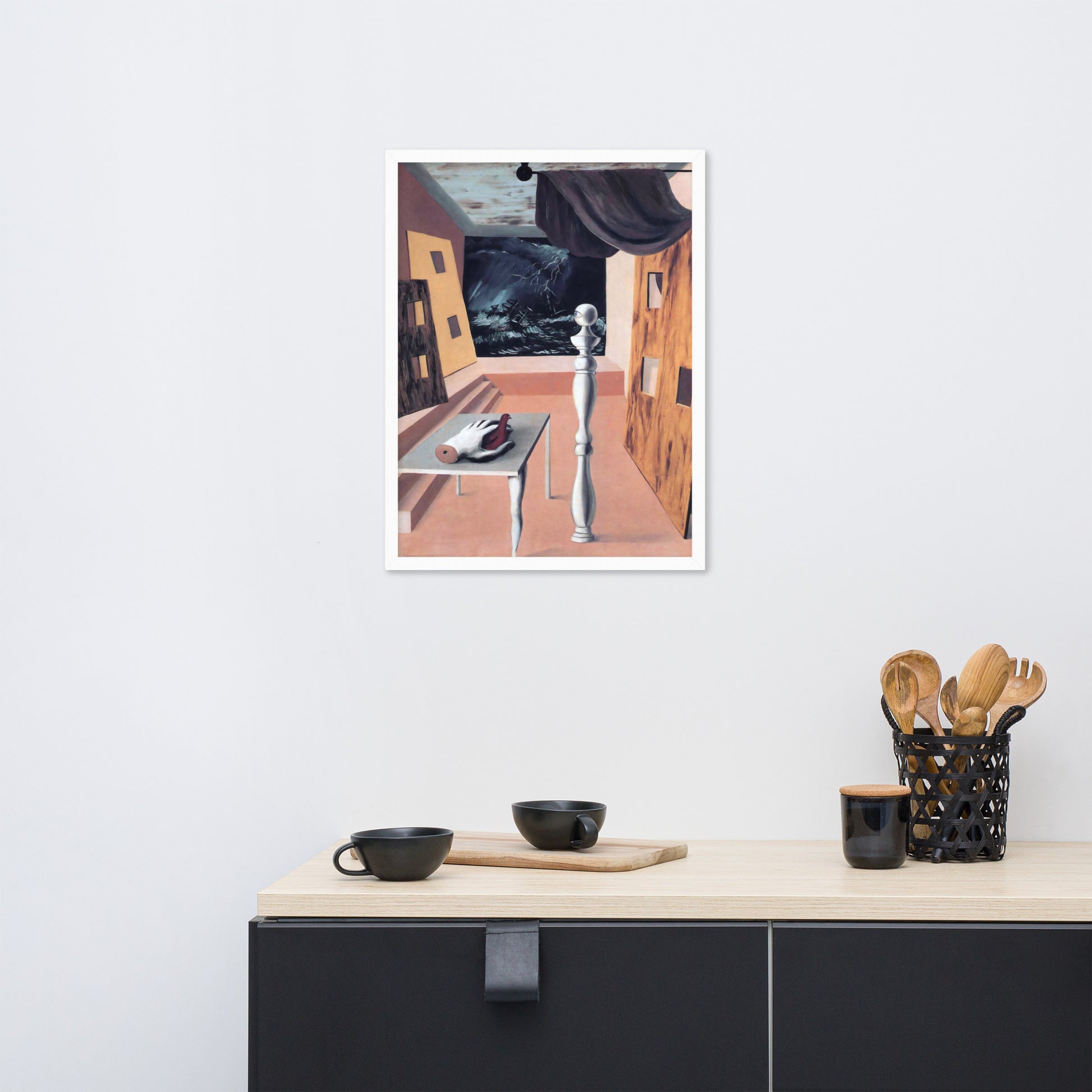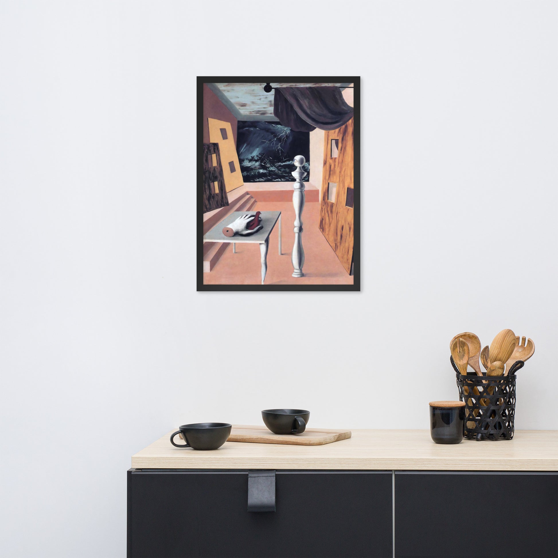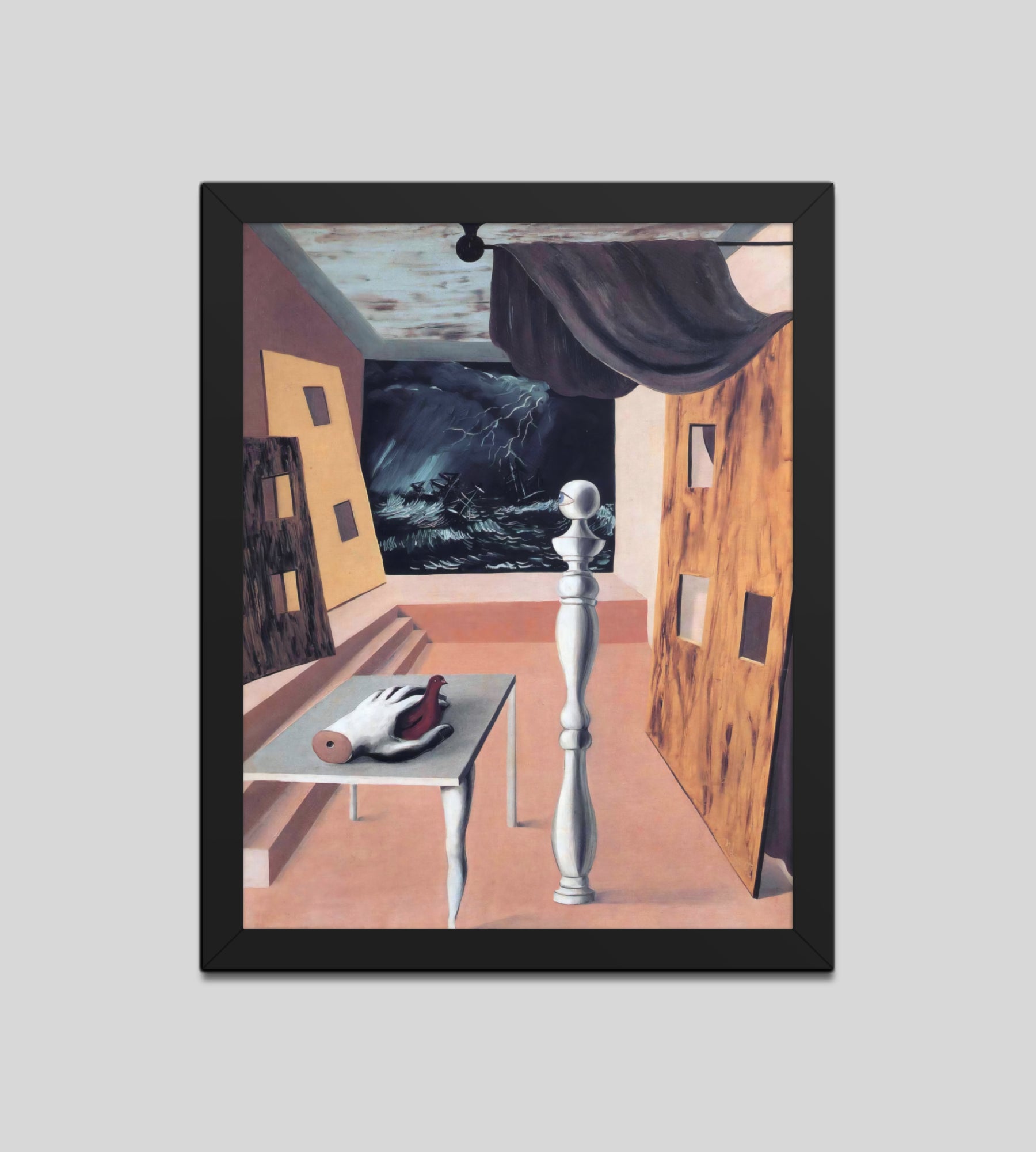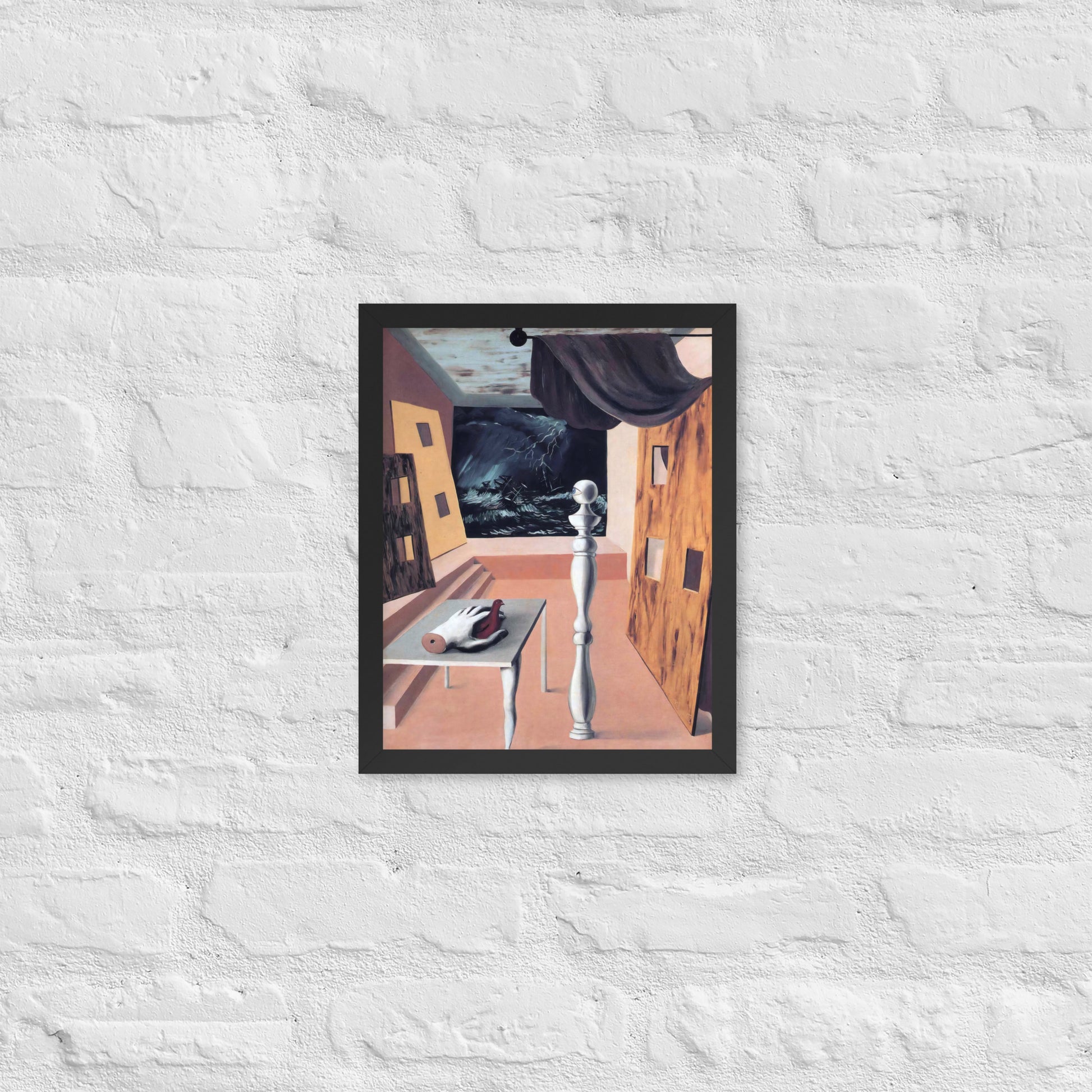 Step into the enigmatic world of surrealism with The Difficult Crossing by René Magritte. This framed wall print invites viewers into a dreamlike interior where disjointed forms and stormy vistas collide. A disembodied hand, elongated table legs, and a spindle-like column evoke mystery and tension—perfect for collectors who crave thought-provoking art with emotional depth. Printed with crisp detail and framed for modern display, this piece transforms any space into a portal of imagination and introspection.