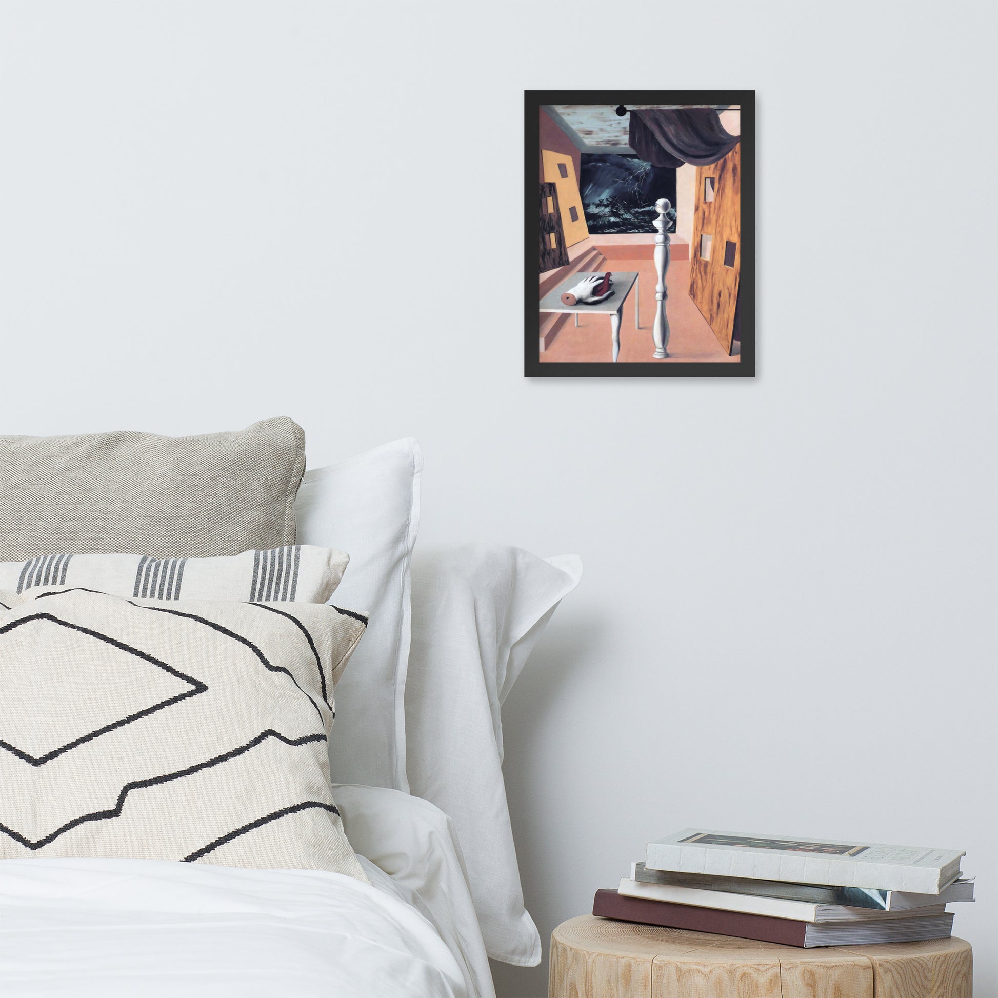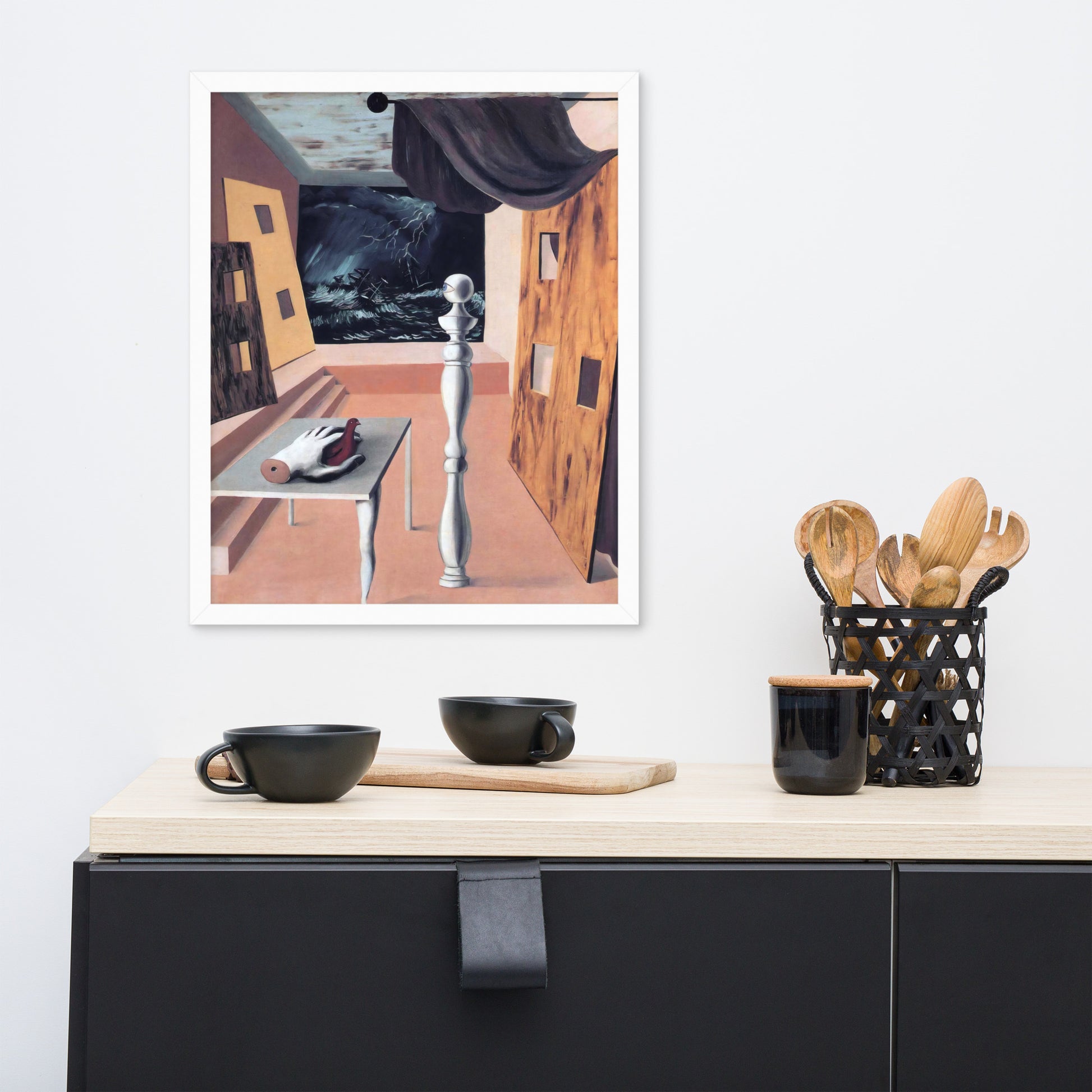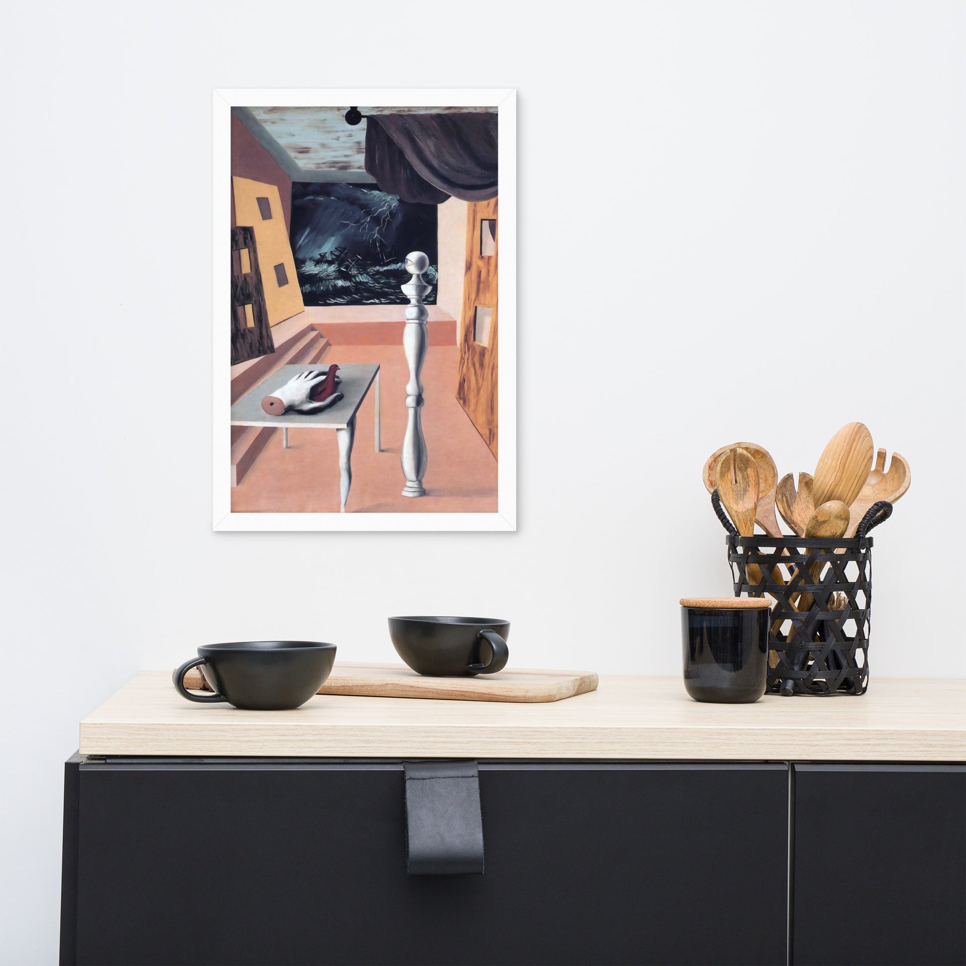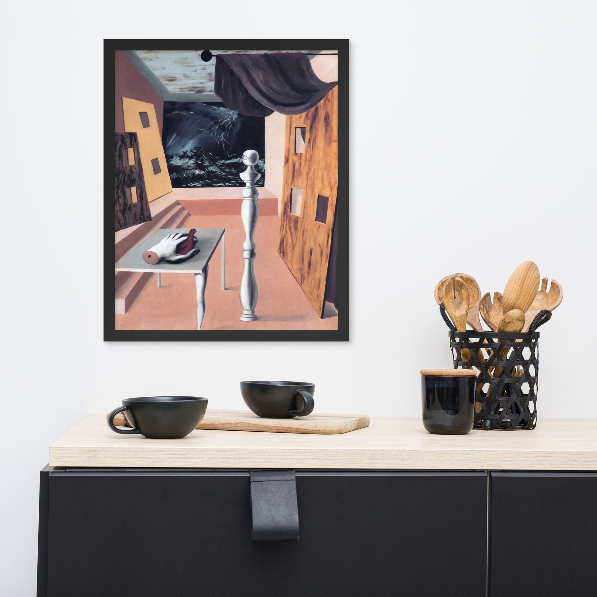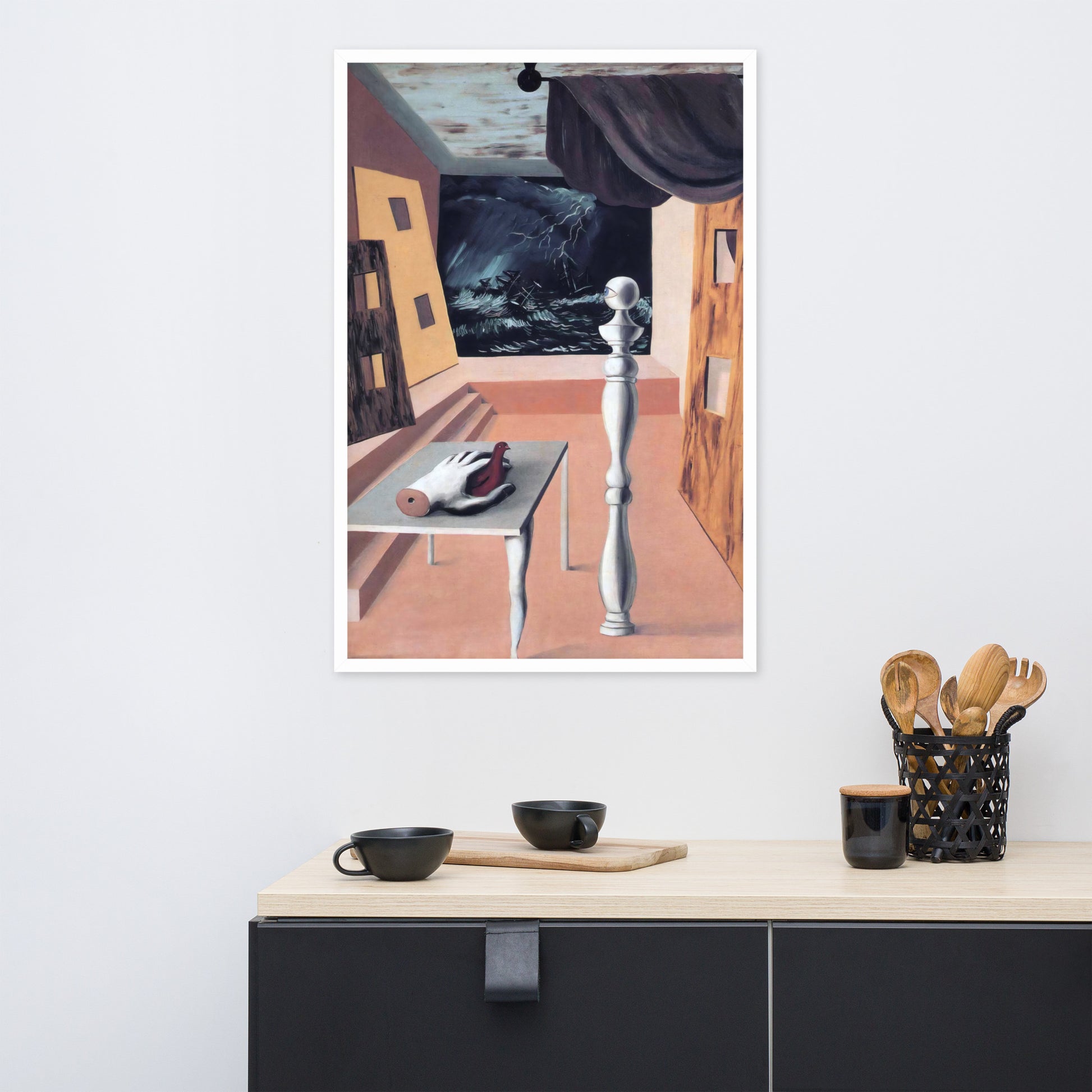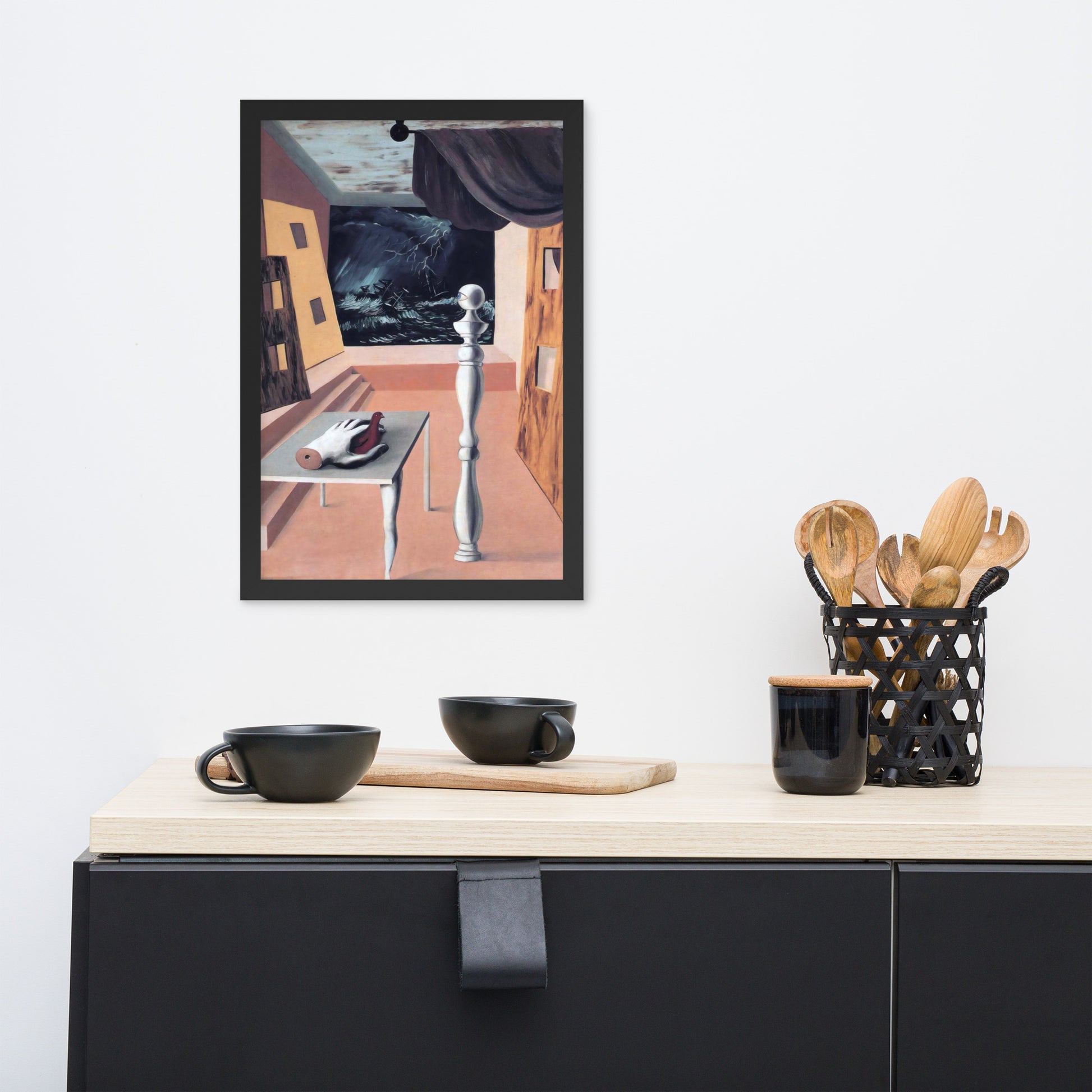 Step into the enigmatic world of surrealism with The Difficult Crossing by René Magritte. This framed wall print invites viewers into a dreamlike interior where disjointed forms and stormy vistas collide. A disembodied hand, elongated table legs, and a spindle-like column evoke mystery and tension—perfect for collectors who crave thought-provoking art with emotional depth. Printed with crisp detail and framed for modern display, this piece transforms any space into a portal of imagination and introspection.