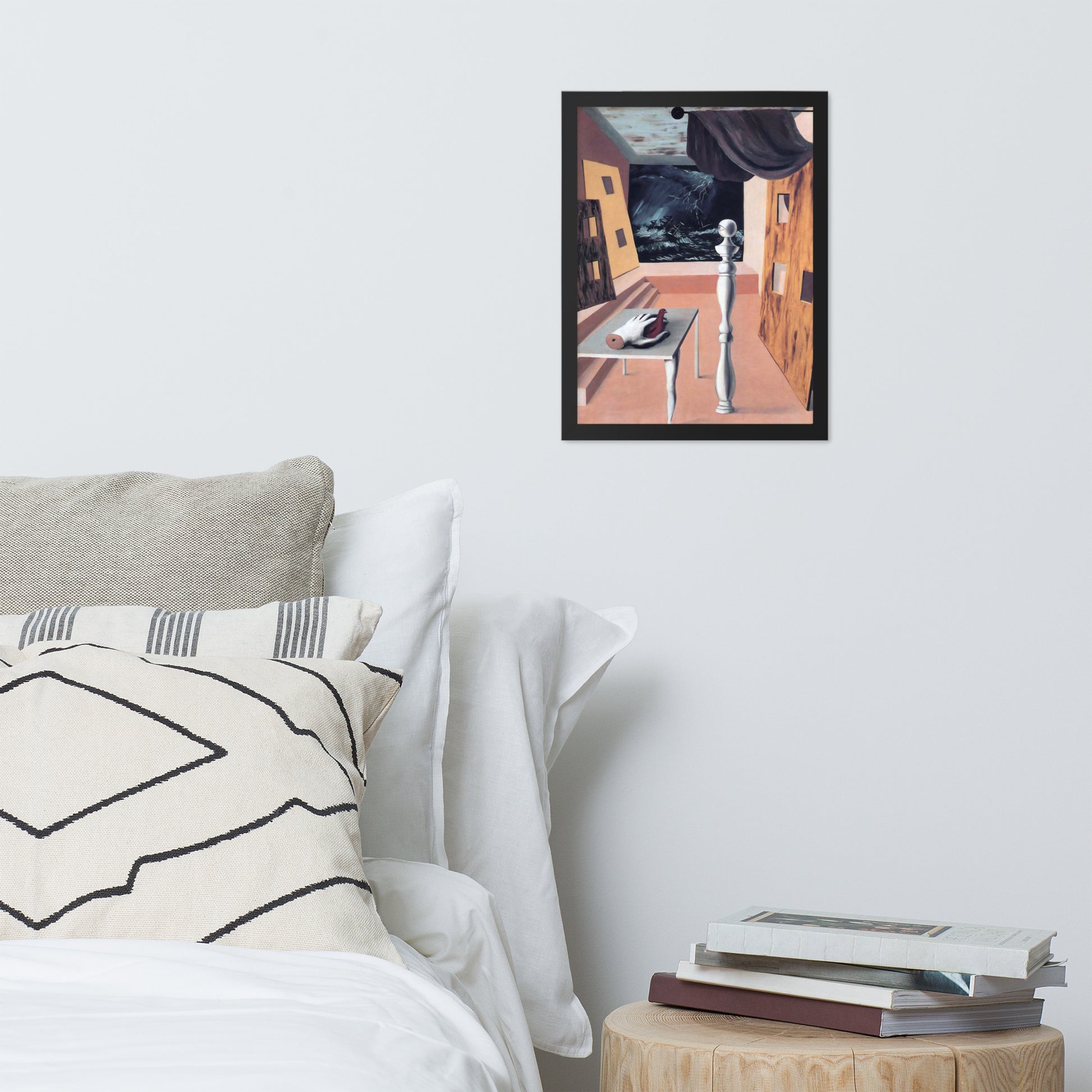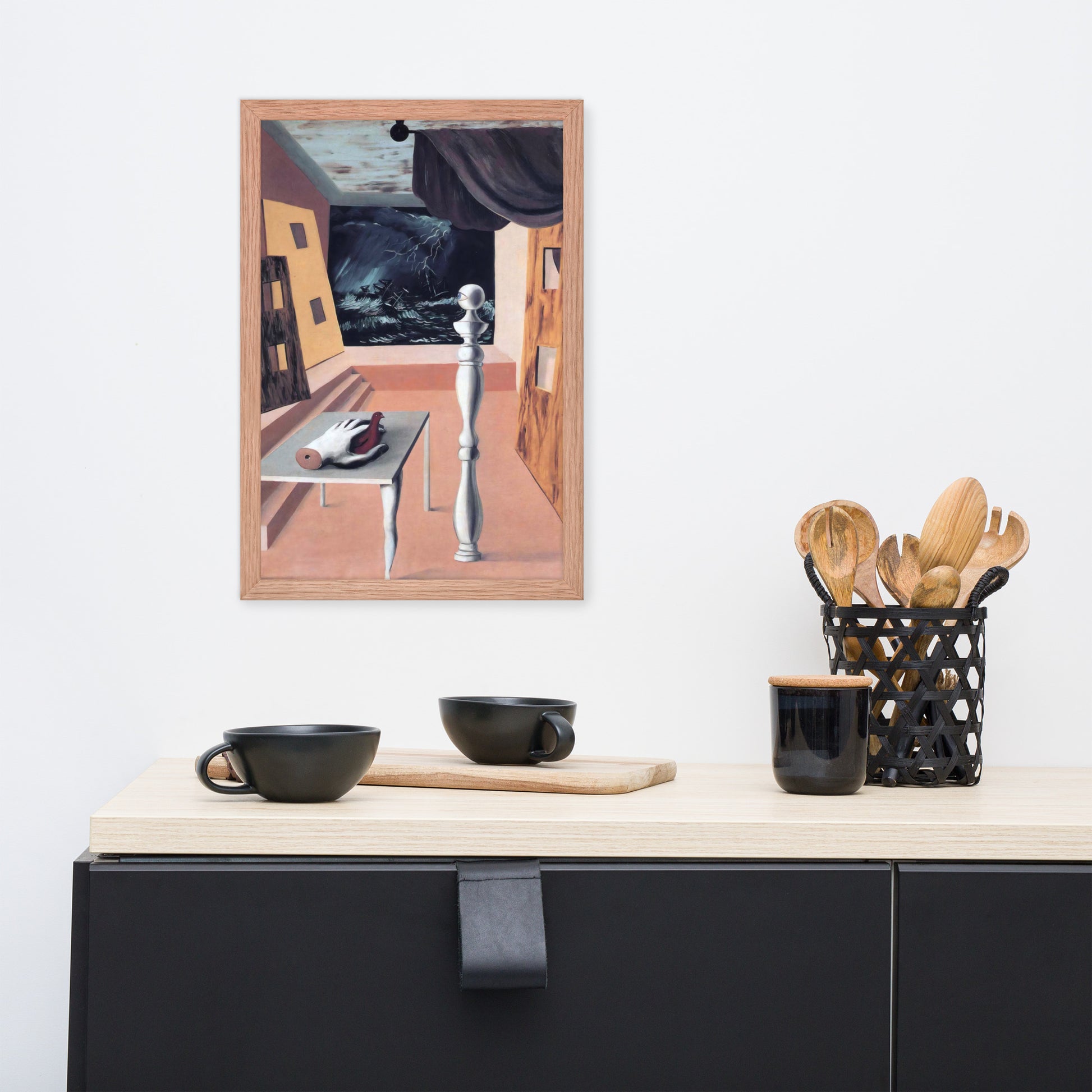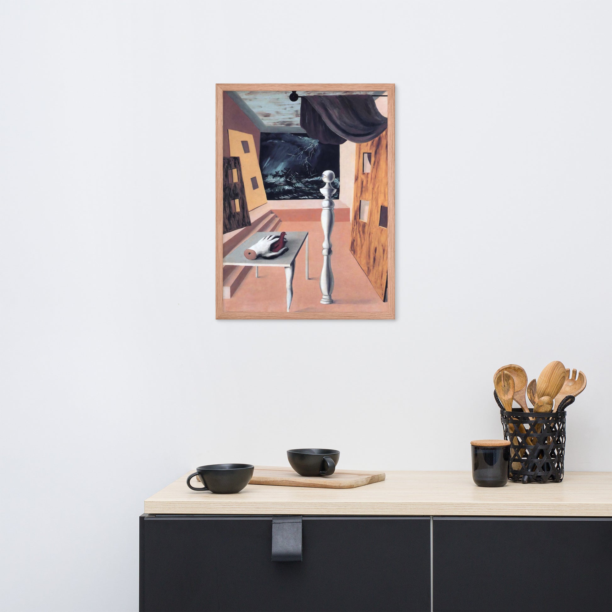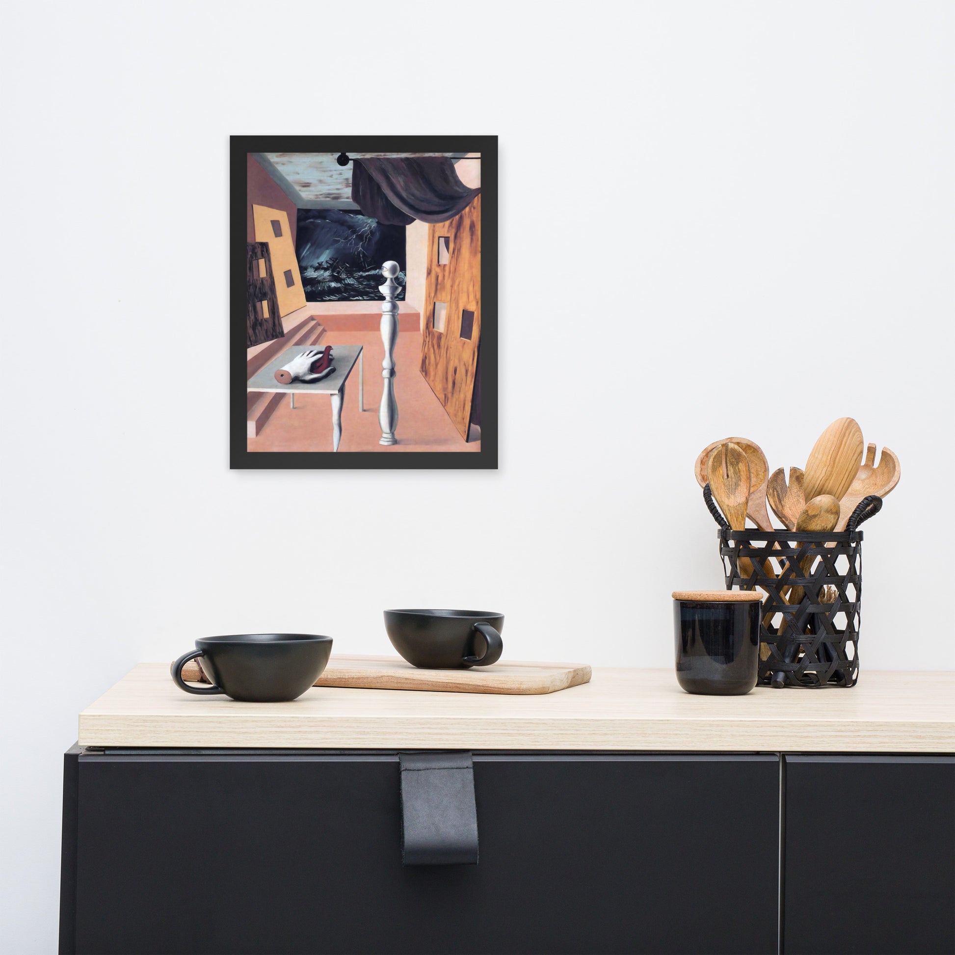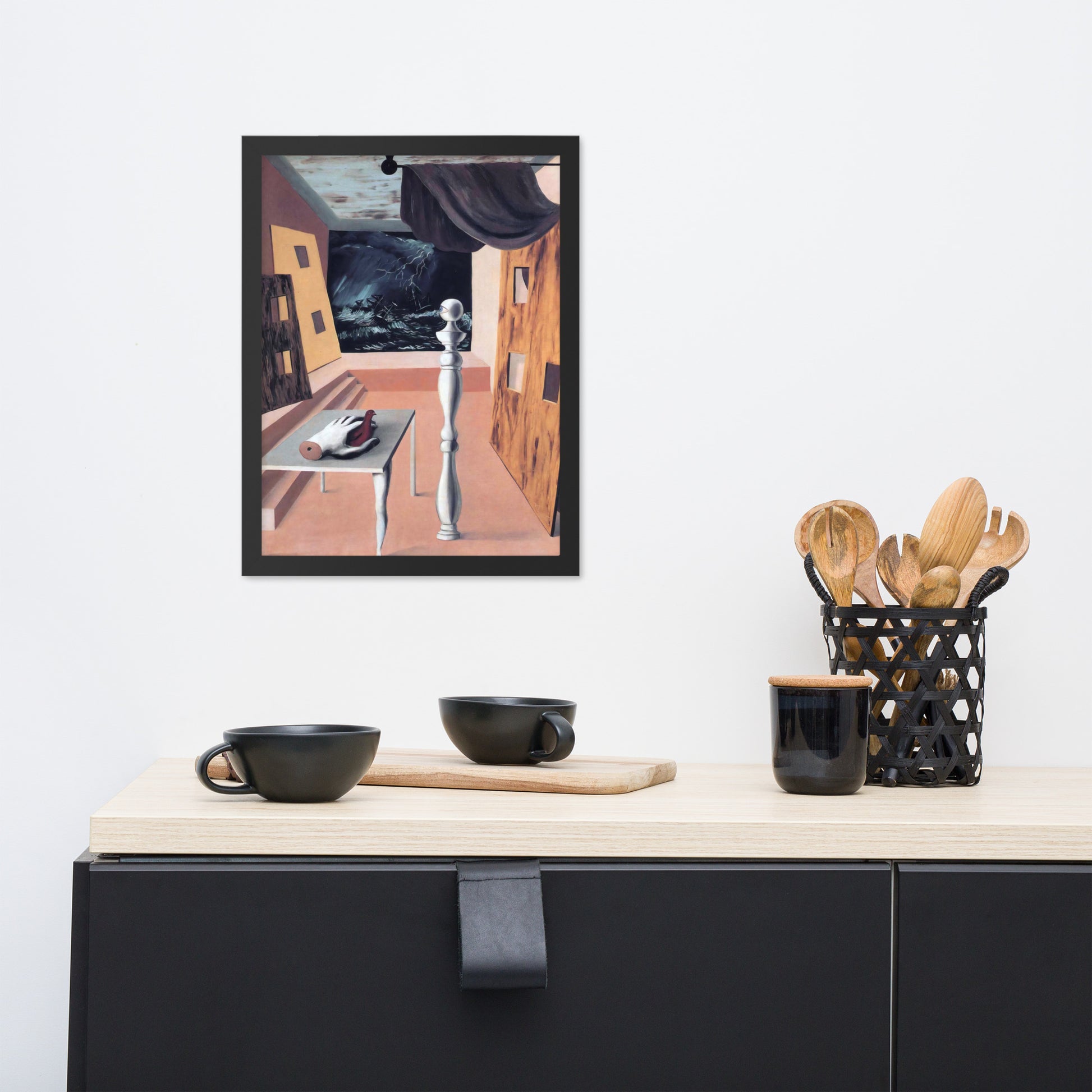 Step into the enigmatic world of surrealism with The Difficult Crossing by René Magritte. This framed wall print invites viewers into a dreamlike interior where disjointed forms and stormy vistas collide. A disembodied hand, elongated table legs, and a spindle-like column evoke mystery and tension—perfect for collectors who crave thought-provoking art with emotional depth. Printed with crisp detail and framed for modern display, this piece transforms any space into a portal of imagination and introspection.