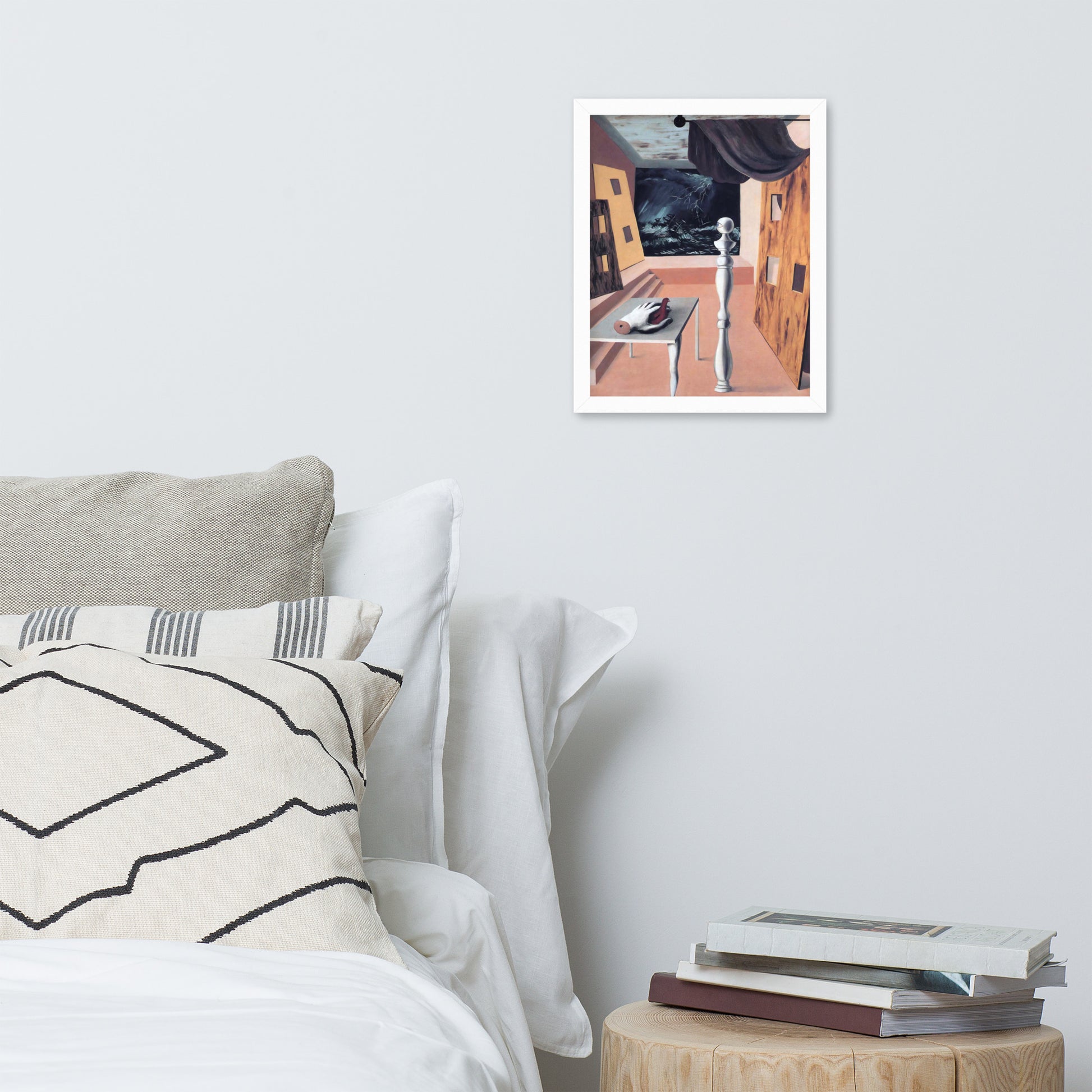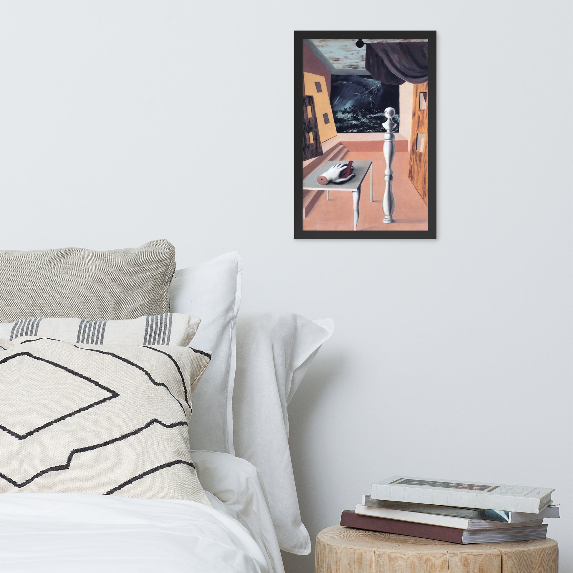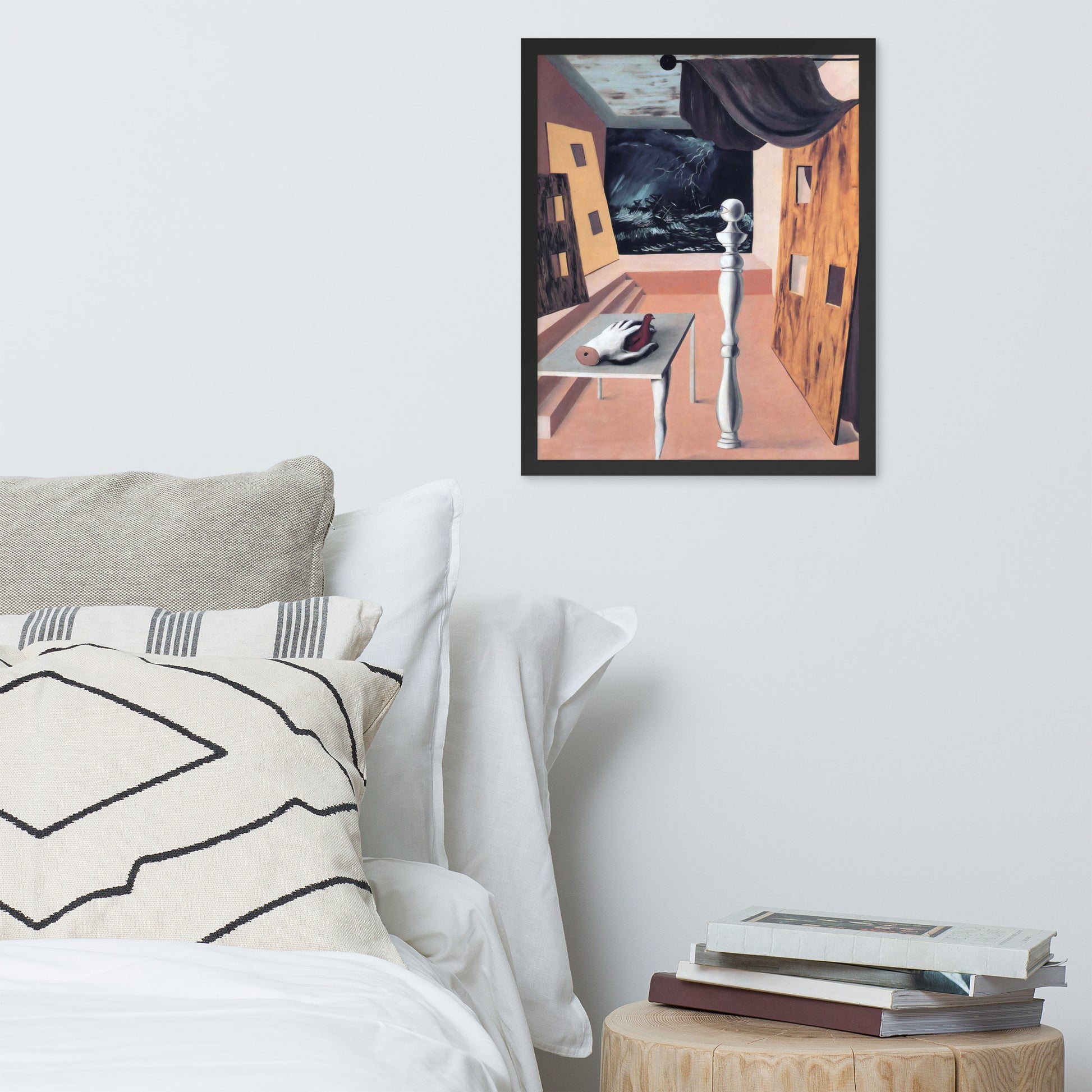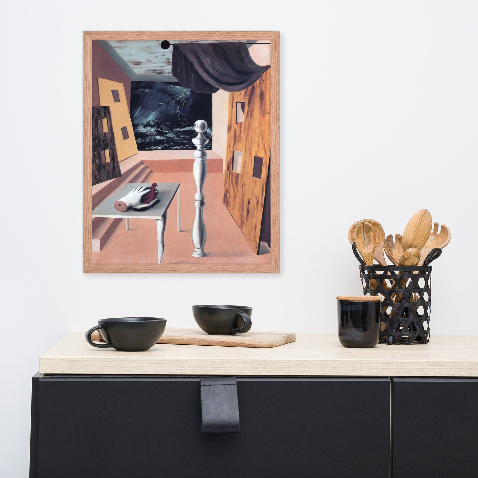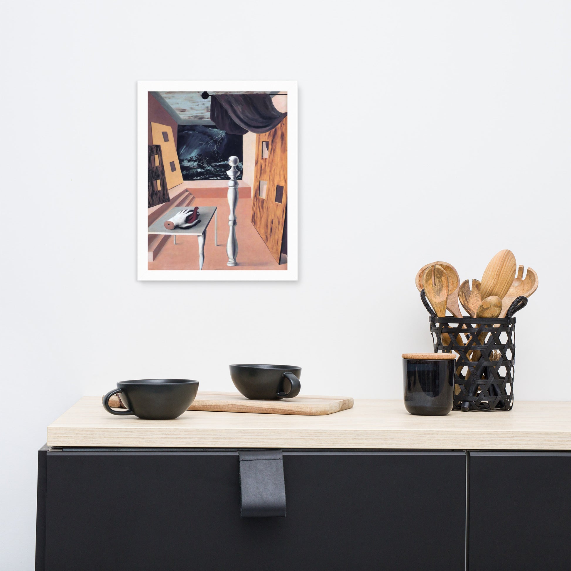 Step into the enigmatic world of surrealism with The Difficult Crossing by René Magritte. This framed wall print invites viewers into a dreamlike interior where disjointed forms and stormy vistas collide. A disembodied hand, elongated table legs, and a spindle-like column evoke mystery and tension—perfect for collectors who crave thought-provoking art with emotional depth. Printed with crisp detail and framed for modern display, this piece transforms any space into a portal of imagination and introspection.