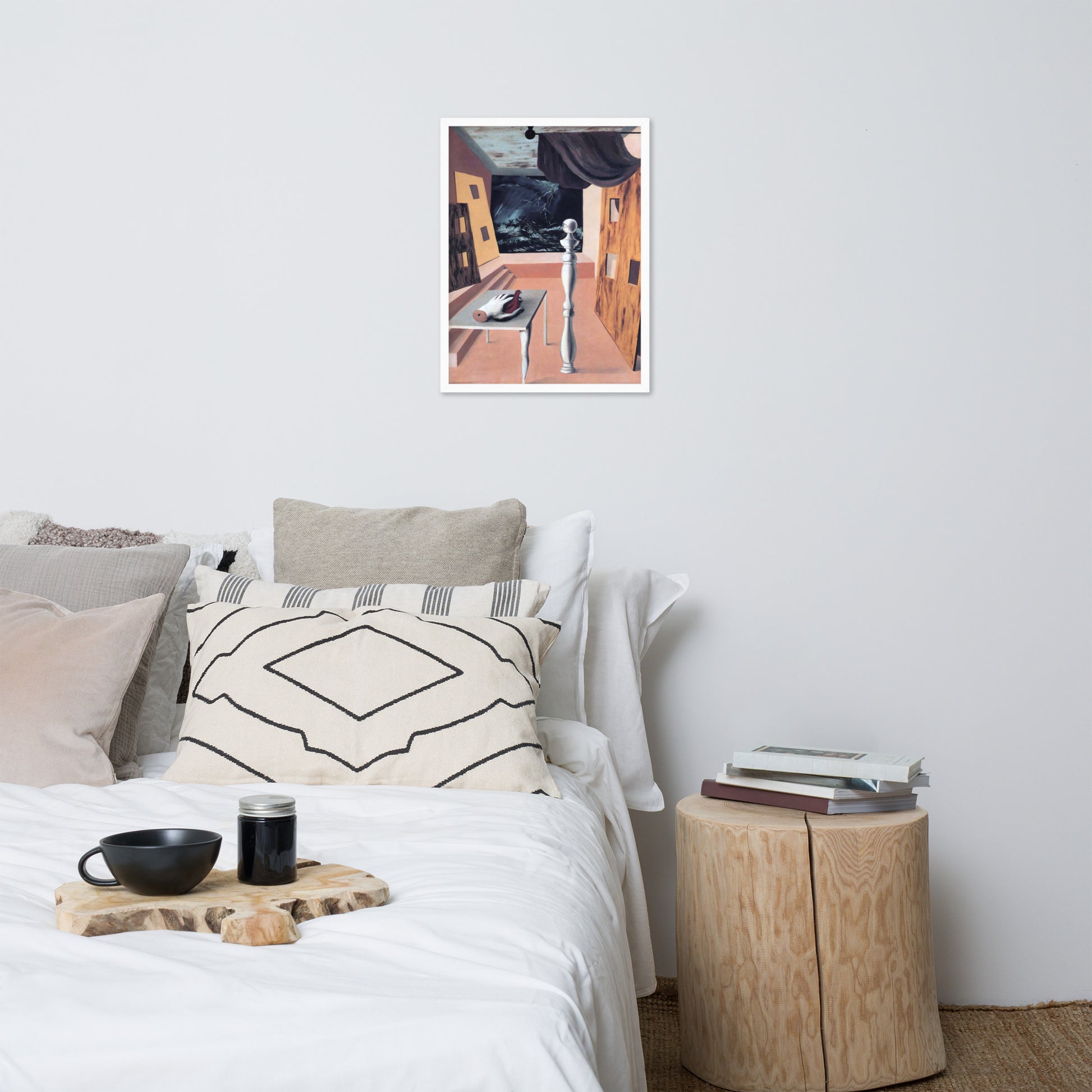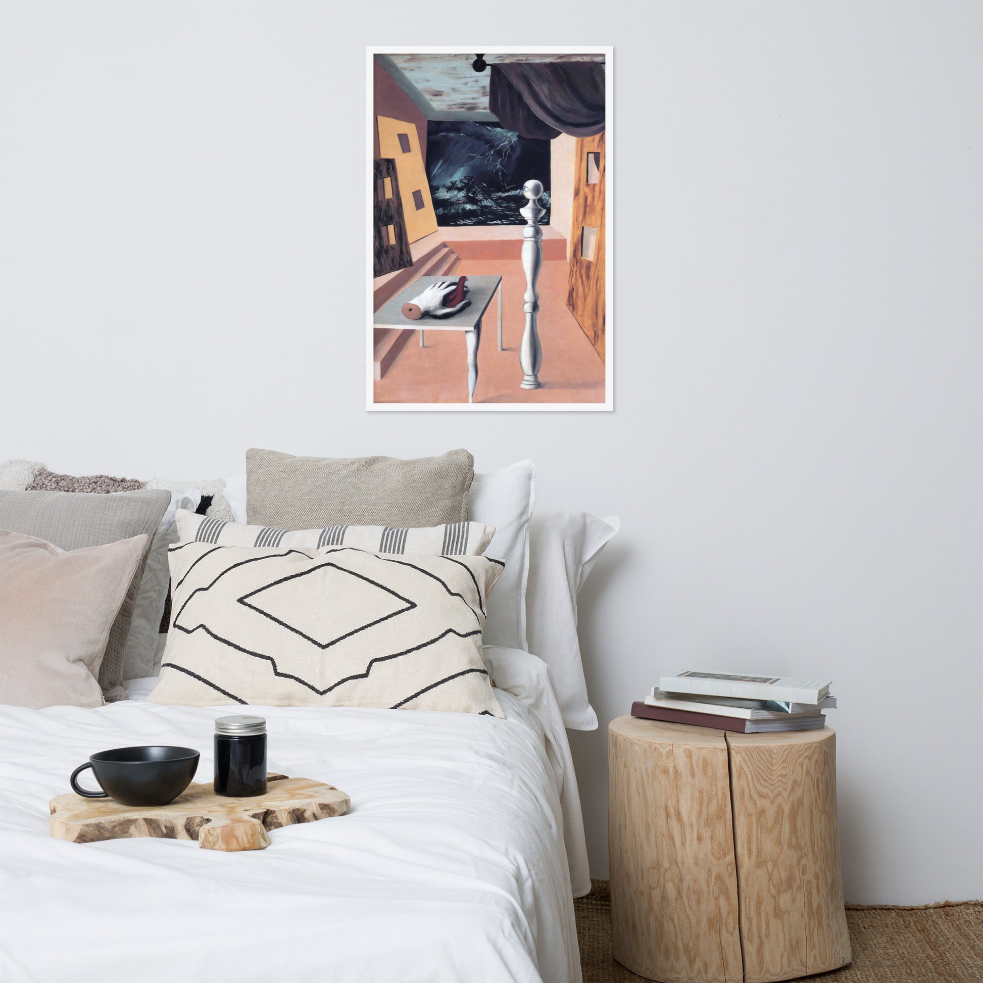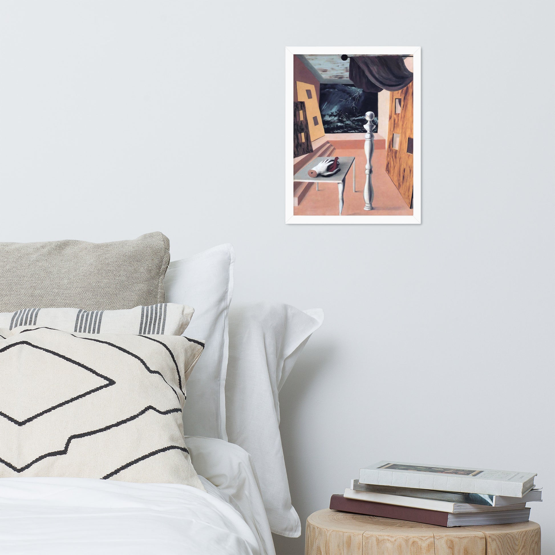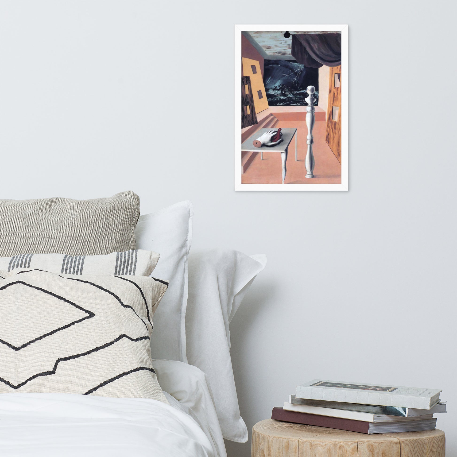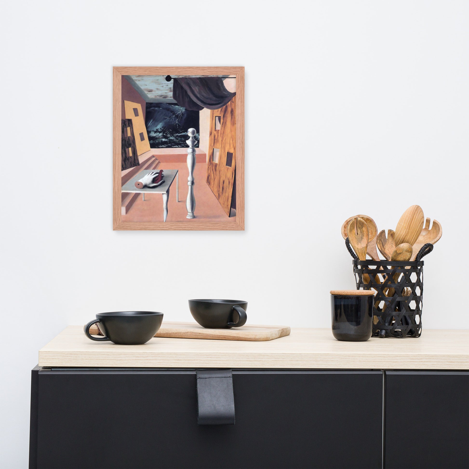 Step into the enigmatic world of surrealism with The Difficult Crossing by René Magritte. This framed wall print invites viewers into a dreamlike interior where disjointed forms and stormy vistas collide. A disembodied hand, elongated table legs, and a spindle-like column evoke mystery and tension—perfect for collectors who crave thought-provoking art with emotional depth. Printed with crisp detail and framed for modern display, this piece transforms any space into a portal of imagination and introspection.