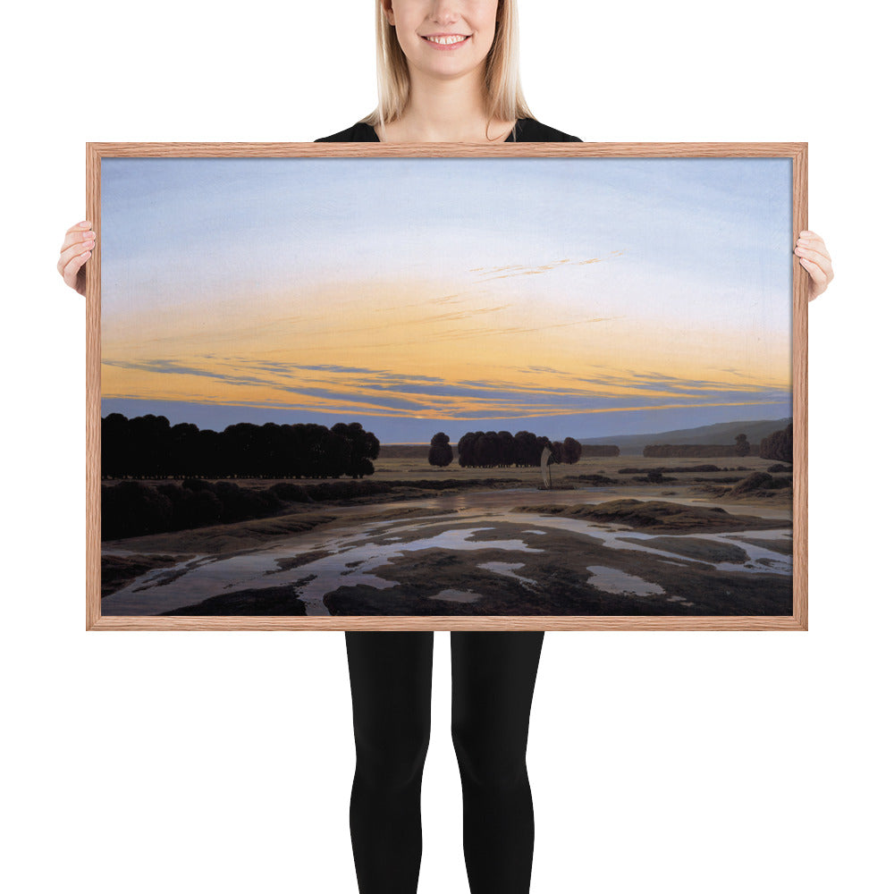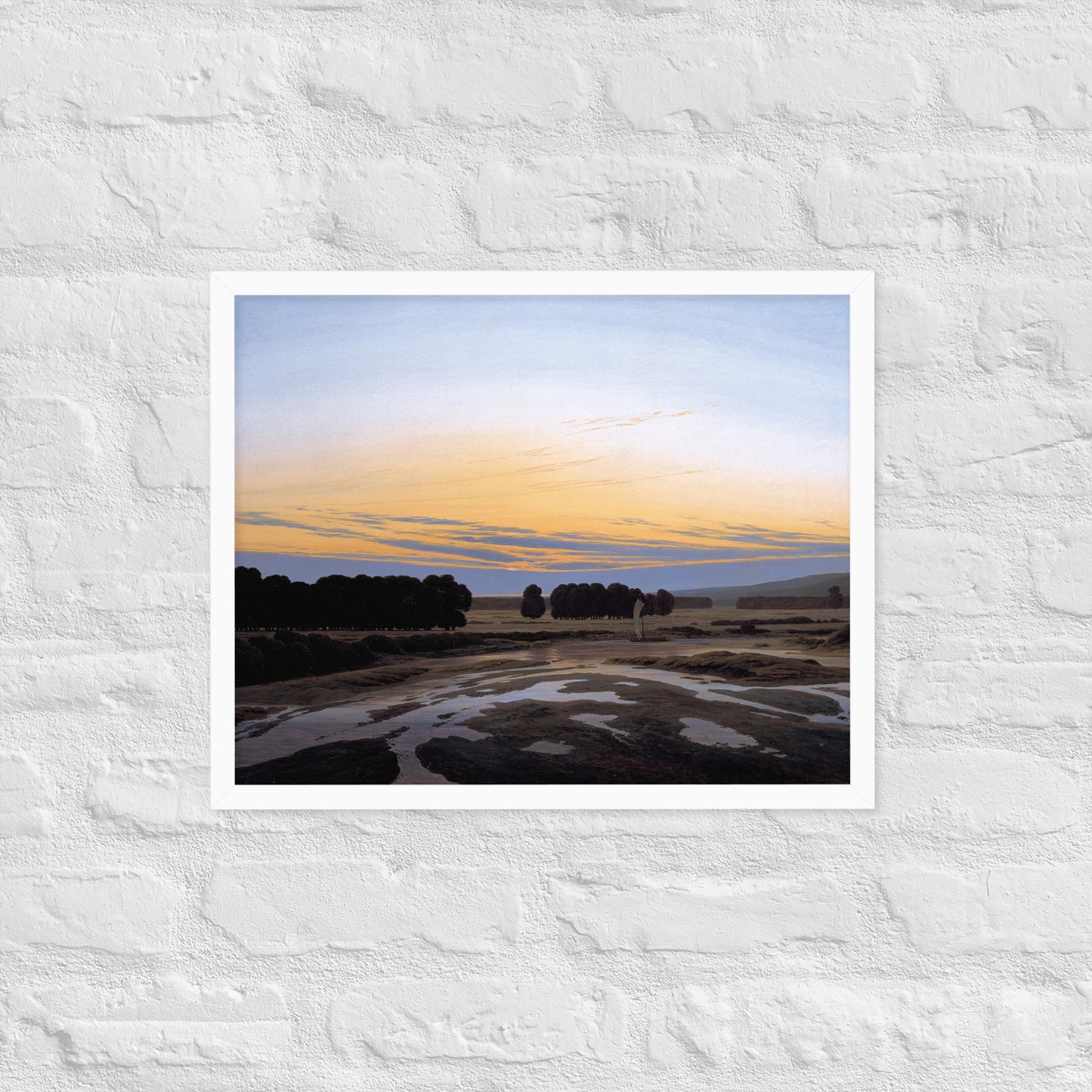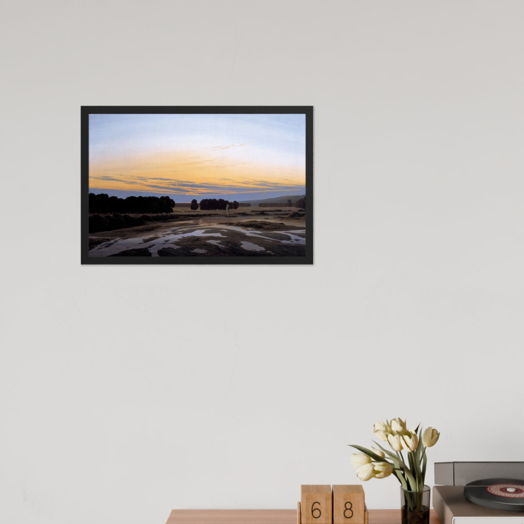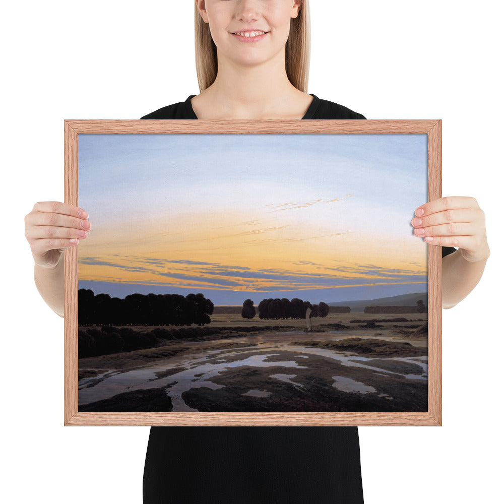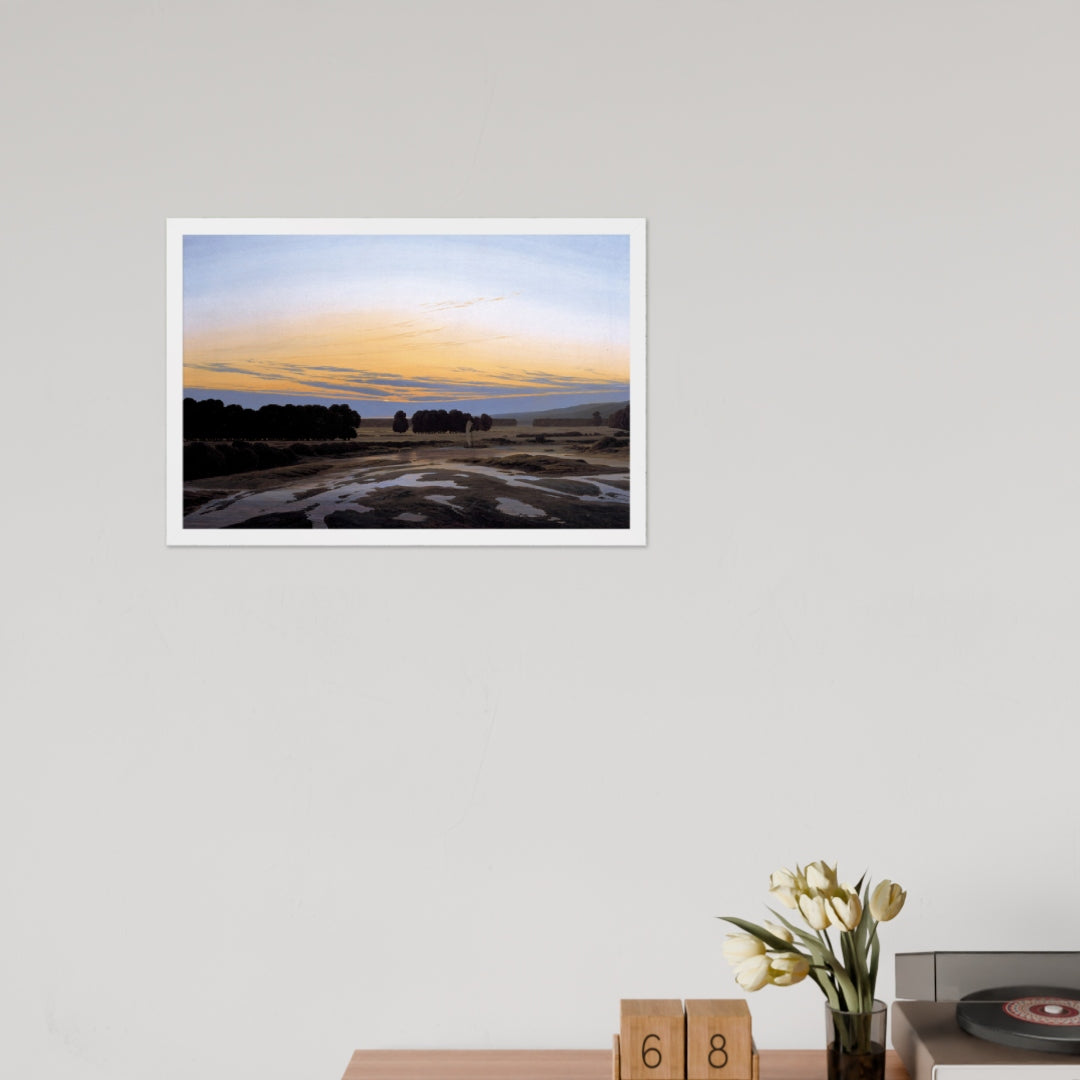 The Great Enclosure by Caspar David Friedrich is a serene meditation on light, solitude, and the passage of time. This Romanticism-era landscape captures the quiet drama of twilight—where silhouetted trees and reflective waters meet a vast, glowing sky. The composition invites viewers into a contemplative space, evoking themes of transience, nature’s grandeur, and emotional stillness.